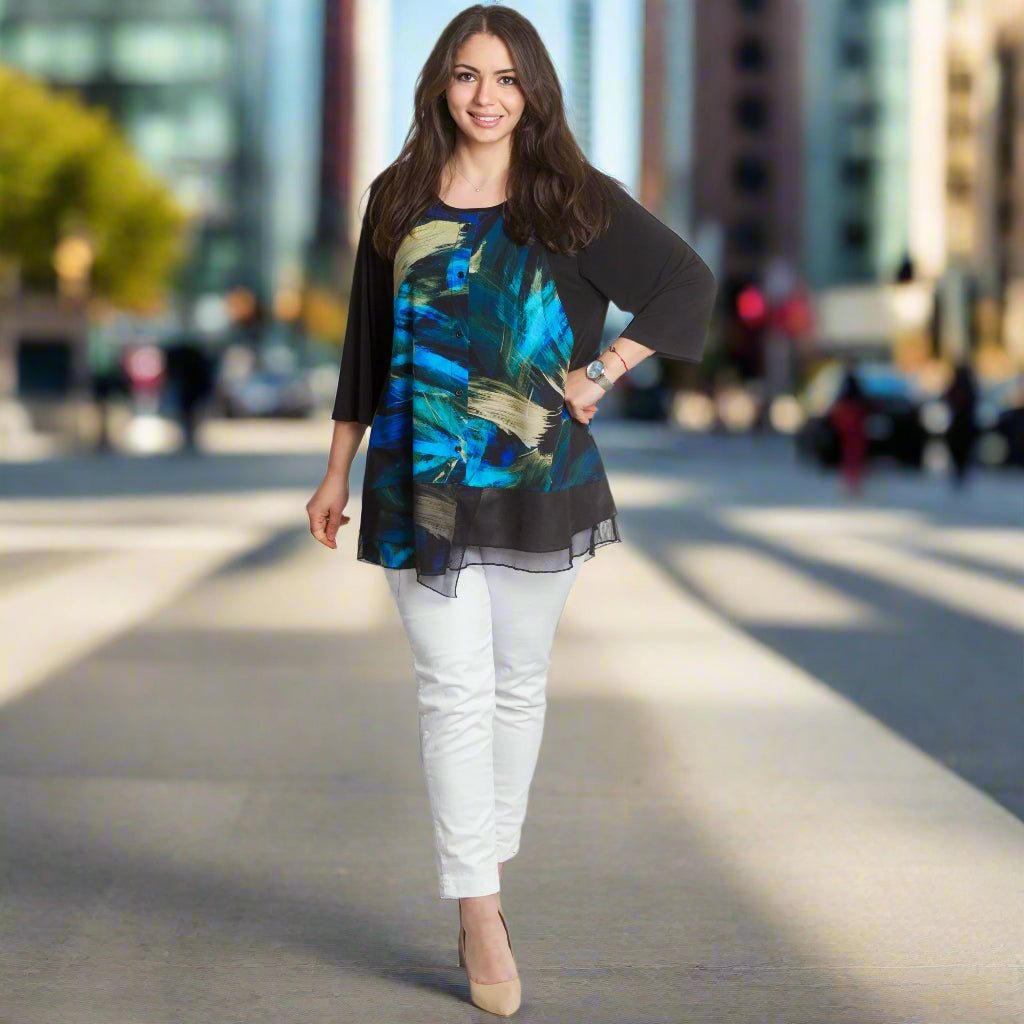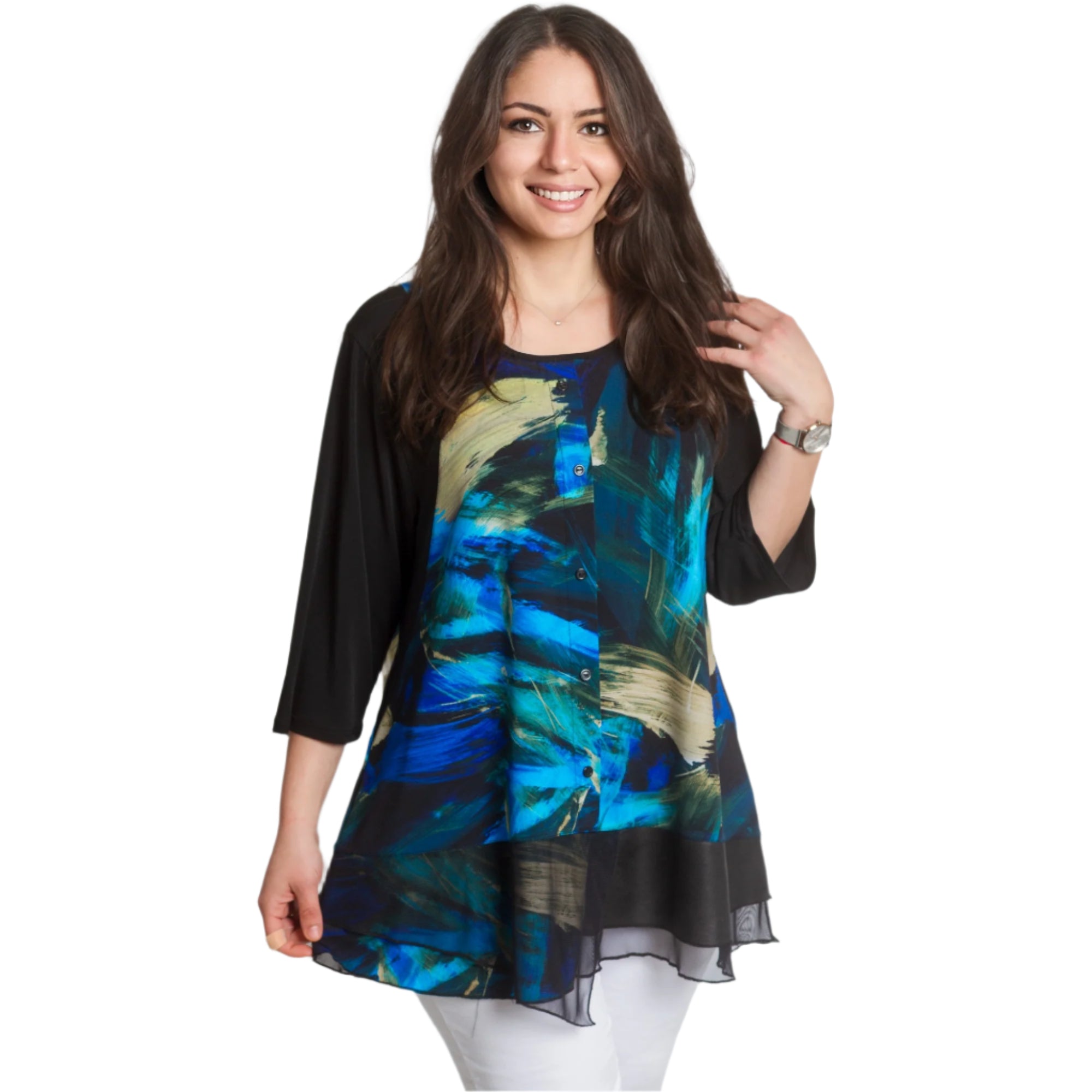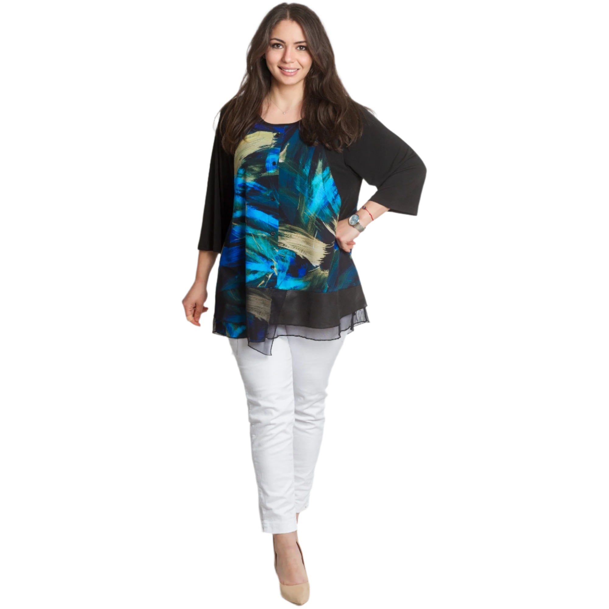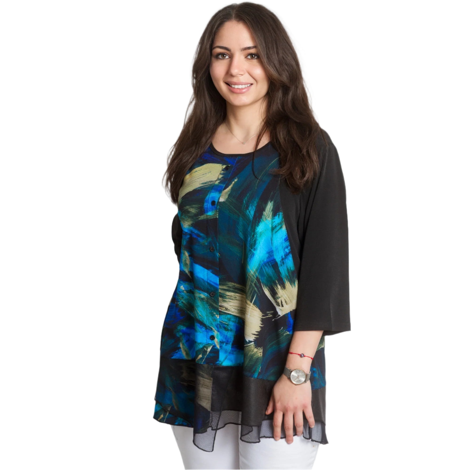 Adaugă stil și confort garderobei tale cu această tunică elegantă cu imprimeu abstract în nuanțe de albastru și auriu. Confecționată dintr-un material ușor și confortabil, oferă libertate de mișcare și este potrivită pentru orice ocazie. Finisată cu o garnitură vaporoasă din tul și piele ecologică în partea de jos, această tunică este alegerea perfectă pentru femeile care iubesc stilul elegant cu un accent modern.