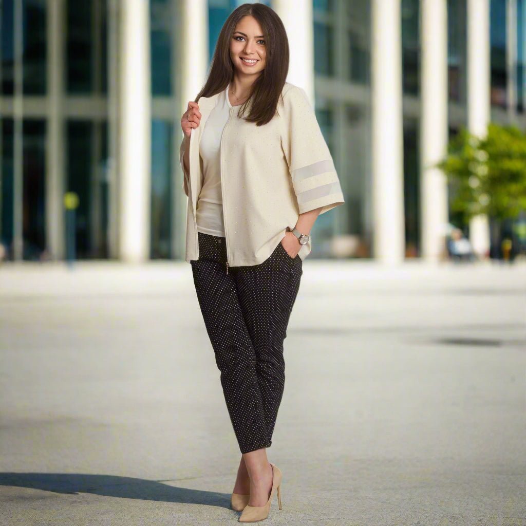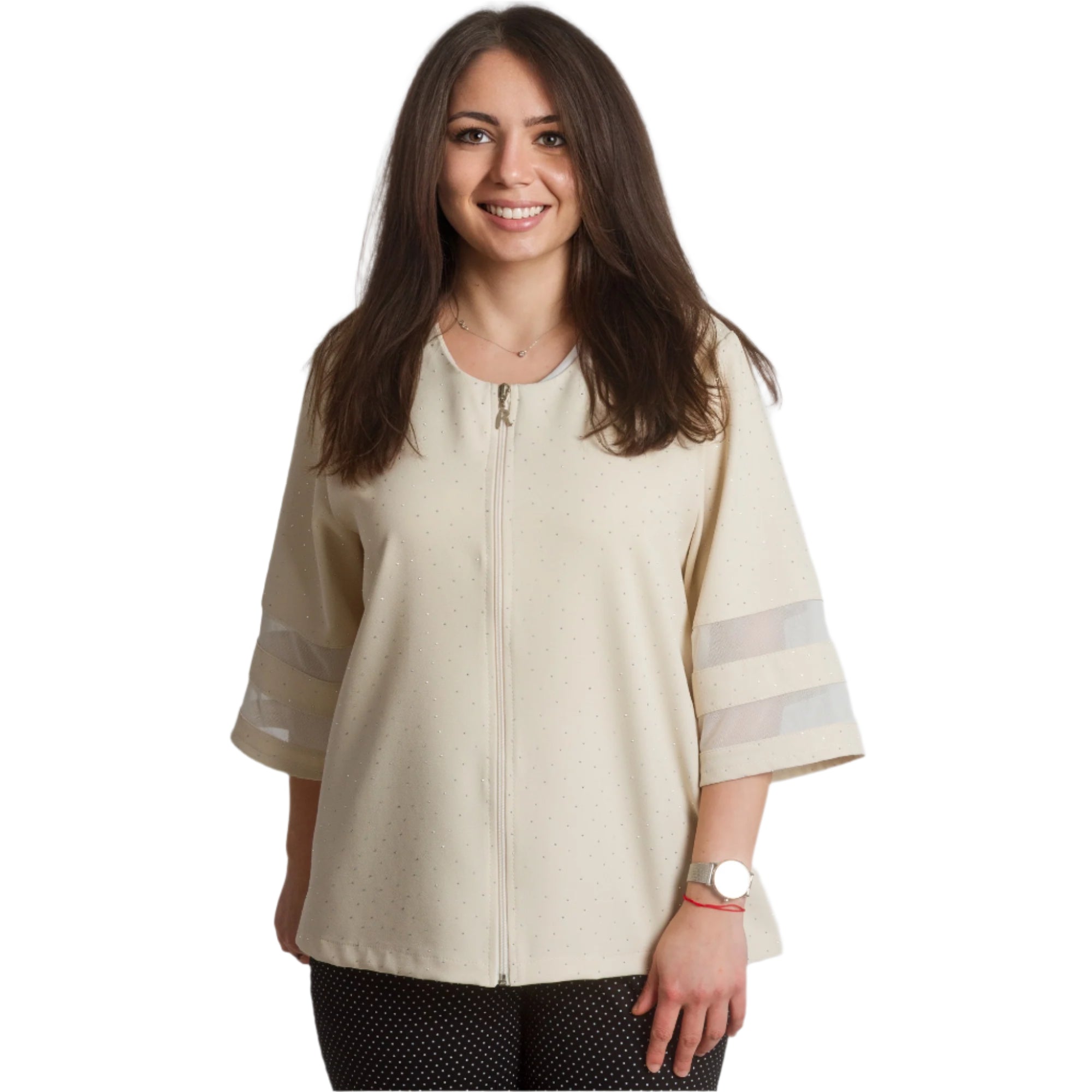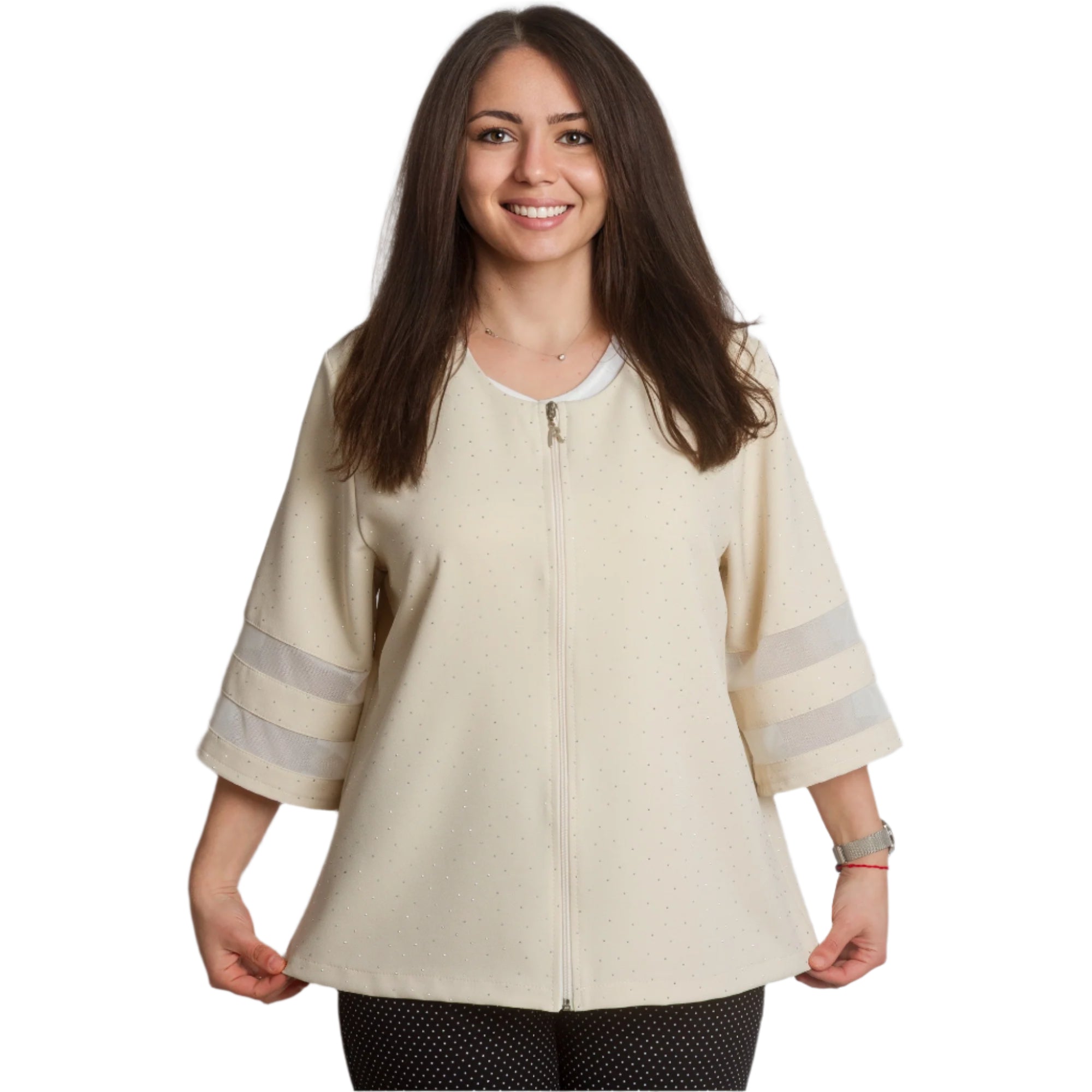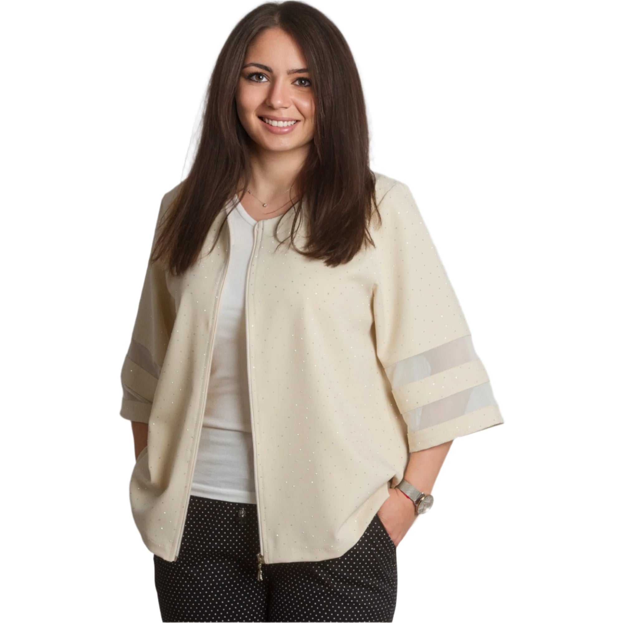 Această jachetă formală este o combinație între eleganța modernă și confort, fiind perfectă pentru ocazii formale. Fabricată din 100% poliester, oferă confort și libertate de mișcare. Se închide cu fermoar în față și are detalii transparente elegante pe mâneci, care adaugă un aspect modern și sofisticat. Este potrivită atât pentru evenimente formale și de seară, cât și pentru ținute elegante de zi cu zi.