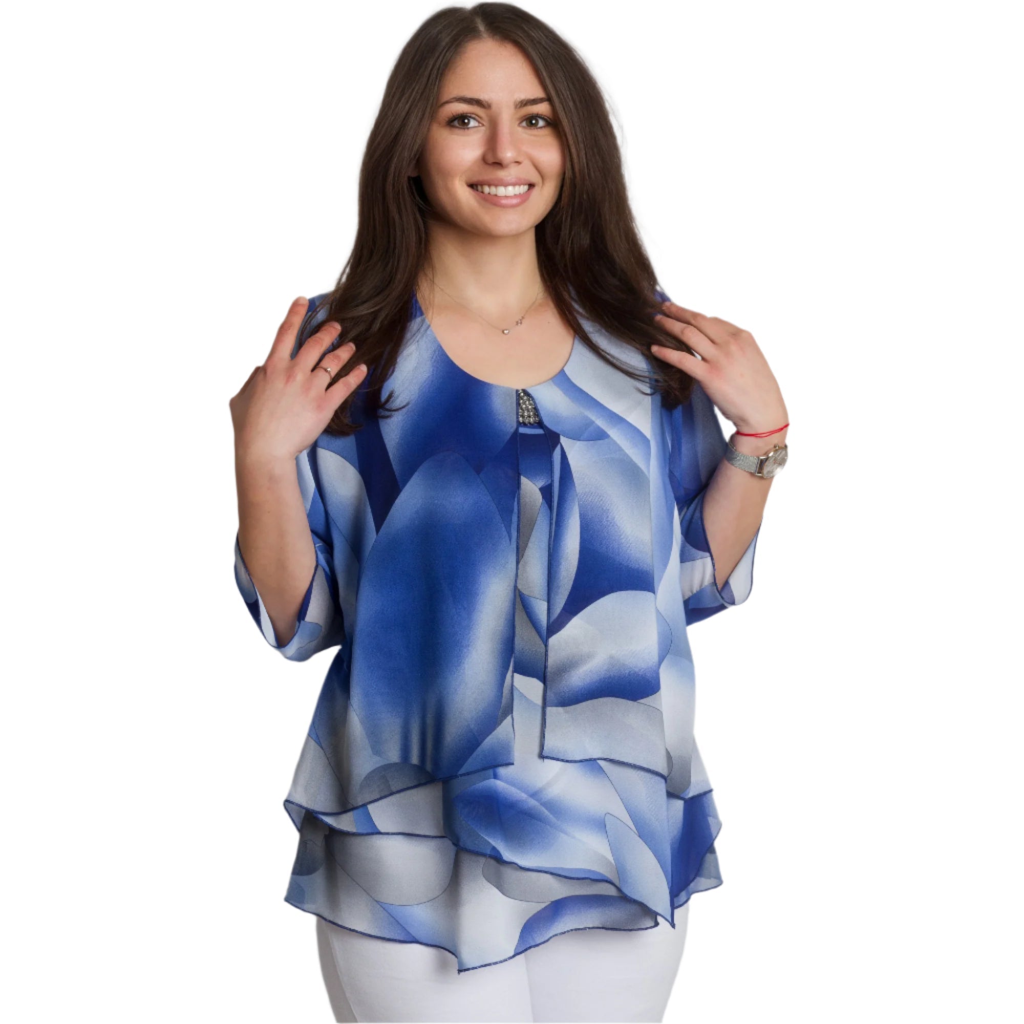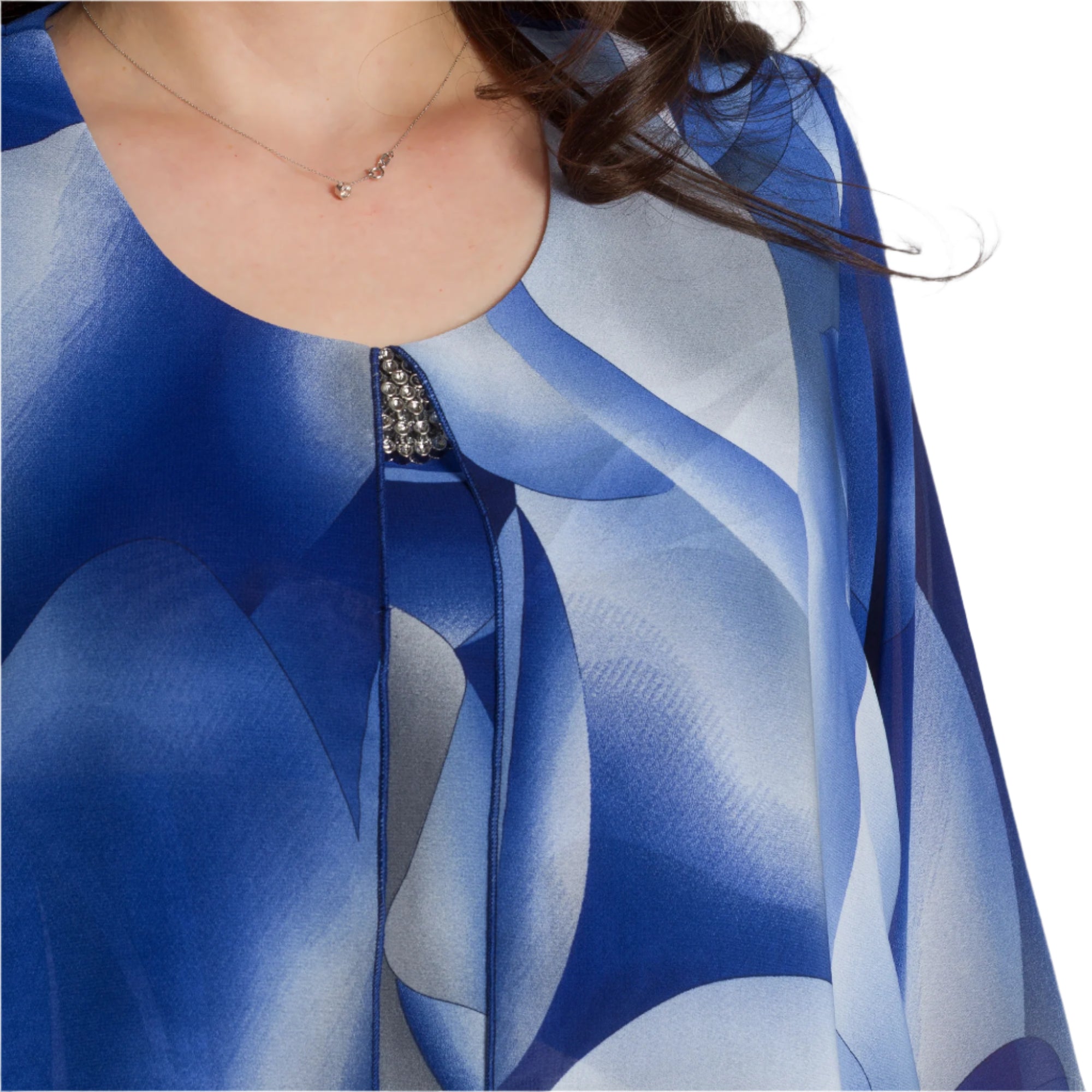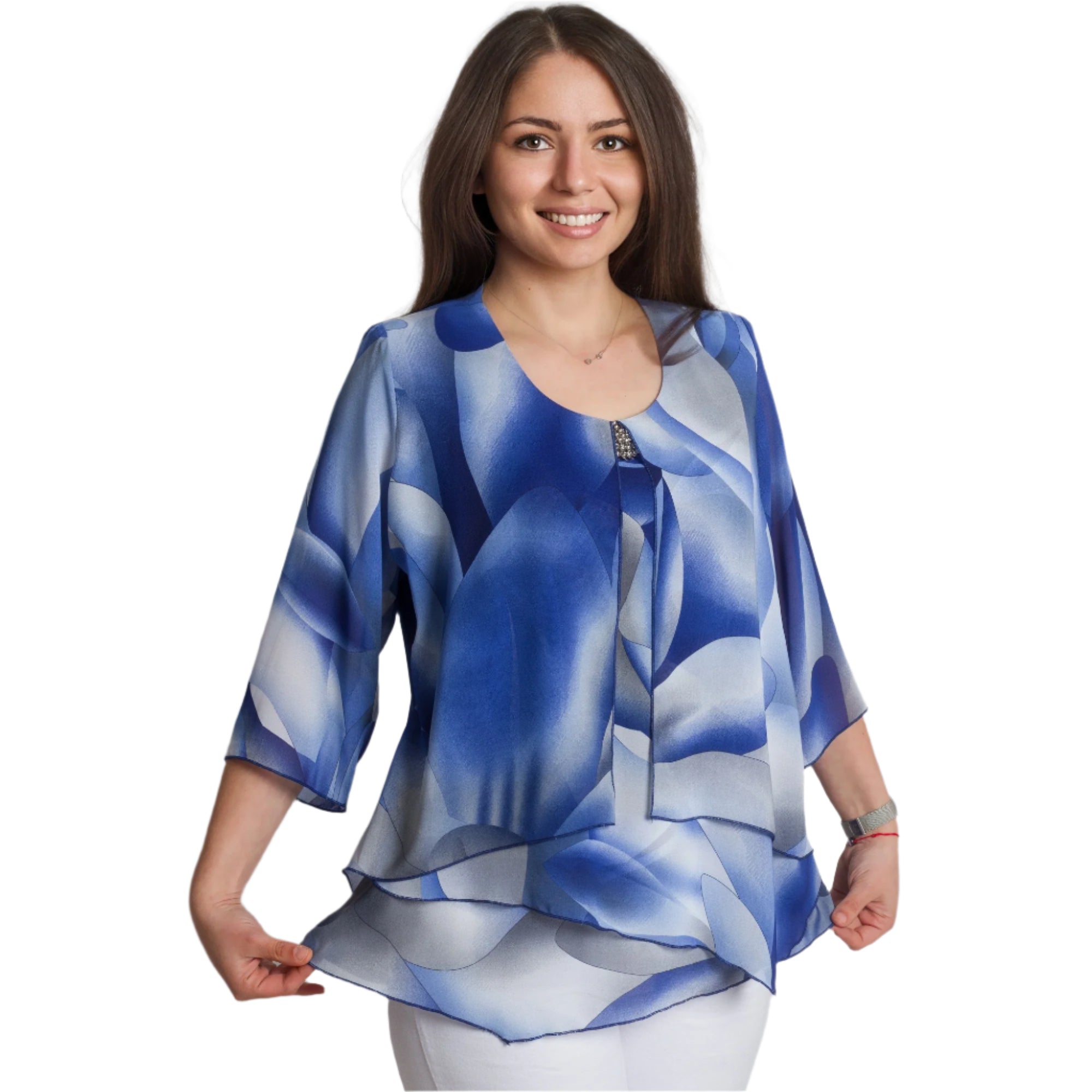 Tunică formală cu un model abstract spectaculos și broșă, culoarea este în nuanțe de albastru regal. Această tunică elegantă este confecționată din 95% vâscoză și 5% elastan. Ușoară, vaporoasă și confortabilă de purtat în sezonul primăvară-vară. Designul include un decolteu rotund, completat de o broșă, care adaugă rafinament și completitudine aspectului. Croiul drept oferă confort și libertate de mișcare, iar elasticitatea ușoară a materialului contribuie la confort pe tot parcursul zilei.