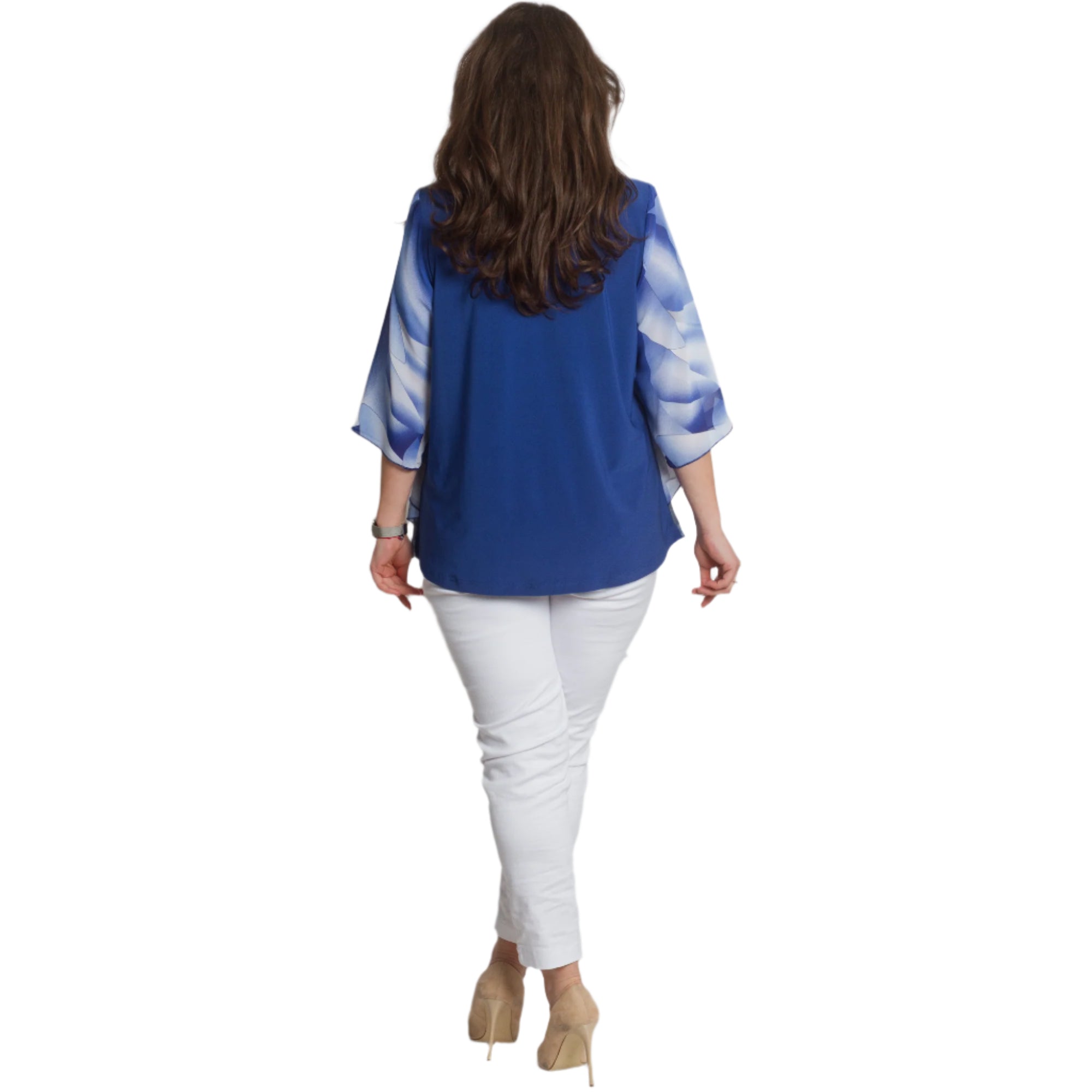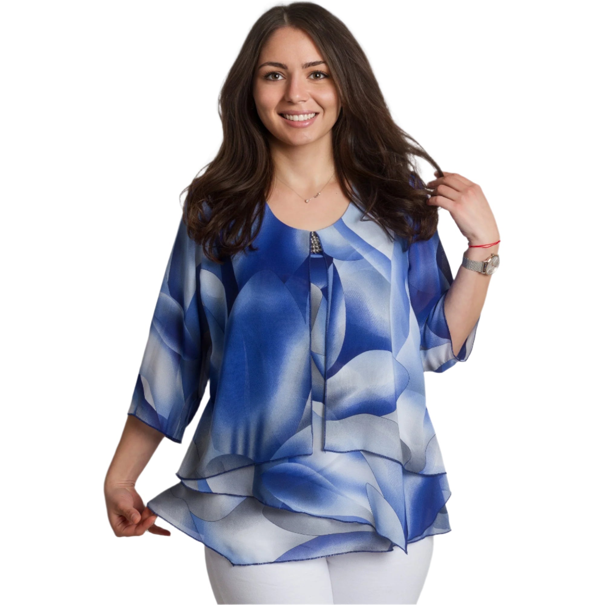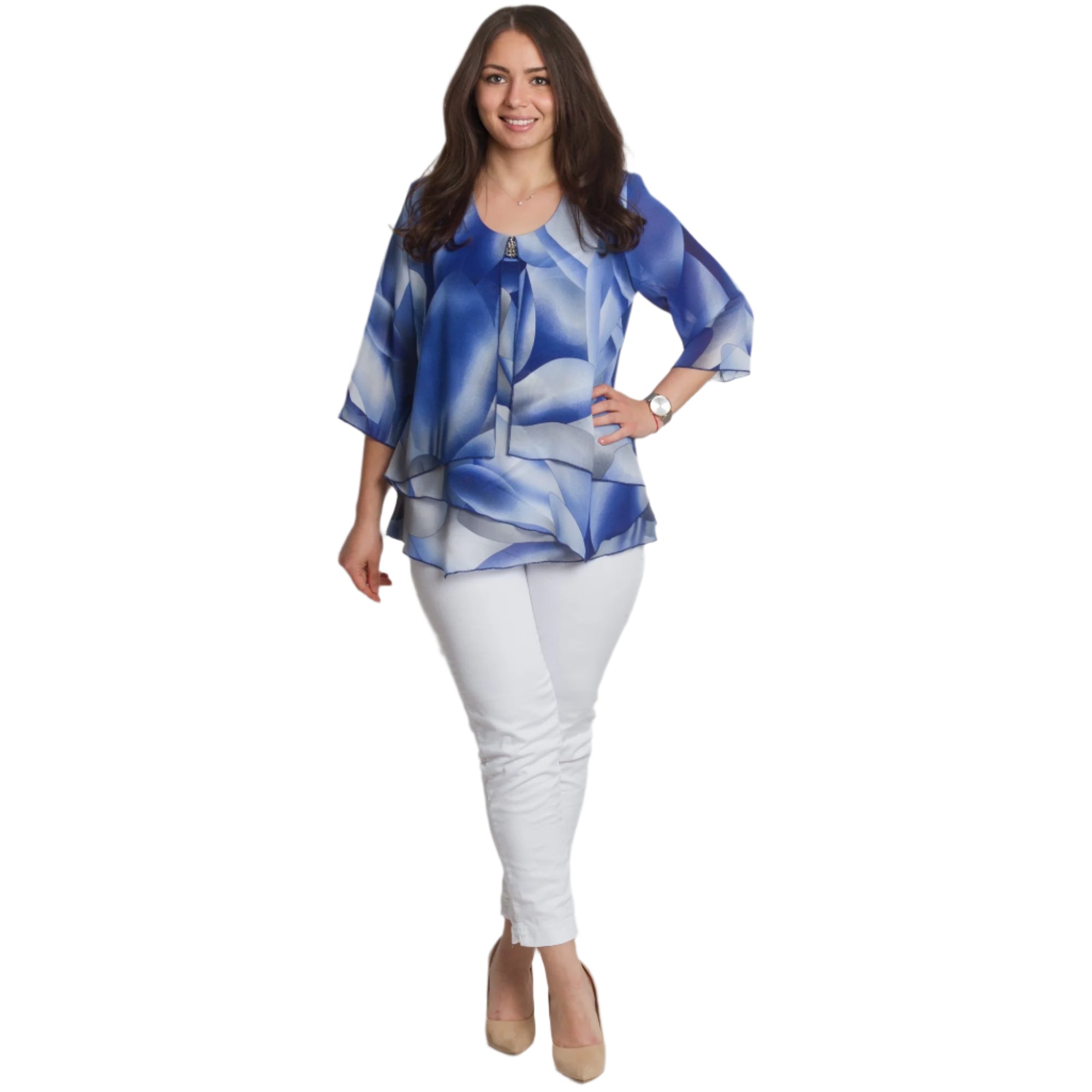 Tunică formală cu un model abstract spectaculos și broșă, culoarea este în nuanțe de albastru regal. Această tunică elegantă este confecționată din 95% vâscoză și 5% elastan. Ușoară, vaporoasă și confortabilă de purtat în sezonul primăvară-vară. Designul include un decolteu rotund, completat de o broșă, care adaugă rafinament și completitudine aspectului. Croiul drept oferă confort și libertate de mișcare, iar elasticitatea ușoară a materialului contribuie la confort pe tot parcursul zilei.