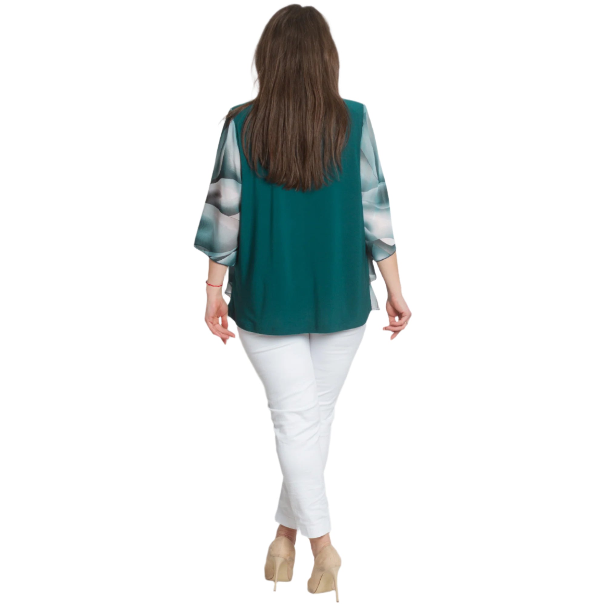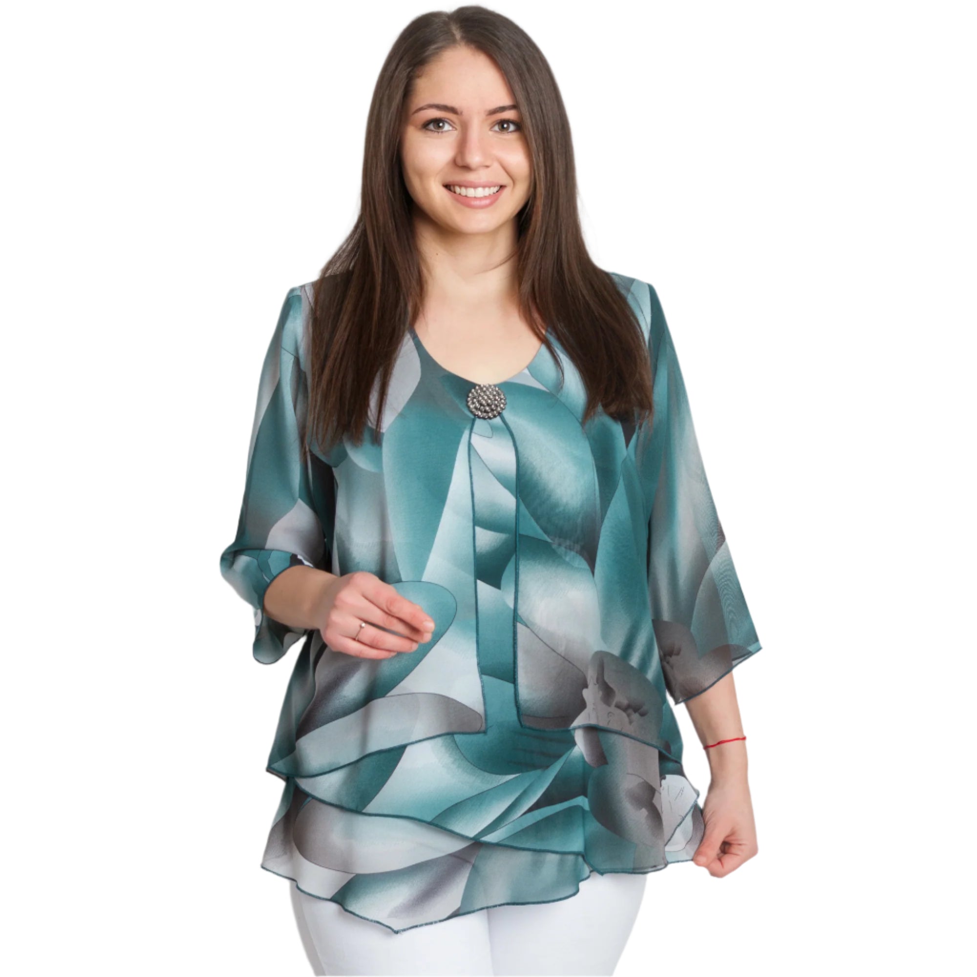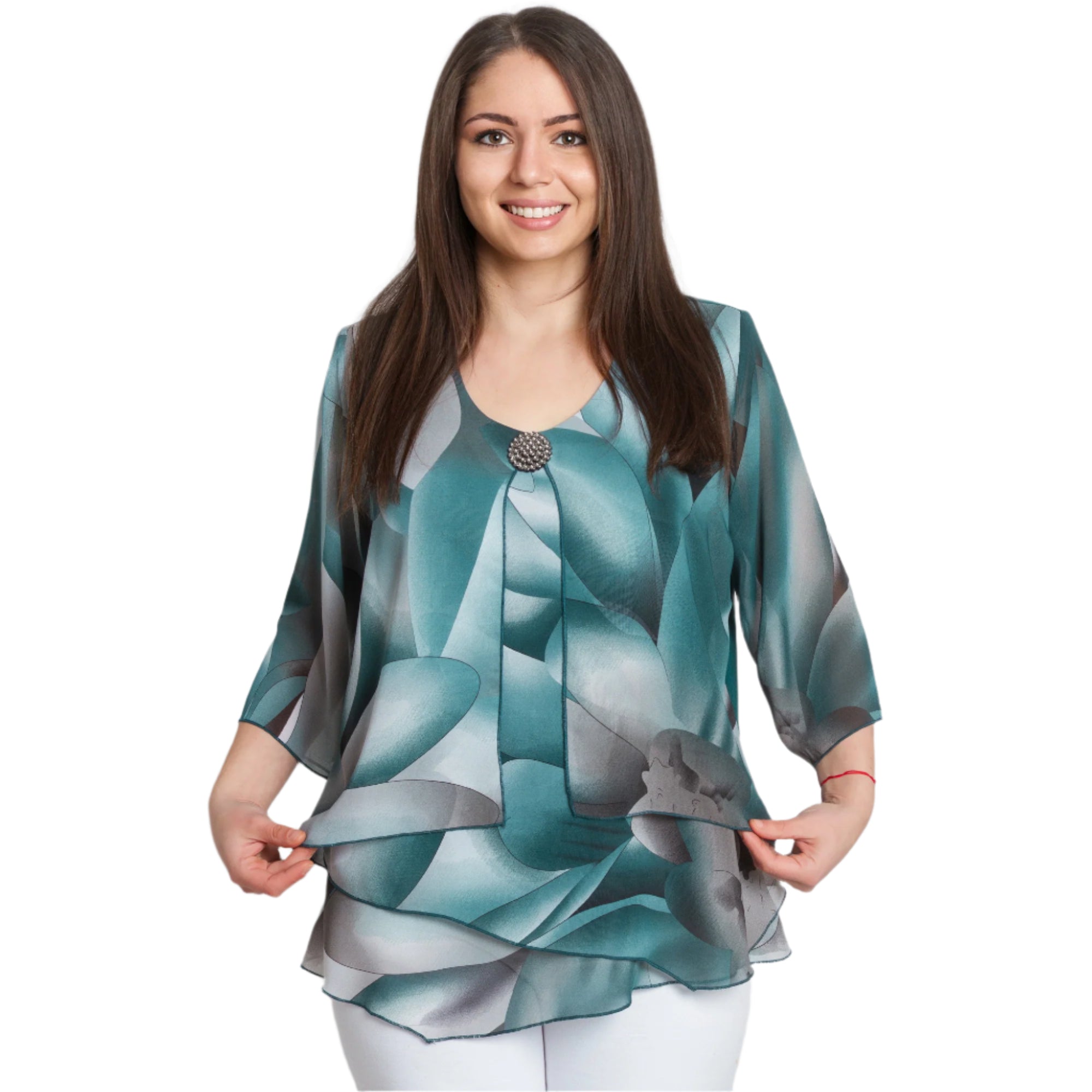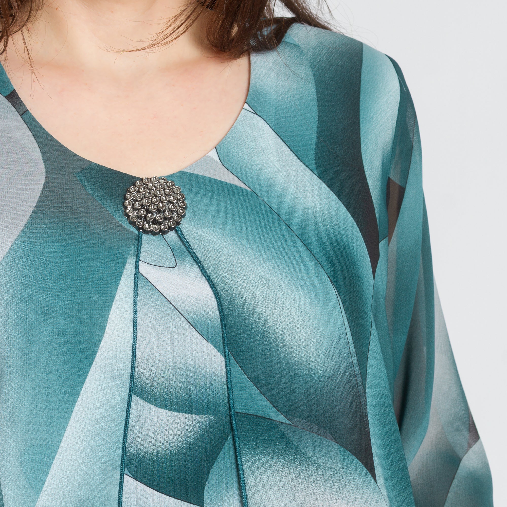 Tunică formală cu un model abstract spectaculos în nuanțe de petrol și gri. Această tunică elegantă este confecționată din 95% vâscoză și 5% elastan. Ușoară, vaporoasă și confortabilă de purtat în sezonul primăvară-vară. Designul include un decolteu rotund, completat de o broșă, care adaugă rafinament și completitudine ținutei. Croiul drept oferă confort și libertate de mișcare, iar elasticitatea ușoară a materialului contribuie la confort pe tot parcursul zilei.