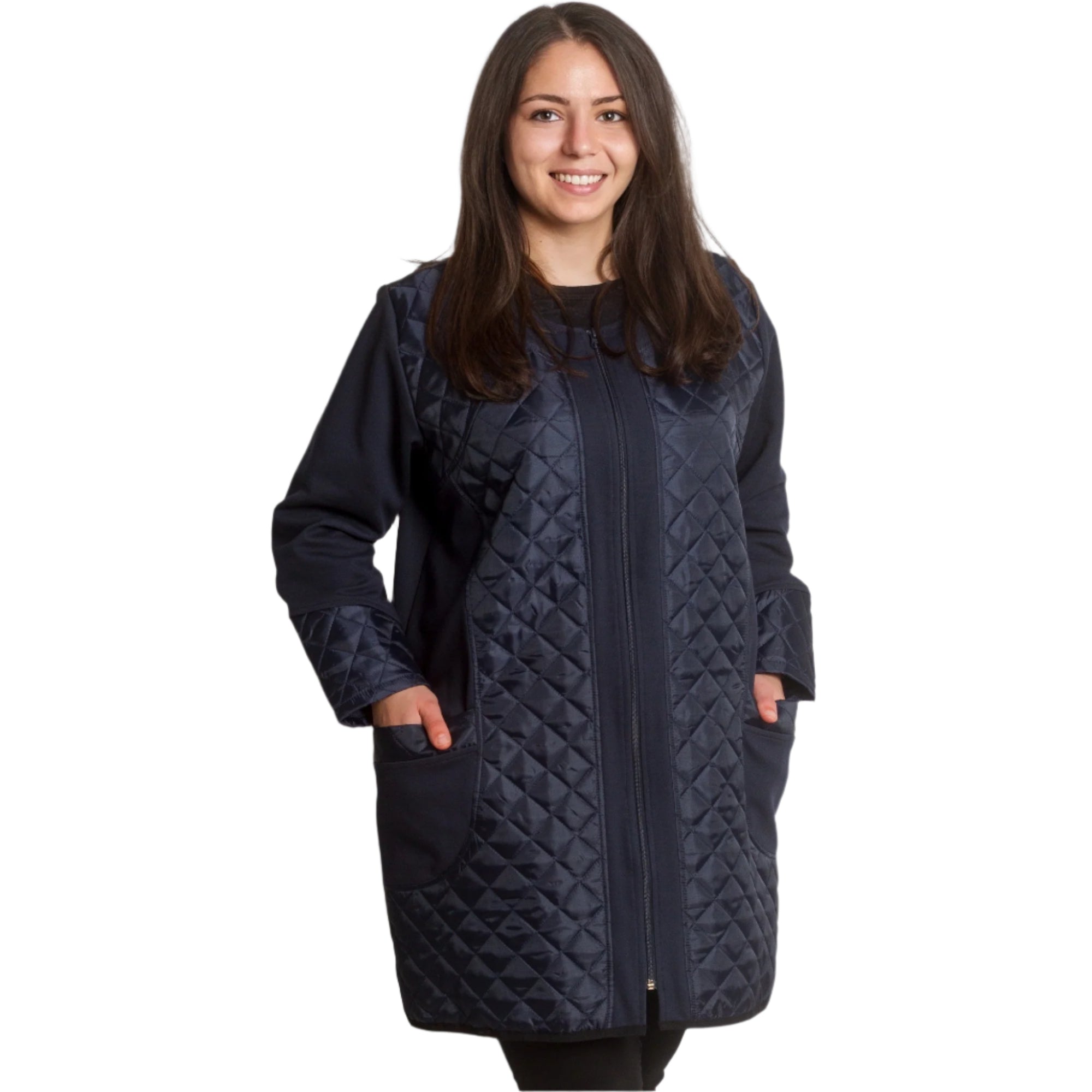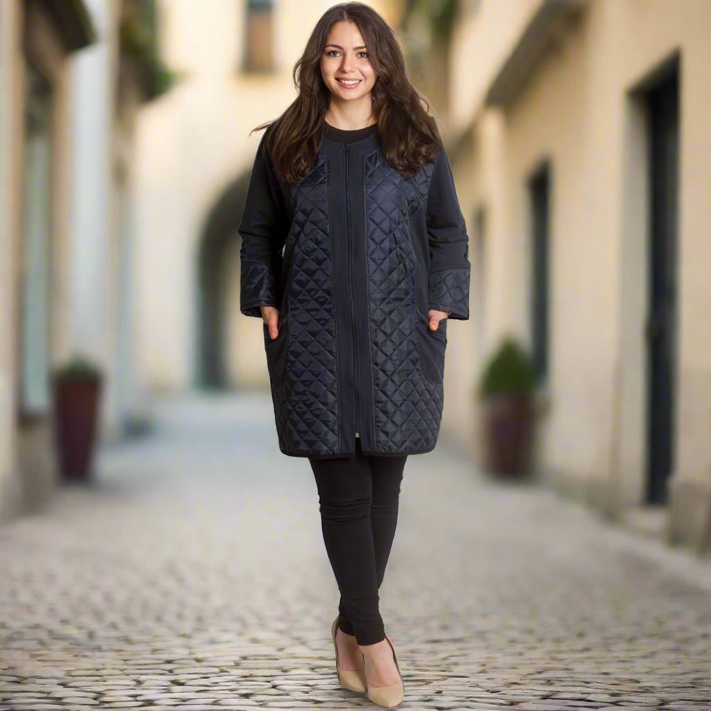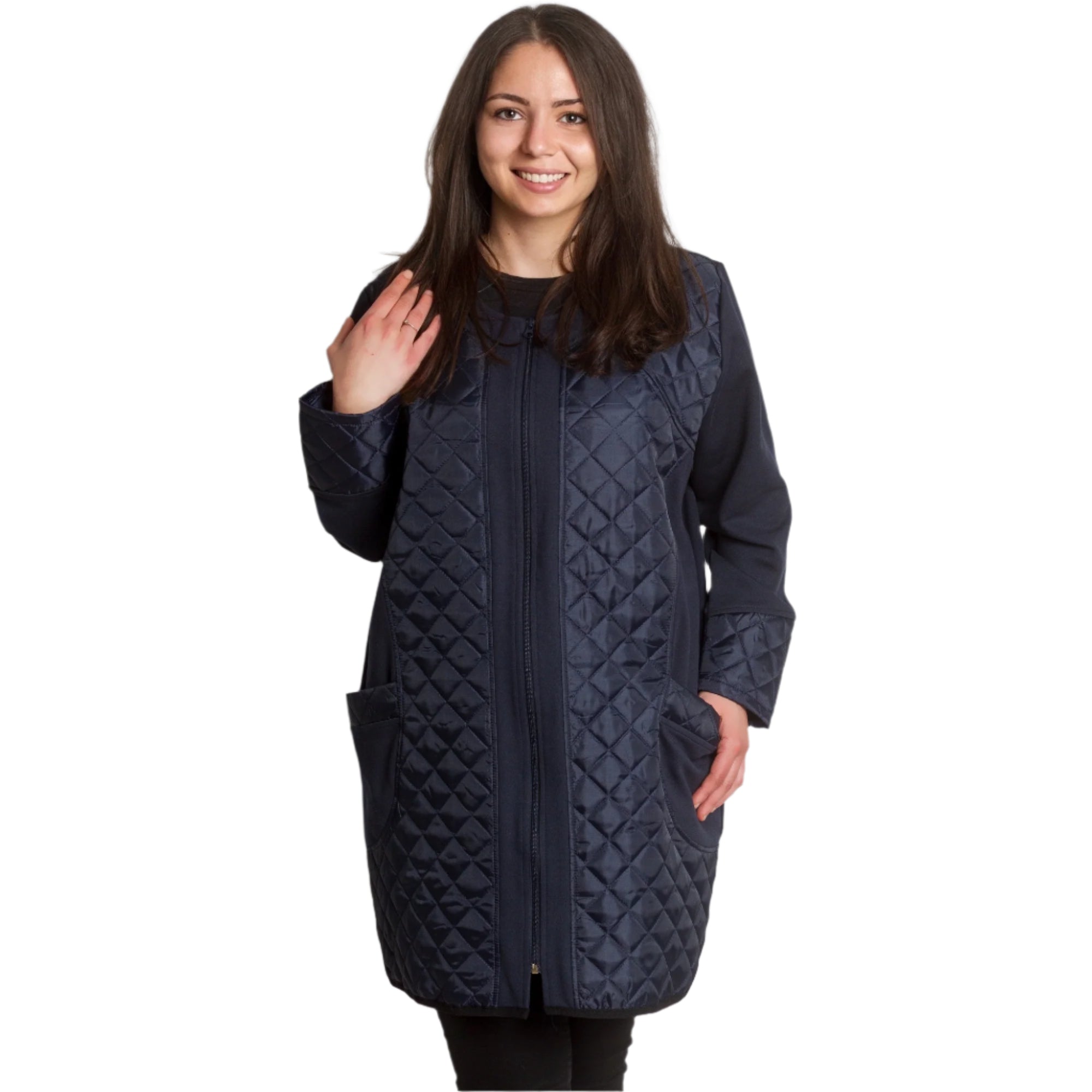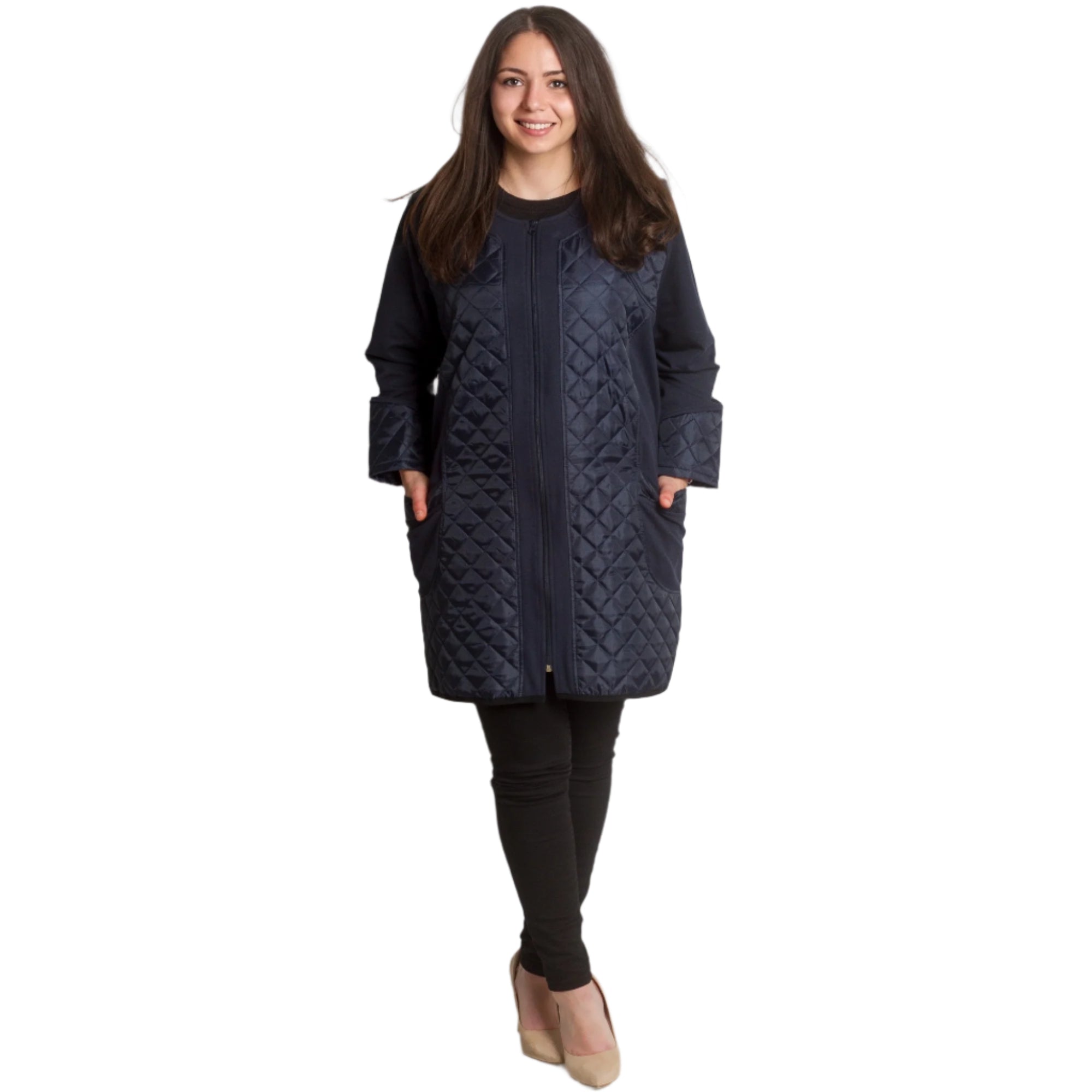 Această jachetă elegantă de damă, de culoare bleumarin, este o alegere ideală pentru un look elegant și modern. Fabricată din materiale de înaltă calitate, combină confortul și rafinamentul. Detaliile matlasate de pe față și mâneci adaugă un accent elegant, iar fermoarul practic permite o purtare confortabilă. Are două buzunare funcționale care completează designul. Perfectă pentru anotimpurile de tranziție, jacheta este potrivită atât pentru ținute formale, cât și casual.