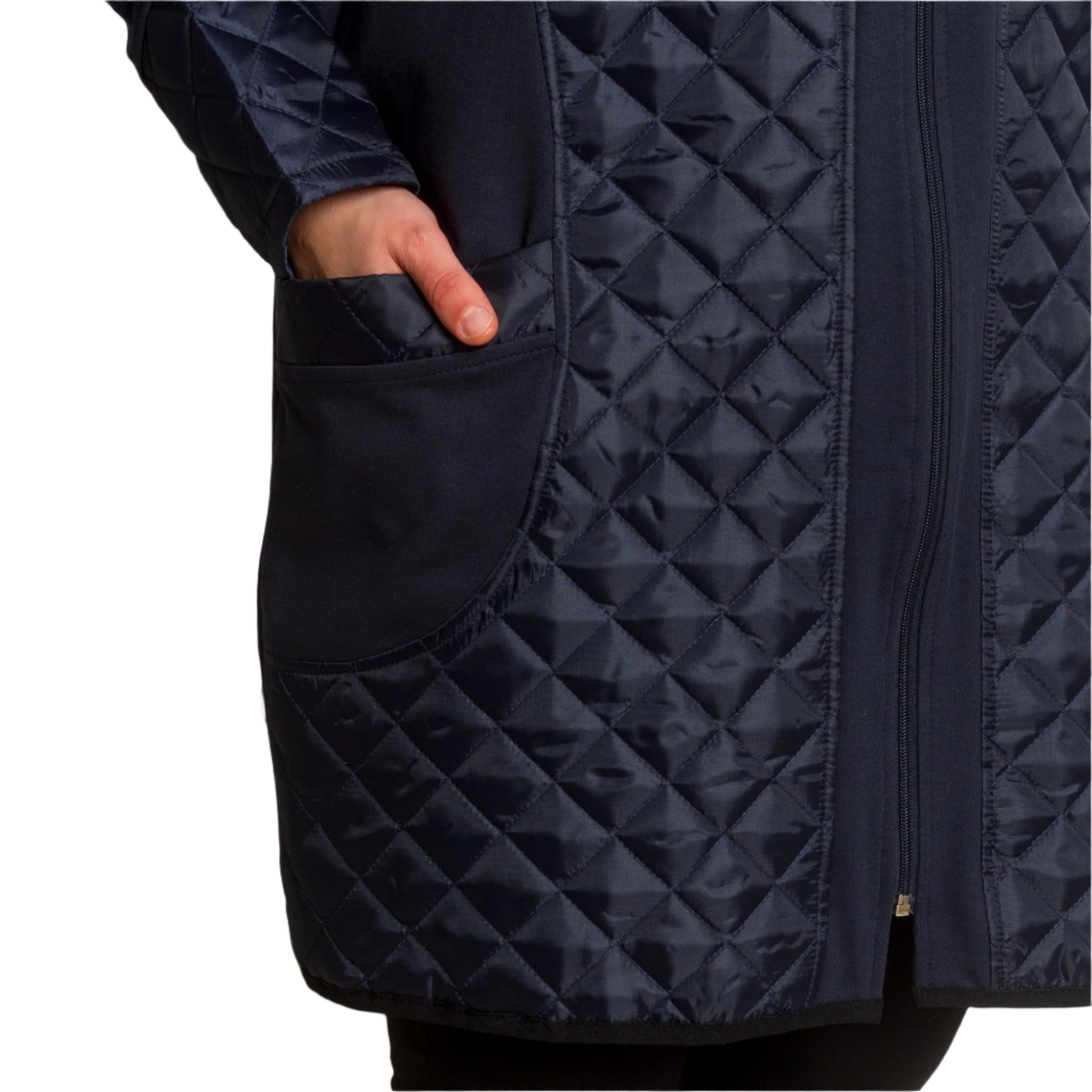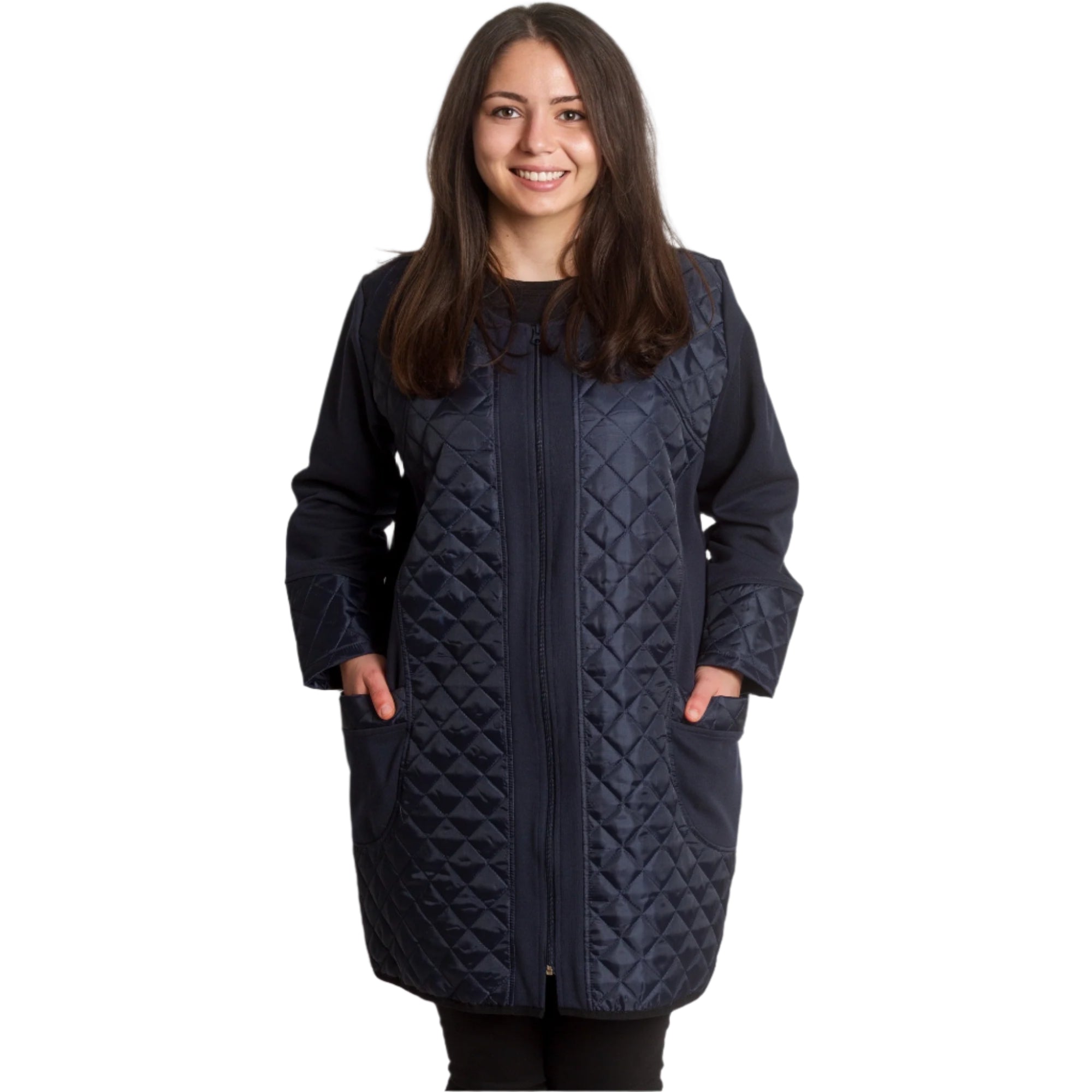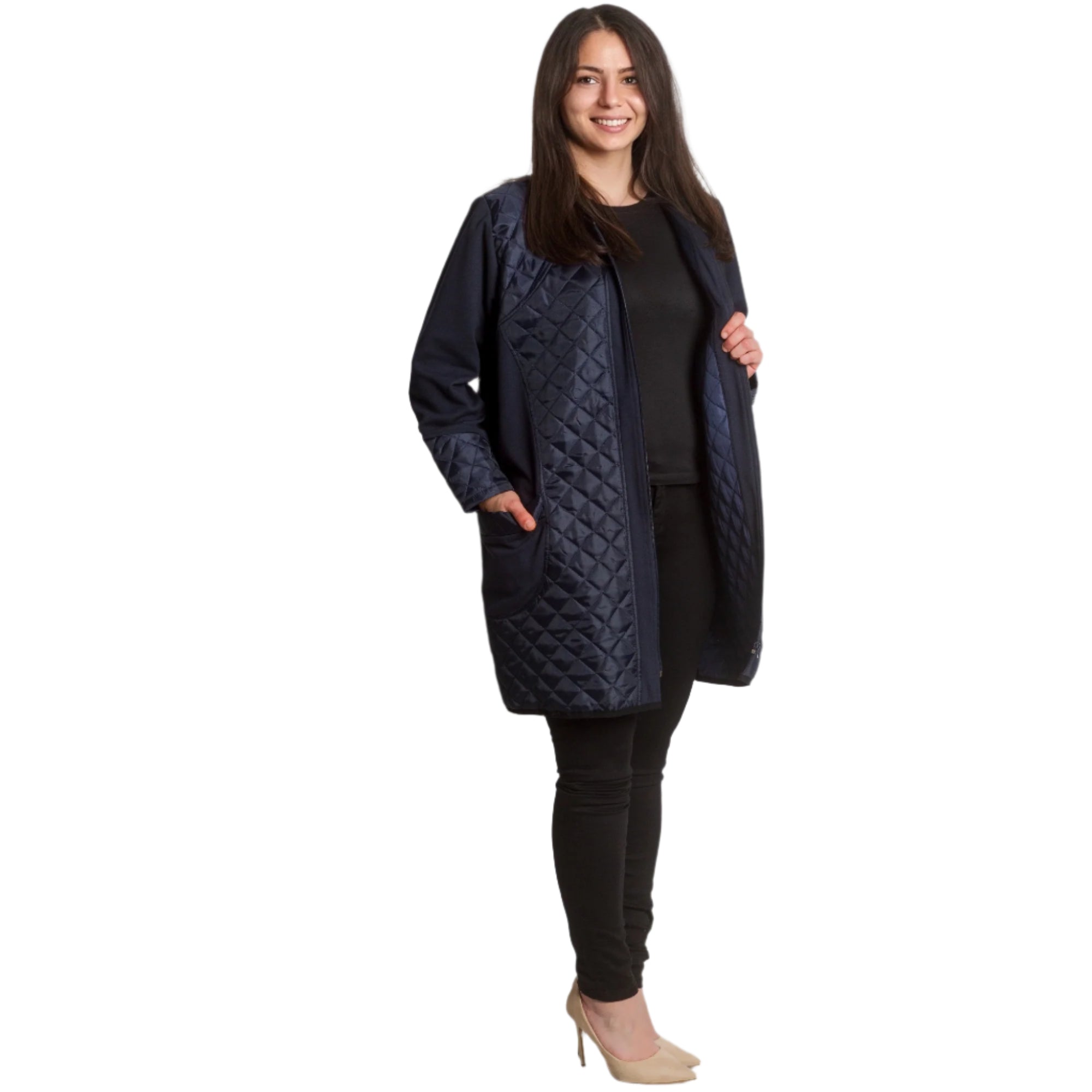 Această jachetă elegantă de damă, de culoare bleumarin, este o alegere ideală pentru un look elegant și modern. Fabricată din materiale de înaltă calitate, combină confortul și rafinamentul. Detaliile matlasate de pe față și mâneci adaugă un accent elegant, iar fermoarul practic permite o purtare confortabilă. Are două buzunare funcționale care completează designul. Perfectă pentru anotimpurile de tranziție, jacheta este potrivită atât pentru ținute formale, cât și casual.