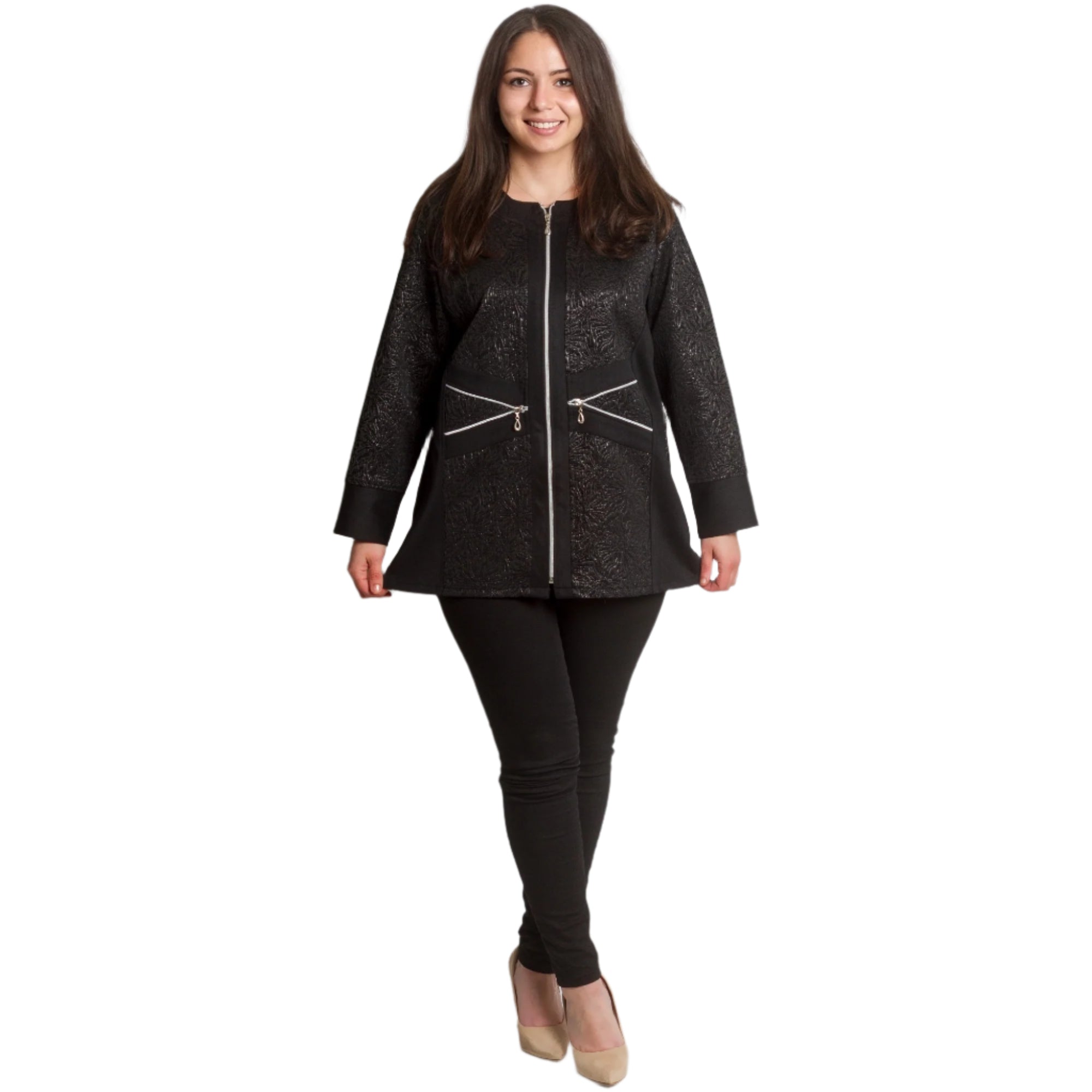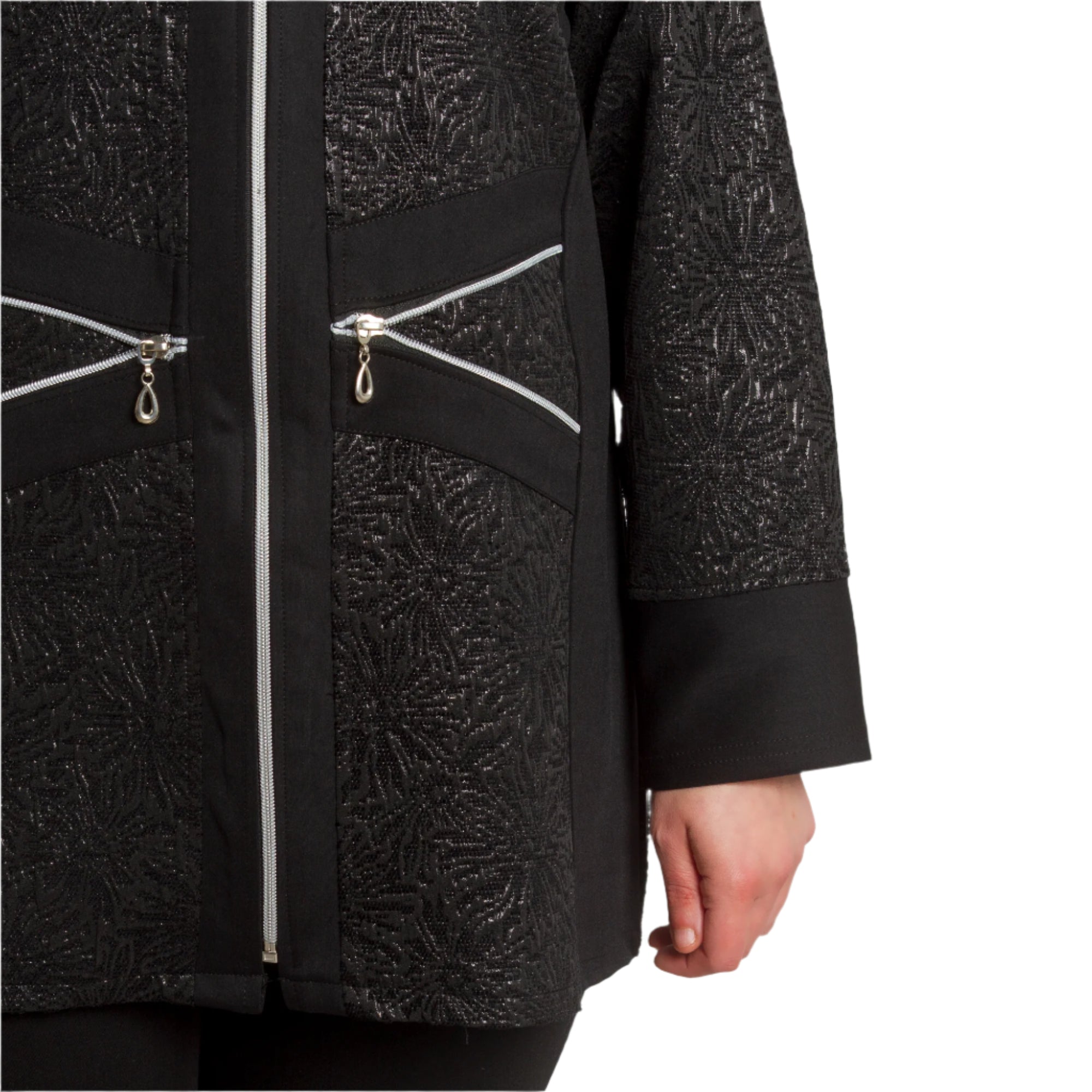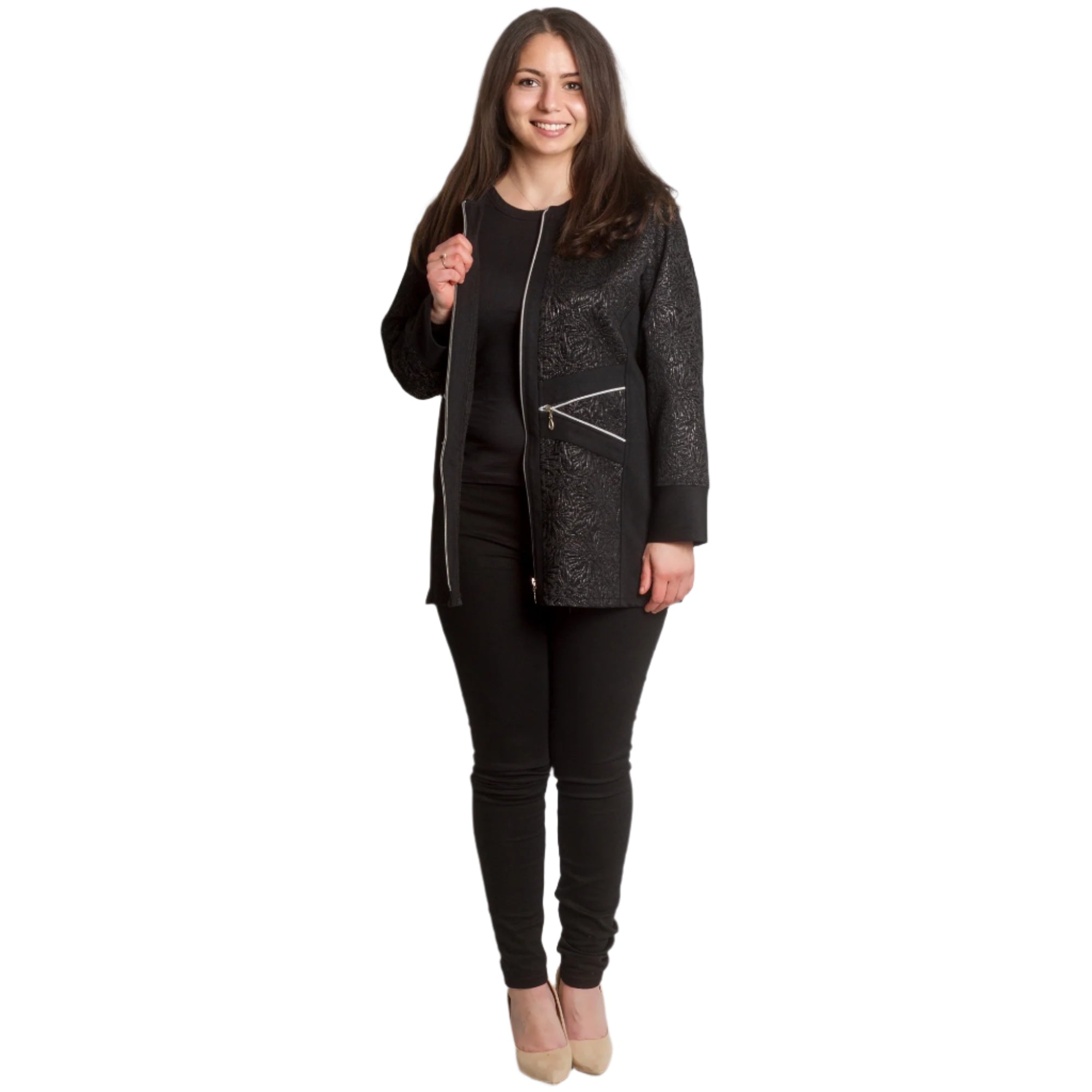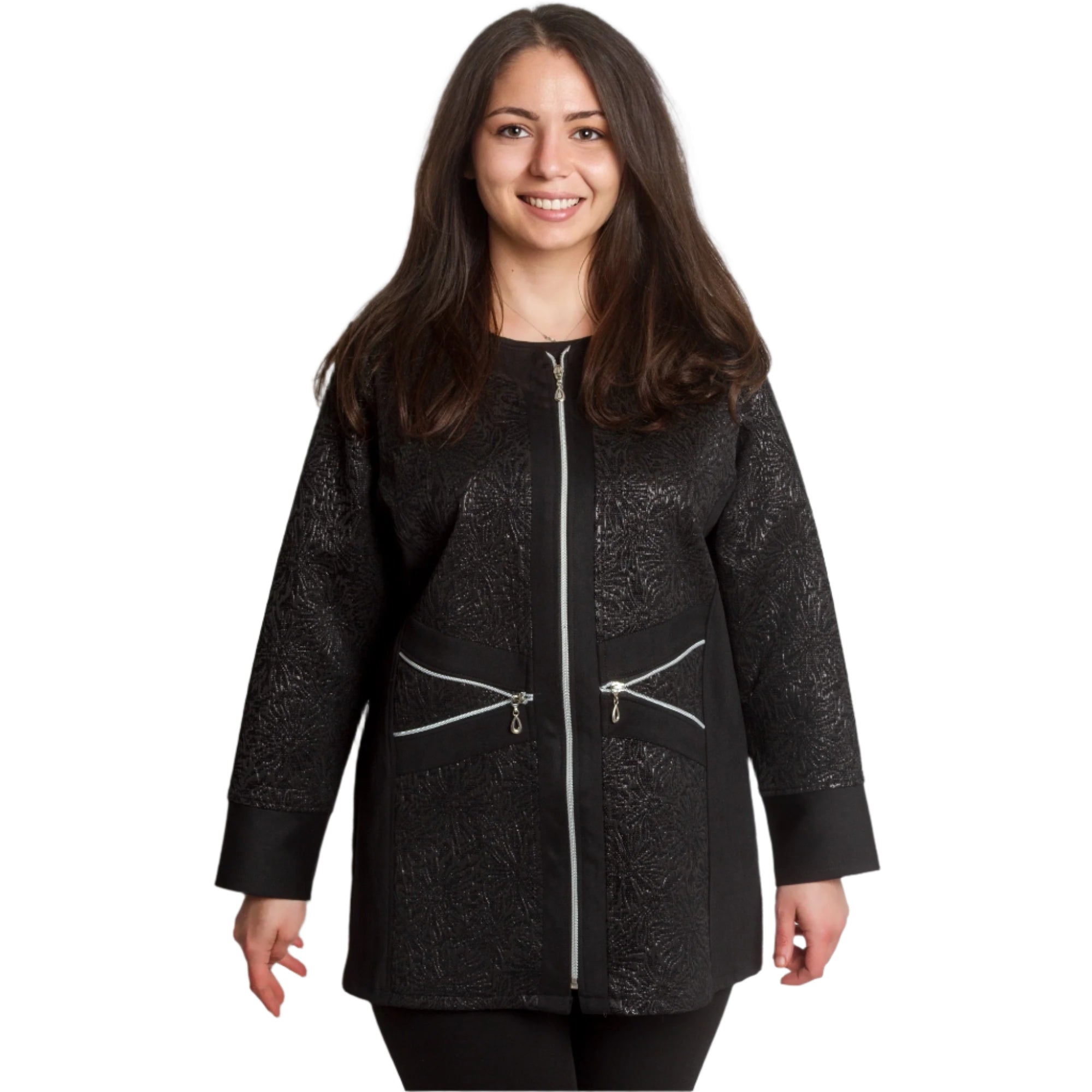 Jachetă elegantă de damă, de culoare neagră, cu o textură florală în relief, care va adăuga eleganță și rafinament oricărui look. Fabricată din țesături de înaltă calitate, cu o ușoară elasticitate, acest model oferă confort și libertate de mișcare. Jacheta are un fermoar funcțional pe față pentru o închidere ușoară, precum și două fermoare decorative care imită buzunarele, ceea ce îi conferă un aspect modern și sofisticat. O alegere perfectă pentru ocazii de zi cu zi și formale!
