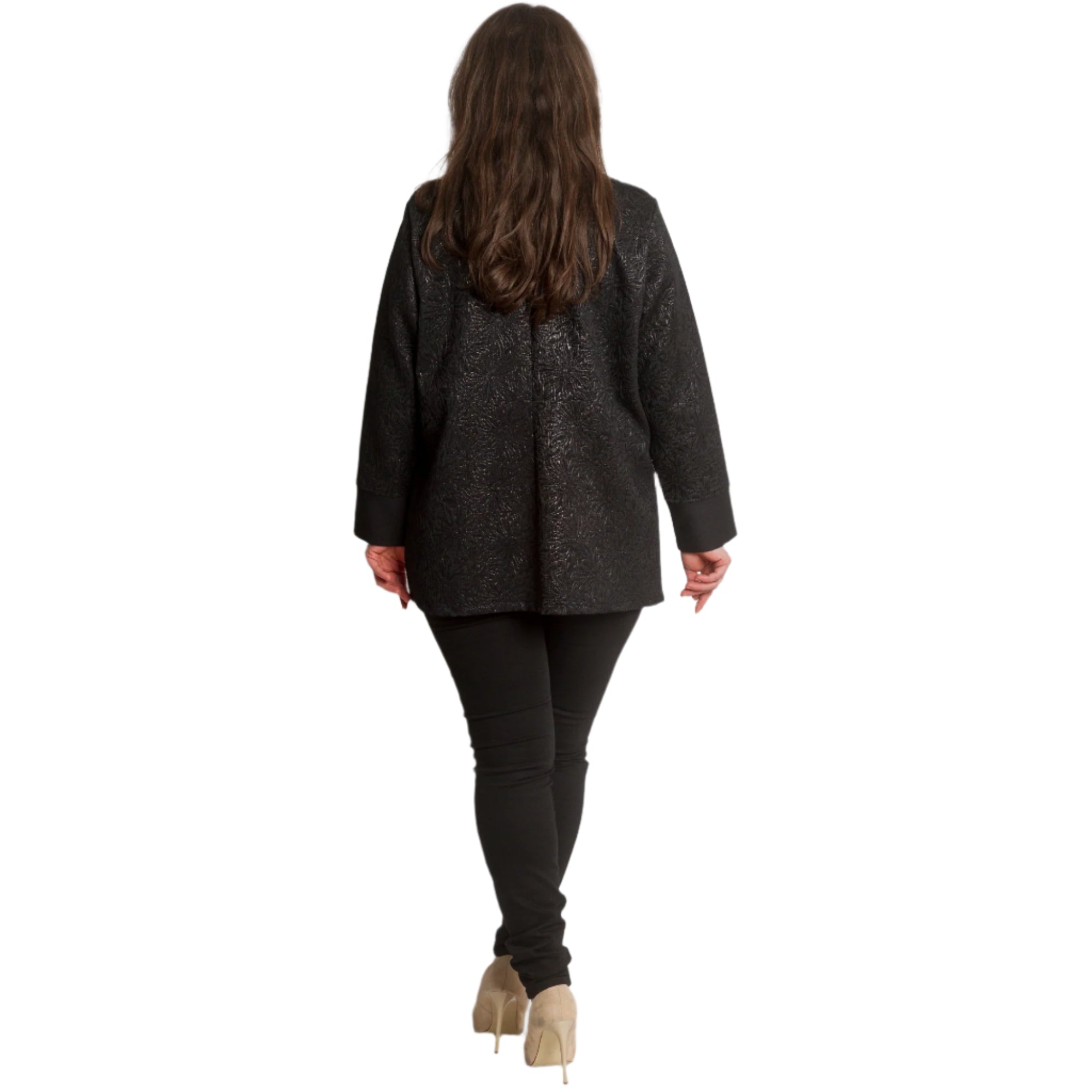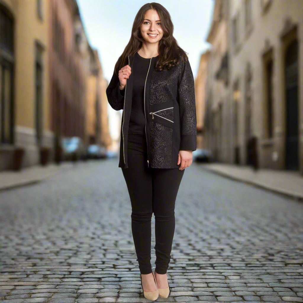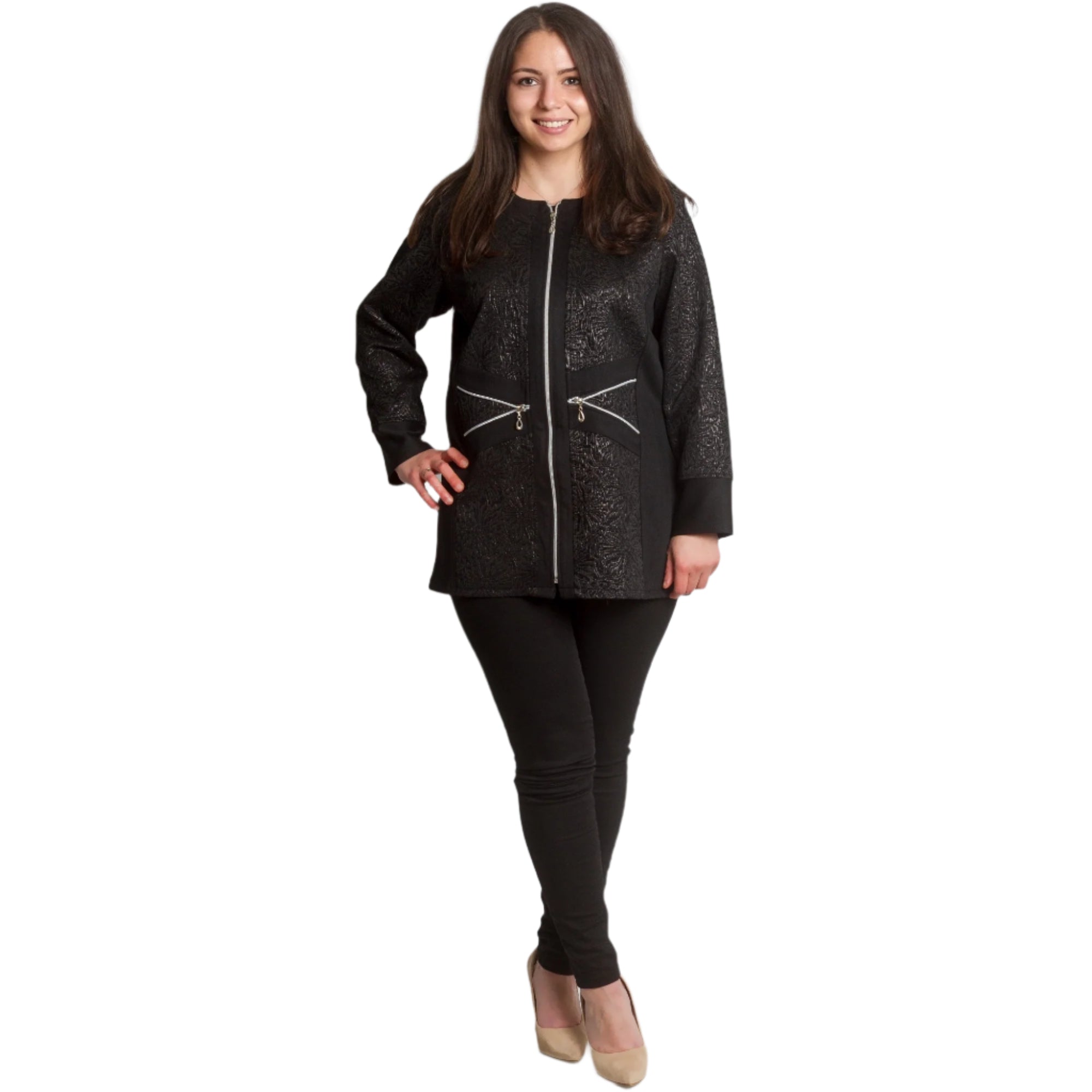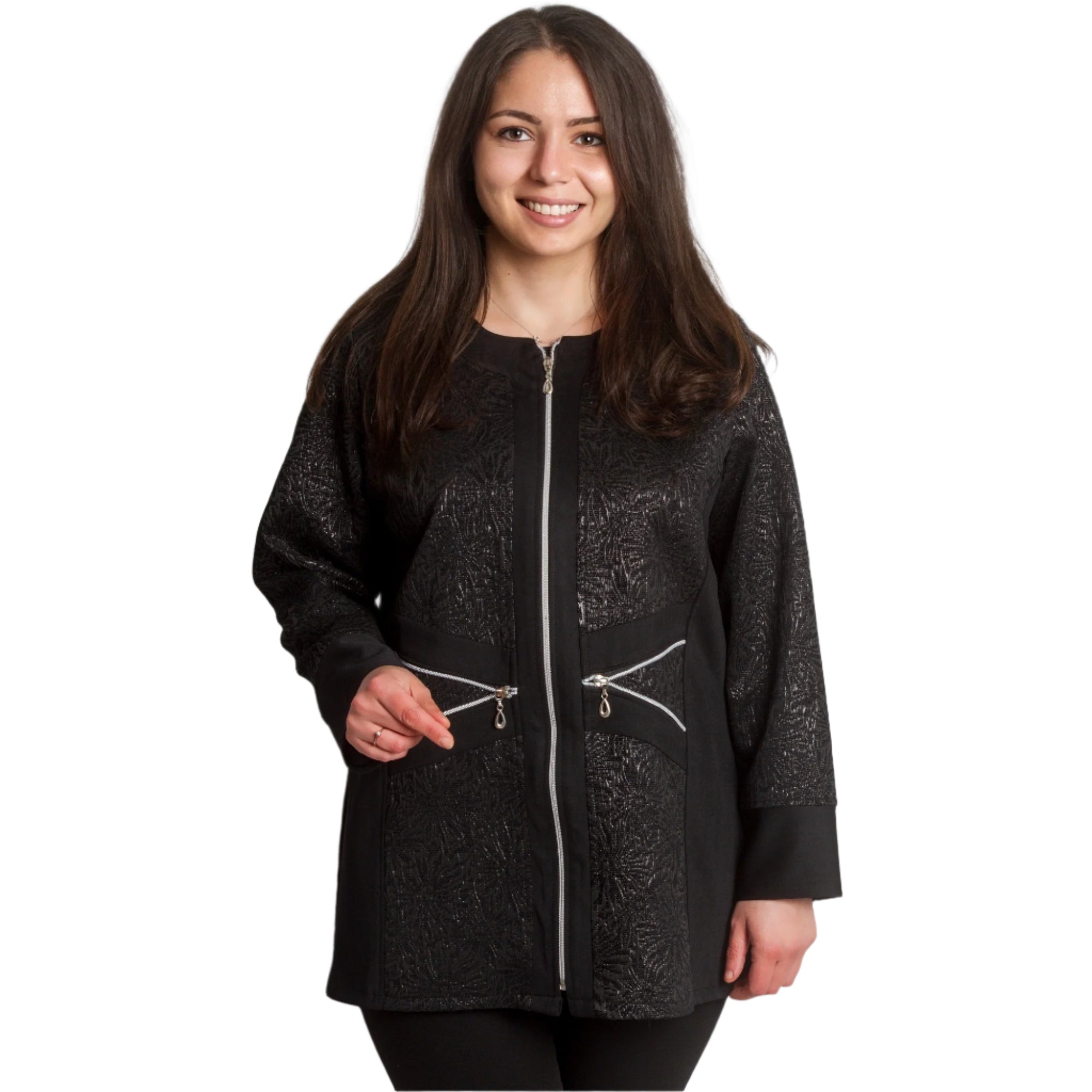 Jachetă elegantă de damă, de culoare neagră, cu o textură florală în relief, care va adăuga eleganță și rafinament oricărui look. Fabricată din țesături de înaltă calitate, cu o ușoară elasticitate, acest model oferă confort și libertate de mișcare. Jacheta are un fermoar funcțional pe față pentru o închidere ușoară, precum și două fermoare decorative care imită buzunarele, ceea ce îi conferă un aspect modern și sofisticat. O alegere perfectă pentru ocazii de zi cu zi și formale!