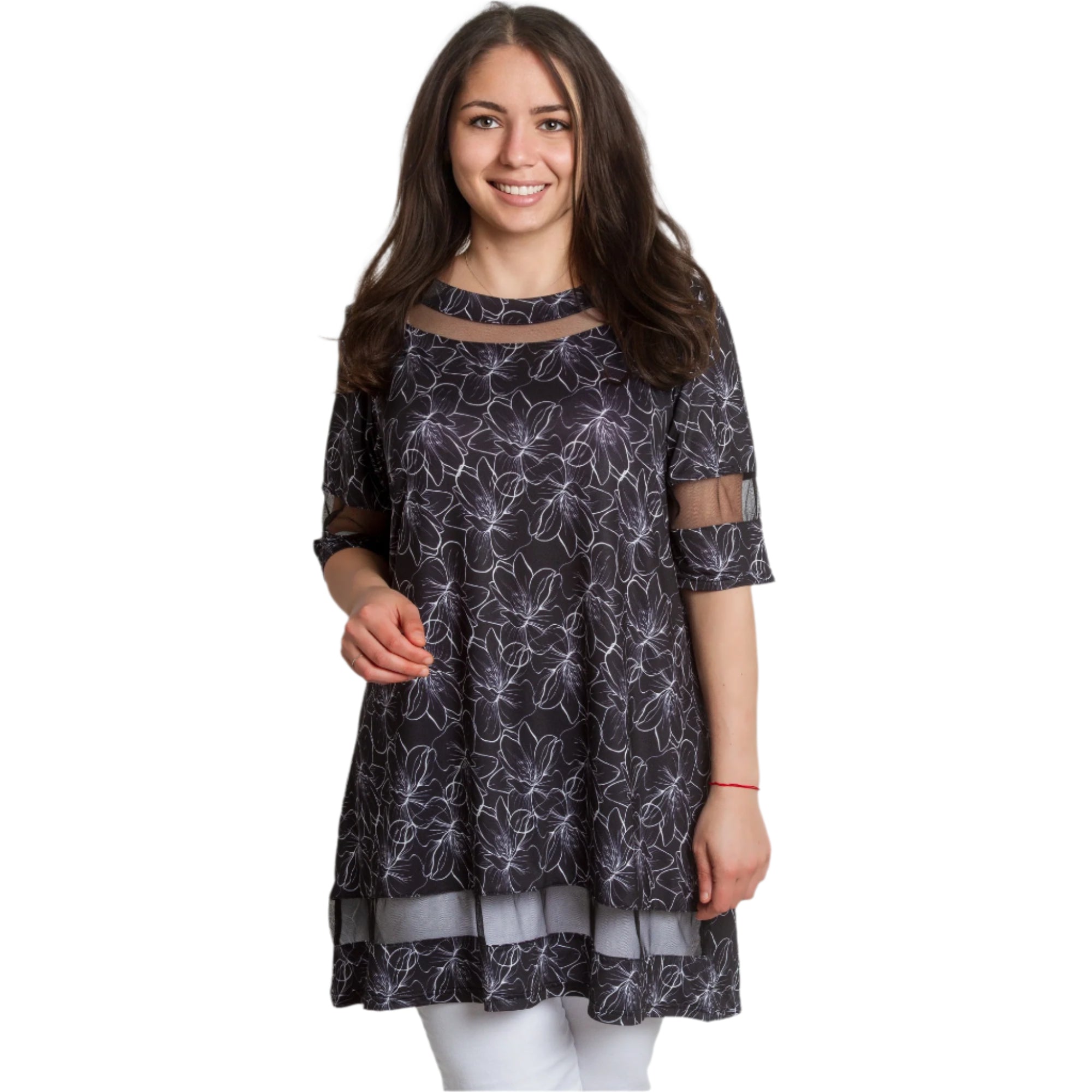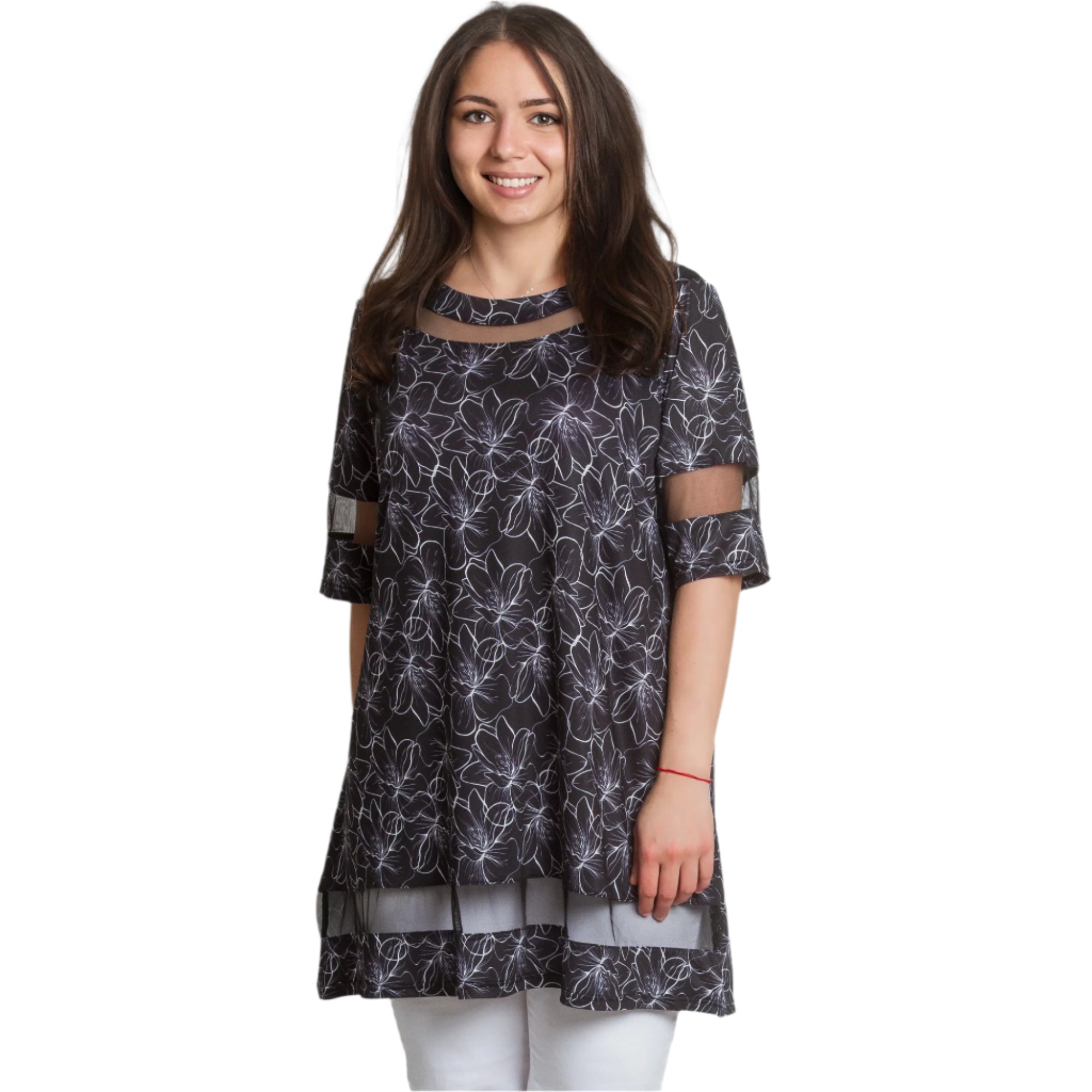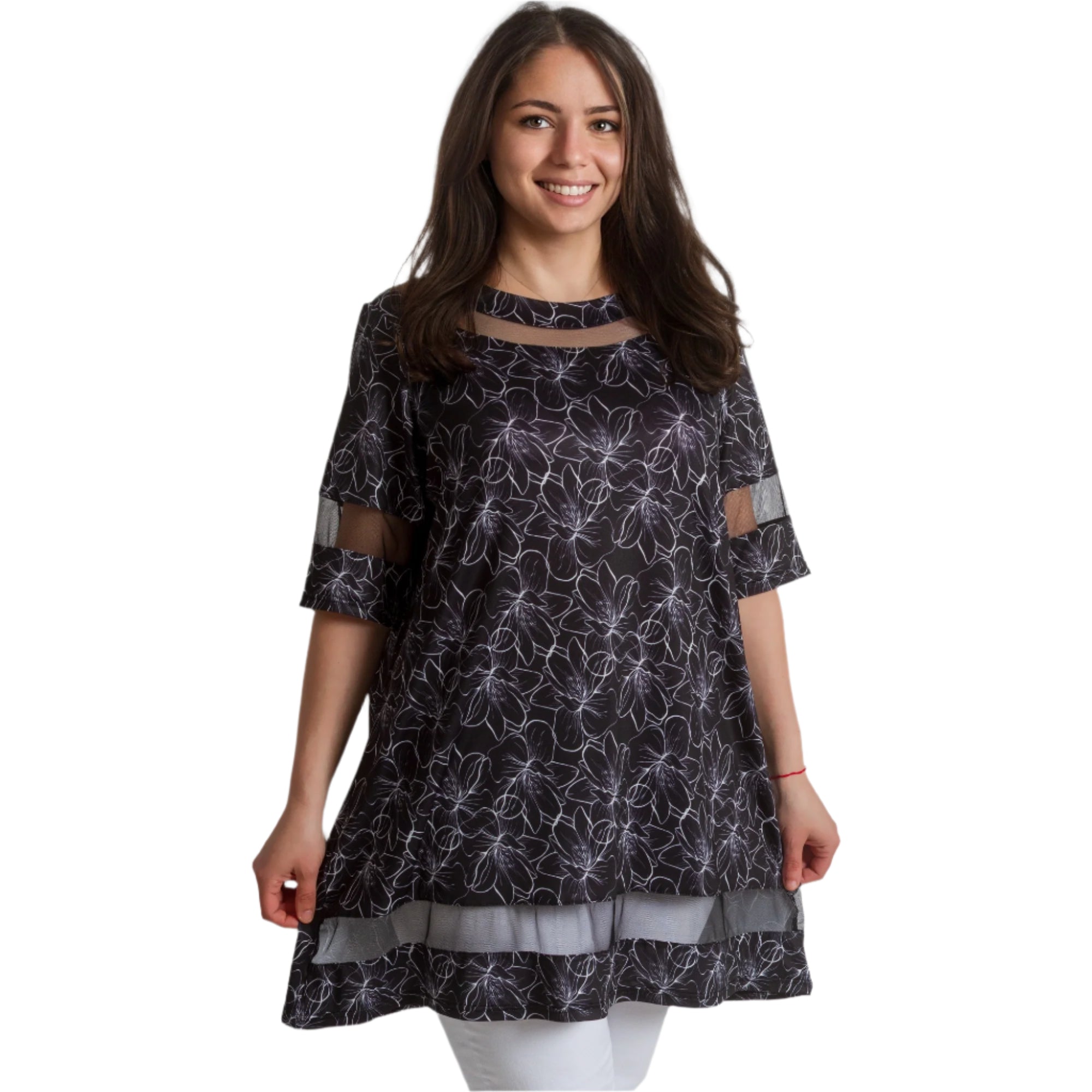 Tunica elegantă de damă, în mărimi mari, decorată cu un model floral elegant în alb și negru. Confecționată dintr-un material ușor și plăcut la atingere - 70% poliamidă, 25% poliester și 5% elastan - acest model este perfect pentru anotimpurile calde. Designul este îmbogățit cu elemente de plasă în jurul decolteului, mânecilor și tivului, completate de un accent de piele care îi conferă un aspect modern. Tunica are o croială lejeră confortabilă și mâneci scurte, ceea ce o face potrivită atât pentru viața de zi cu zi, cât și pentru ocazii mai speciale.