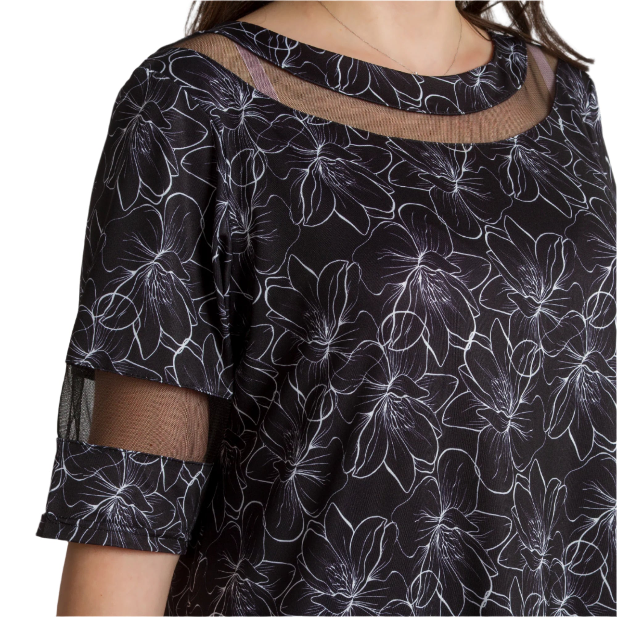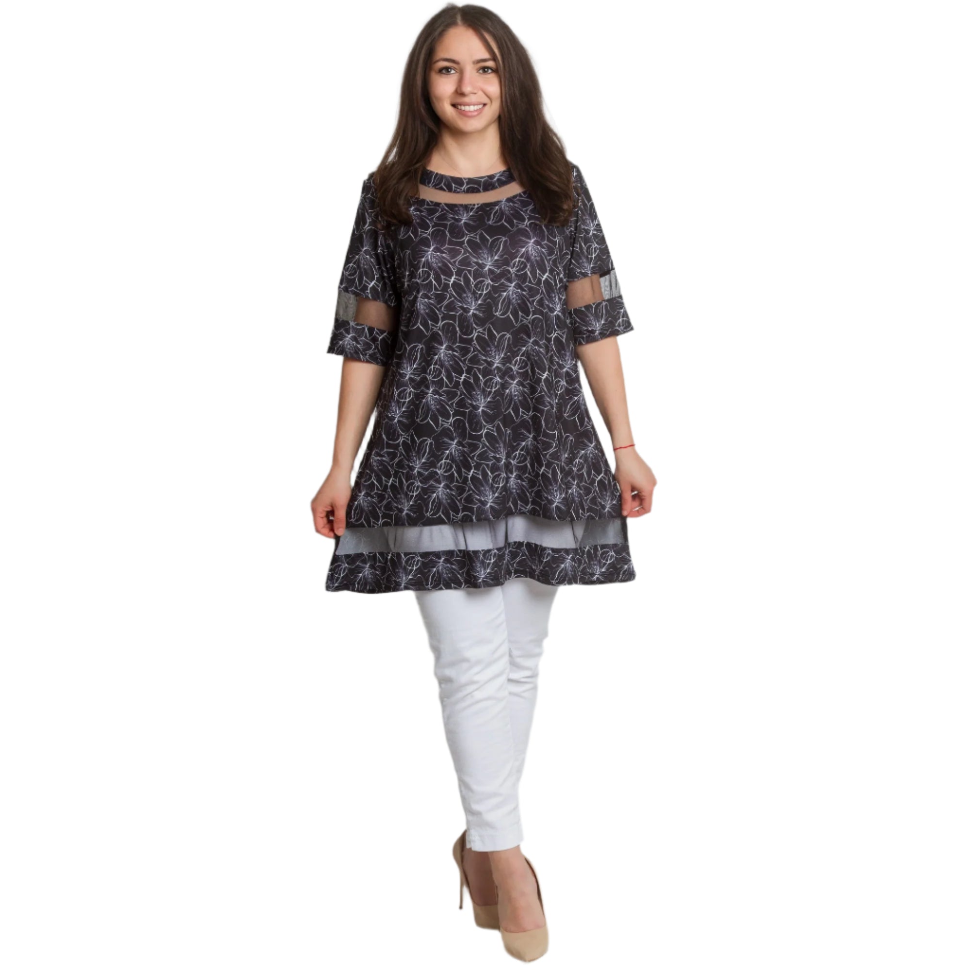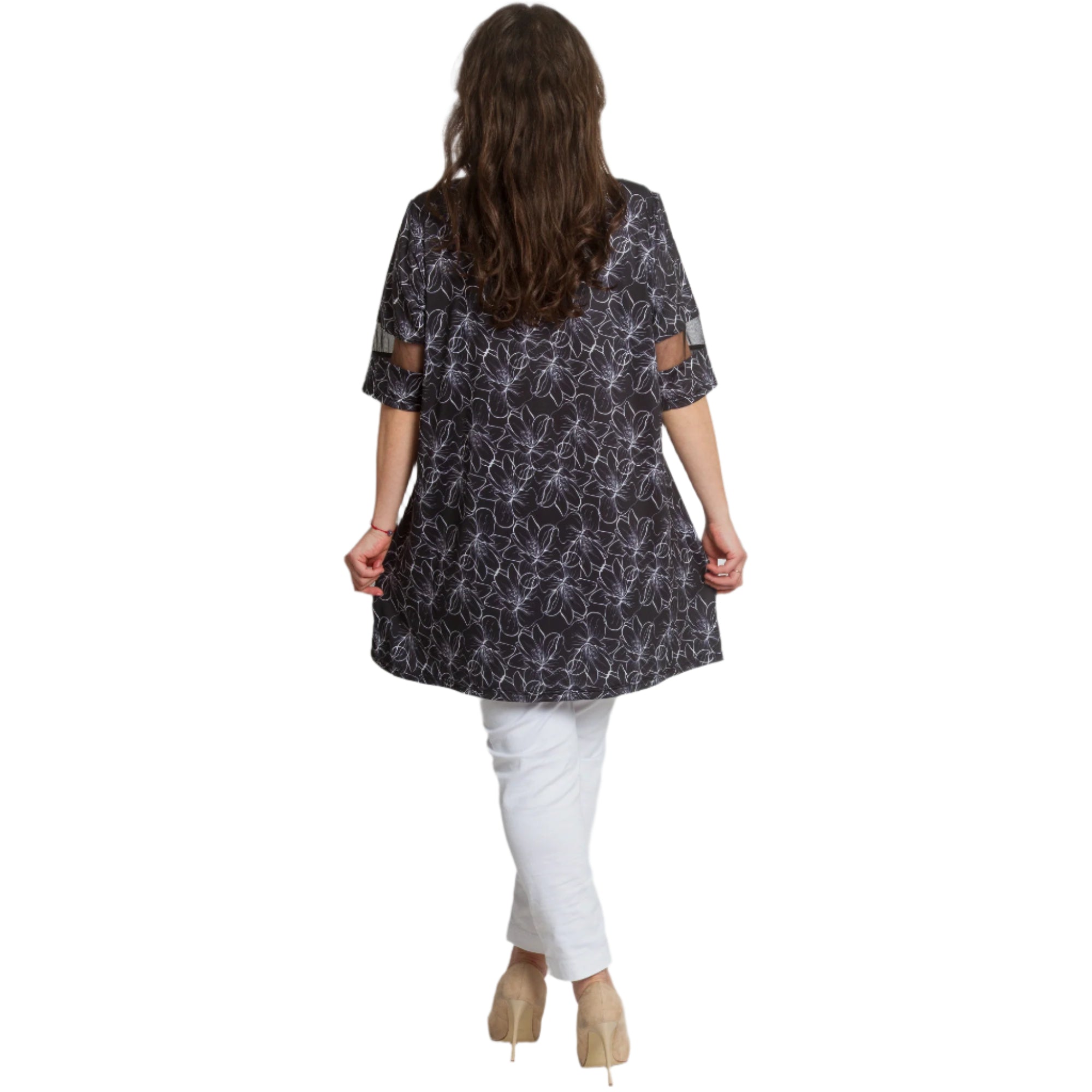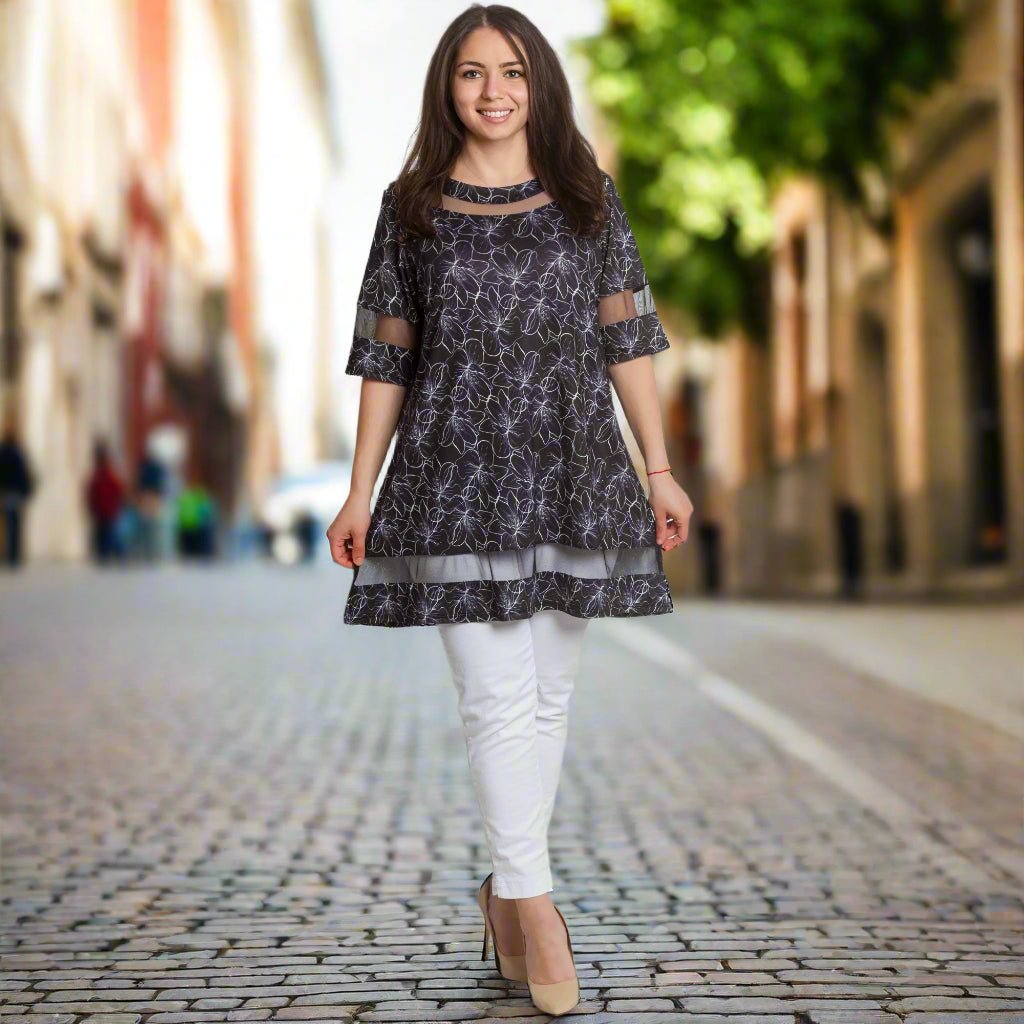Tunica elegantă de damă, în mărimi mari, decorată cu un model floral elegant în alb și negru. Confecționată dintr-un material ușor și plăcut la atingere - 70% poliamidă, 25% poliester și 5% elastan - acest model este perfect pentru anotimpurile calde. Designul este îmbogățit cu elemente de plasă în jurul decolteului, mânecilor și tivului, completate de un accent de piele care îi conferă un aspect modern. Tunica are o croială lejeră confortabilă și mâneci scurte, ceea ce o face potrivită atât pentru viața de zi cu zi, cât și pentru ocazii mai speciale.