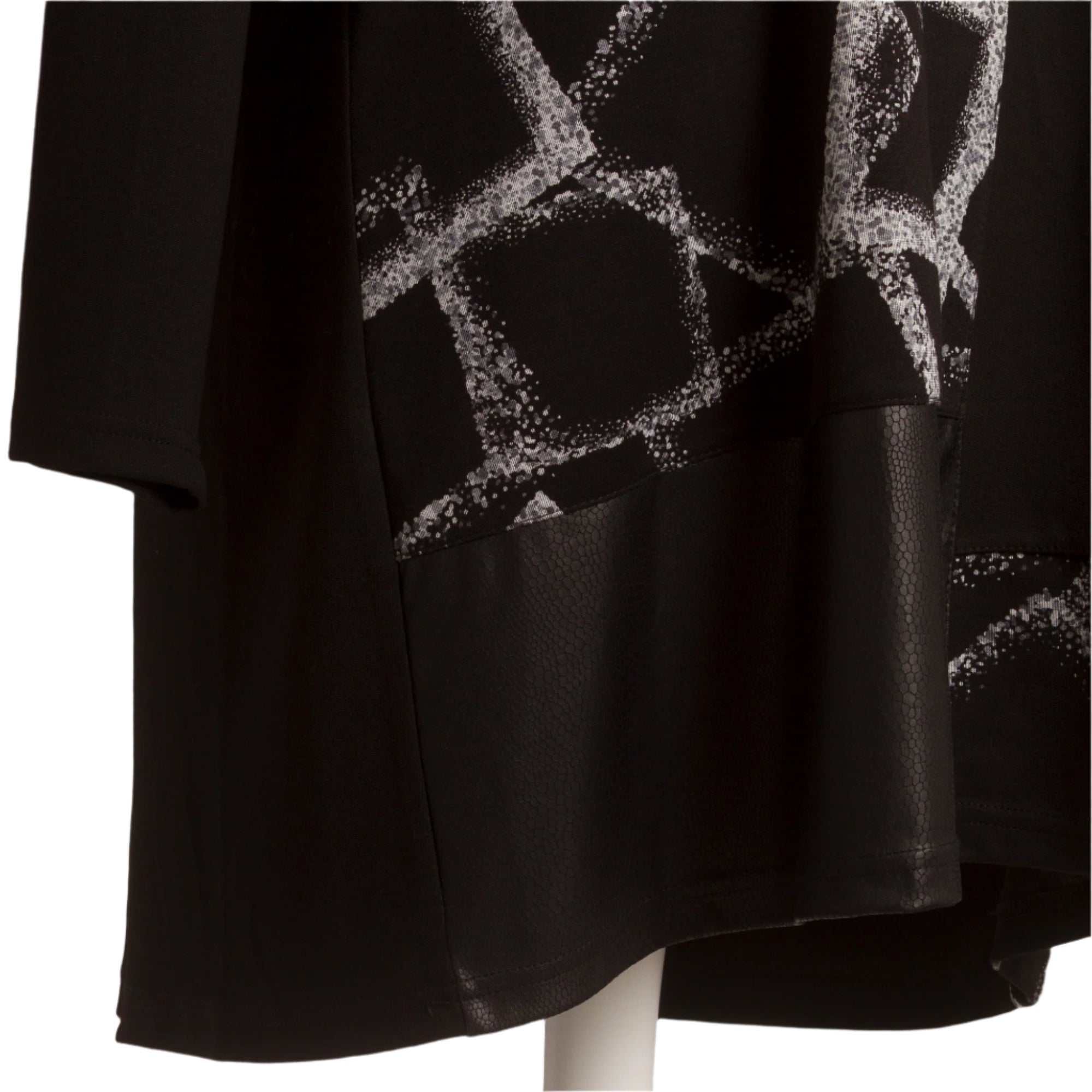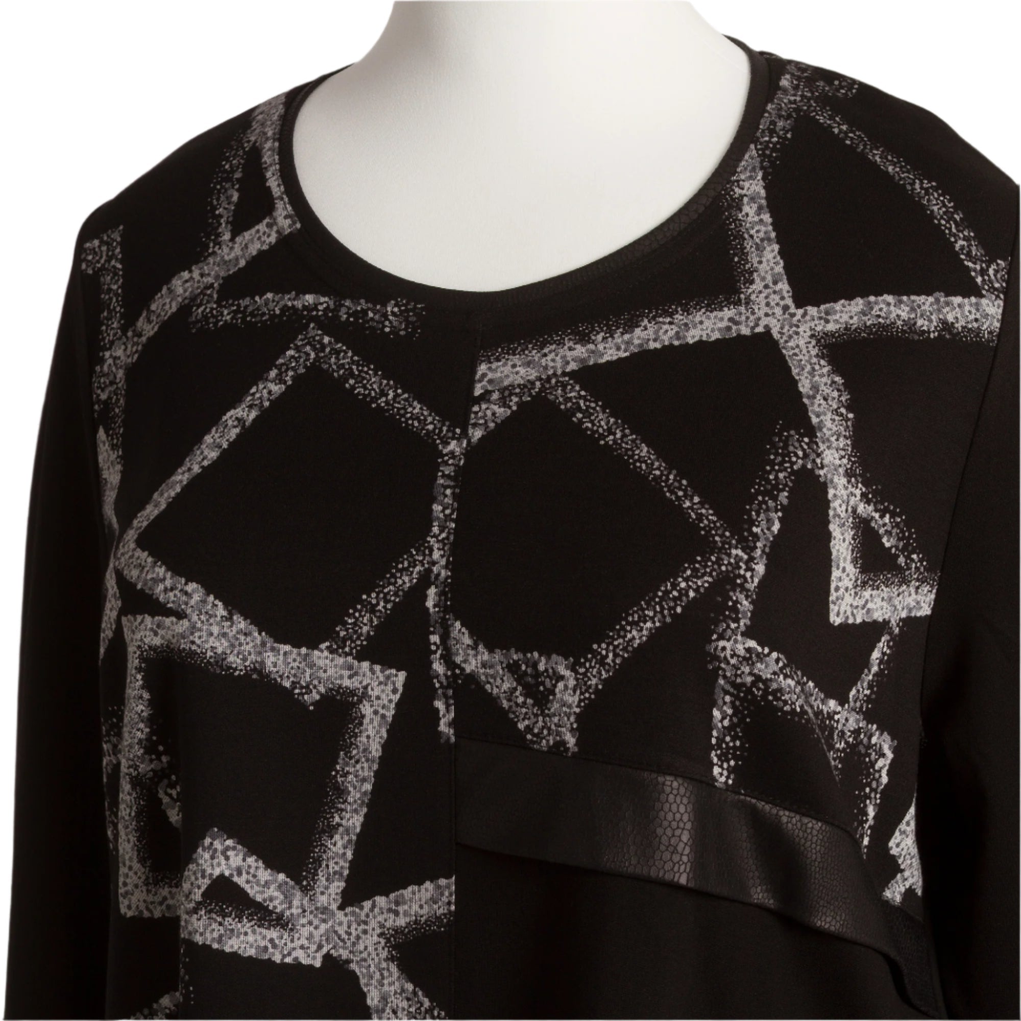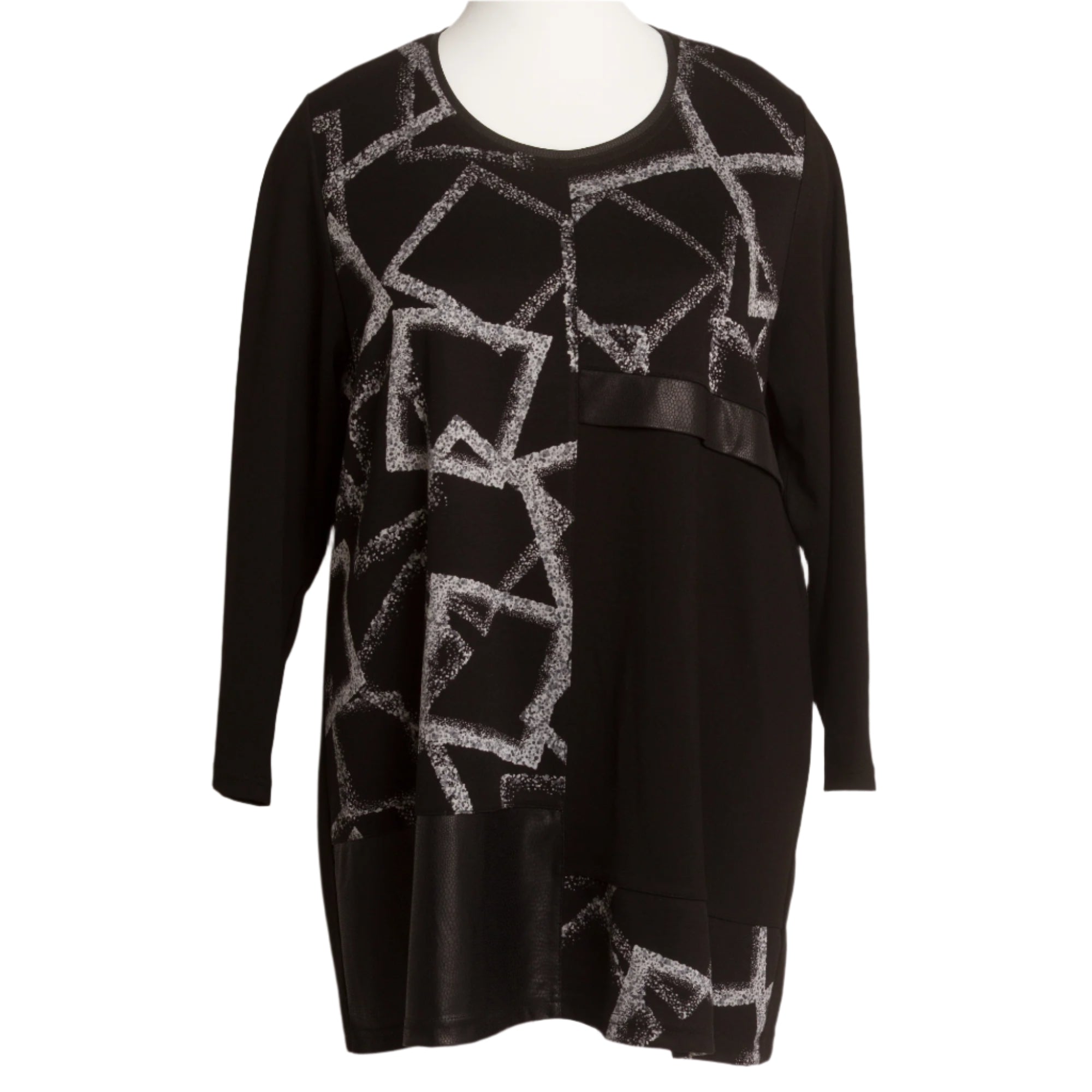 Tunică elegantă de damă, în mărimi mari, confecționată din material textil de înaltă calitate, cu un ușor luciu. Culoarea principală neagră este reîmprospătată cu un model geometric în alb-argintiu, care conferă un aspect contemporan. Panglica de satin din partea de sus adaugă un detaliu sofisticat modelului. Tunica are o croială dreaptă, ușor evazată, care creează o senzație de libertate și confort. Potrivită atât pentru viața de zi cu zi, cât și pentru ocazii mai formale.