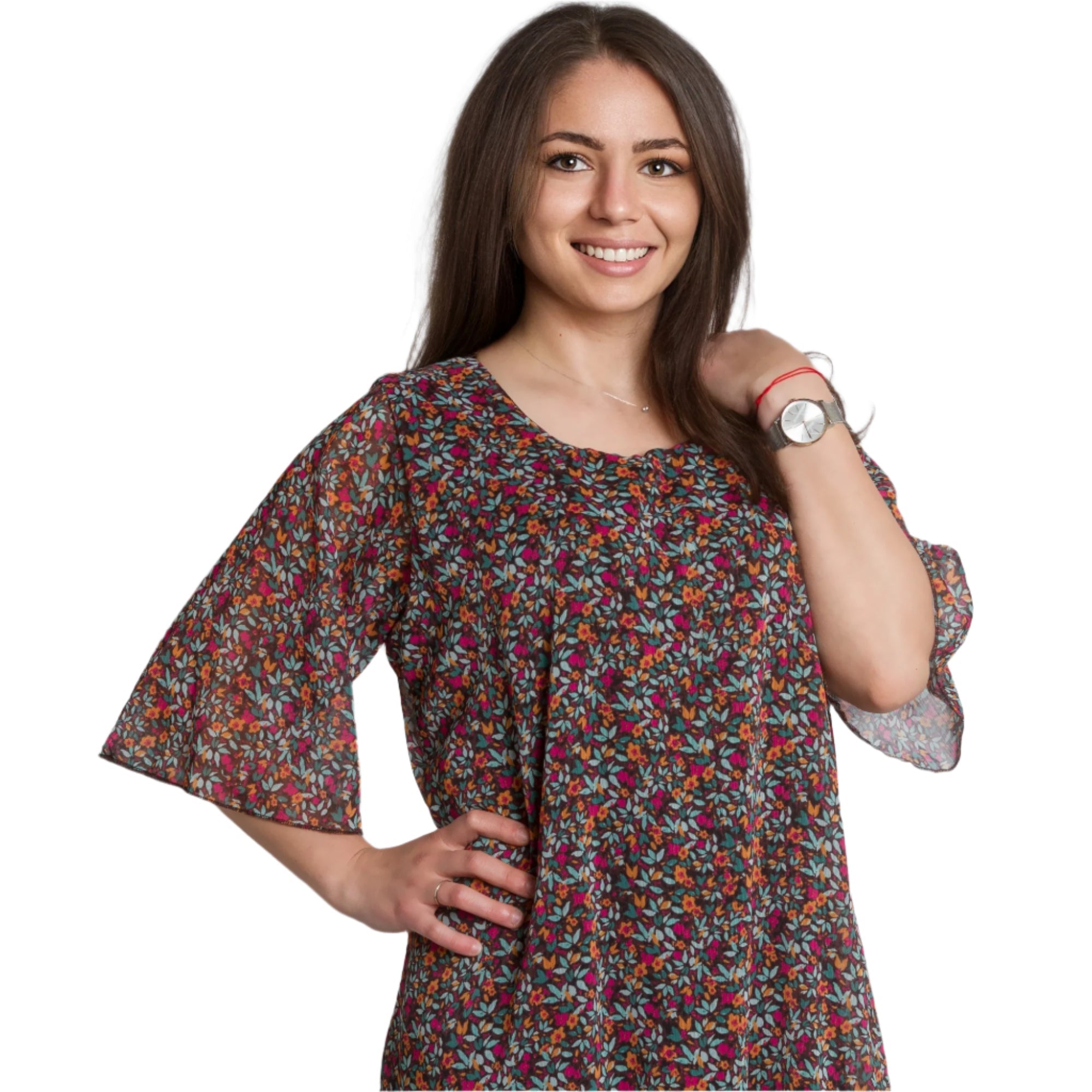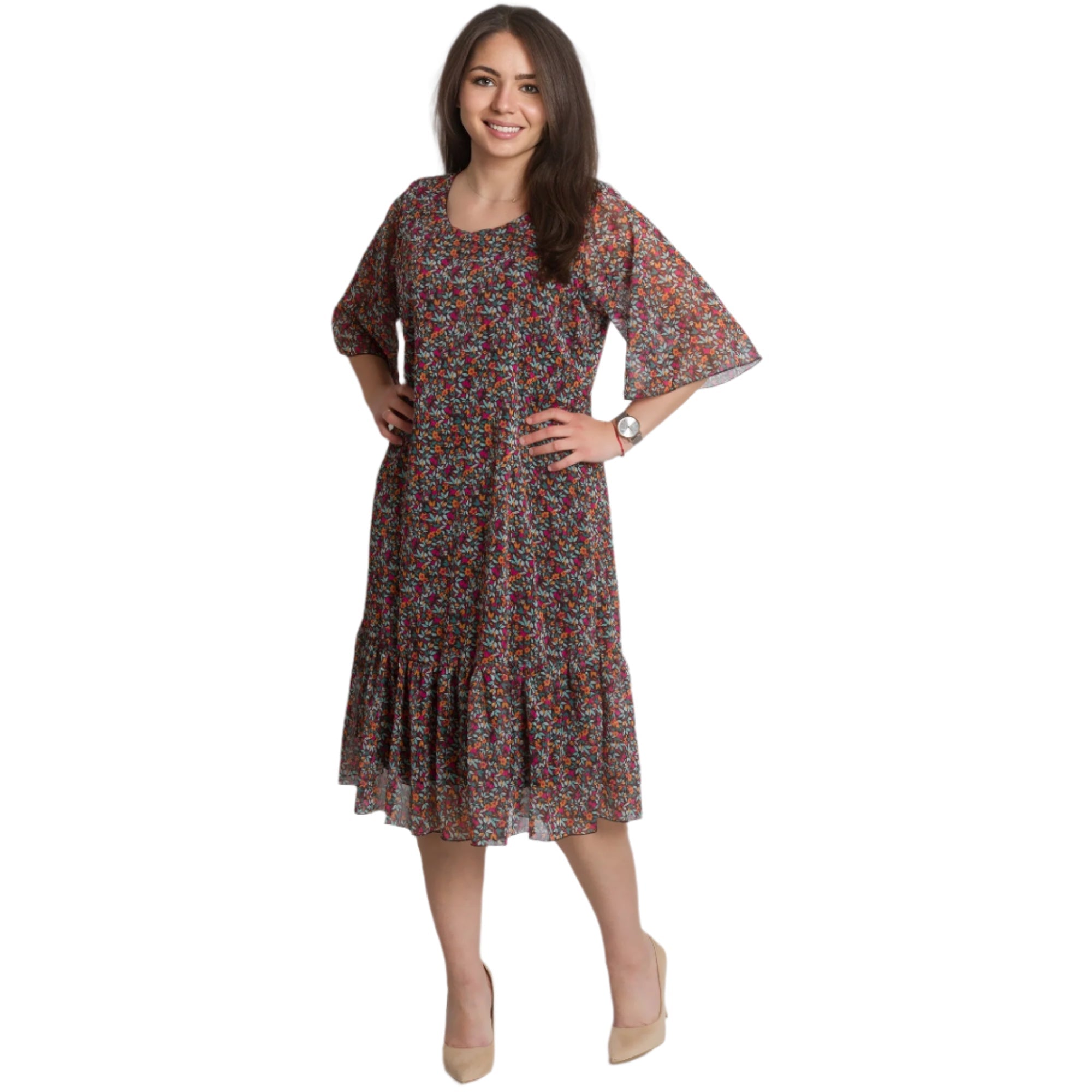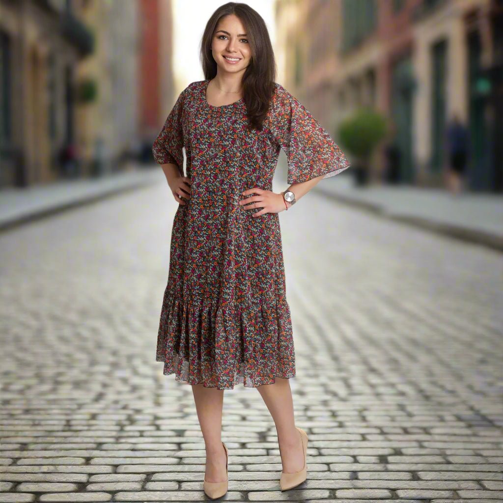 Arată-ți feminitatea cu această rochie sofisticată cu imprimeu floral. Confecționată din viscoză de înaltă calitate, cu un aspect ușor elastic, oferă confort pe tot parcursul zilei. O croială dreaptă care cade liber și elegant, combinată cu un volan delicat în partea de jos, adaugă mișcare și o finisare subtilă siluetei. Ideală pentru ocazii formale, sărbători sau ținute elegante de zi cu zi.