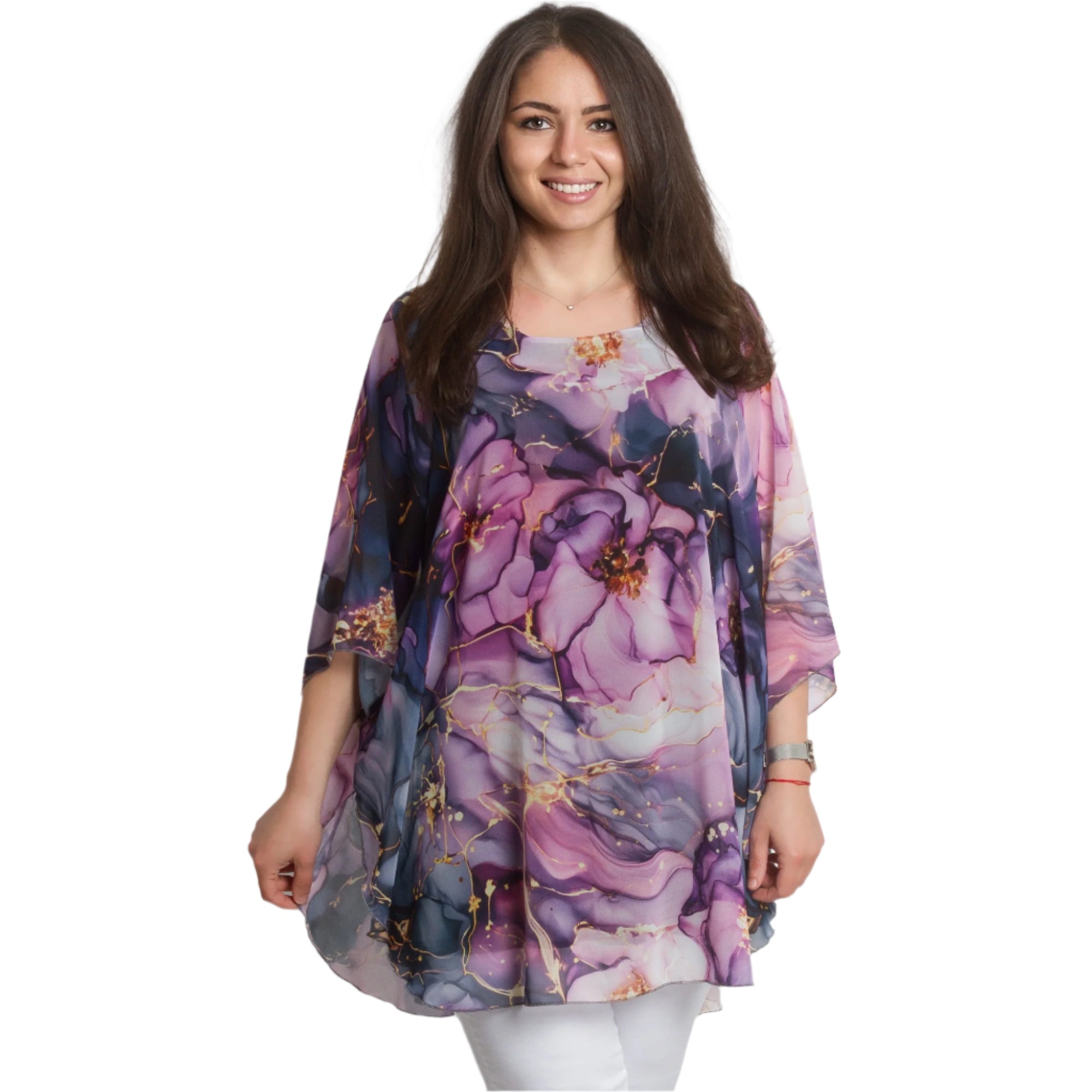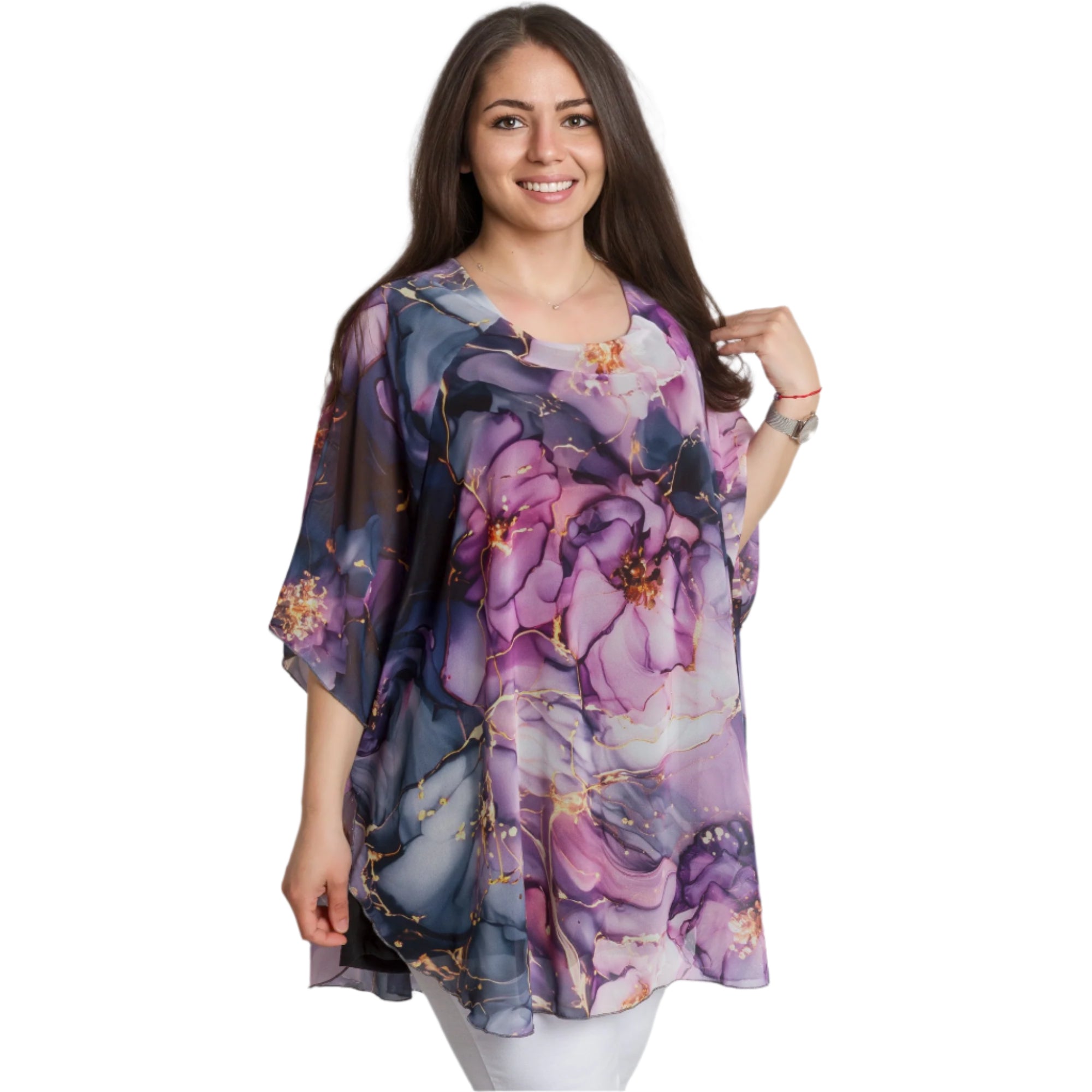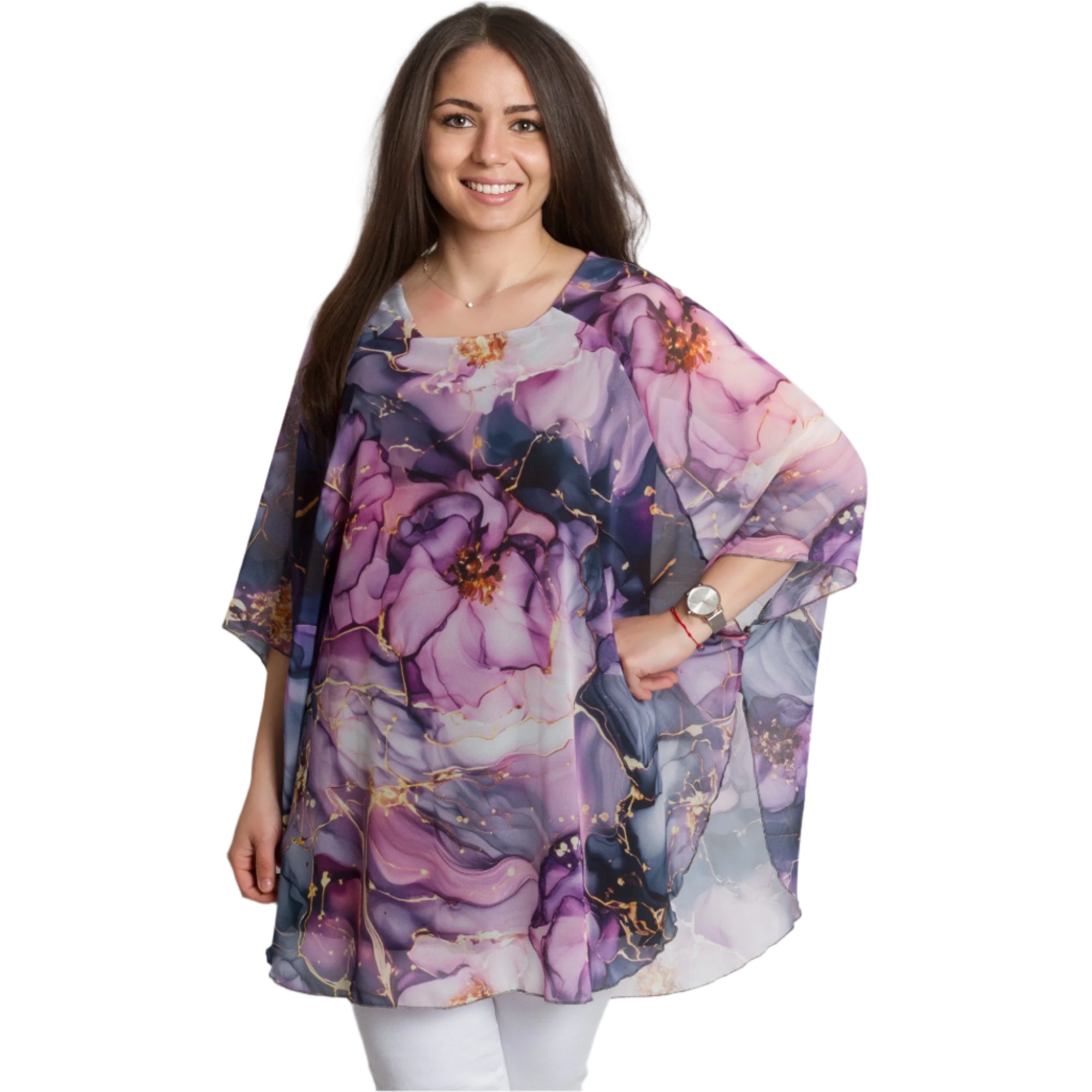 Transformă-ți look-ul cu această tunică elegantă impresionantă, din șifon în culori iridescente și un model floral romantic. Confecționată din viscoză fină cu elastan pentru confort suplimentar și libertate de mișcare. Stratul ușor de șifon adaugă aerisire și eleganță, iar croiala lejeră este potrivită pentru doamnele cu forme magnifice. Potrivită atât pentru ocazii formale, cât și pentru ieșiri elegante de primăvară-vară.