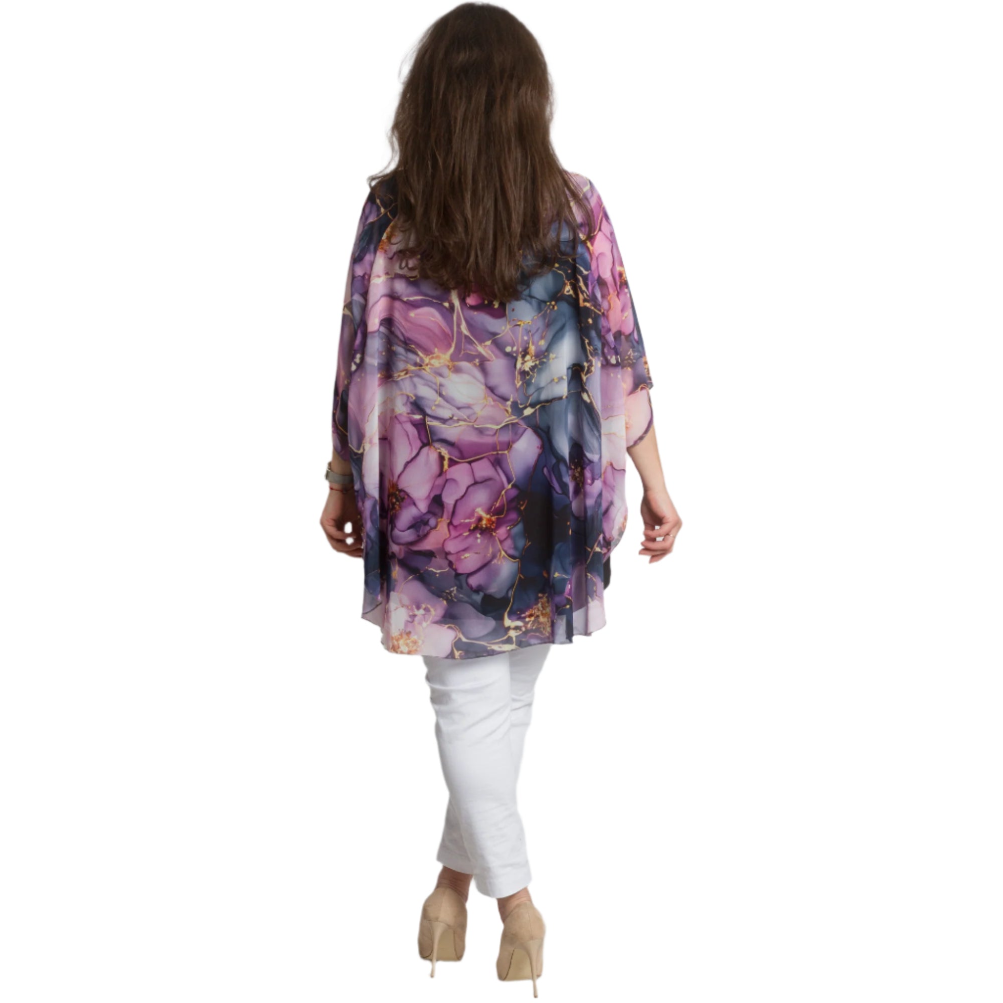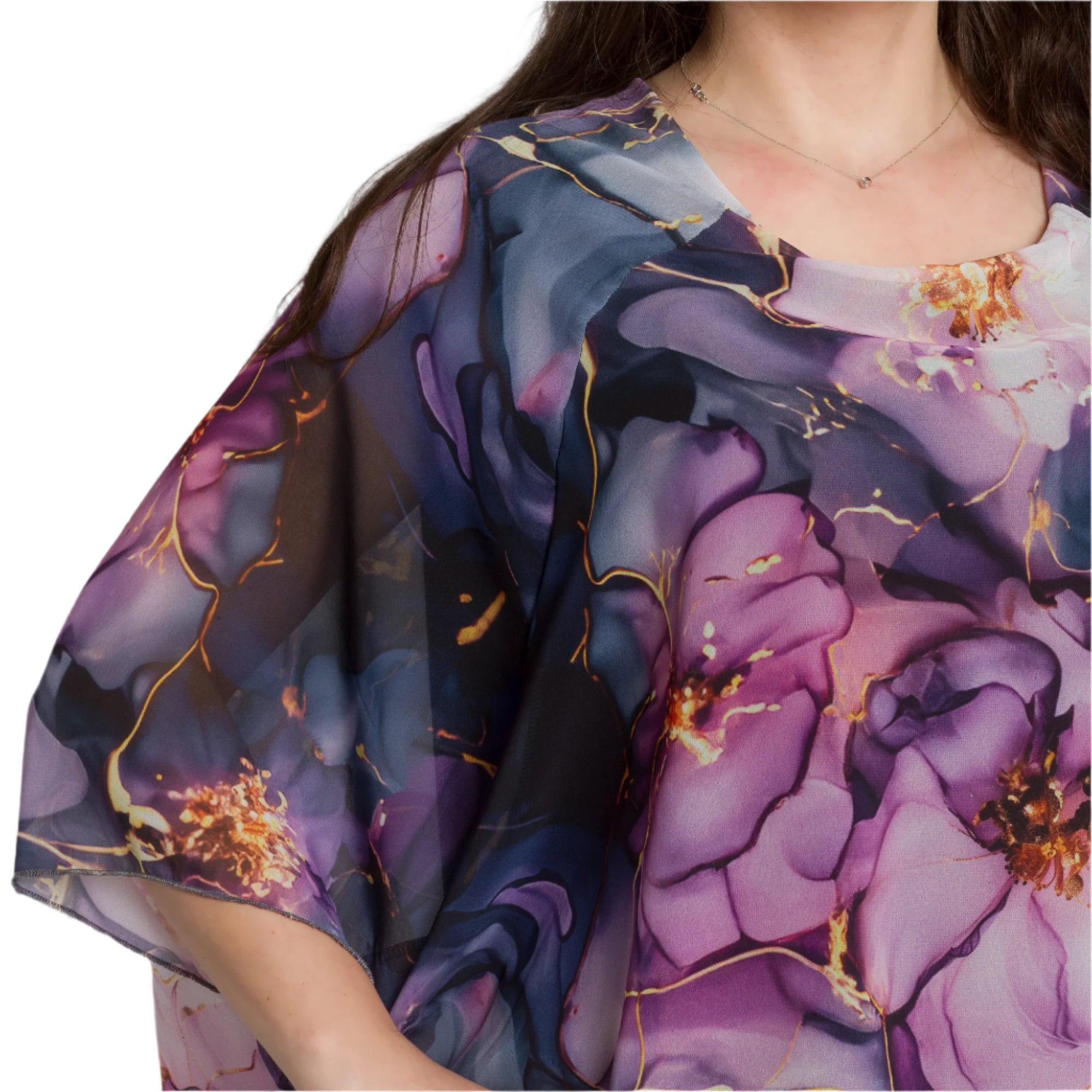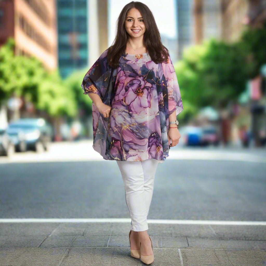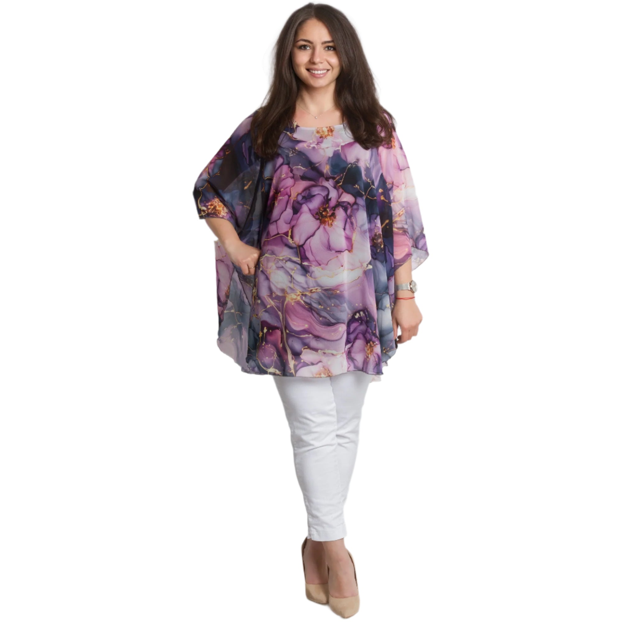 Transformă-ți look-ul cu această tunică elegantă impresionantă, din șifon în culori iridescente și un model floral romantic. Confecționată din viscoză fină cu elastan pentru confort suplimentar și libertate de mișcare. Stratul ușor de șifon adaugă aerisire și eleganță, iar croiala lejeră este potrivită pentru doamnele cu forme magnifice. Potrivită atât pentru ocazii formale, cât și pentru ieșiri elegante de primăvară-vară.