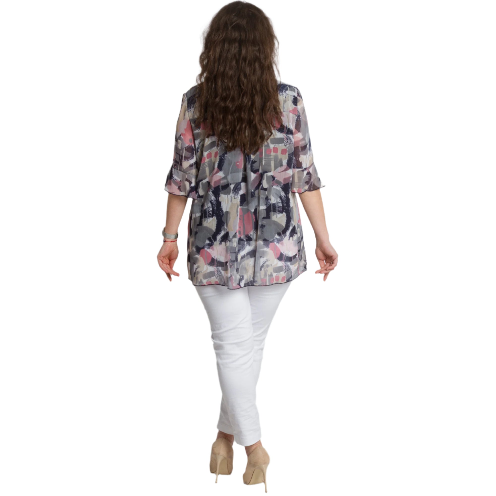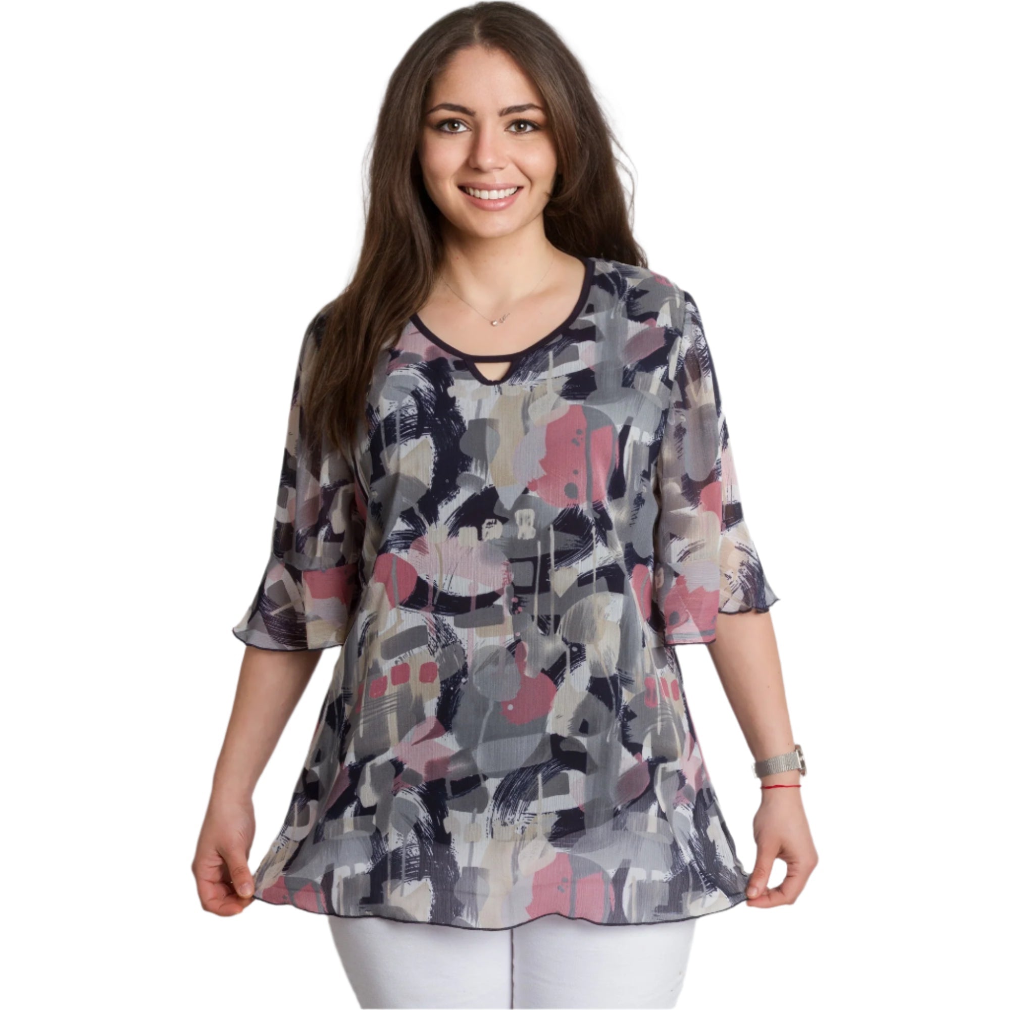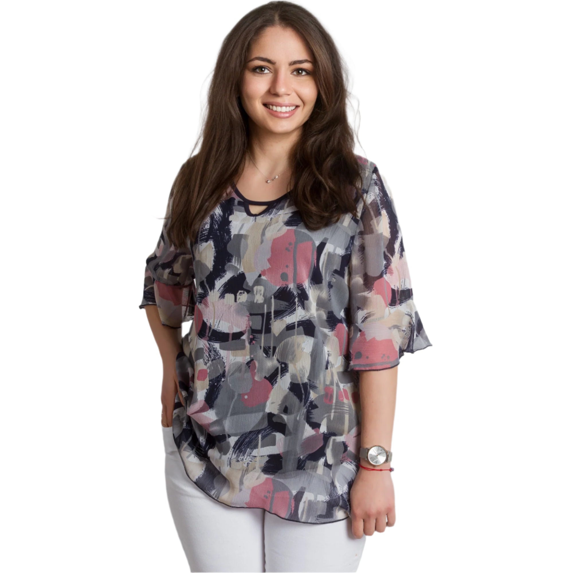 Adaugă un accent artistic garderobei tale cu această spectaculoasă tunică din șifon într-o gamă gri-violet-negru. Fabricată din poliester 100% de înaltă calitate, tunica are o croială evazată care cade liber pe corp și oferă confort maxim. Materialul moale și transparent adaugă lejeritate și feminitate, iar imprimeul abstract creează un aspect modern și dinamic. Decolteul rotund este completat de o deschizătură elegantă cu un mic accent decorativ, iar mânecile ușor evazate adaugă un plus de eleganță.