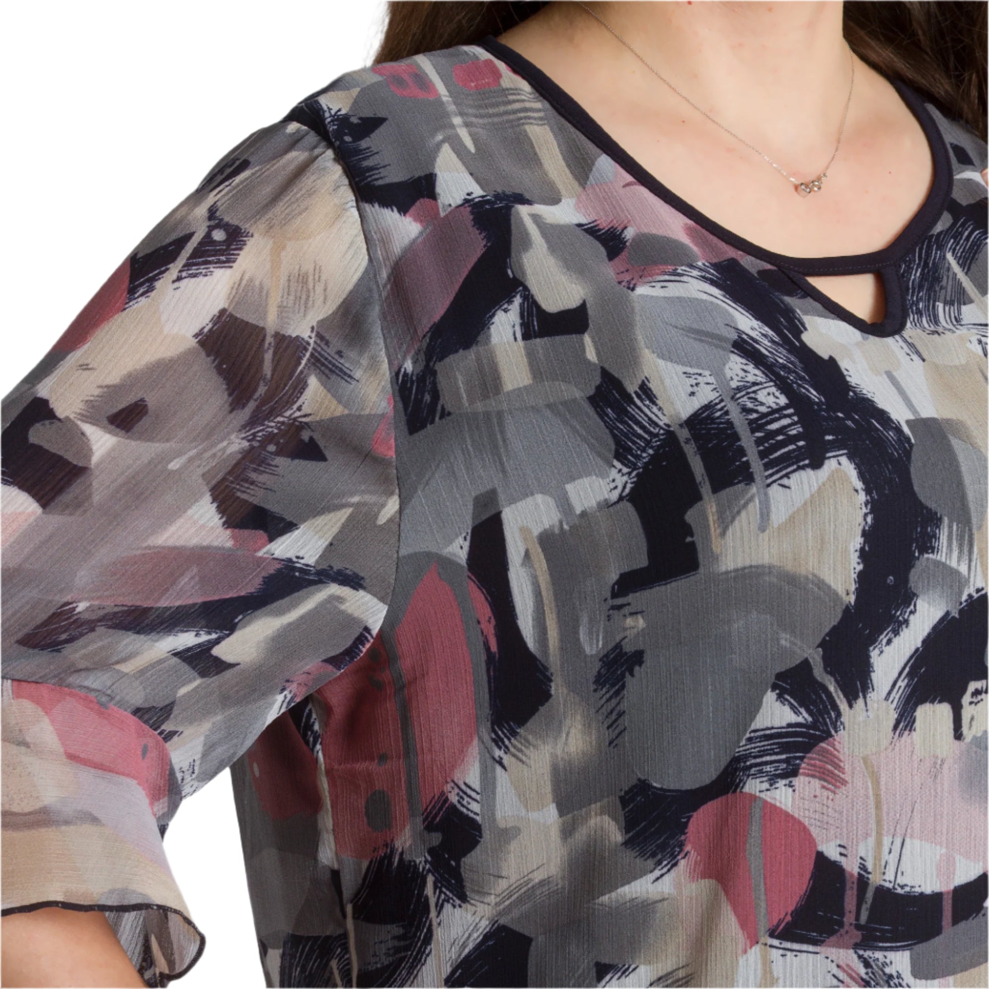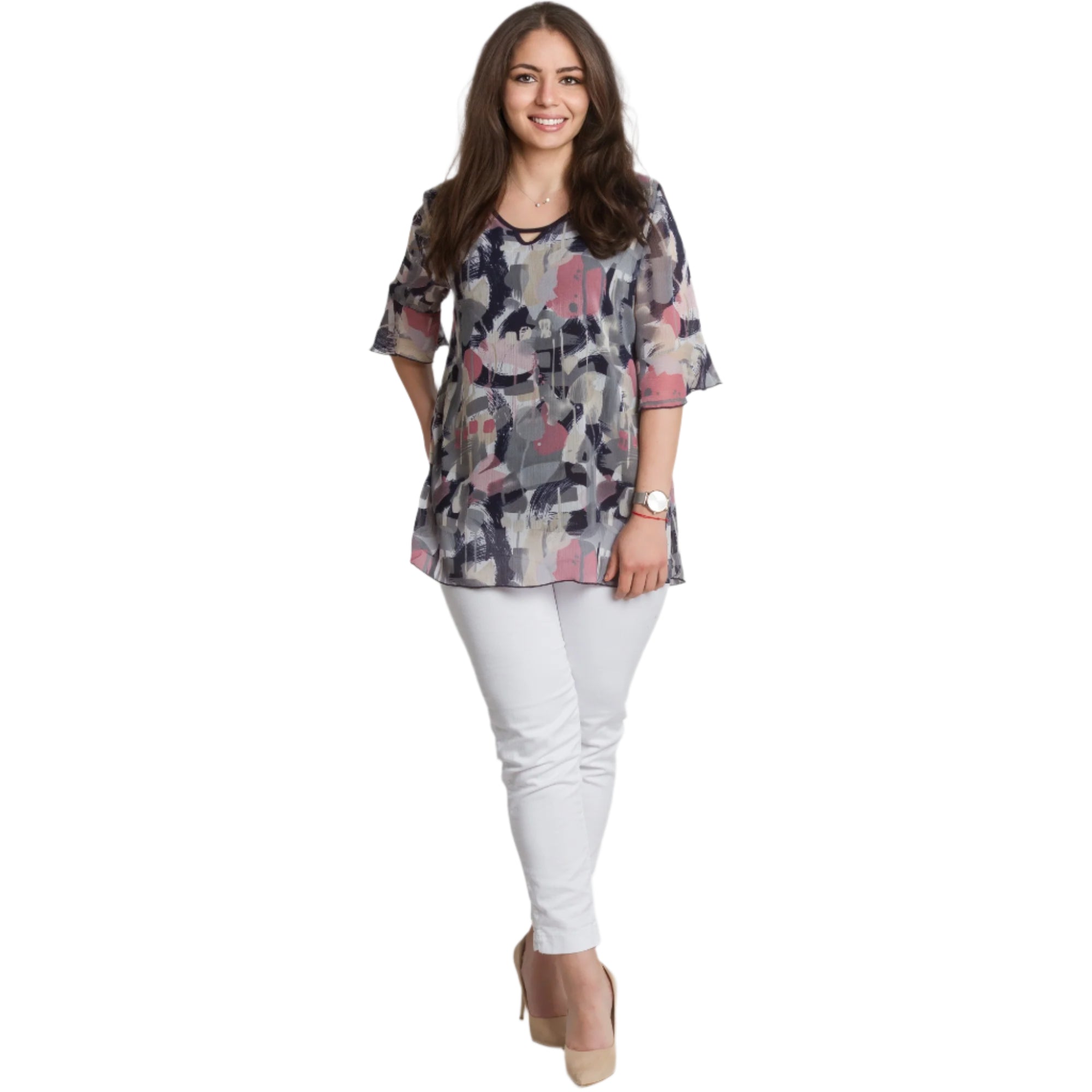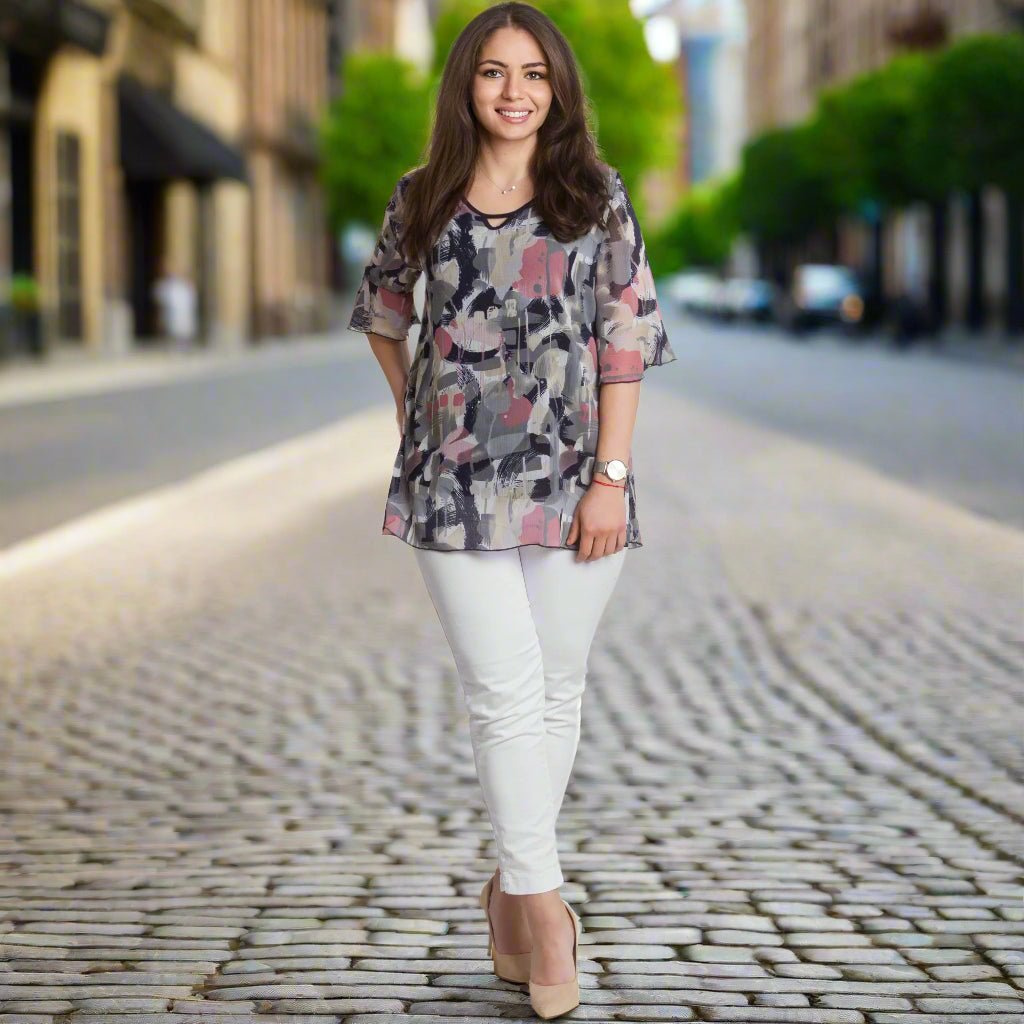 Adaugă un accent artistic garderobei tale cu această spectaculoasă tunică din șifon într-o gamă gri-violet-negru. Fabricată din poliester 100% de înaltă calitate, tunica are o croială evazată care cade liber pe corp și oferă confort maxim. Materialul moale și transparent adaugă lejeritate și feminitate, iar imprimeul abstract creează un aspect modern și dinamic. Decolteul rotund este completat de o deschizătură elegantă cu un mic accent decorativ, iar mânecile ușor evazate adaugă un plus de eleganță.
