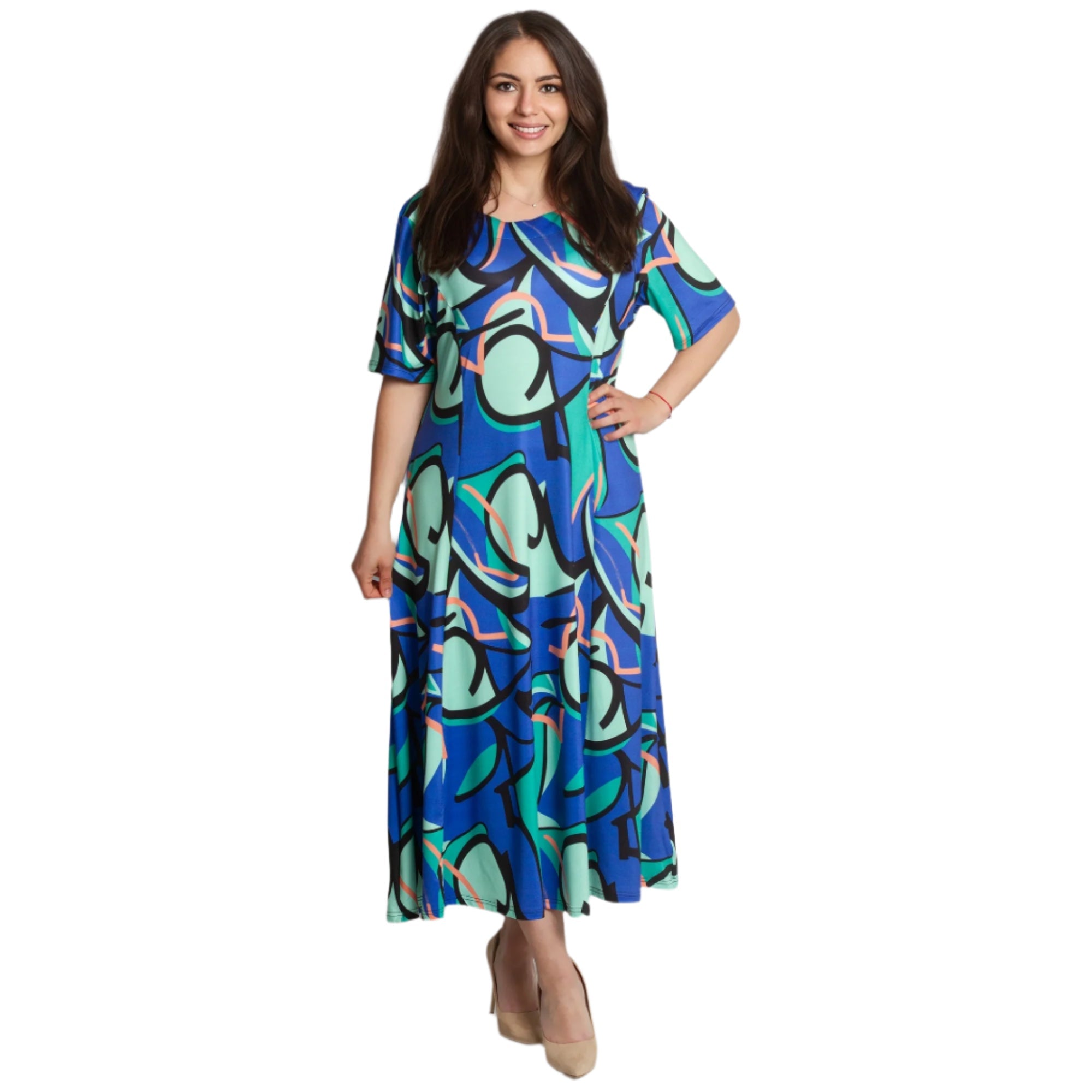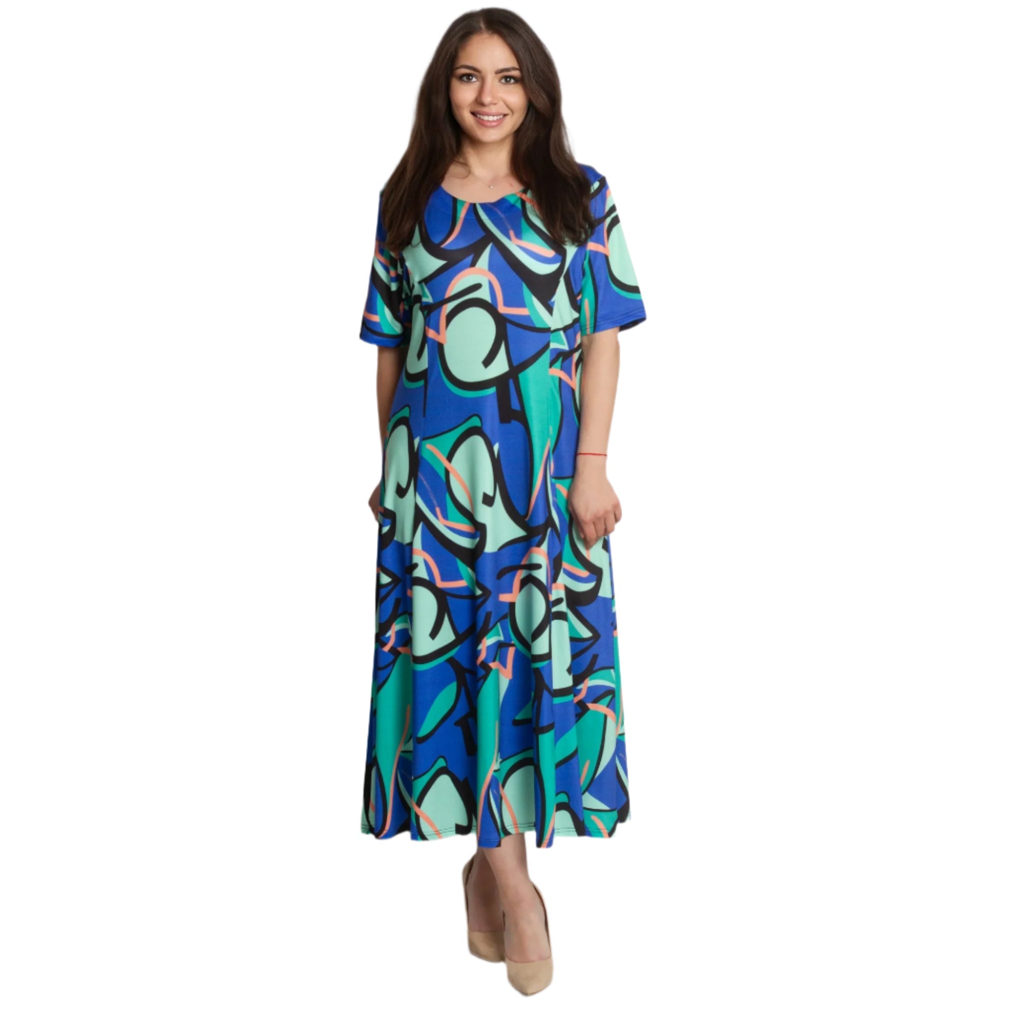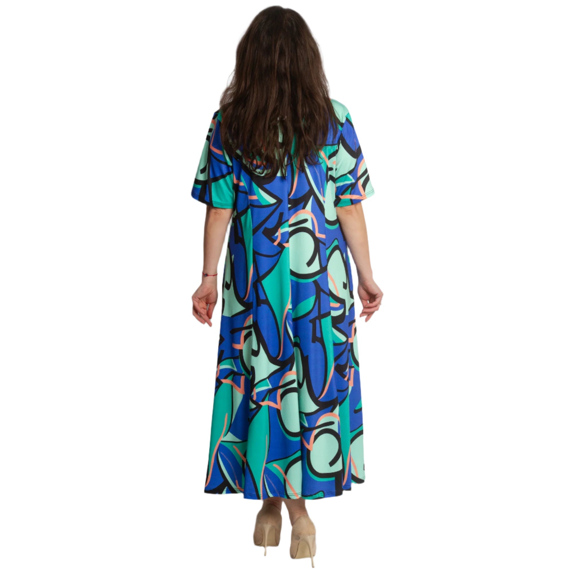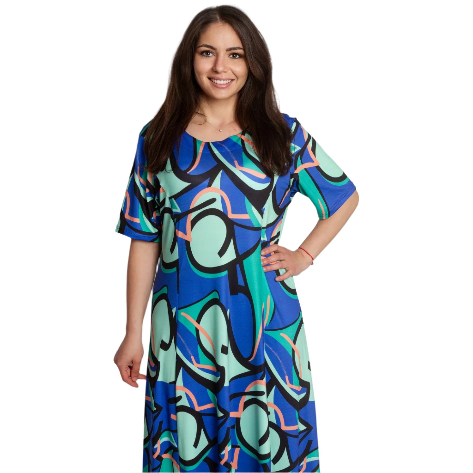 Ieși în evidență cu această rochie formală exclusivistă în mărimi mari, creată special pentru doamnele elegante care iubesc confortul. Modelul are o croială evazată elegantă, care accentuează talia și ascunde șoldurile, creând o siluetă grațioasă. Modelul abstract în tonuri de albastru, verde și pastel conferă un aspect proaspăt și un accent artistic. Confecționată din țesătură de poliester de înaltă calitate, cu elasticitate adăugată, rochia este atât confortabilă, cât și ușoară.