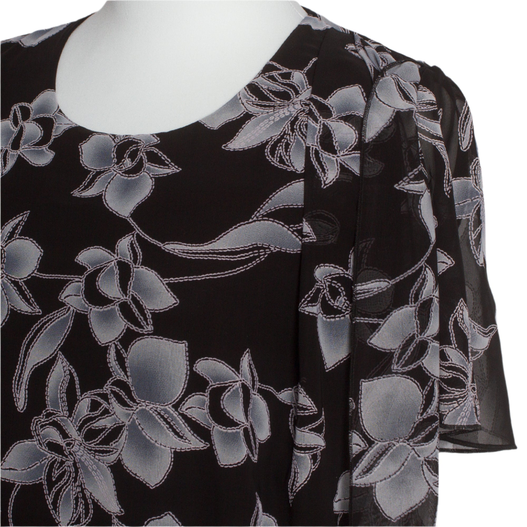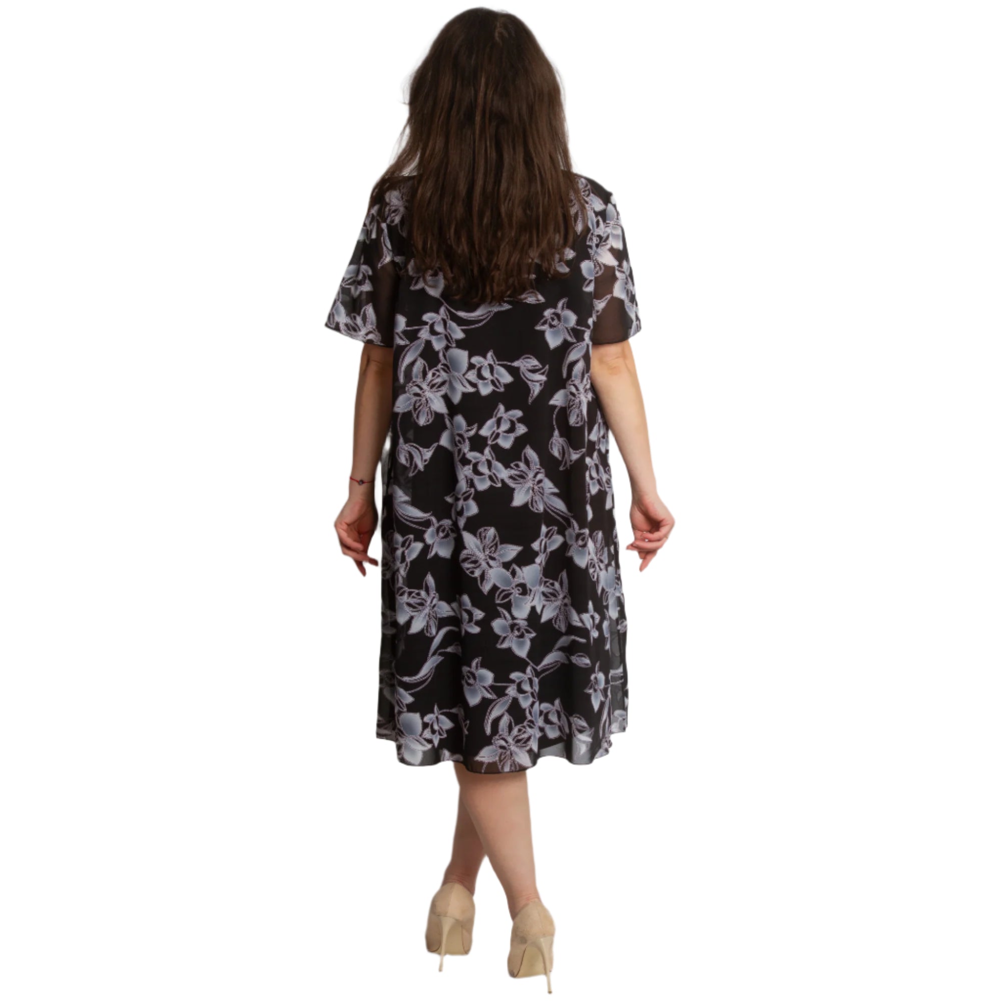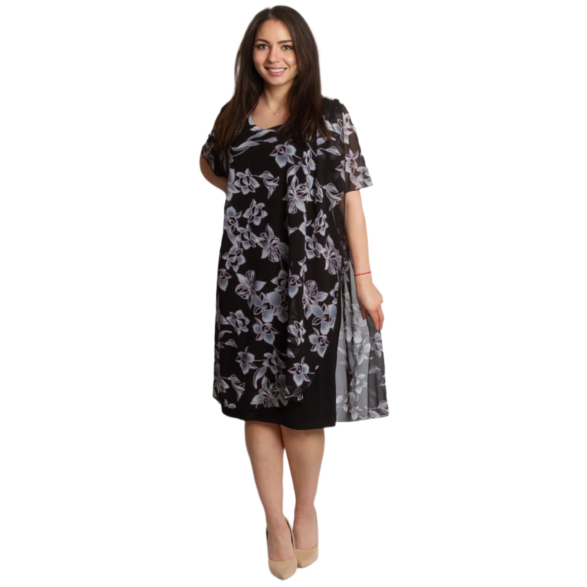 Cufundă-te în tandrețe și eleganță cu această rochie neagră sofisticată, cu șifon floral lejer. Confecționată cu atenție la fiecare curbă a corpului, modelul are o croială dreaptă, căptușeală moale și un decolteu rotund superb. Materialul translucid ușor adaugă feminitate și stil, iar lungimea confortabilă și linia lejeră o fac ideală pentru ocazii speciale.