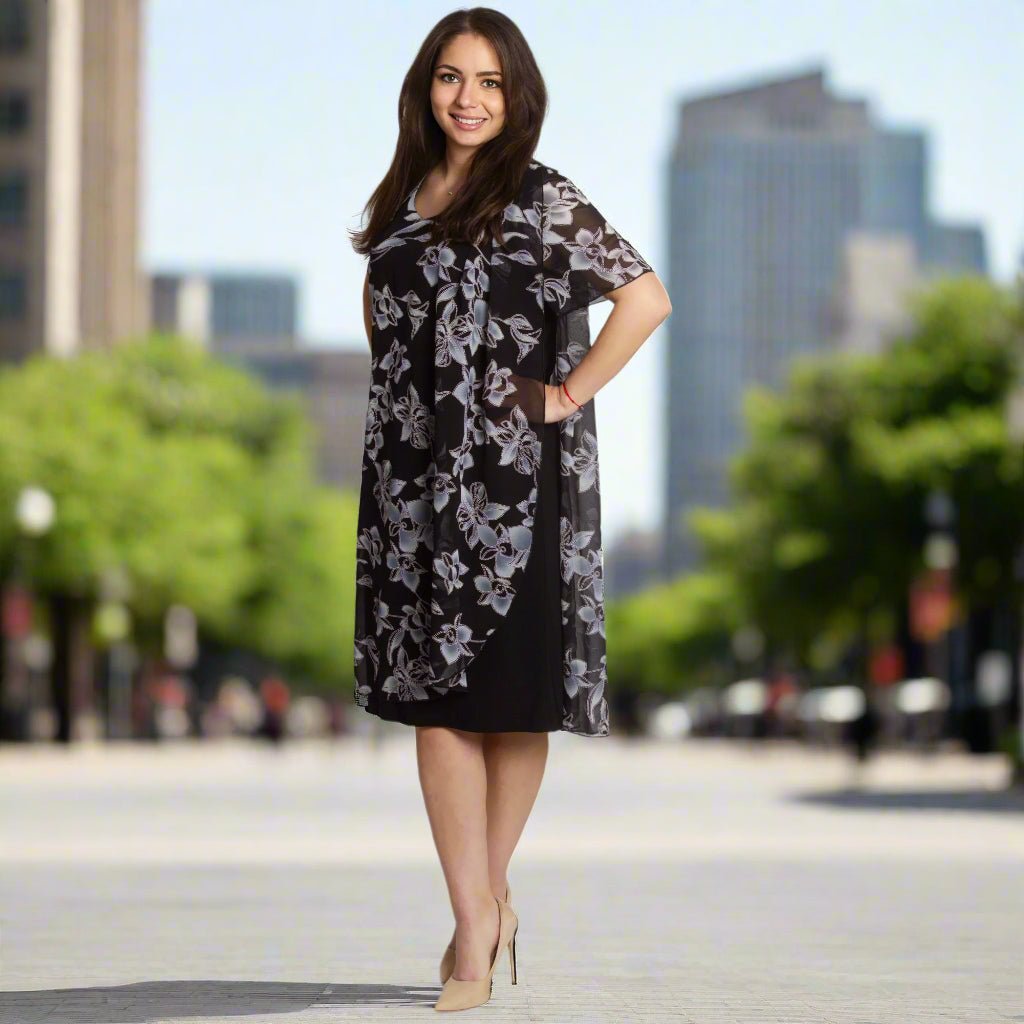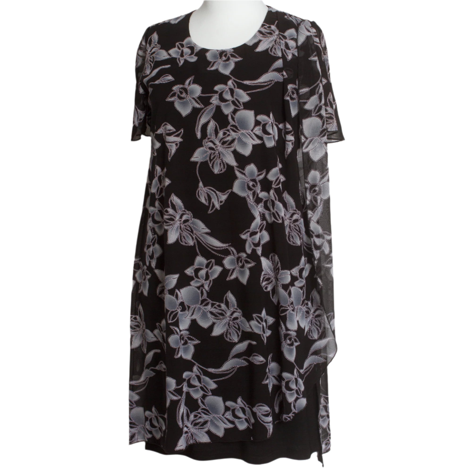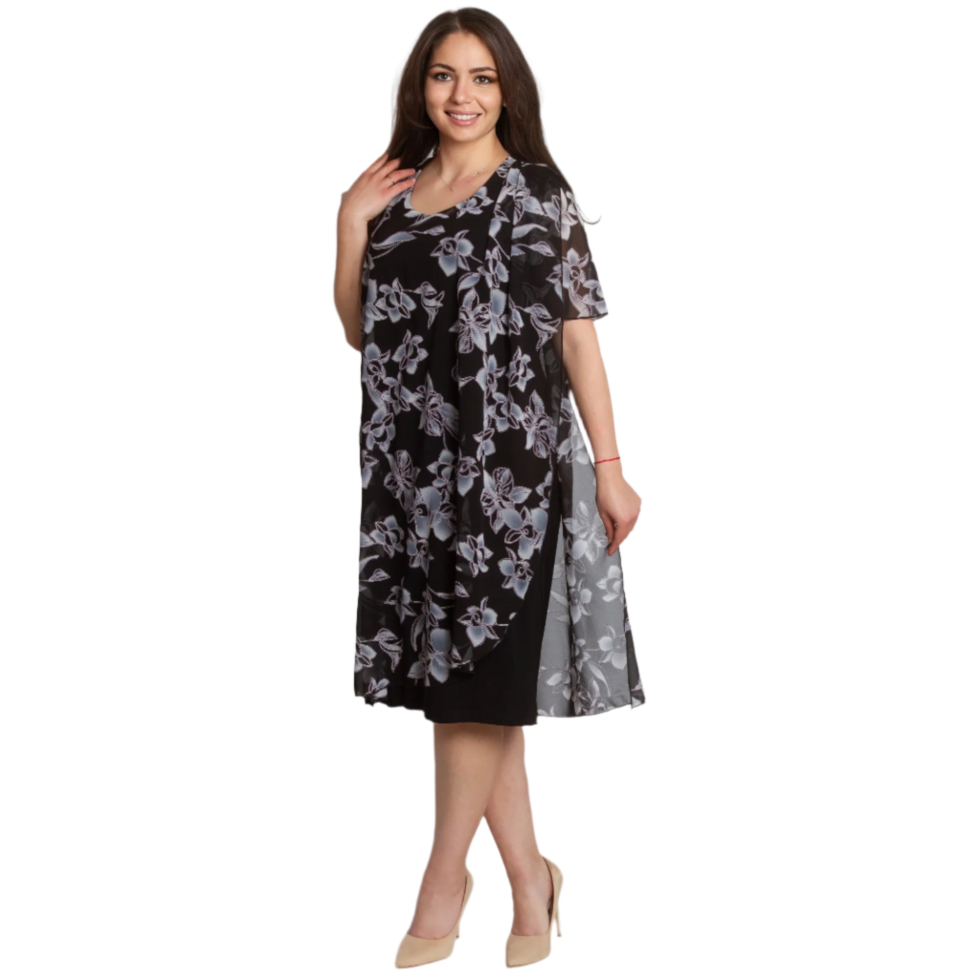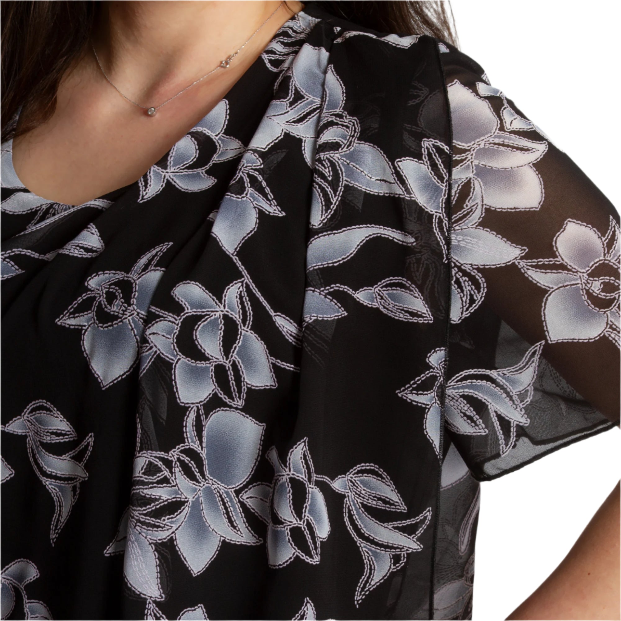 Cufundă-te în tandrețe și eleganță cu această rochie neagră sofisticată, cu șifon floral lejer. Confecționată cu atenție la fiecare curbă a corpului, modelul are o croială dreaptă, căptușeală moale și un decolteu rotund superb. Materialul translucid ușor adaugă feminitate și stil, iar lungimea confortabilă și linia lejeră o fac ideală pentru ocazii speciale.