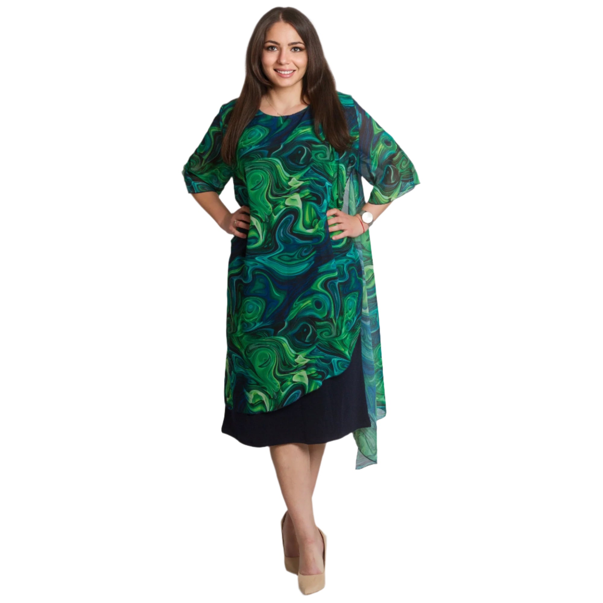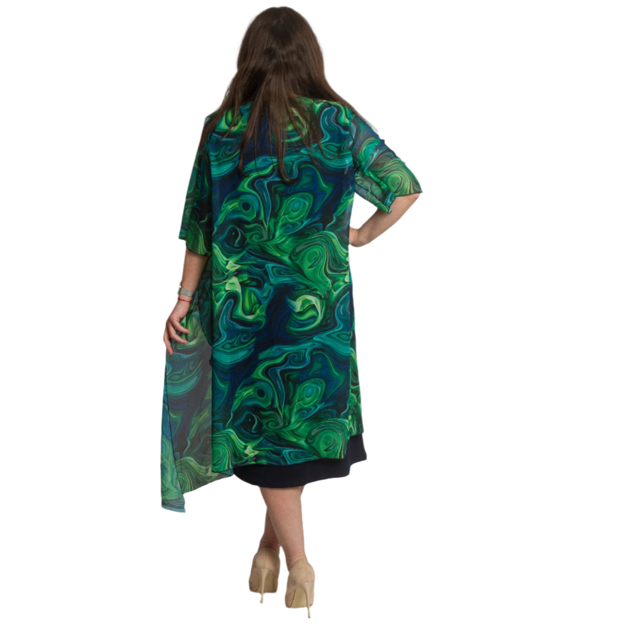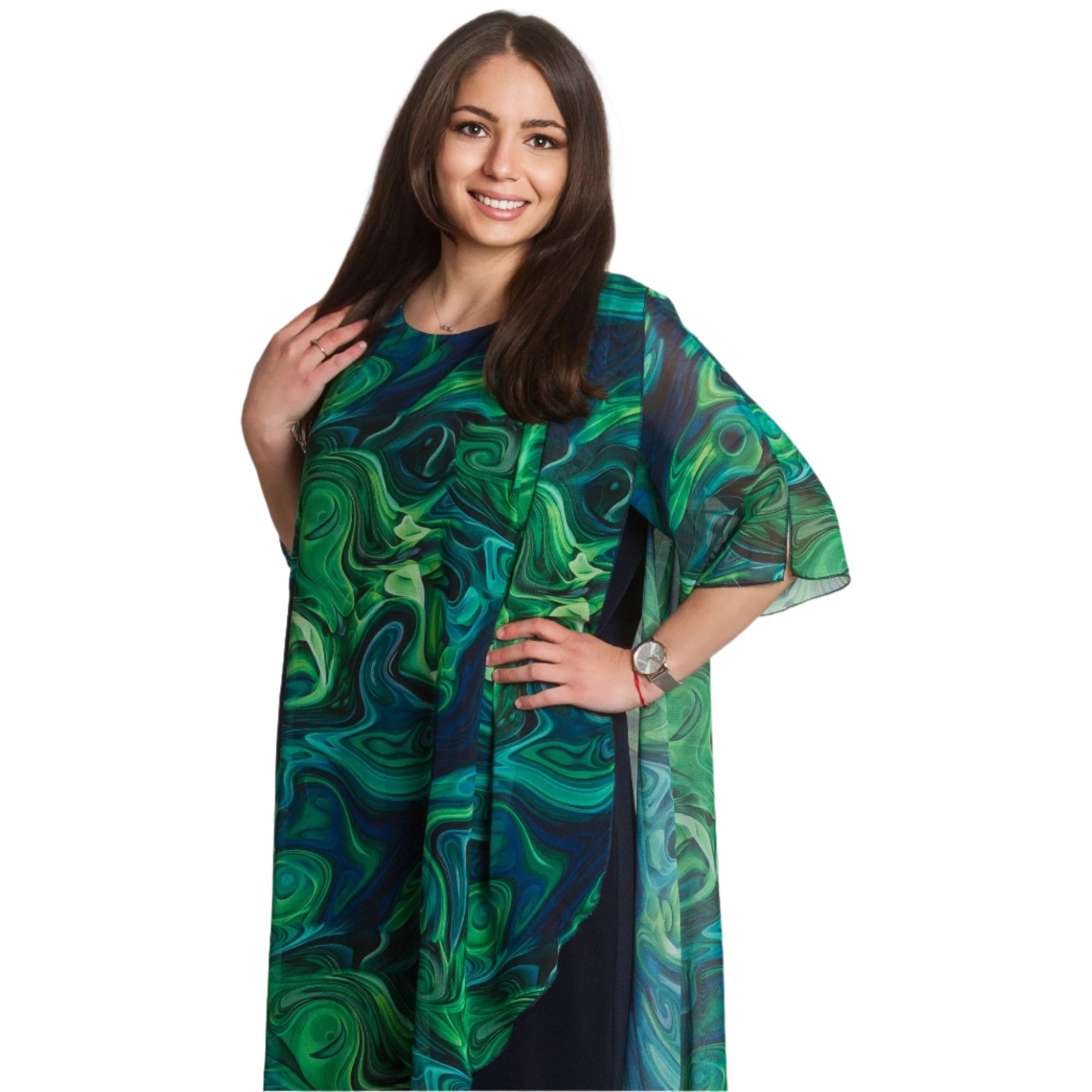 Etalează-ți stilul și eleganța cu această rochie formală exclusivistă plus size, care combină o bază neagră cu un strat asimetric de șifon, într-un imprimeu spectaculos din marmură cu nuanțe de verde și albastru. Croiul drept lejer, cu lungimea până la genunchi și mâneci 3/4, asigură confort și libertate de mișcare, în timp ce șifonul vaporos adaugă grație și eleganță siluetei. Ideală pentru ocazii speciale, seri formale și sărbători.