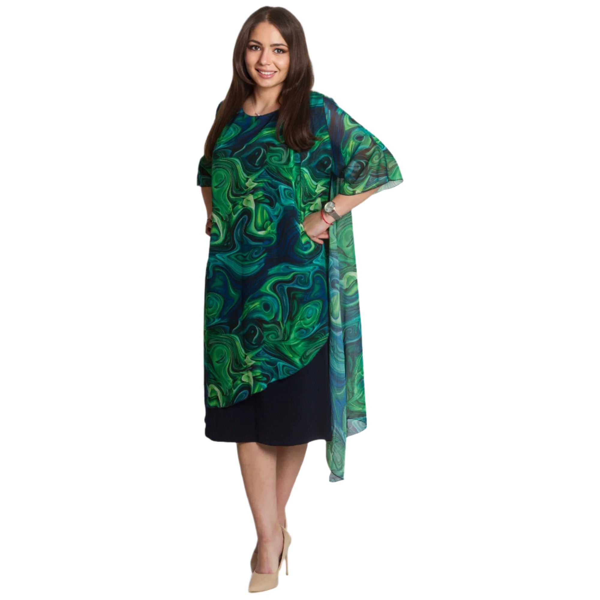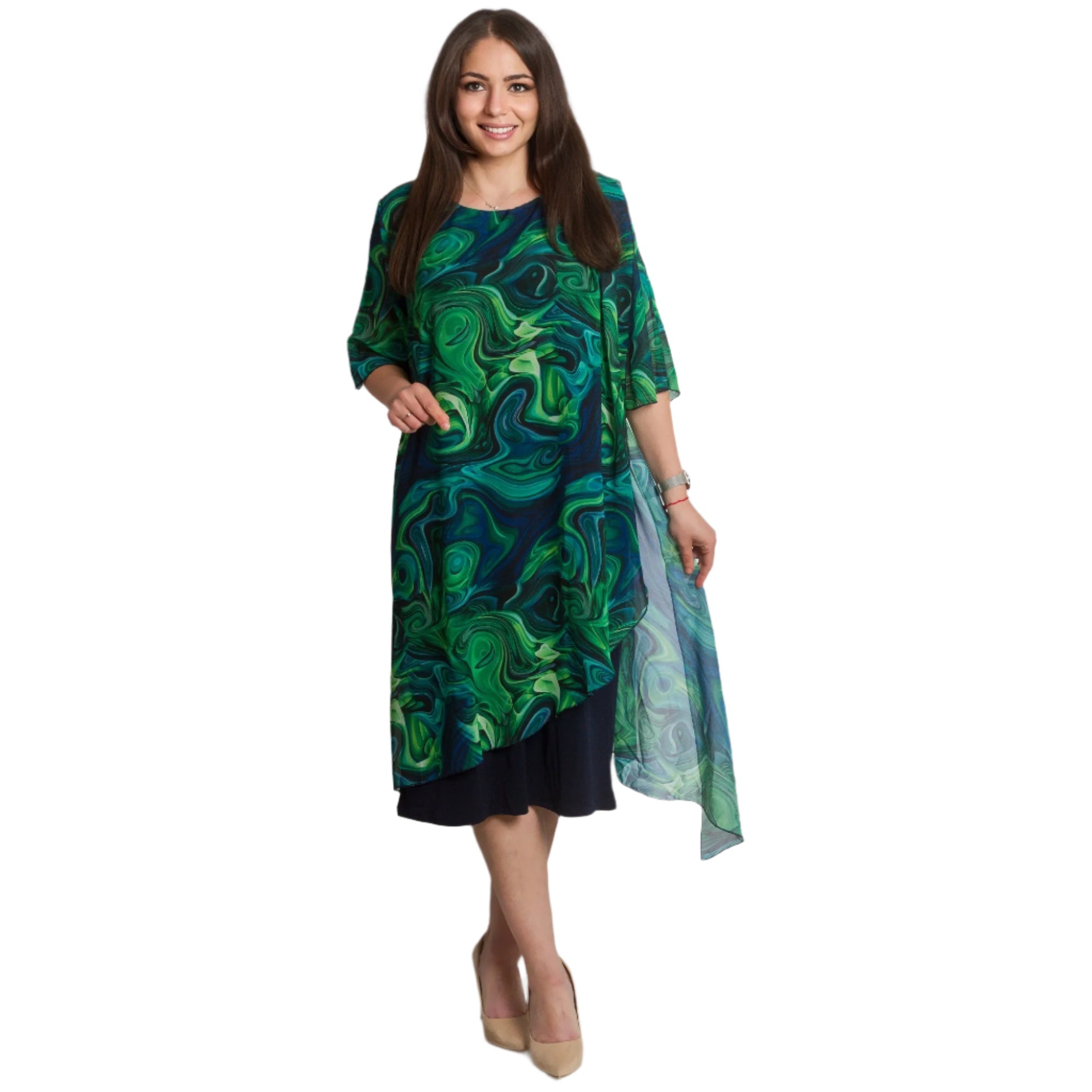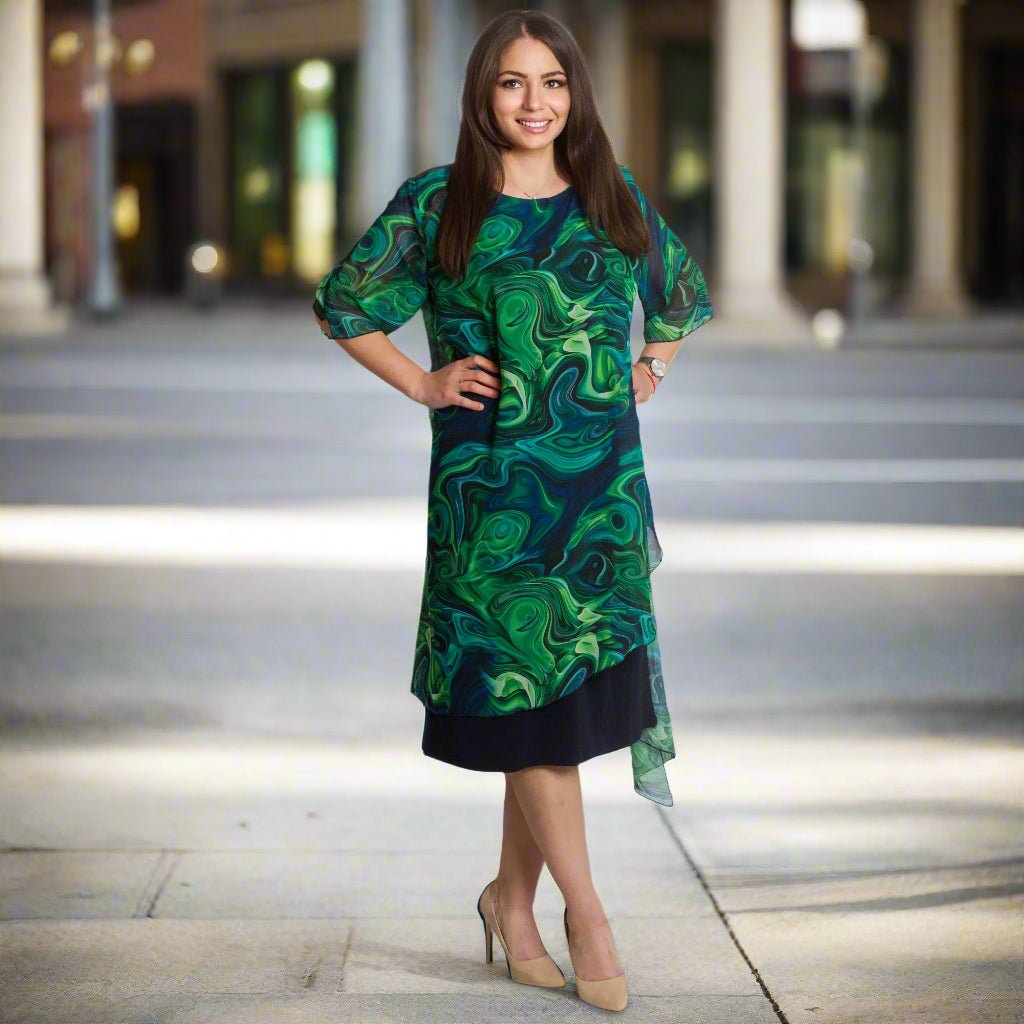 Etalează-ți stilul și eleganța cu această rochie formală exclusivistă plus size, care combină o bază neagră cu un strat asimetric de șifon, într-un imprimeu spectaculos din marmură cu nuanțe de verde și albastru. Croiul drept lejer, cu lungimea până la genunchi și mâneci 3/4, asigură confort și libertate de mișcare, în timp ce șifonul vaporos adaugă grație și eleganță siluetei. Ideală pentru ocazii speciale, seri formale și sărbători.