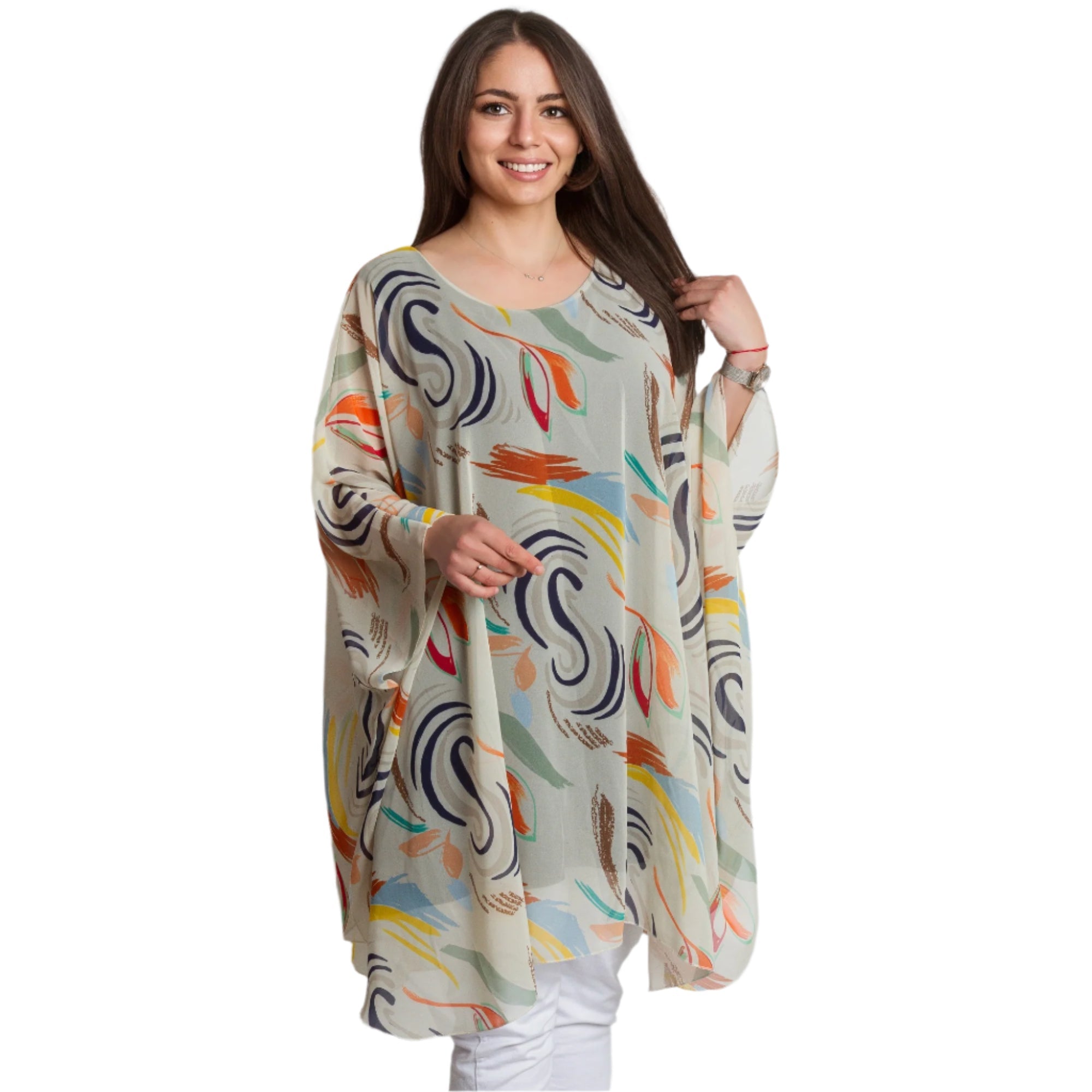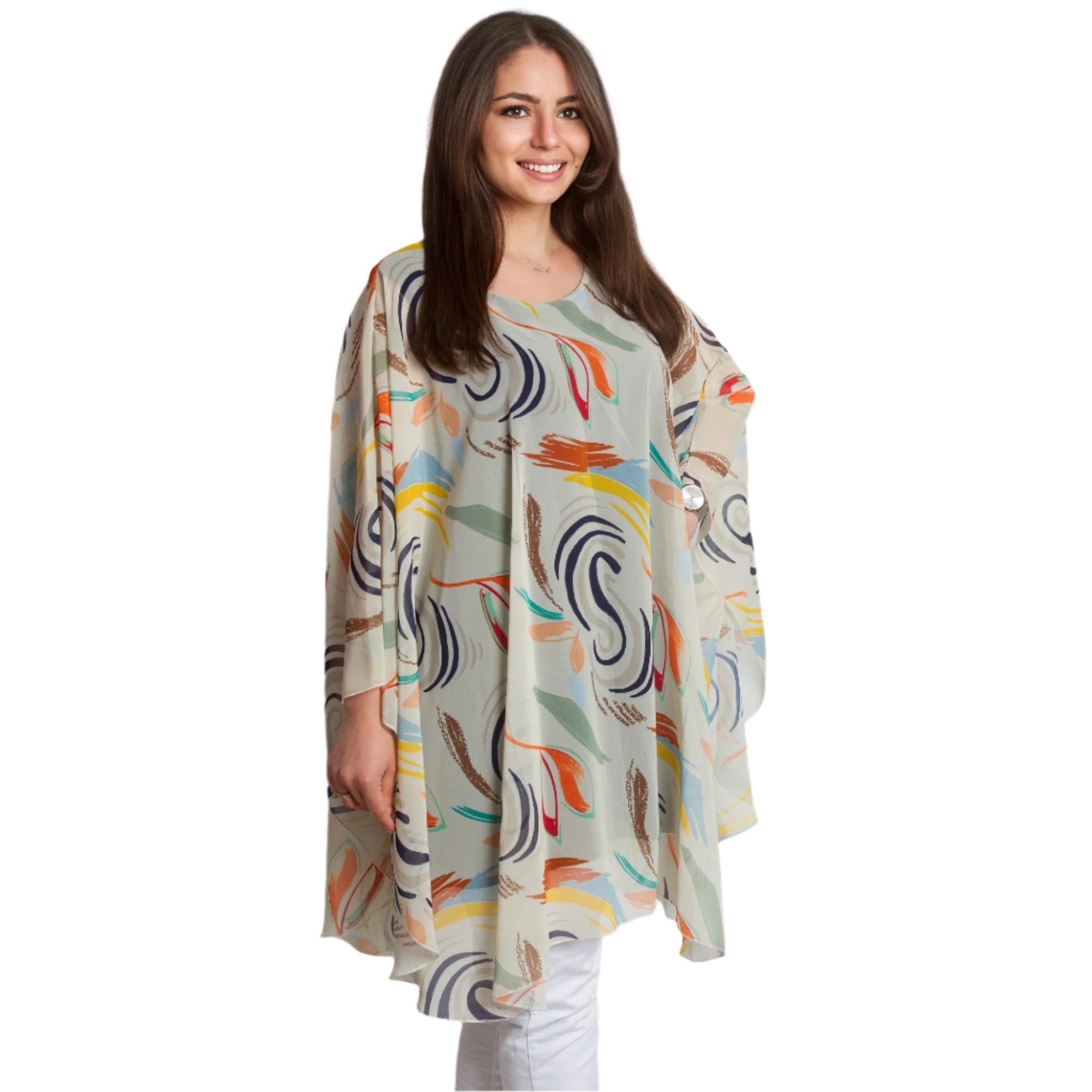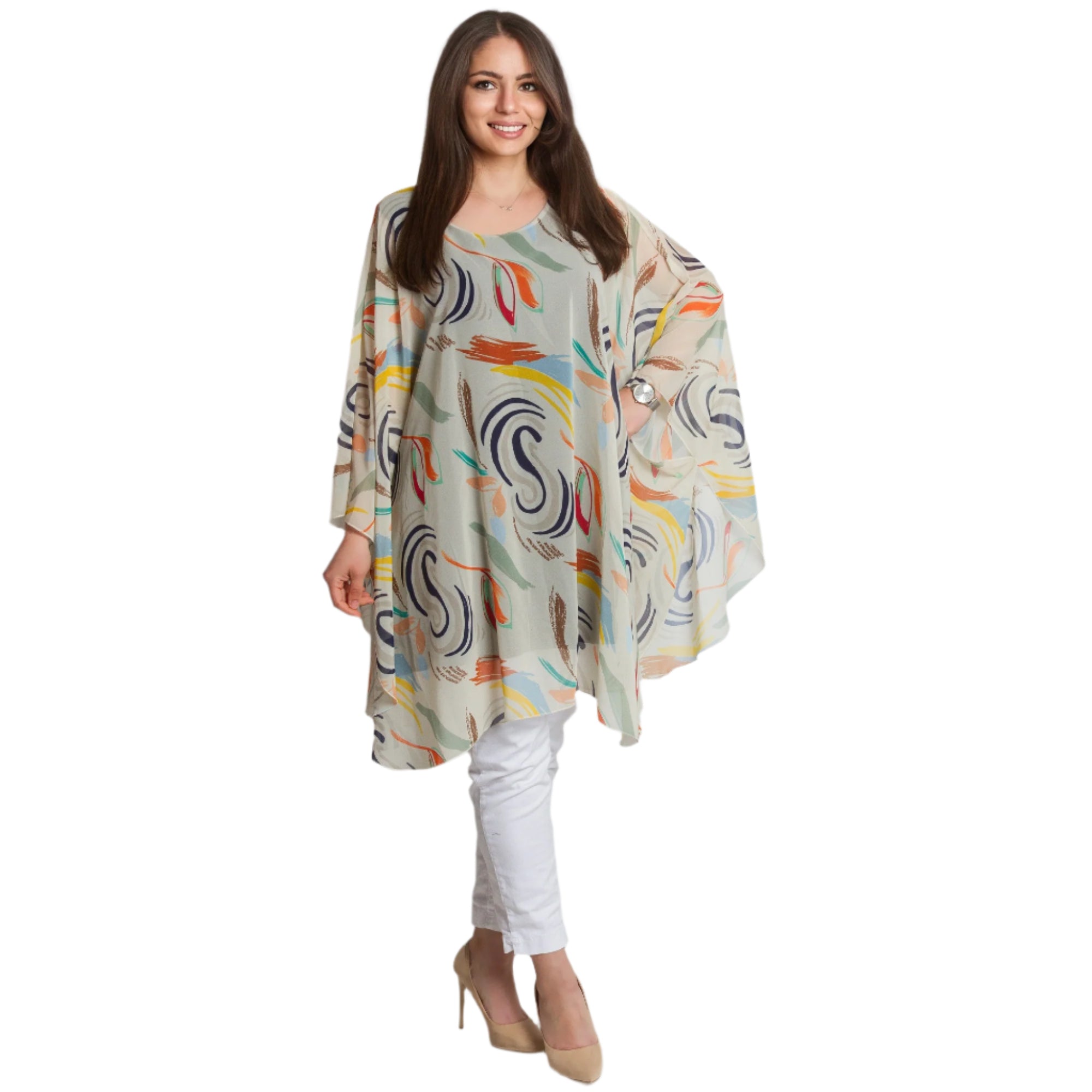 Adaugă stil și eleganță ținutei tale cu această tunică formală, confecționată din șifon vaporos într-un model abstract. Modelul are o căptușeală încorporată din viscoză, care oferă confort și opacitate, iar croiul evazat cade frumos pe corp și creează o senzație de lejeritate. Tunica este o alegere perfectă pentru ocazii formale, sărbători și evenimente speciale. Decolteul este rotund, iar mânecile sunt lejere și acoperitoare, pentru un plus de eleganță.