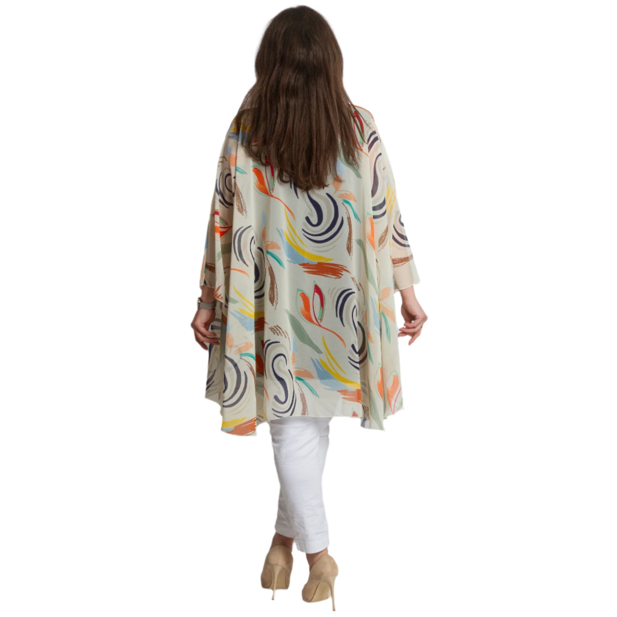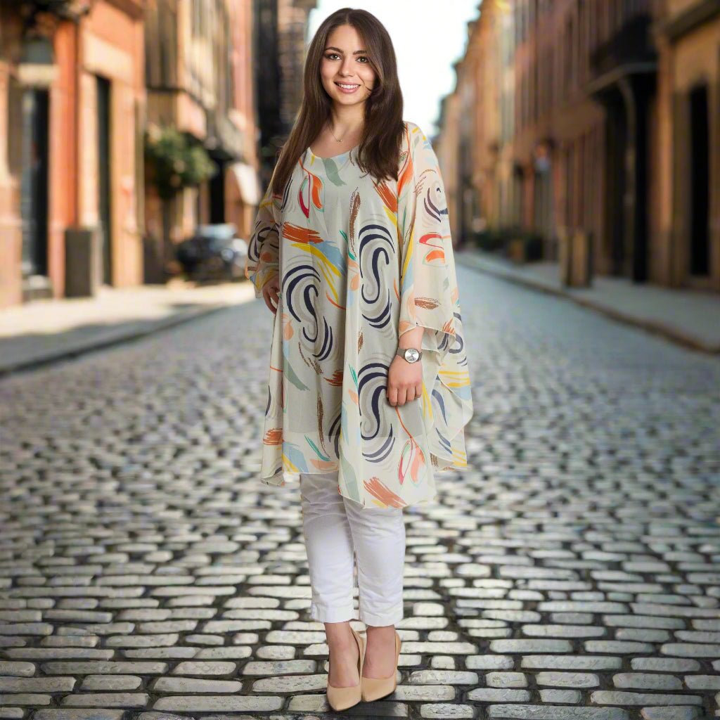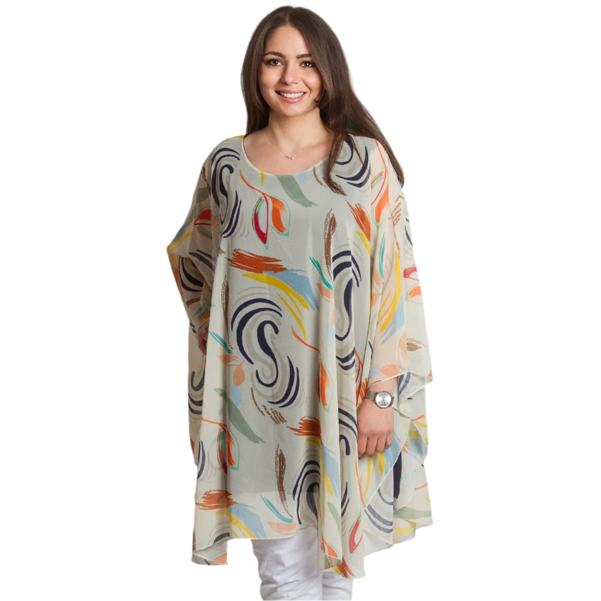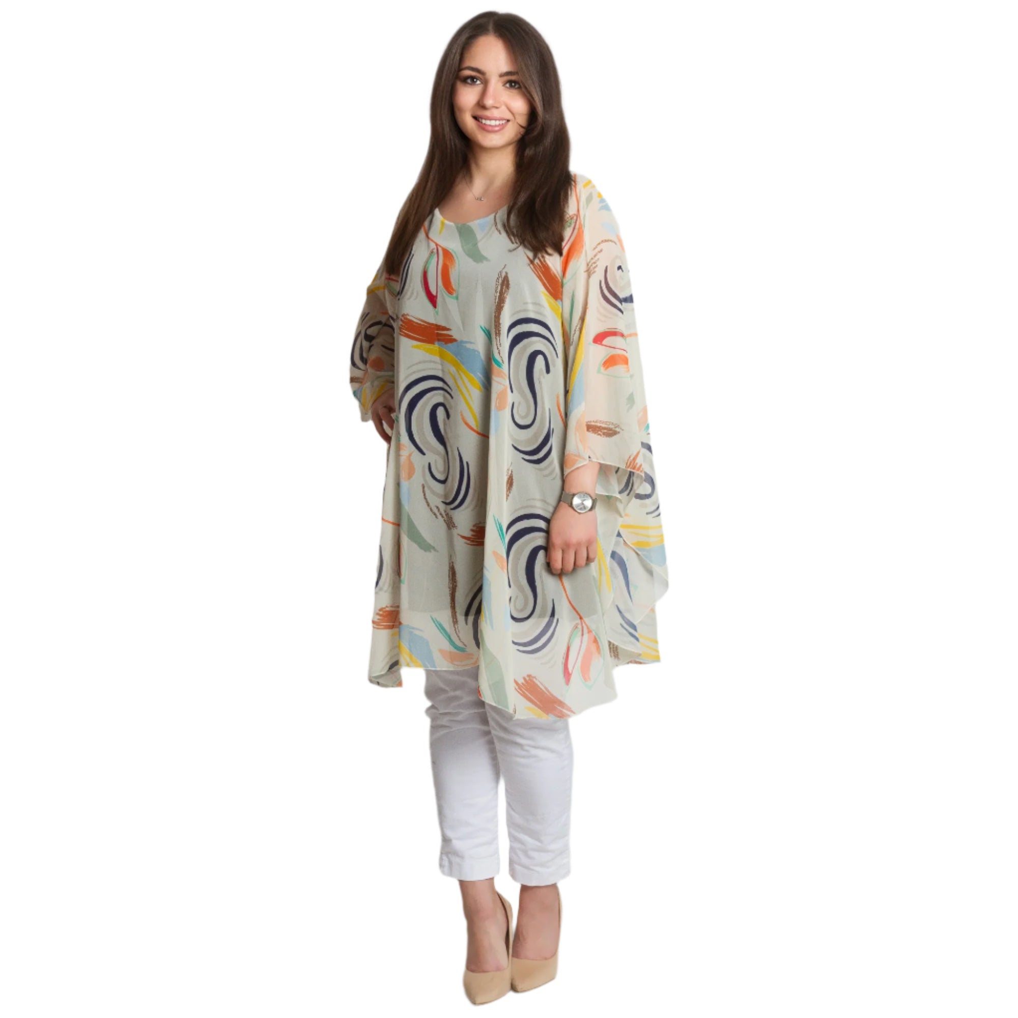Adaugă stil și eleganță ținutei tale cu această tunică formală, confecționată din șifon vaporos într-un model abstract. Modelul are o căptușeală încorporată din viscoză, care oferă confort și opacitate, iar croiul evazat cade frumos pe corp și creează o senzație de lejeritate. Tunica este o alegere perfectă pentru ocazii formale, sărbători și evenimente speciale. Decolteul este rotund, iar mânecile sunt lejere și acoperitoare, pentru un plus de eleganță.