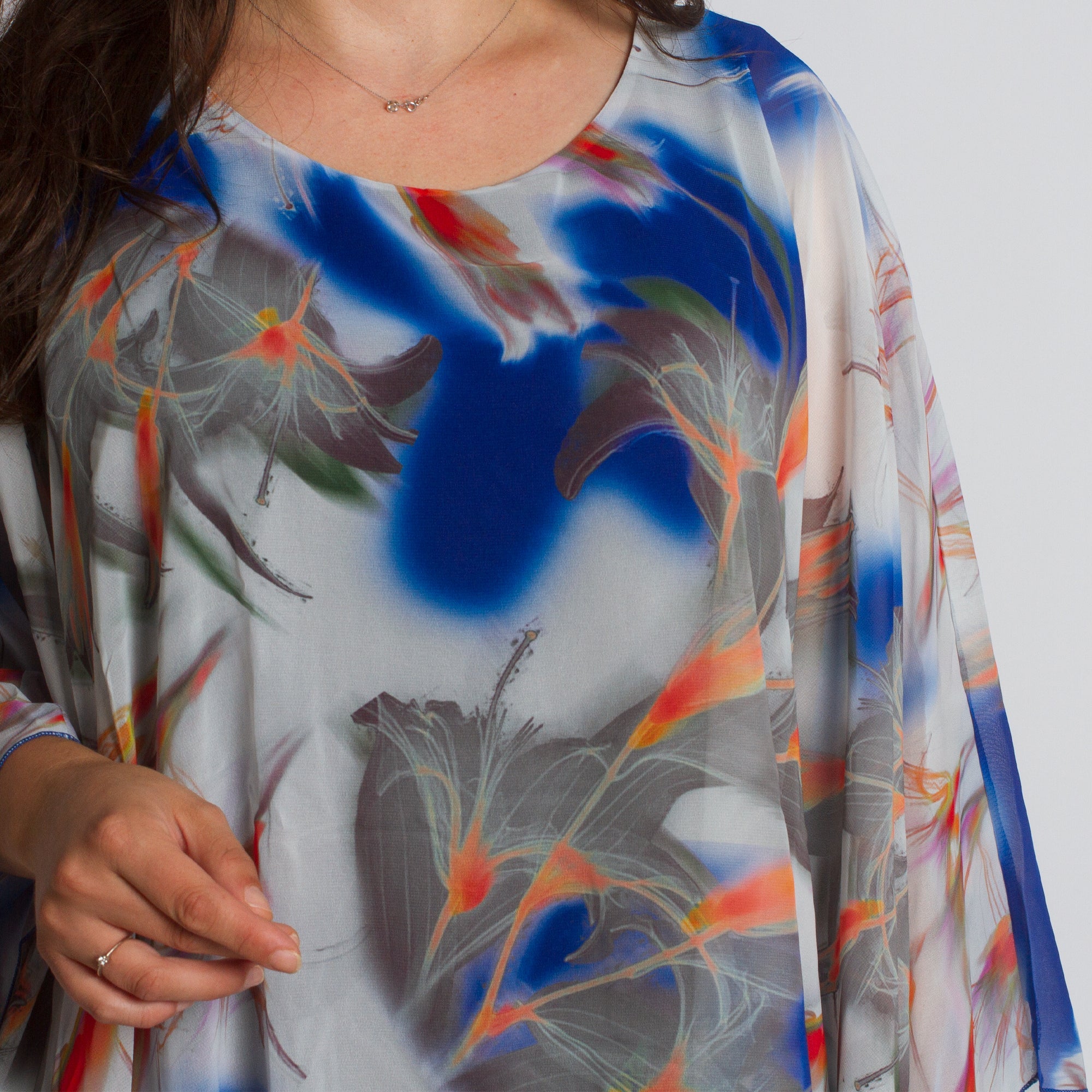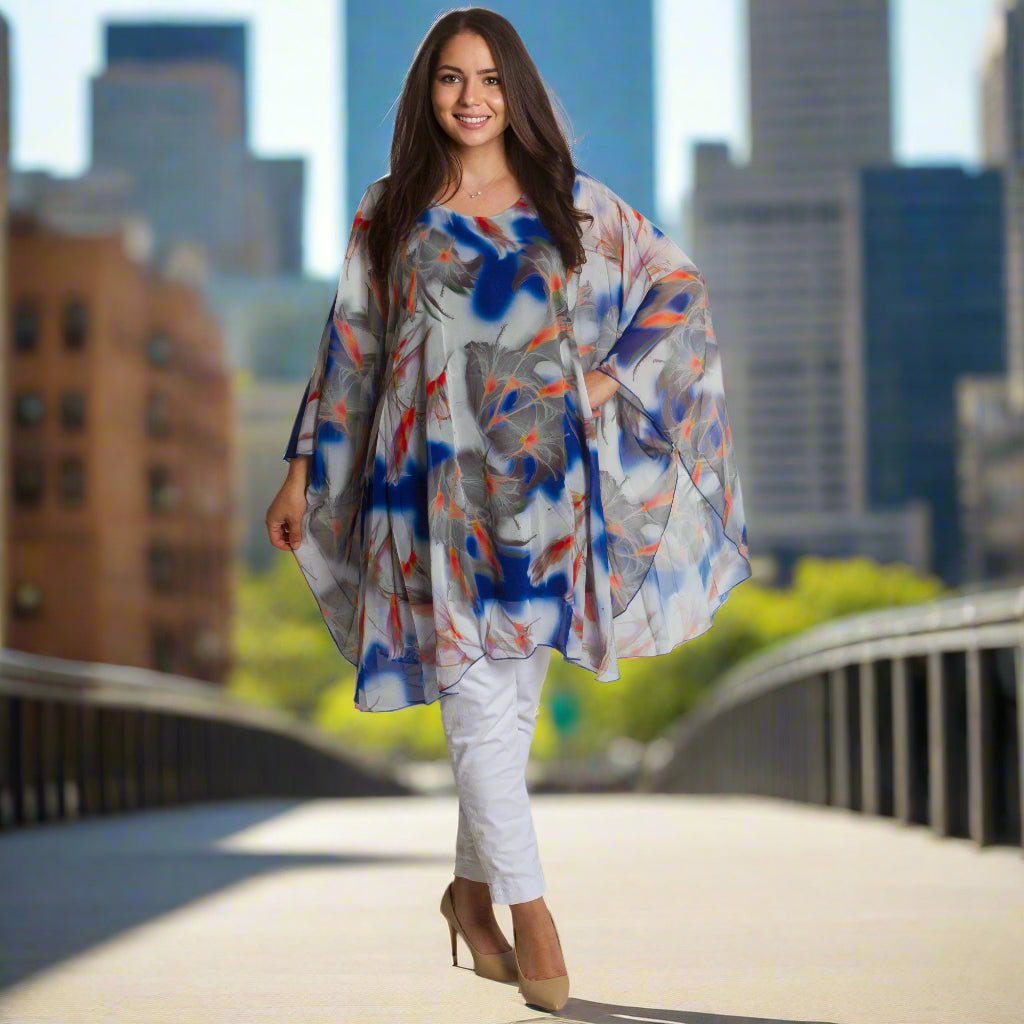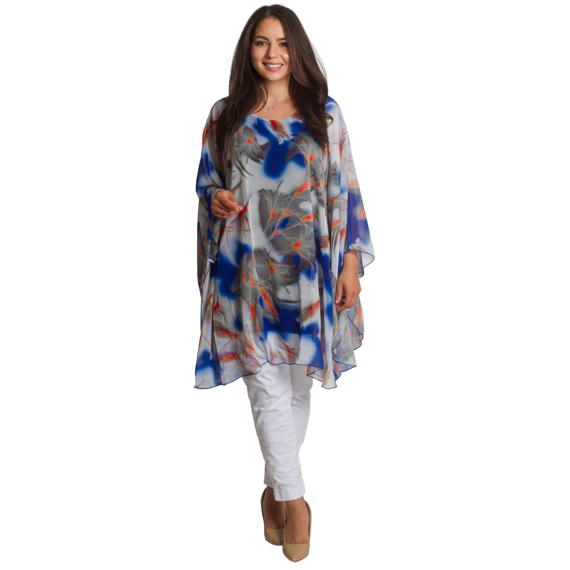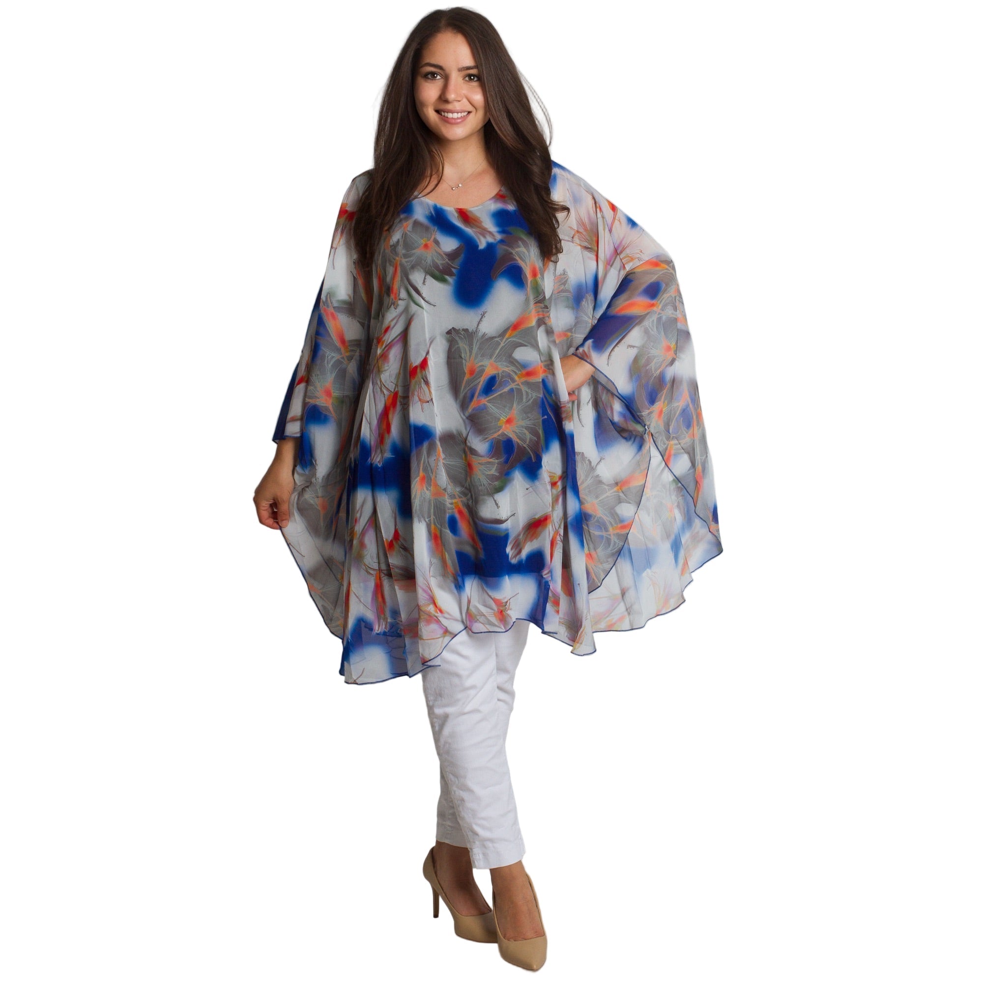 Răsfață-te cu confort și stil cu această tunică elegantă plus-size, confecționată din șifon vaporos, într-un model abstract albastru-gri cu note florale. Căptușeala din viscoză oferă confort și opacitate, iar croiul evazat și lejer ascunde ușor șoldurile și abdomenul. Modelul este o alegere ideală pentru ocazii formale, sărbători și seri festive.