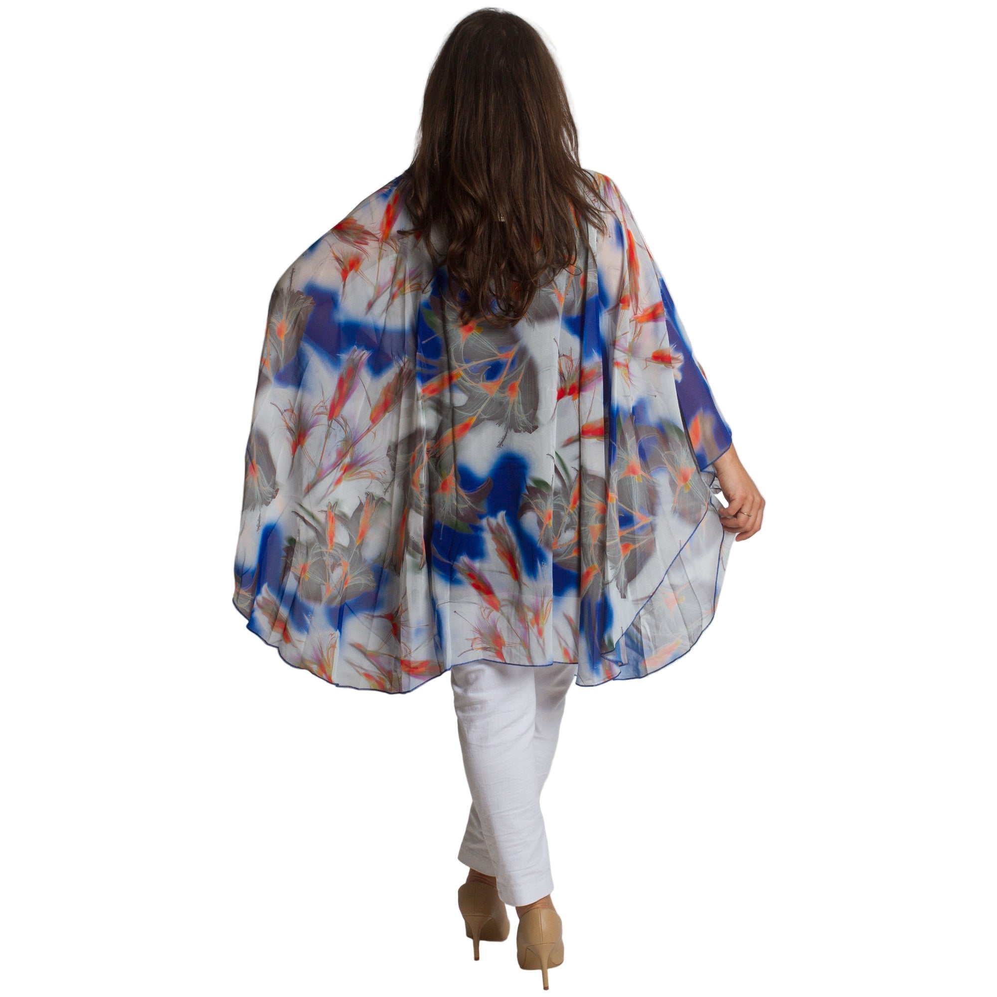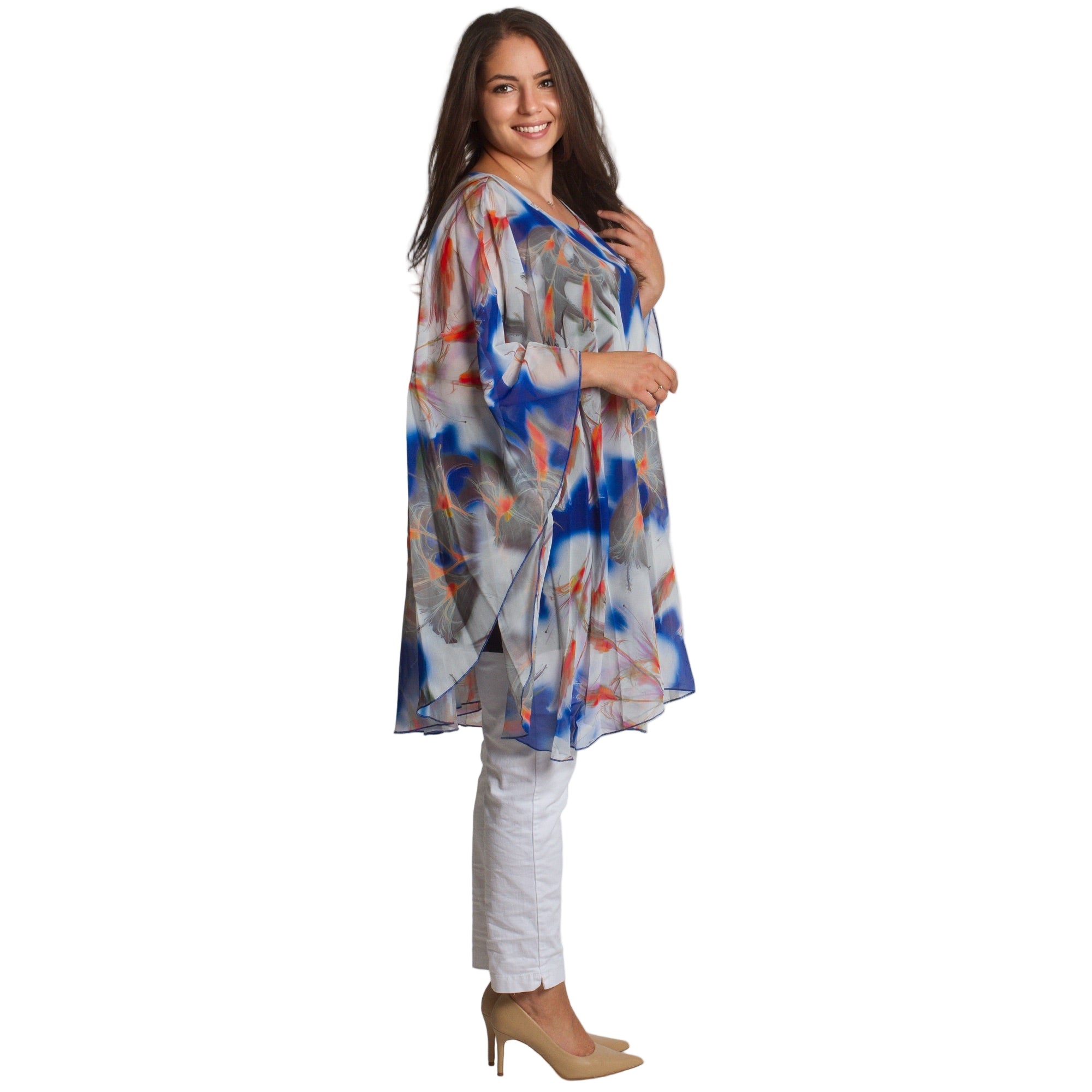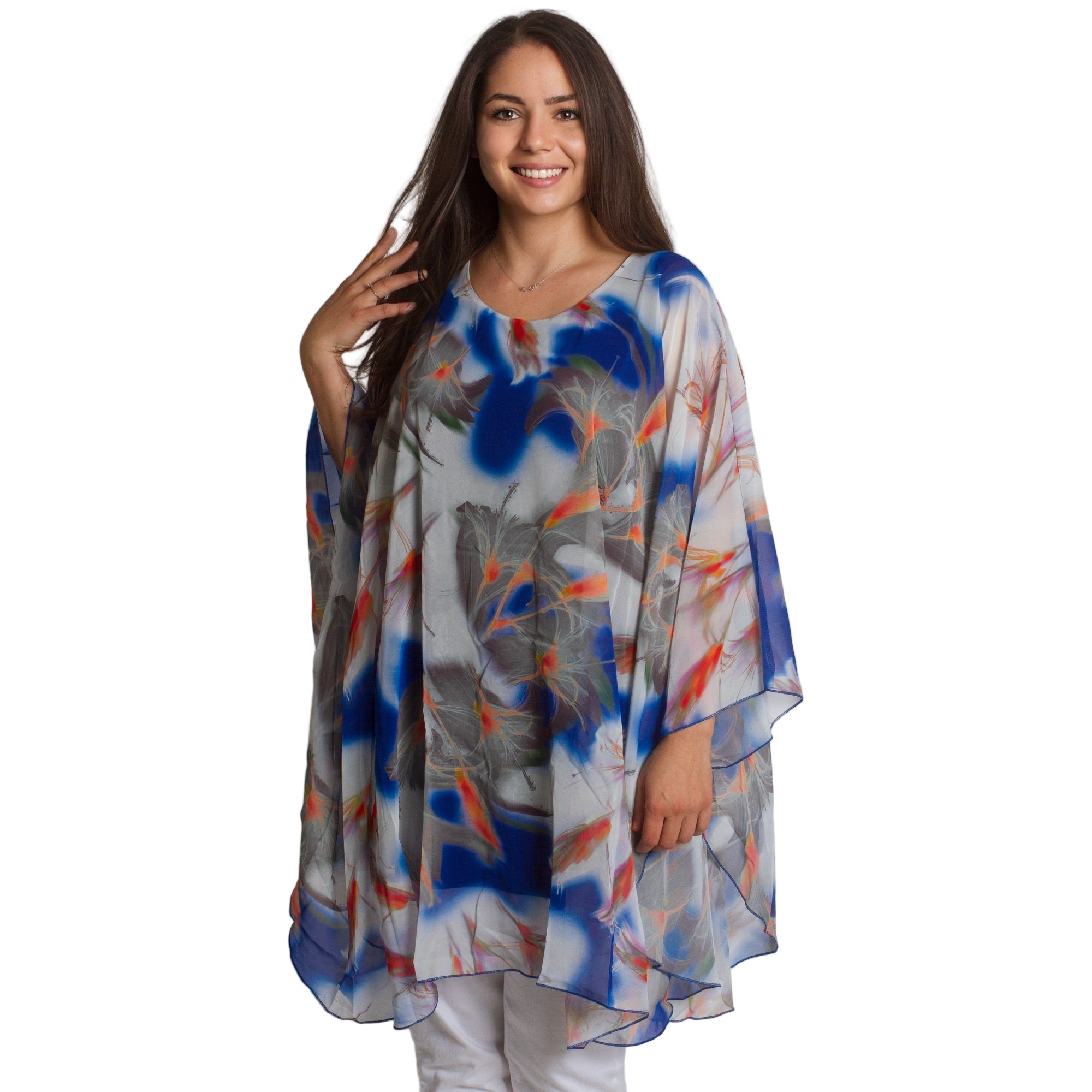 Răsfață-te cu confort și stil cu această tunică elegantă plus-size, confecționată din șifon vaporos, într-un model abstract albastru-gri cu note florale. Căptușeala din viscoză oferă confort și opacitate, iar croiul evazat și lejer ascunde ușor șoldurile și abdomenul. Modelul este o alegere ideală pentru ocazii formale, sărbători și seri festive.