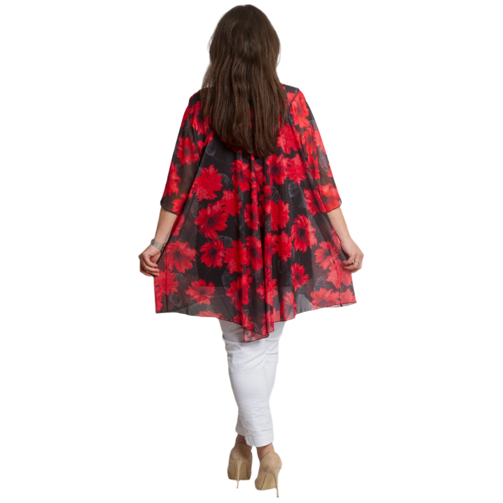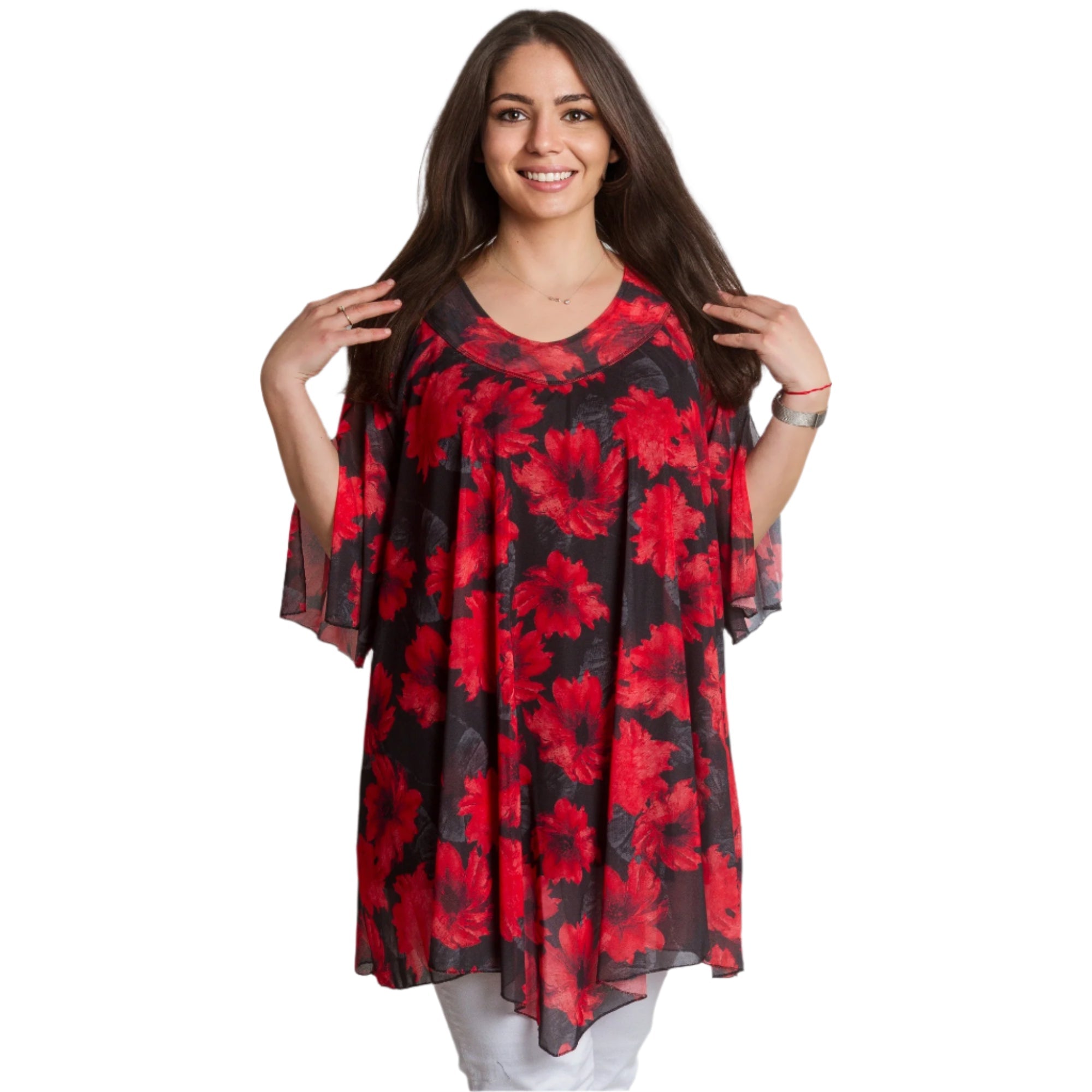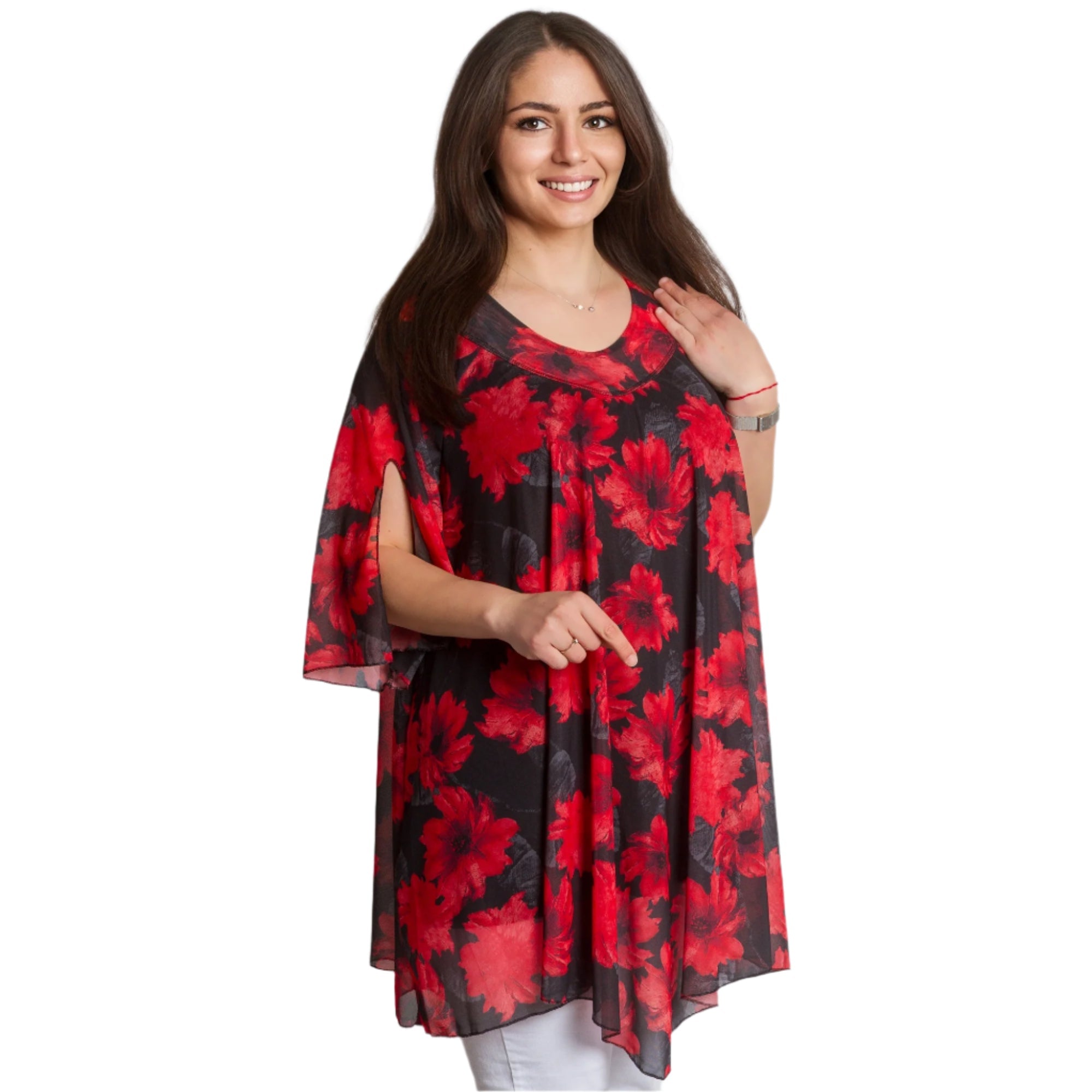 Radiază încredere și stil cu această tunică elegantă, special concepută pentru doamnele cu forme voluptuoase. Modelul combină șifonul vaporos cu un maiou cusut, care oferă confort și opacitate maxime. Croiul lejer și mânecile 3/4 adaugă feminitate și lejeritate, în timp ce imprimeul floral izbitor în roșu intens pe o bază neagră creează un aspect superb, potrivit pentru ocazii formale, sărbători și momente speciale.