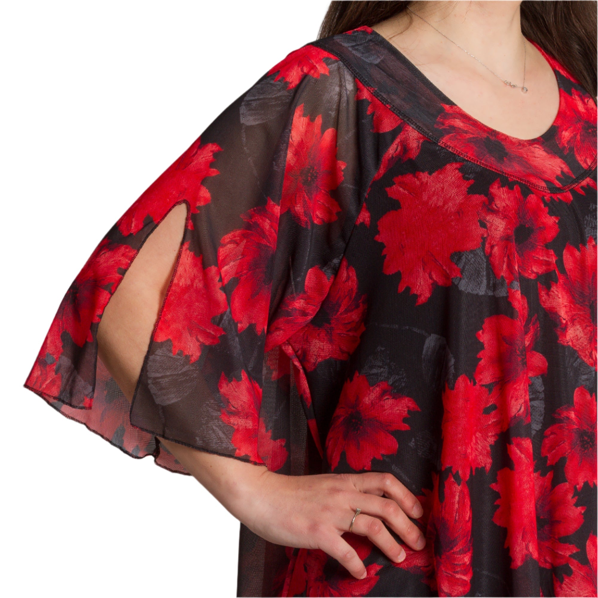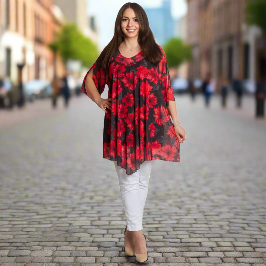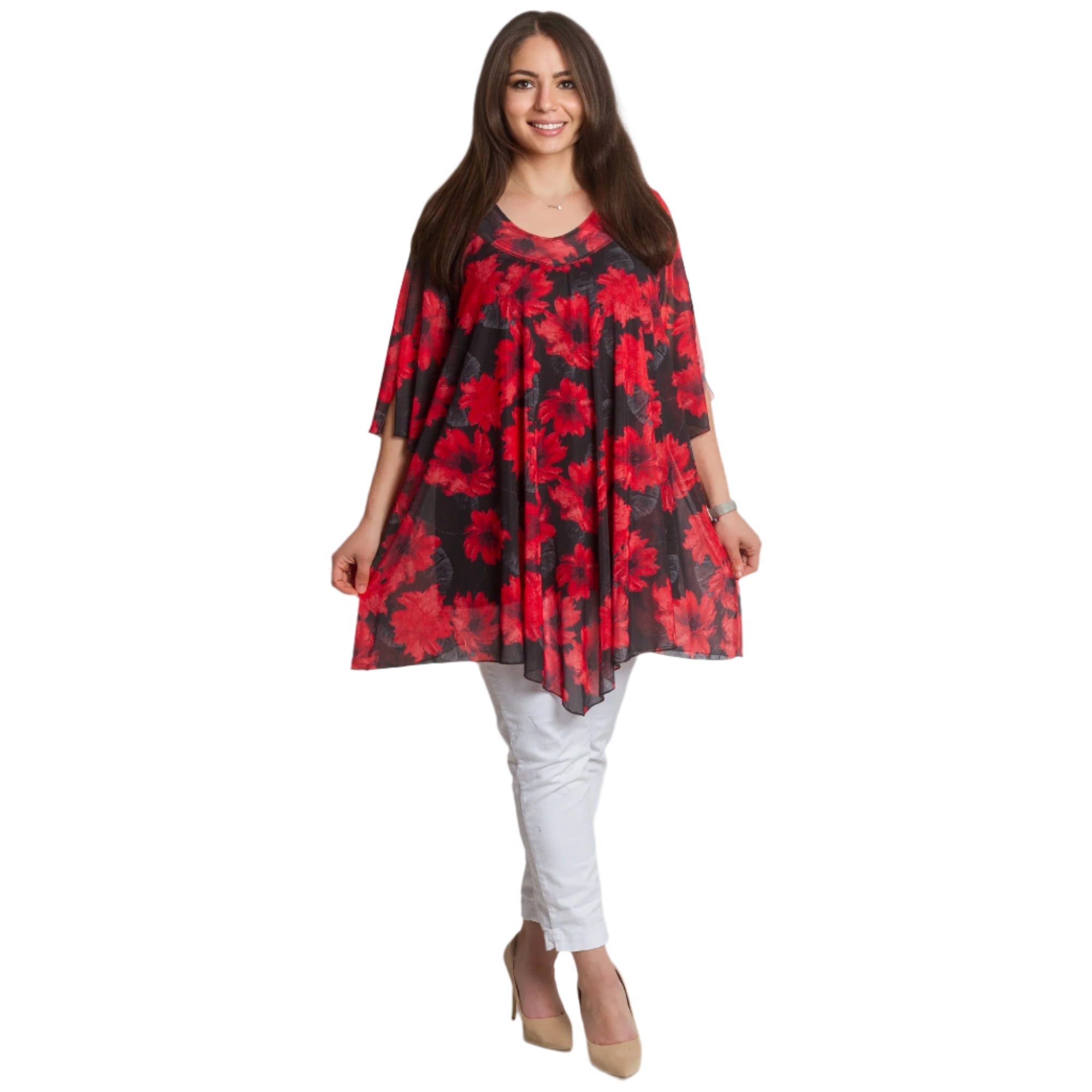 Radiază încredere și stil cu această tunică elegantă, special concepută pentru doamnele cu forme voluptuoase. Modelul combină șifonul vaporos cu un maiou cusut, care oferă confort și opacitate maxime. Croiul lejer și mânecile 3/4 adaugă feminitate și lejeritate, în timp ce imprimeul floral izbitor în roșu intens pe o bază neagră creează un aspect superb, potrivit pentru ocazii formale, sărbători și momente speciale.