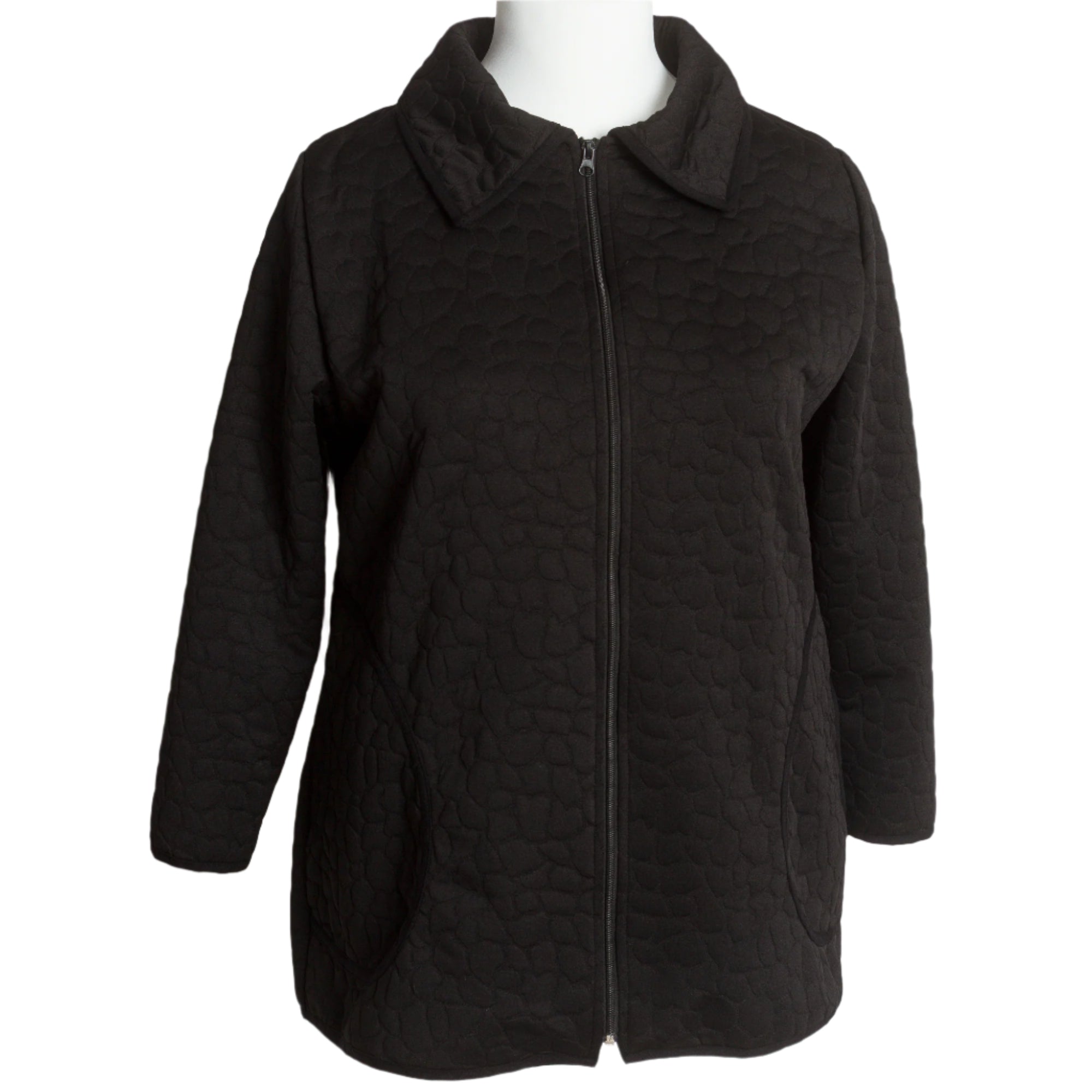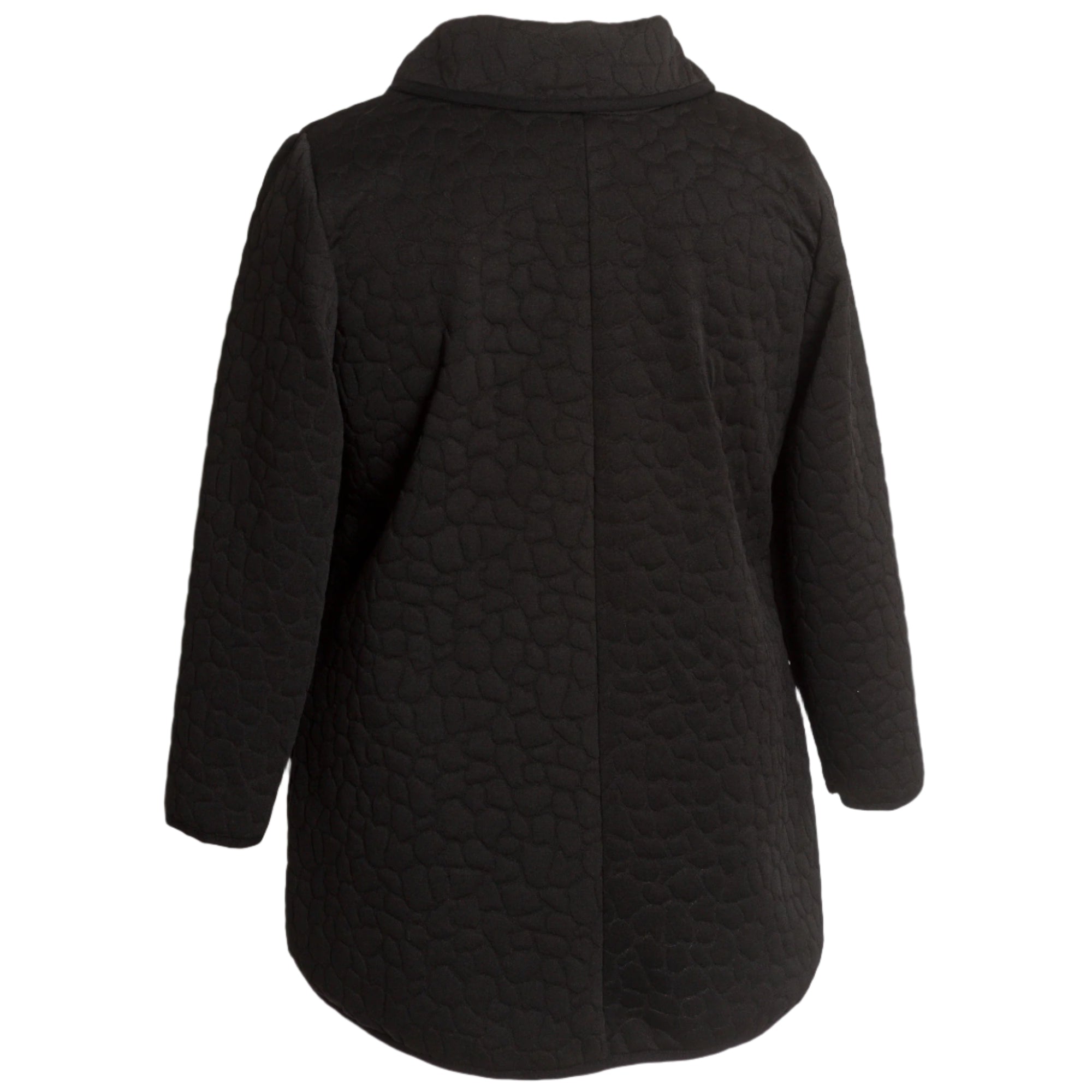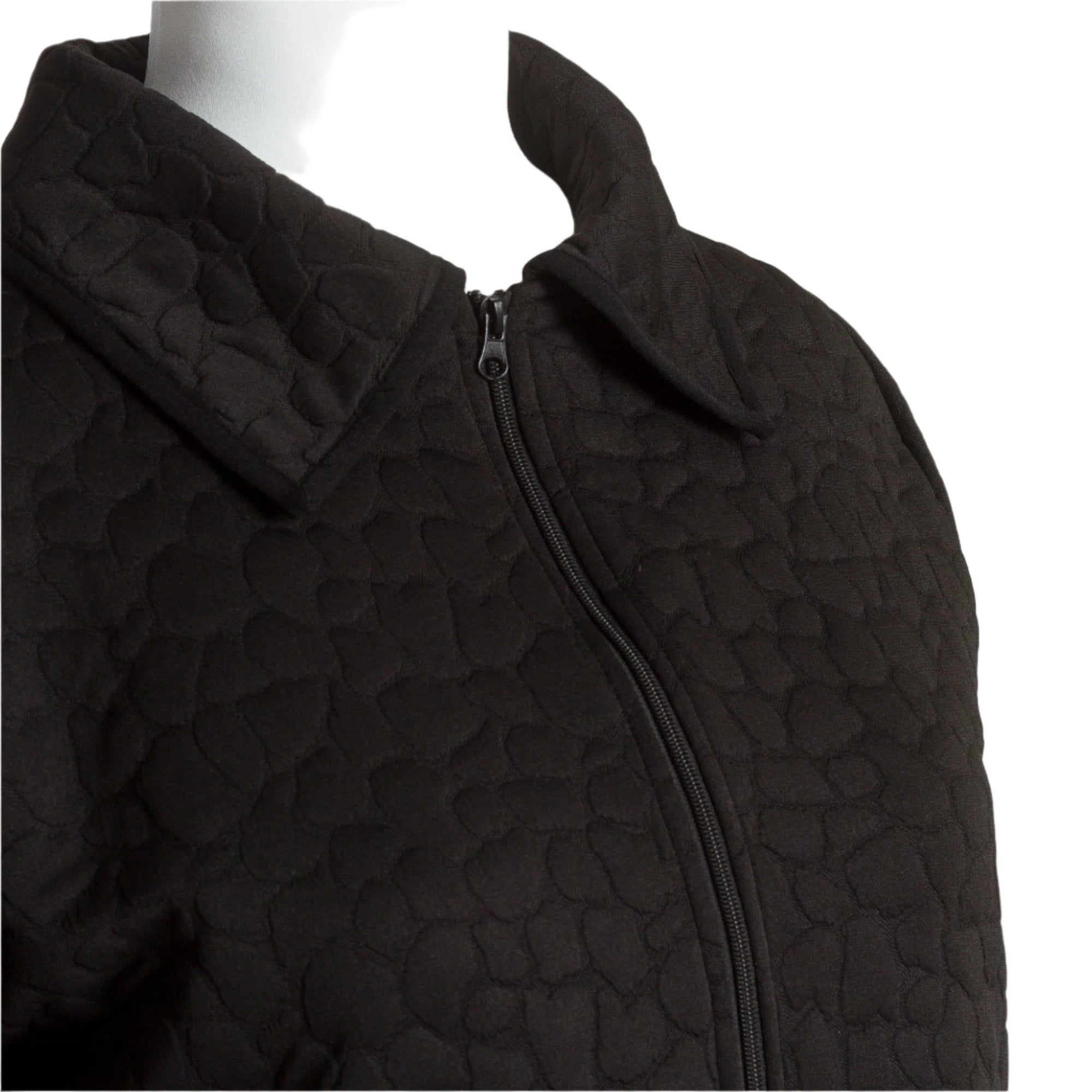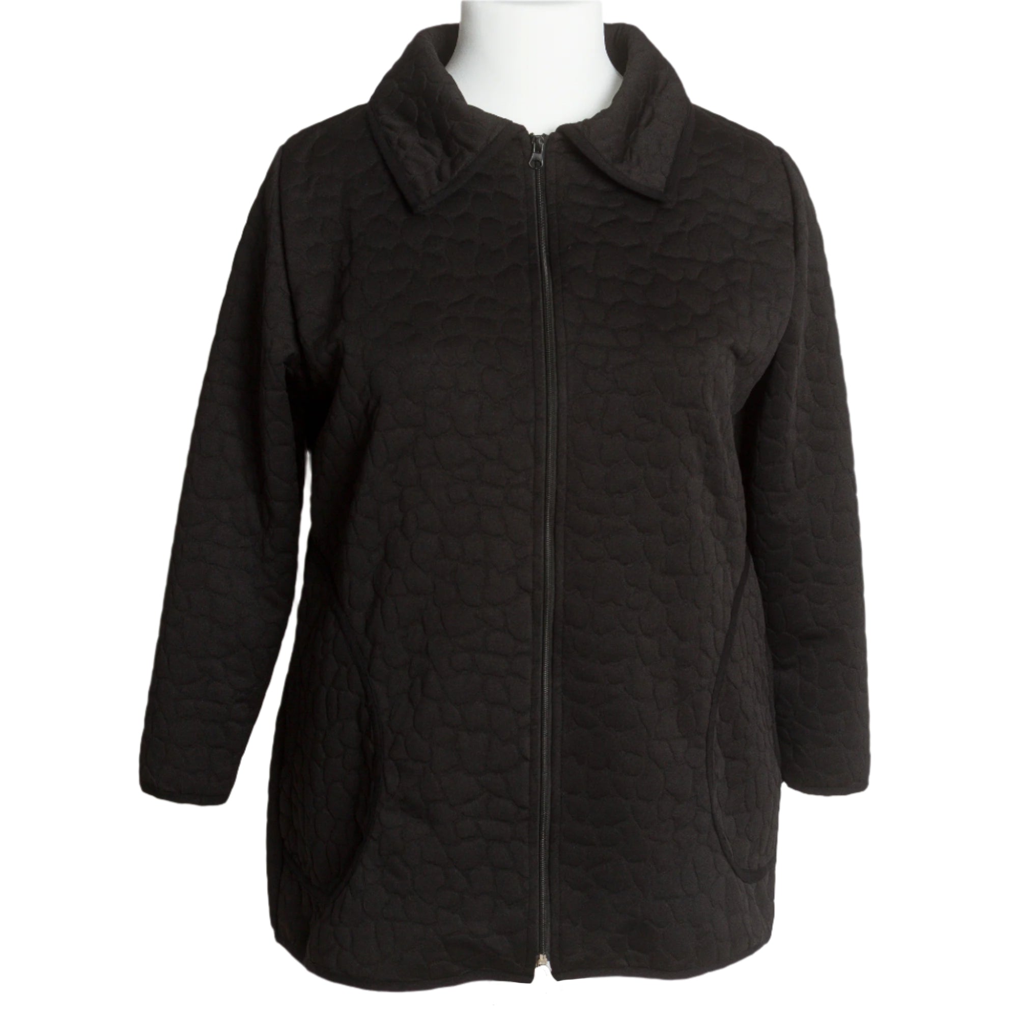 Adaugă stil și confort garderobei tale cu această jachetă elegantă de culoare neagră. Concepută special pentru femeile cu forme voluptuoase, modelul prezintă o croială lejeră care oferă libertate de mișcare. Se închide cu fermoar pe toată lungimea, iar gulerul clasic îi conferă un aspect finisat și sofisticat. Materialul moale și elastic oferă confort maxim, atât pentru viața de zi cu zi, cât și pentru ocazii formale.