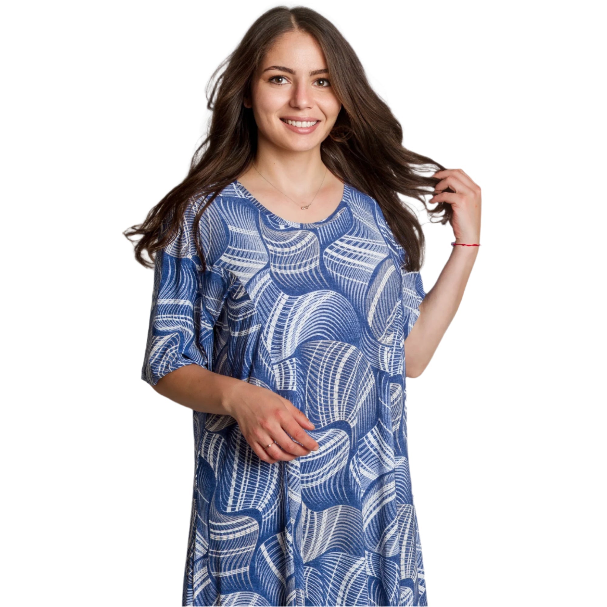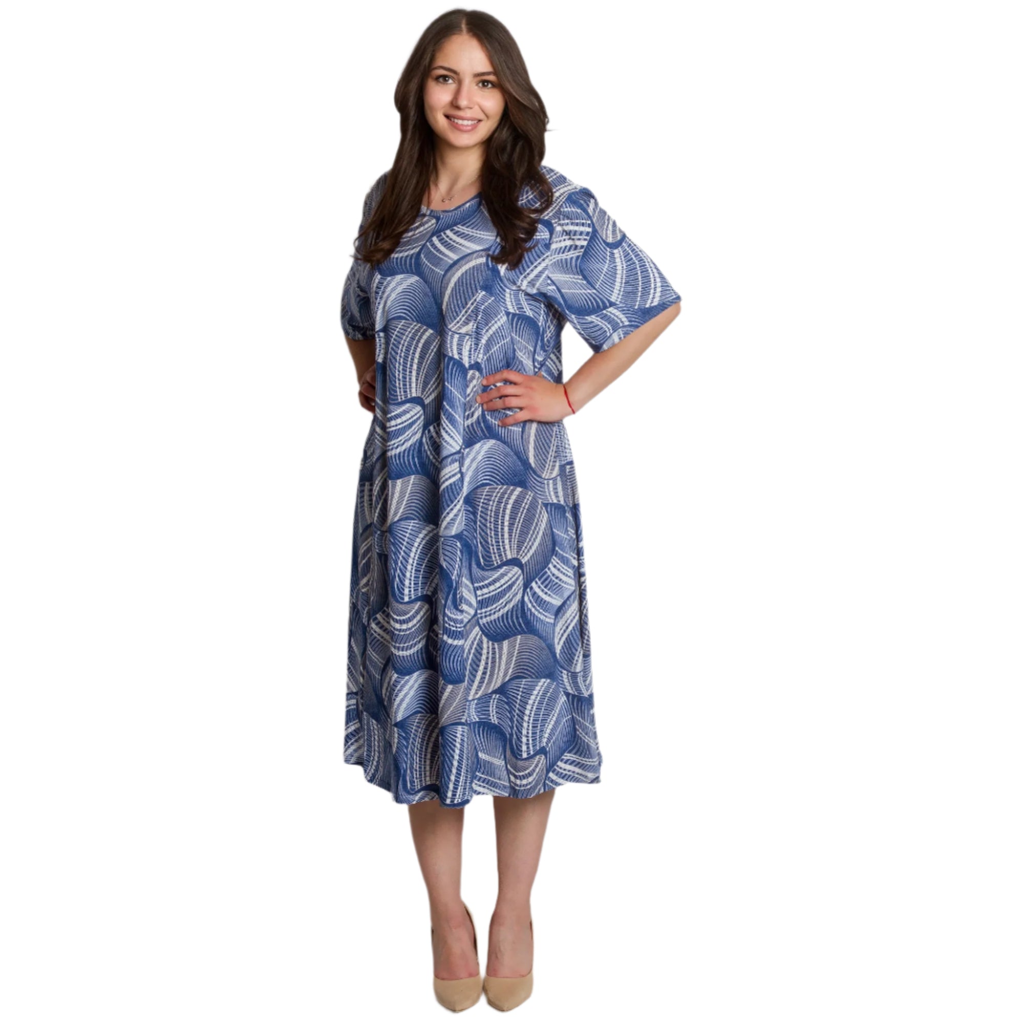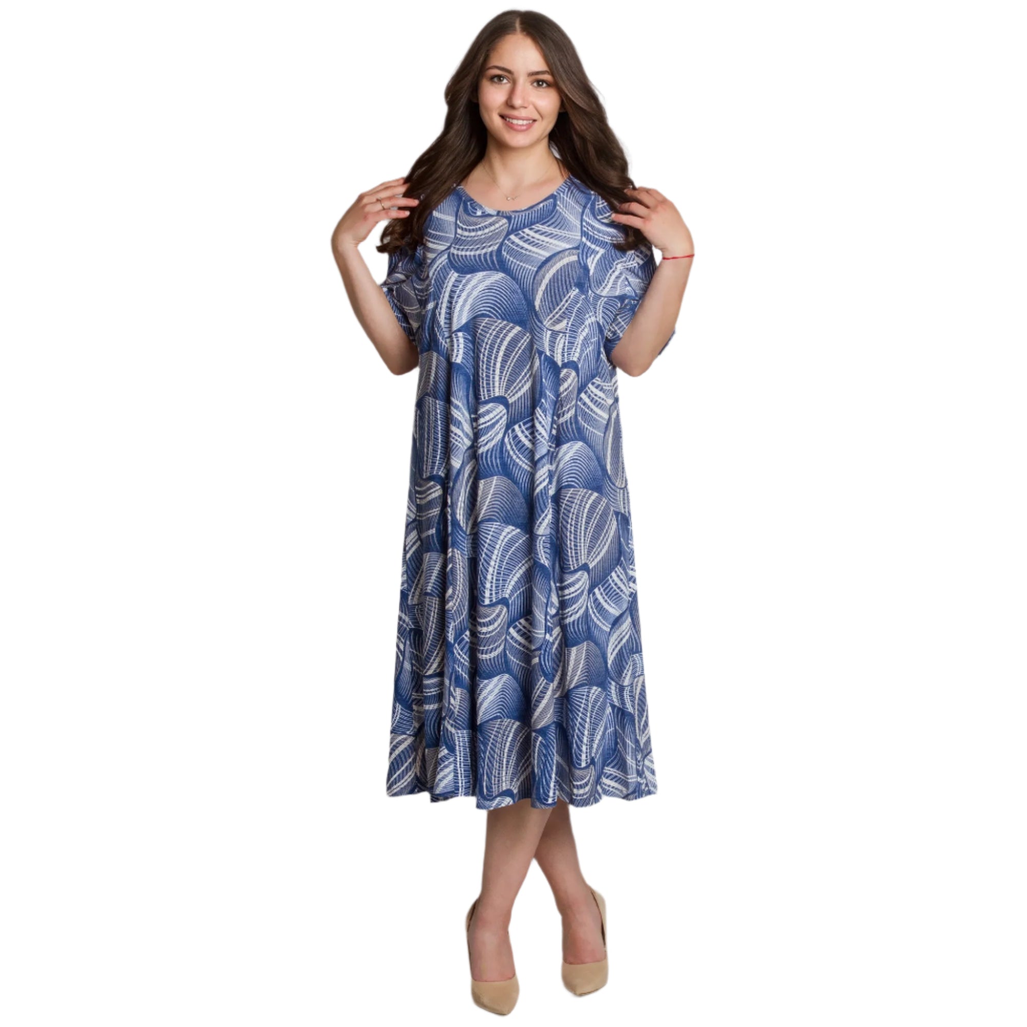 Adaugă prospețime și stil garderobei tale cu această rochie maxi evazată. Confecționată din material moale și elastic din viscoză, rochia oferă confort pe tot parcursul zilei. Designul cu mânecă scurtă și decolteul rotund sunt completate de un model abstract frapant în tonuri de albastru și alb, care creează interes vizual și accentuează feminitatea. Ideală pentru plimbări de zi cu zi, întâlniri cu prietenii sau ocazii informale în sezonul primăvară-vară.