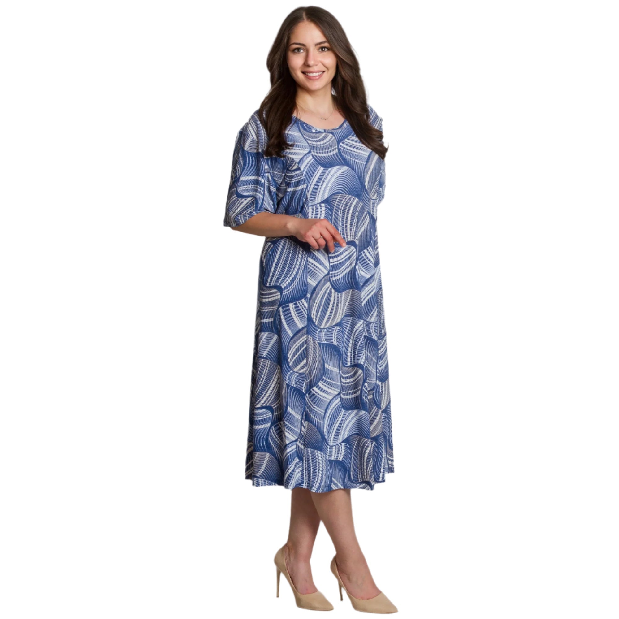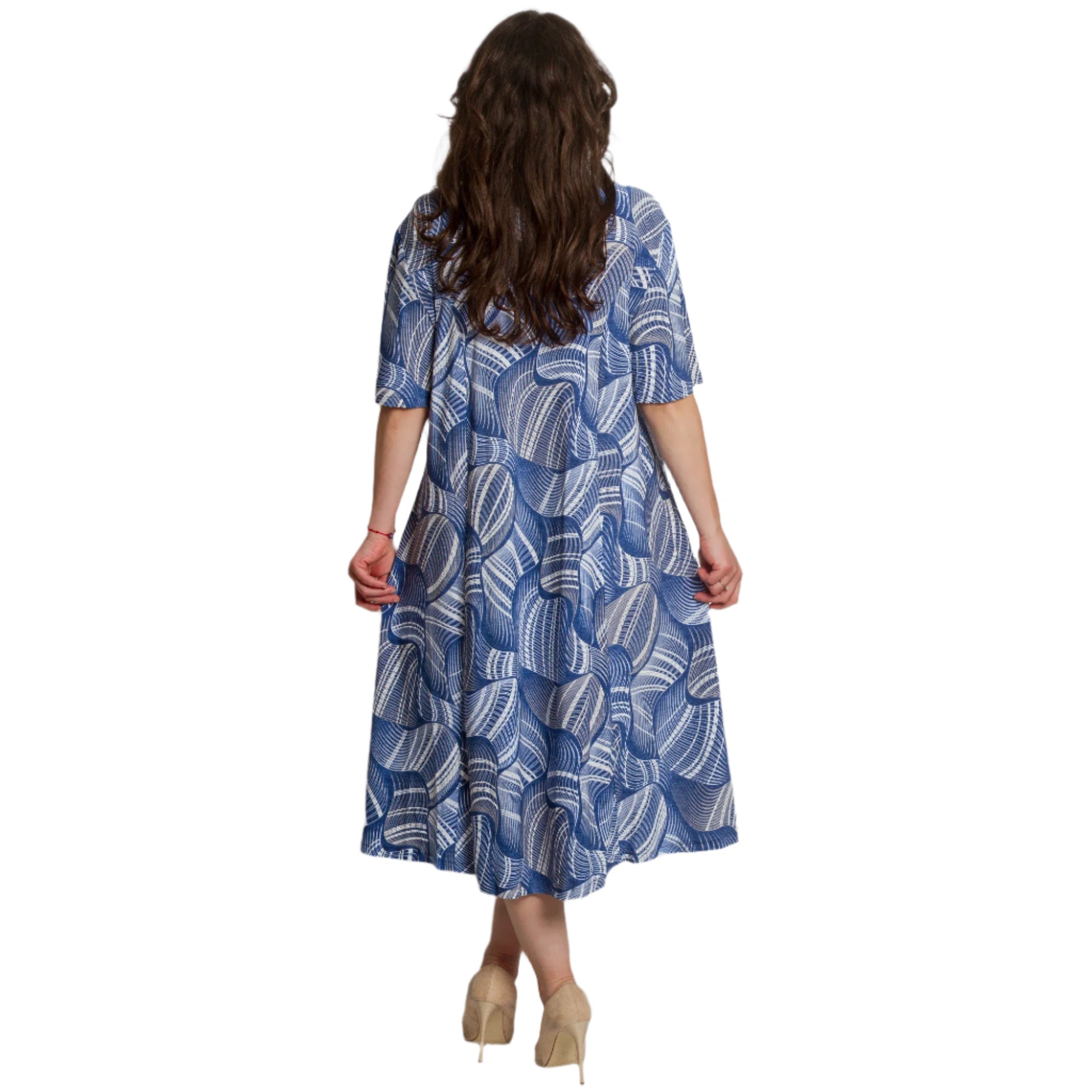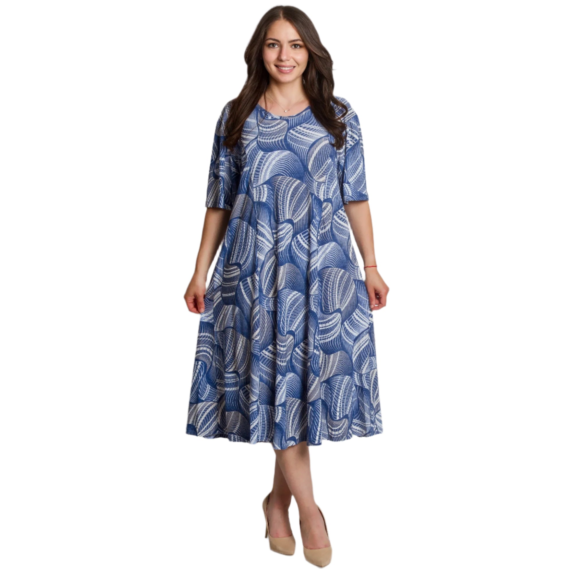 Adaugă prospețime și stil garderobei tale cu această rochie maxi evazată. Confecționată din material moale și elastic din viscoză, rochia oferă confort pe tot parcursul zilei. Designul cu mânecă scurtă și decolteul rotund sunt completate de un model abstract frapant în tonuri de albastru și alb, care creează interes vizual și accentuează feminitatea. Ideală pentru plimbări de zi cu zi, întâlniri cu prietenii sau ocazii informale în sezonul primăvară-vară.