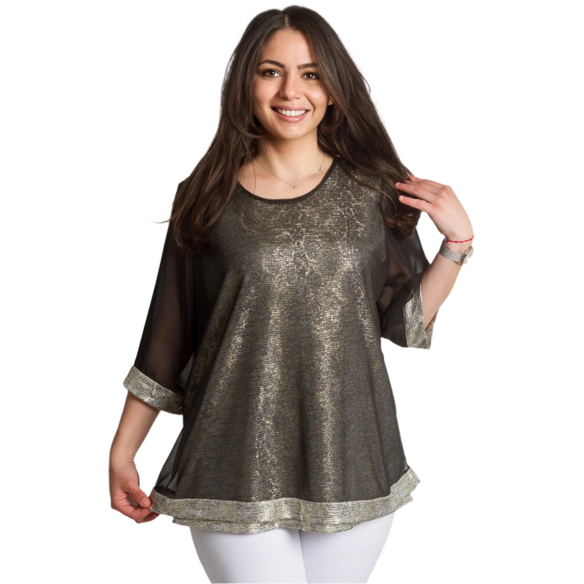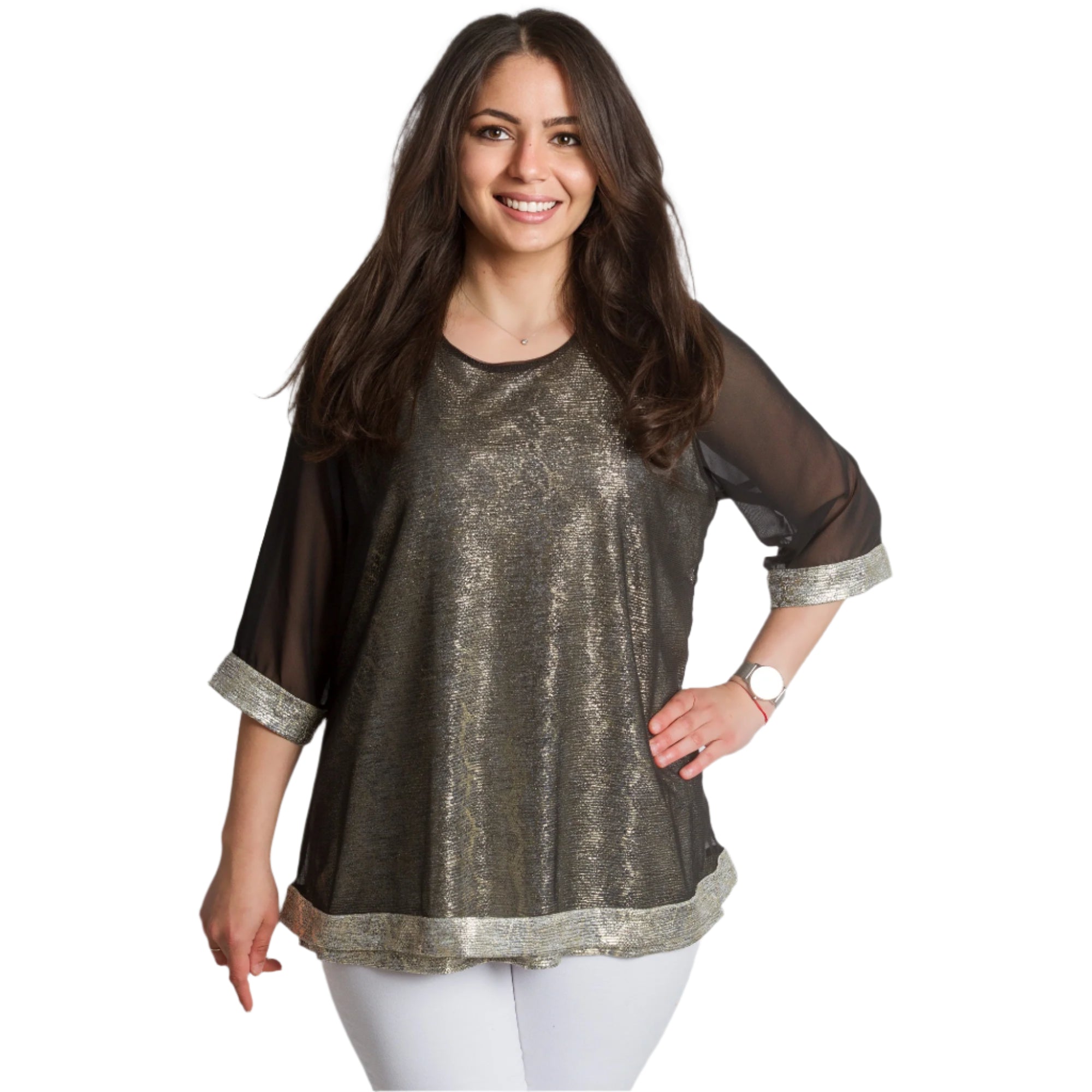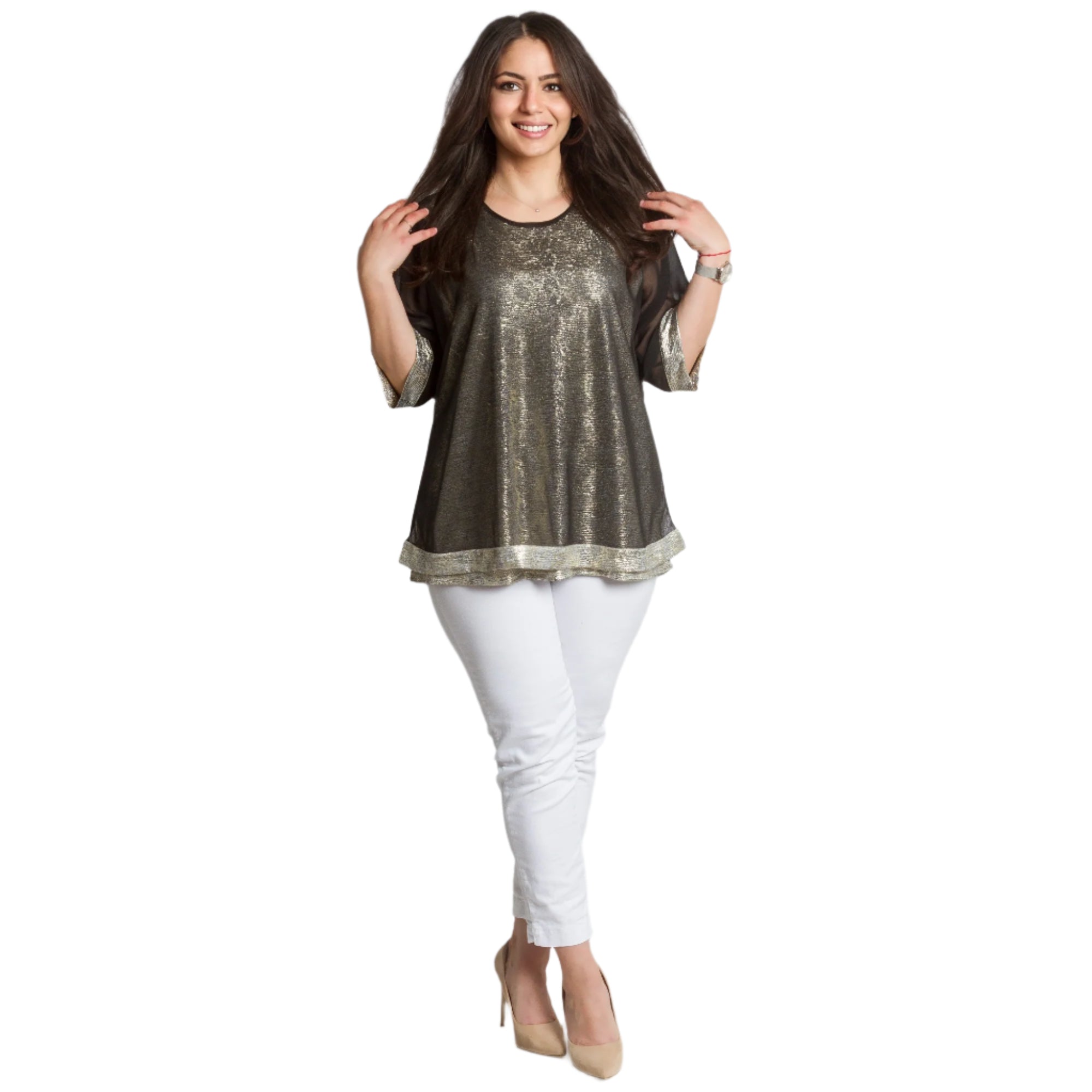 Adaugă strălucire ținutei tale cu această tunică formală impresionantă, disponibilă în mărimi plus. Fabricată dintr-un amestec de înaltă calitate de poliamidă, poliester și elastan, combină confortul și eleganța. Partea principală a tunicii are un efect argintiu strălucitor care se revarsă peste o bază neagră, iar mânecile transparente îi conferă lejeritate și rafinament. Accentul final este garnitura aurie de pe tiv și mâneci. Modelul este lejer și confortabil - ideal pentru evenimente formale din sezonul primăvară-vară.