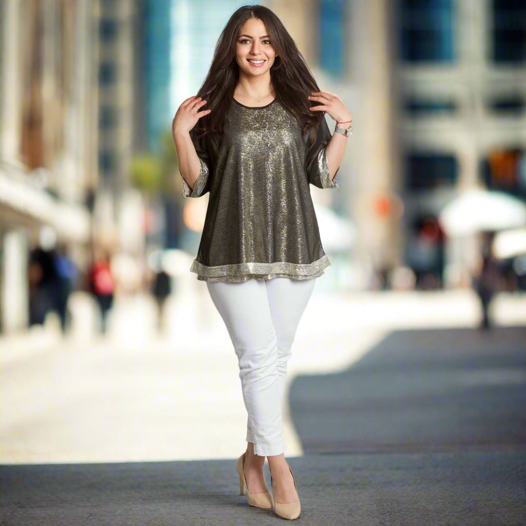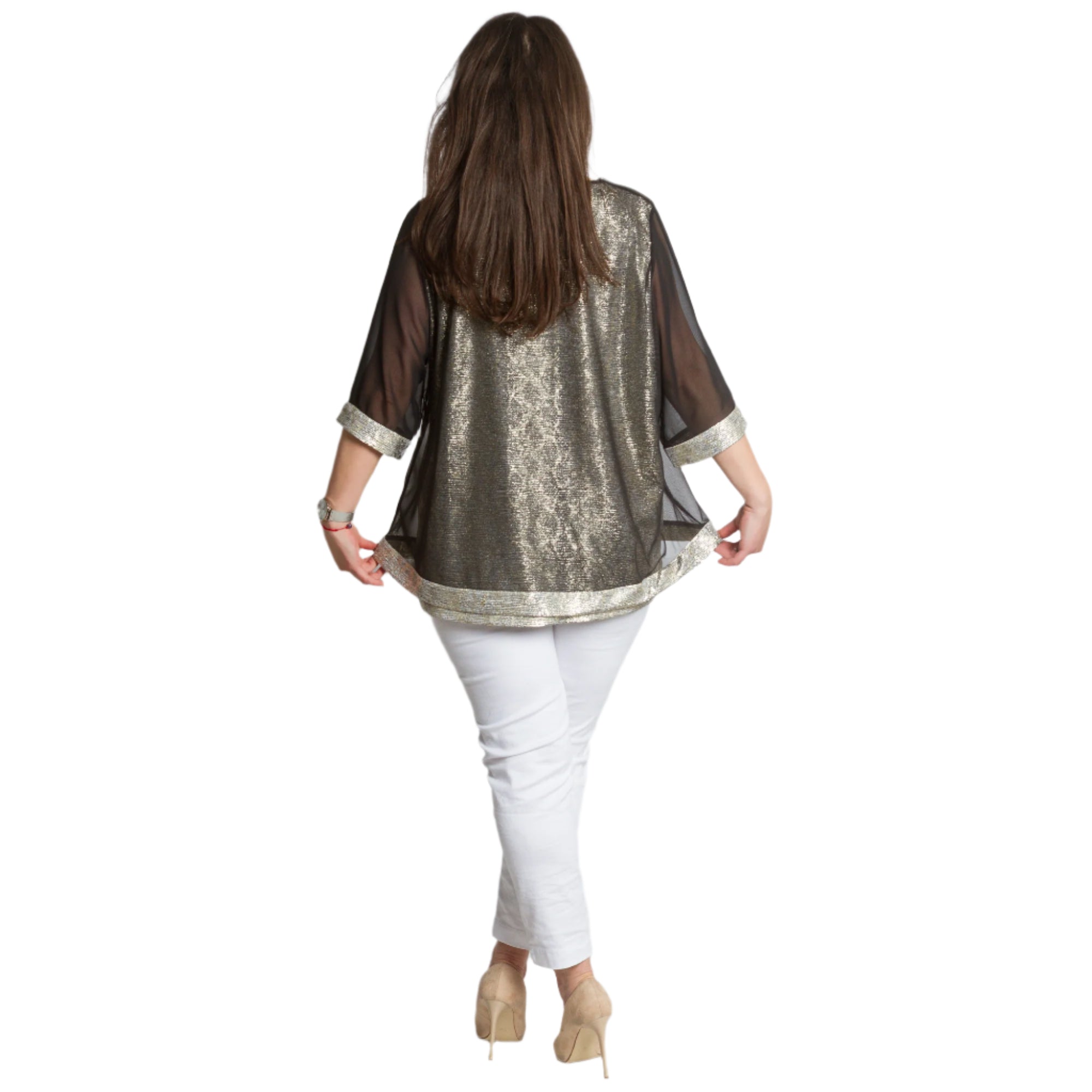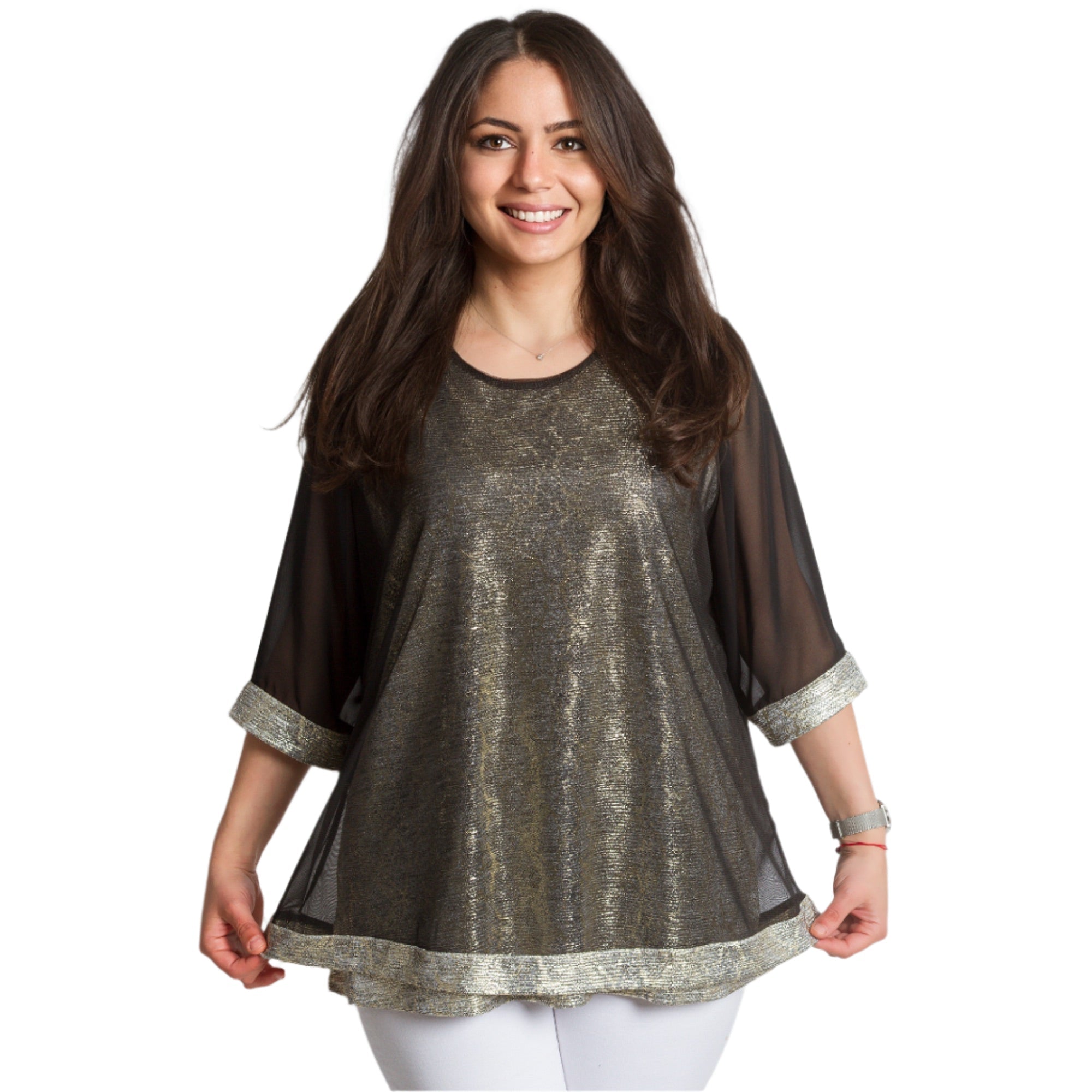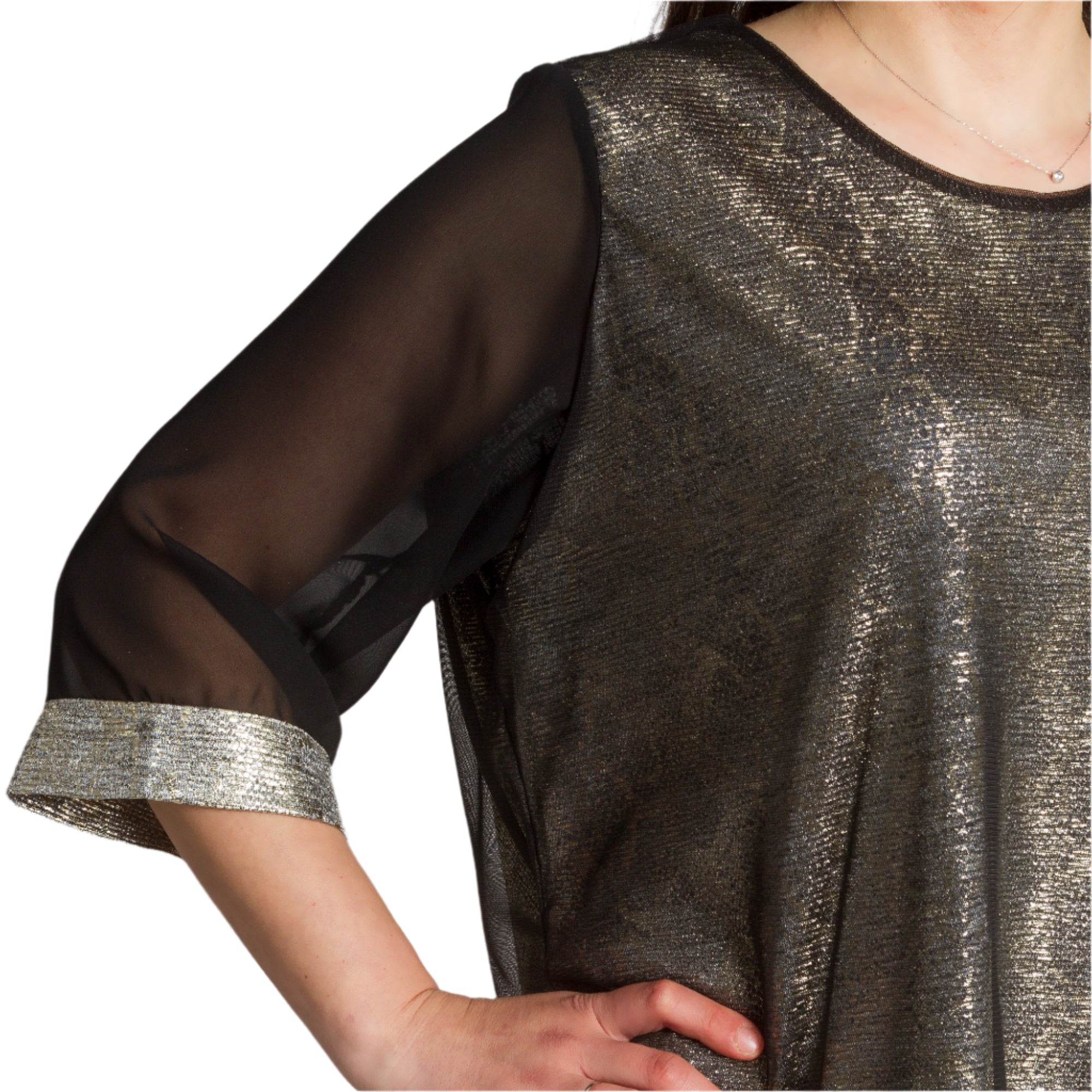 Adaugă strălucire ținutei tale cu această tunică formală impresionantă, disponibilă în mărimi plus. Fabricată dintr-un amestec de înaltă calitate de poliamidă, poliester și elastan, combină confortul și eleganța. Partea principală a tunicii are un efect argintiu strălucitor care se revarsă peste o bază neagră, iar mânecile transparente îi conferă lejeritate și rafinament. Accentul final este garnitura aurie de pe tiv și mâneci. Modelul este lejer și confortabil - ideal pentru evenimente formale din sezonul primăvară-vară.