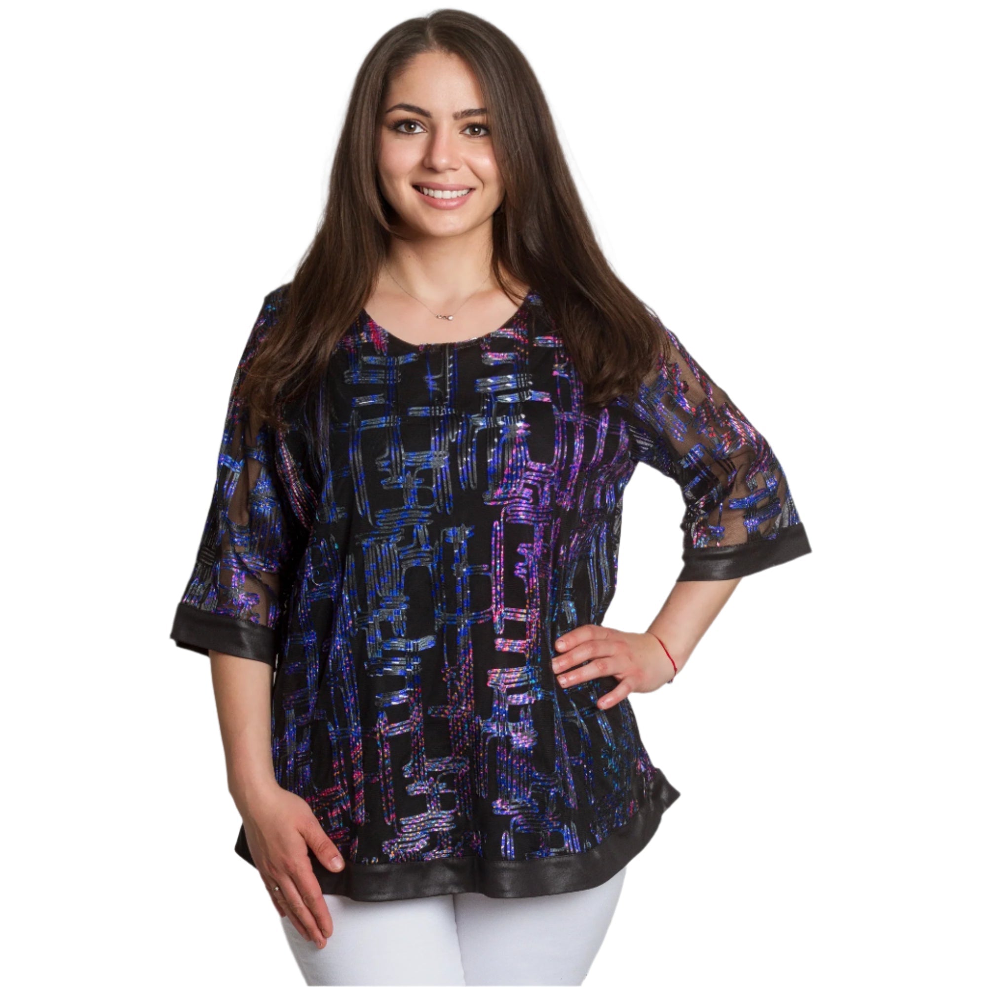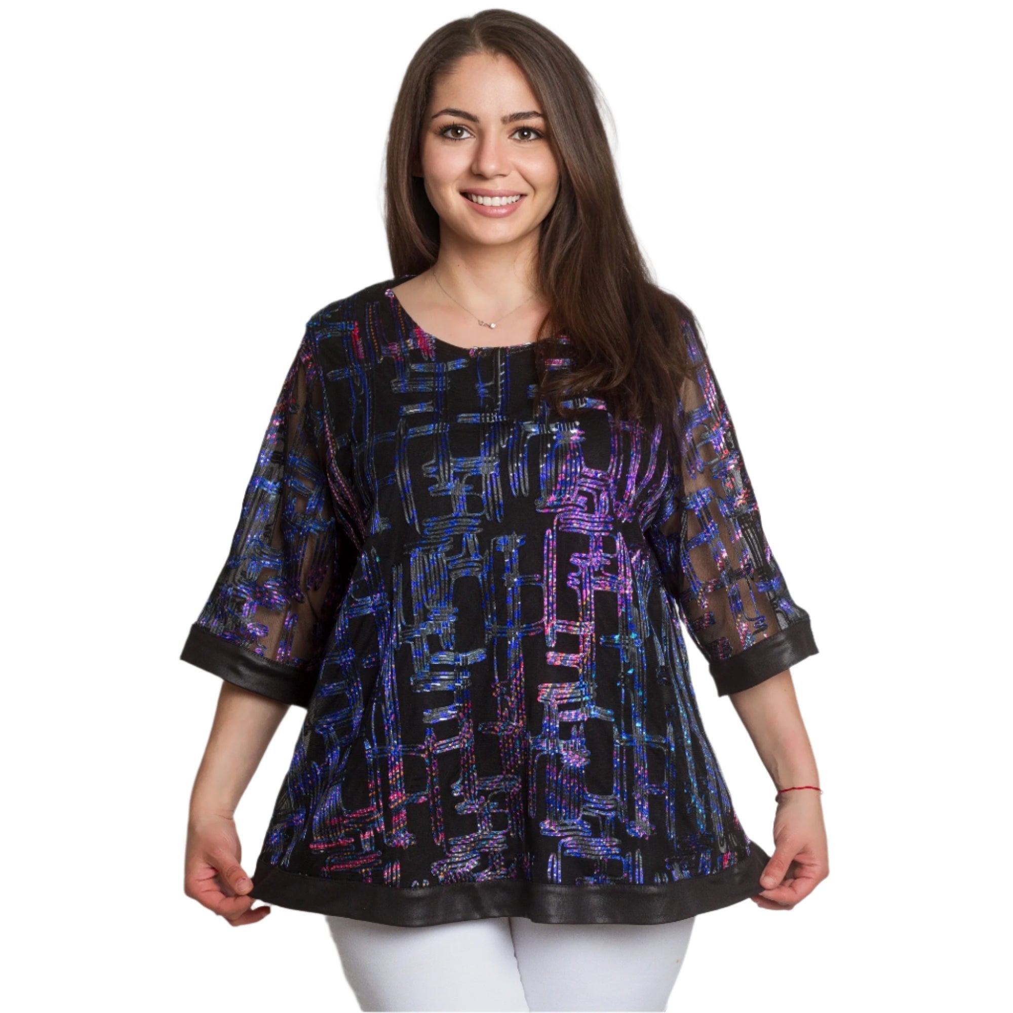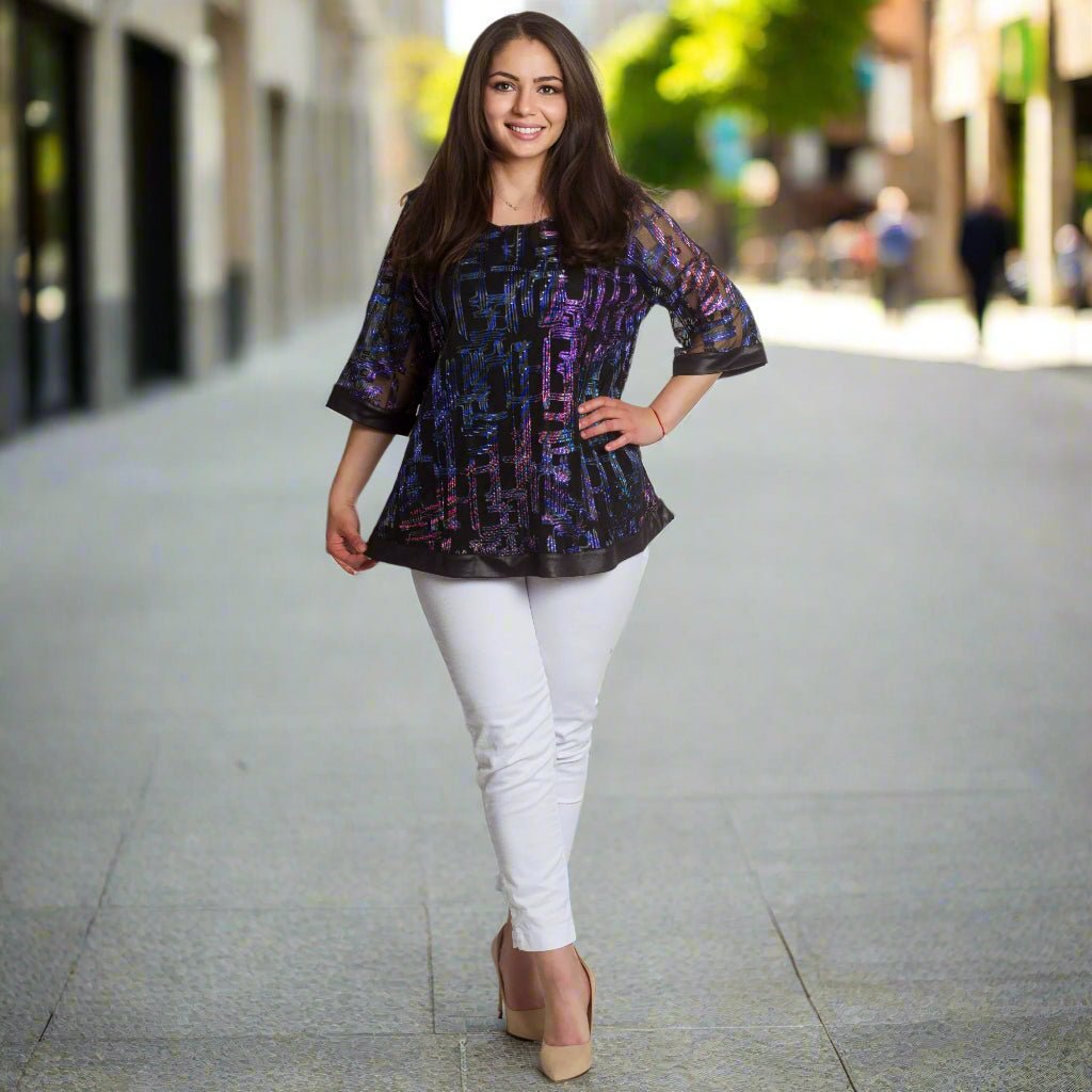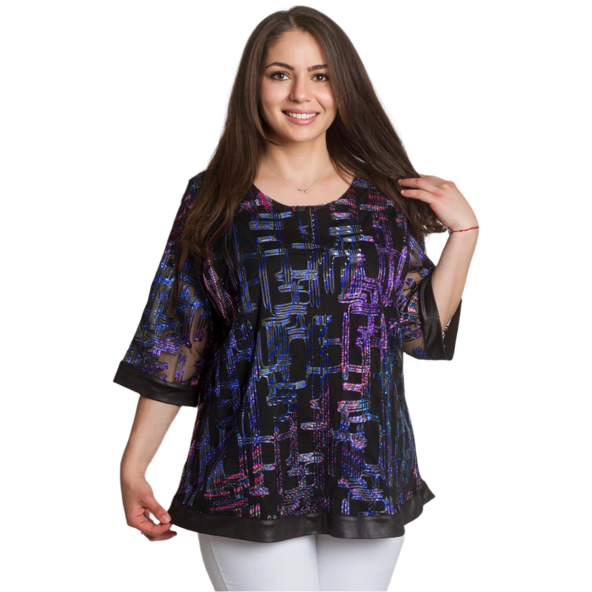 Adaugă o notă de eleganță garderobei tale cu această tunică formală mărime plus. Confecționată din material de înaltă calitate cu elemente strălucitoare și un model geometric interesant în violet și albastru pe o bază neagră, această tunică combină confortul și stilul. Mânecile 3/4 transparente cu un model spectaculos și marginile satinate adaugă rafinament și feminitate, iar croiul evazat accentuează silueta fără a o strânge. Ideală pentru evenimente formale din sezonul primăvară-vară.