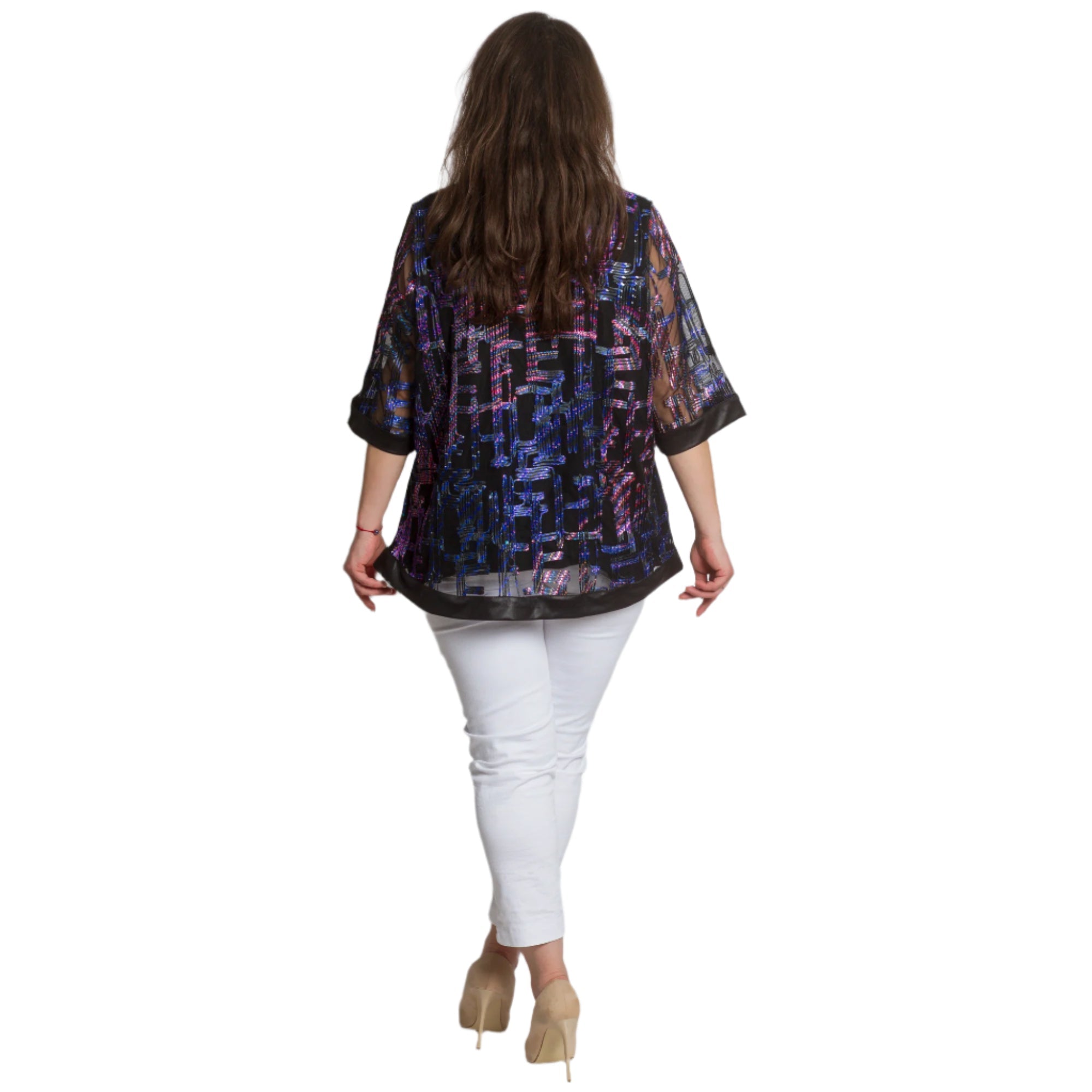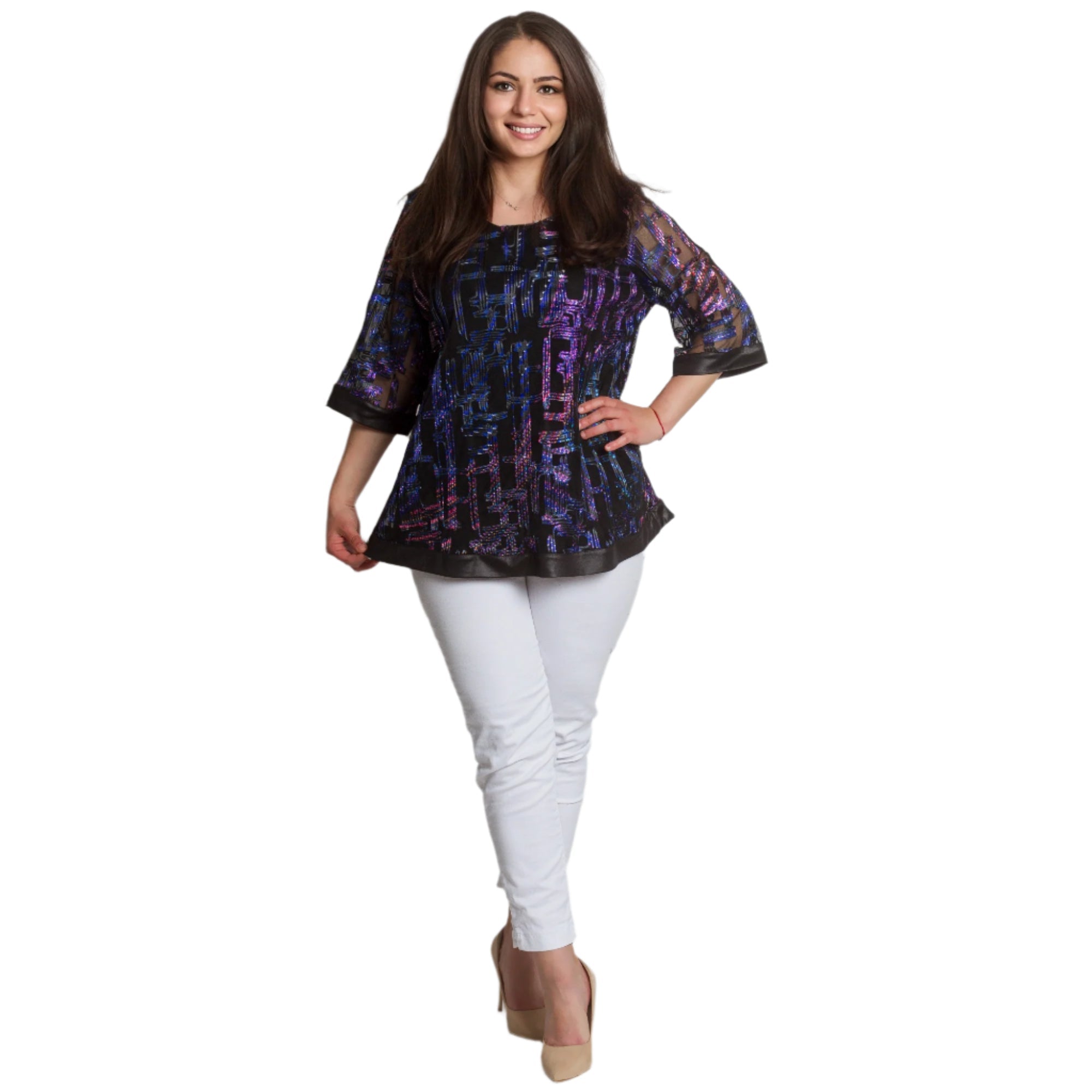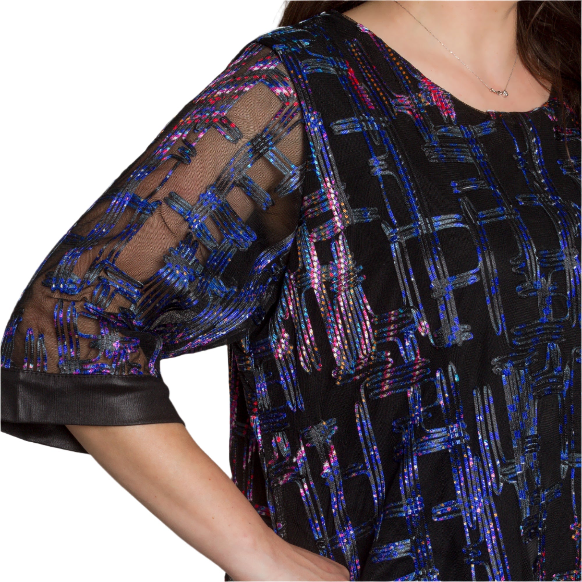 Adaugă o notă de eleganță garderobei tale cu această tunică formală mărime plus. Confecționată din material de înaltă calitate cu elemente strălucitoare și un model geometric interesant în violet și albastru pe o bază neagră, această tunică combină confortul și stilul. Mânecile 3/4 transparente cu un model spectaculos și marginile satinate adaugă rafinament și feminitate, iar croiul evazat accentuează silueta fără a o strânge. Ideală pentru evenimente formale din sezonul primăvară-vară.