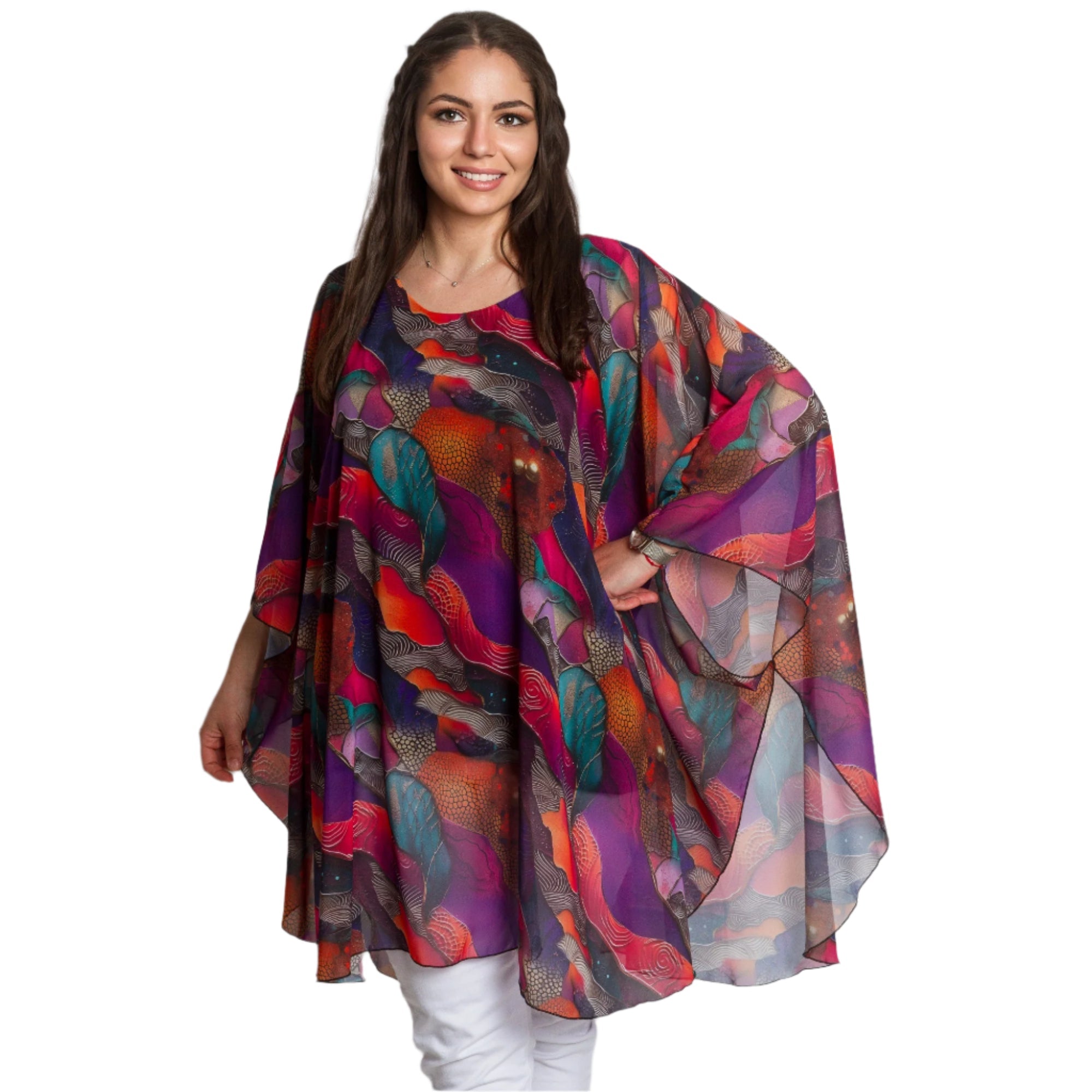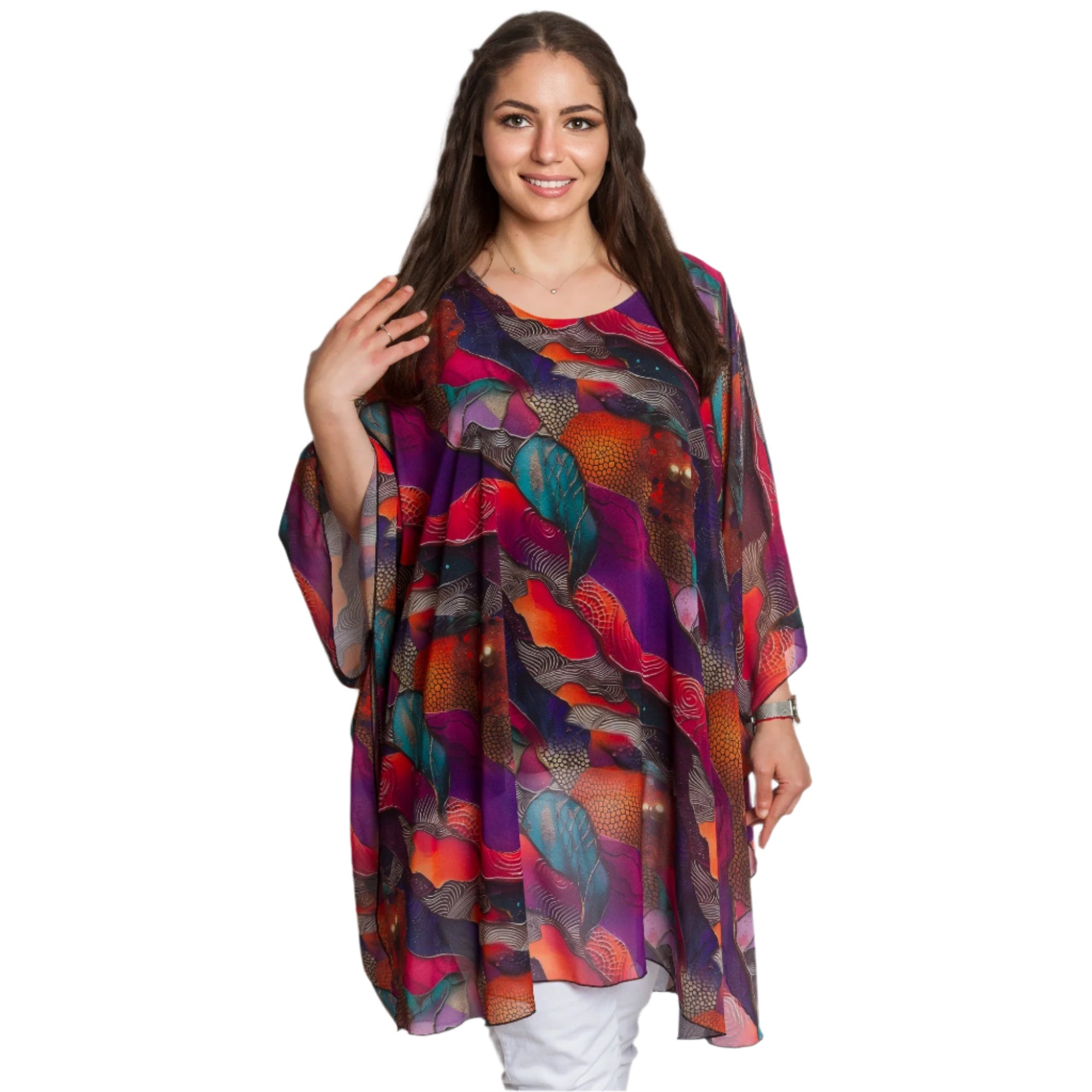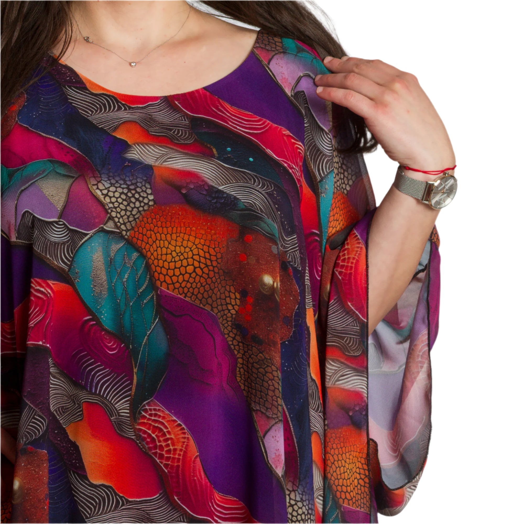 Tunică asimetrică superbă, cu o croială evazată, confecționată din șifon ușor cu un model artistic multicolor. Modelul este potrivit pentru ocazii formale din sezonul primăvară-vară. Decolteul rotund și mânecile vaporoase oferă confort și stil, iar croiala lejeră accentuează grația figurii feminine fără a o strânge.