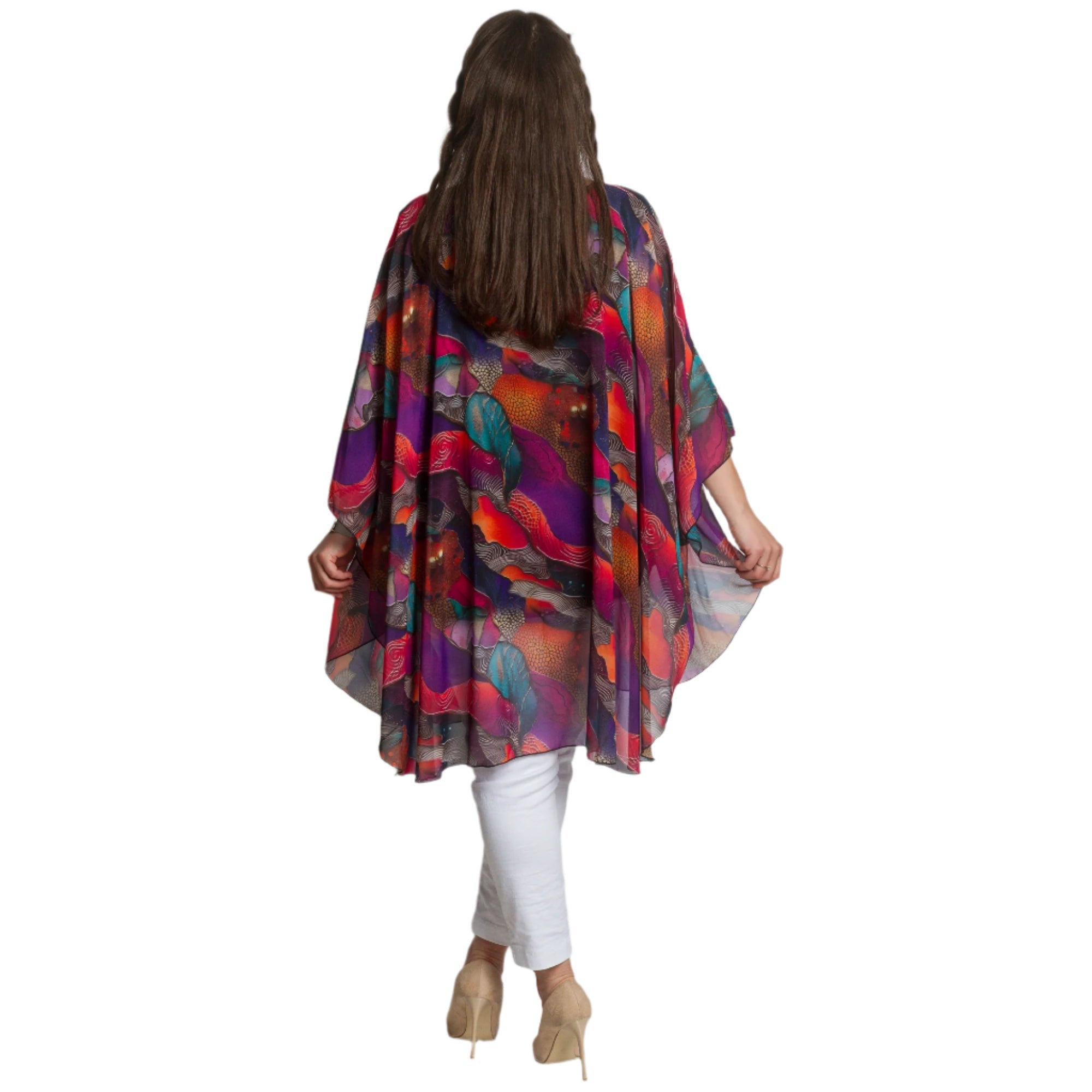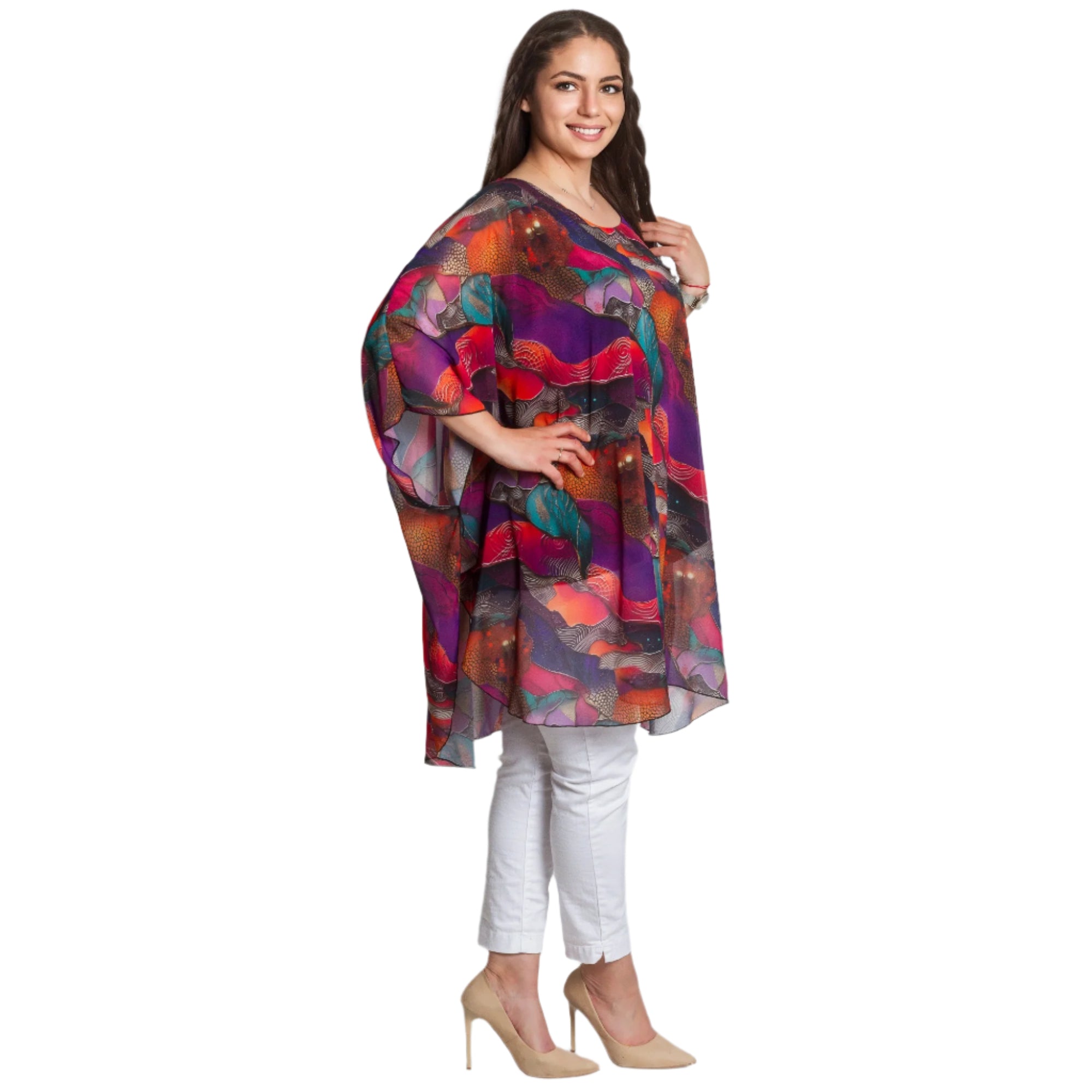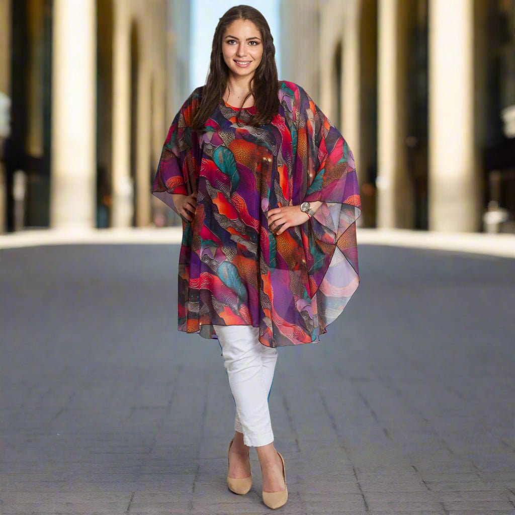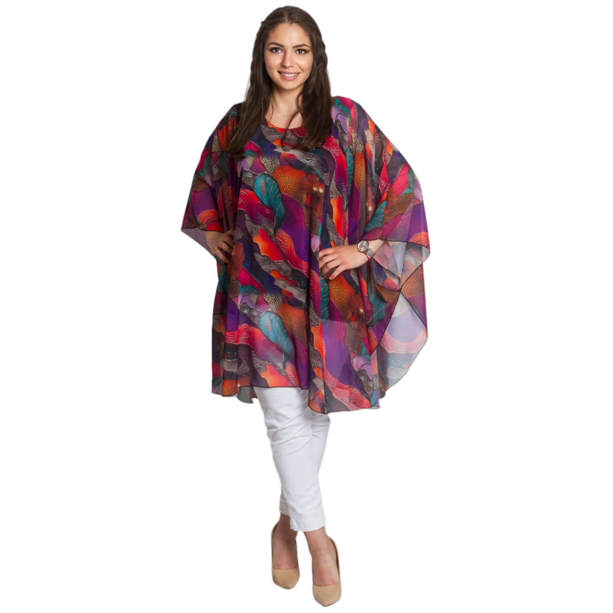 Tunică asimetrică superbă, cu o croială evazată, confecționată din șifon ușor cu un model artistic multicolor. Modelul este potrivit pentru ocazii formale din sezonul primăvară-vară. Decolteul rotund și mânecile vaporoase oferă confort și stil, iar croiala lejeră accentuează grația figurii feminine fără a o strânge.