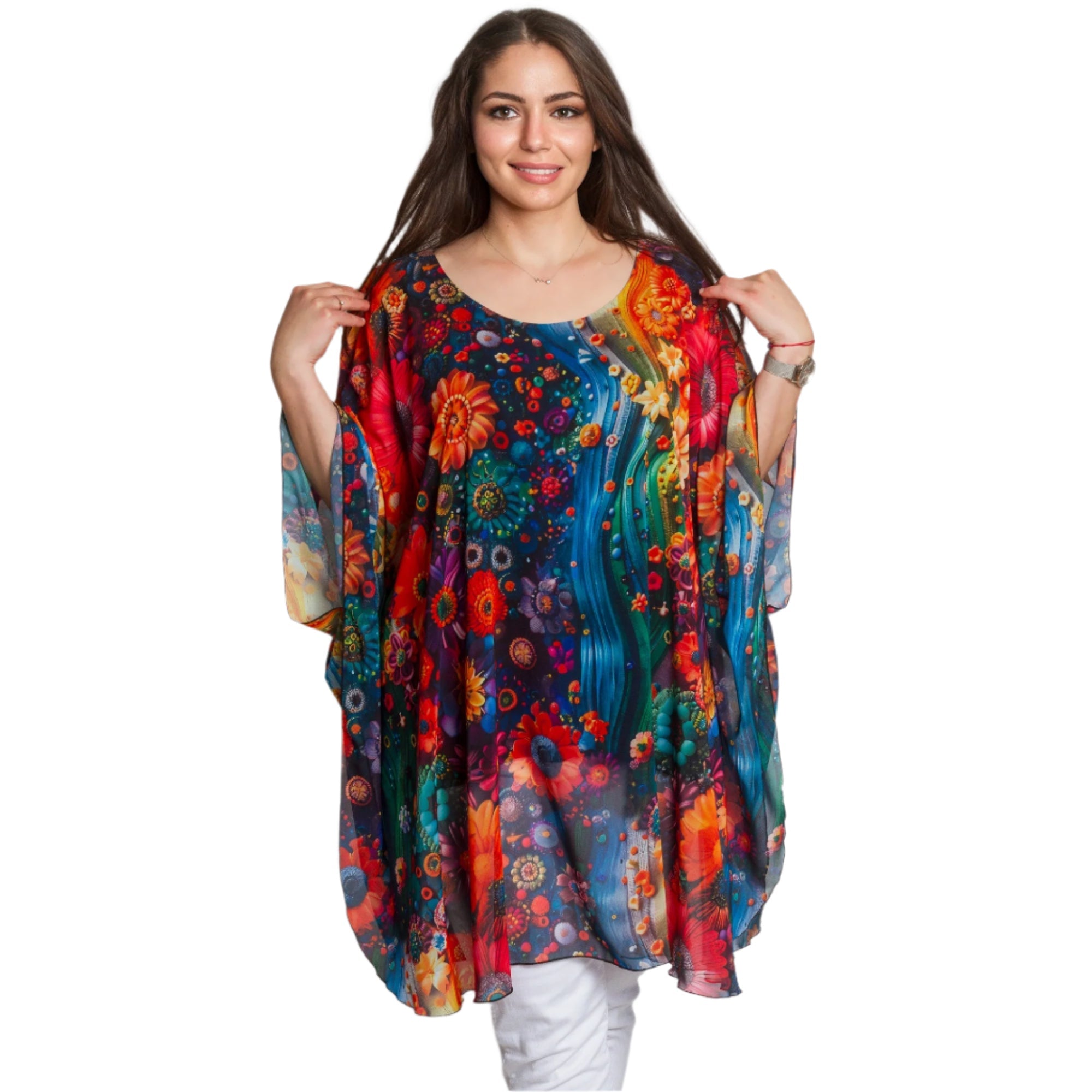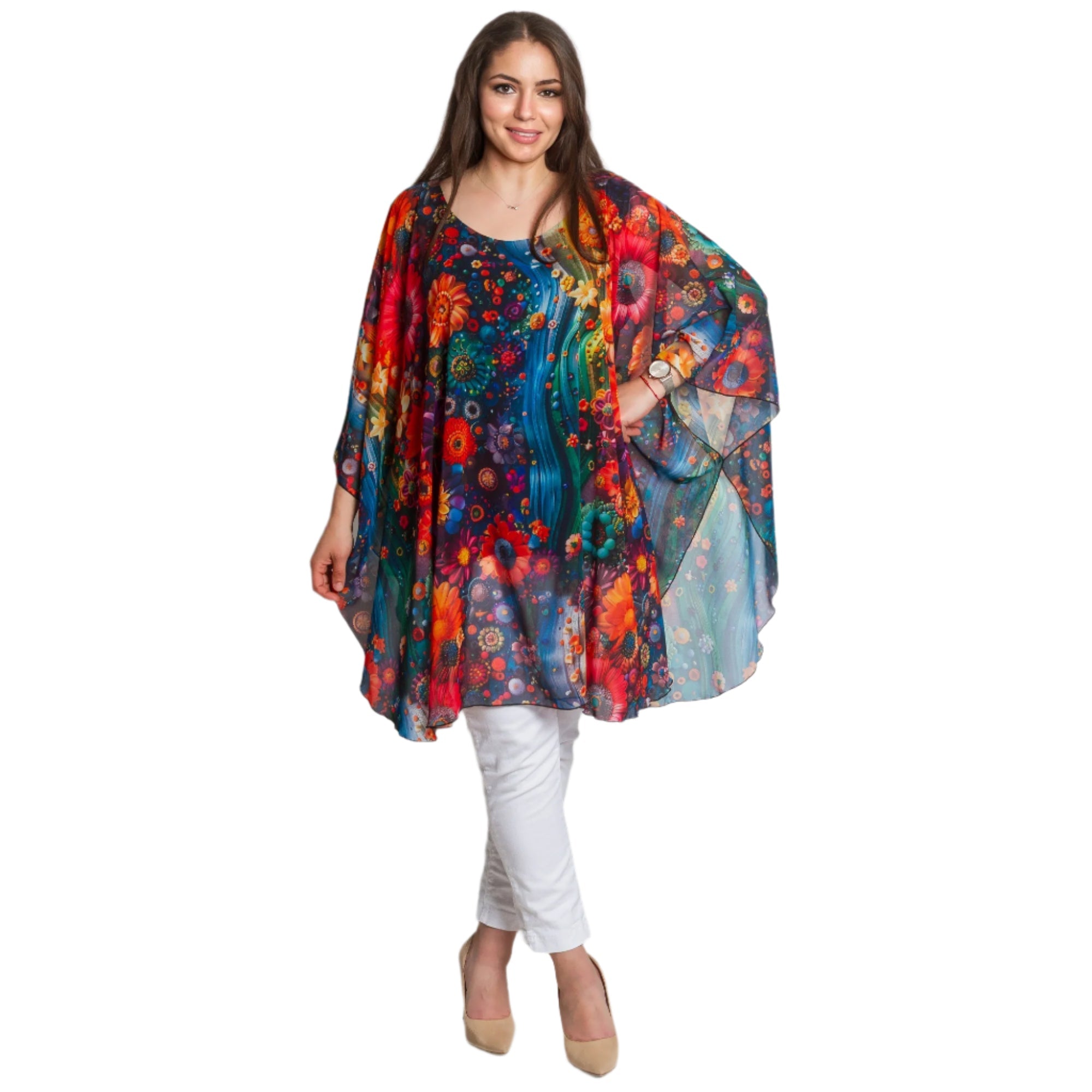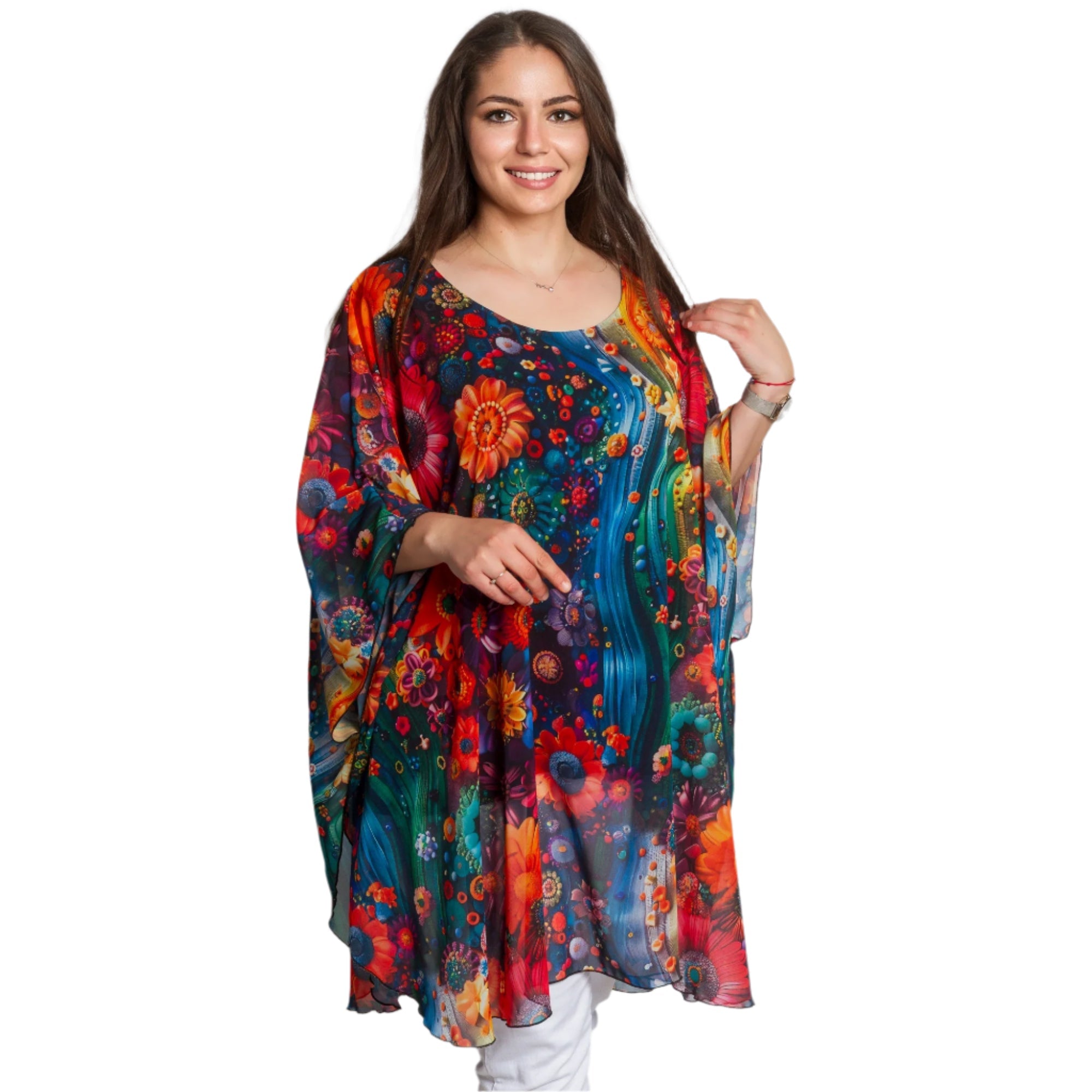 Transformă-ți look-ul cu această tunică plus-size remarcabilă, confecționată din șifon vaporos. Cu un model floral și abstract multicolor, modelul impresionează printr-o croială asimetrică și o siluetă lejeră care accentuează feminitatea prin confort. Ideală pentru evenimente formale, această tunică combină grația și stilul cu ușurință.
