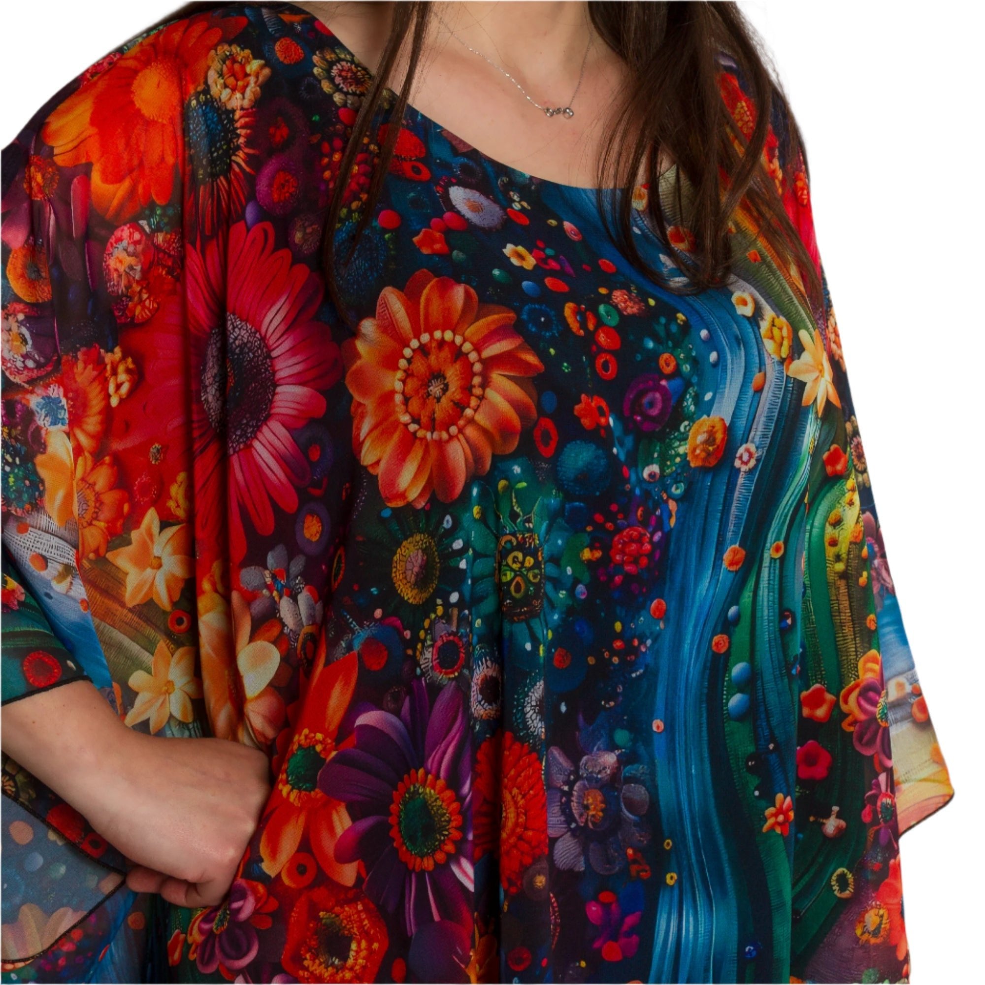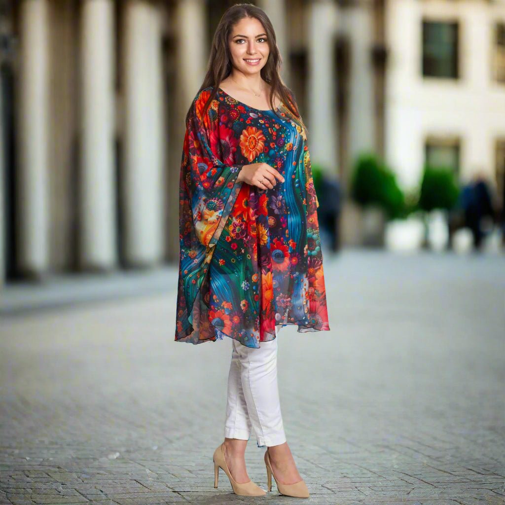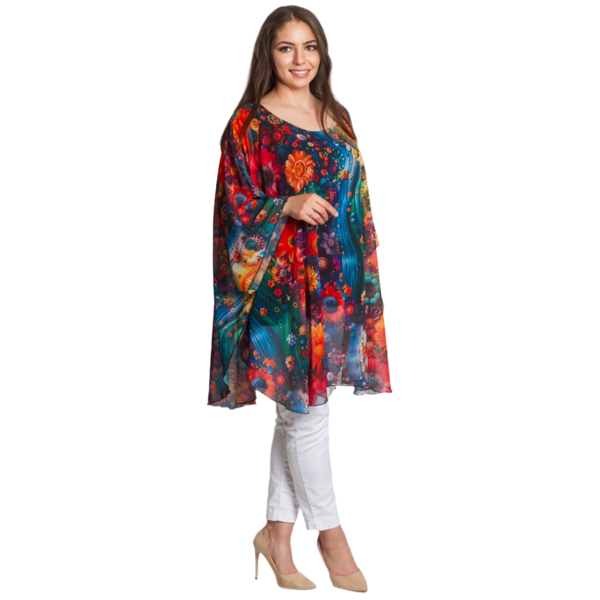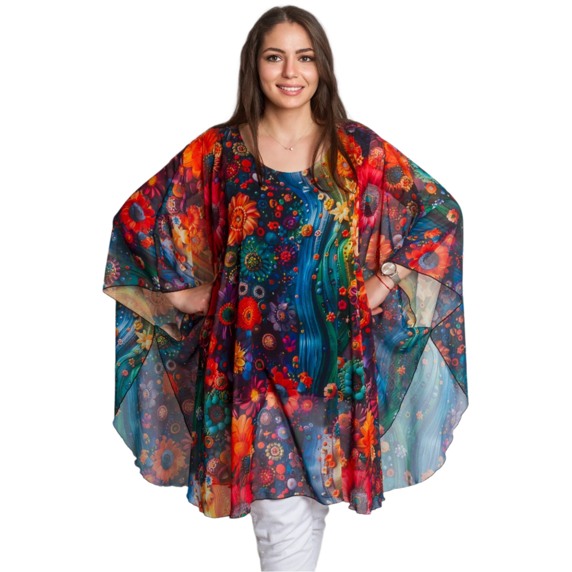 Transformă-ți look-ul cu această tunică plus-size remarcabilă, confecționată din șifon vaporos. Cu un model floral și abstract multicolor, modelul impresionează printr-o croială asimetrică și o siluetă lejeră care accentuează feminitatea prin confort. Ideală pentru evenimente formale, această tunică combină grația și stilul cu ușurință.