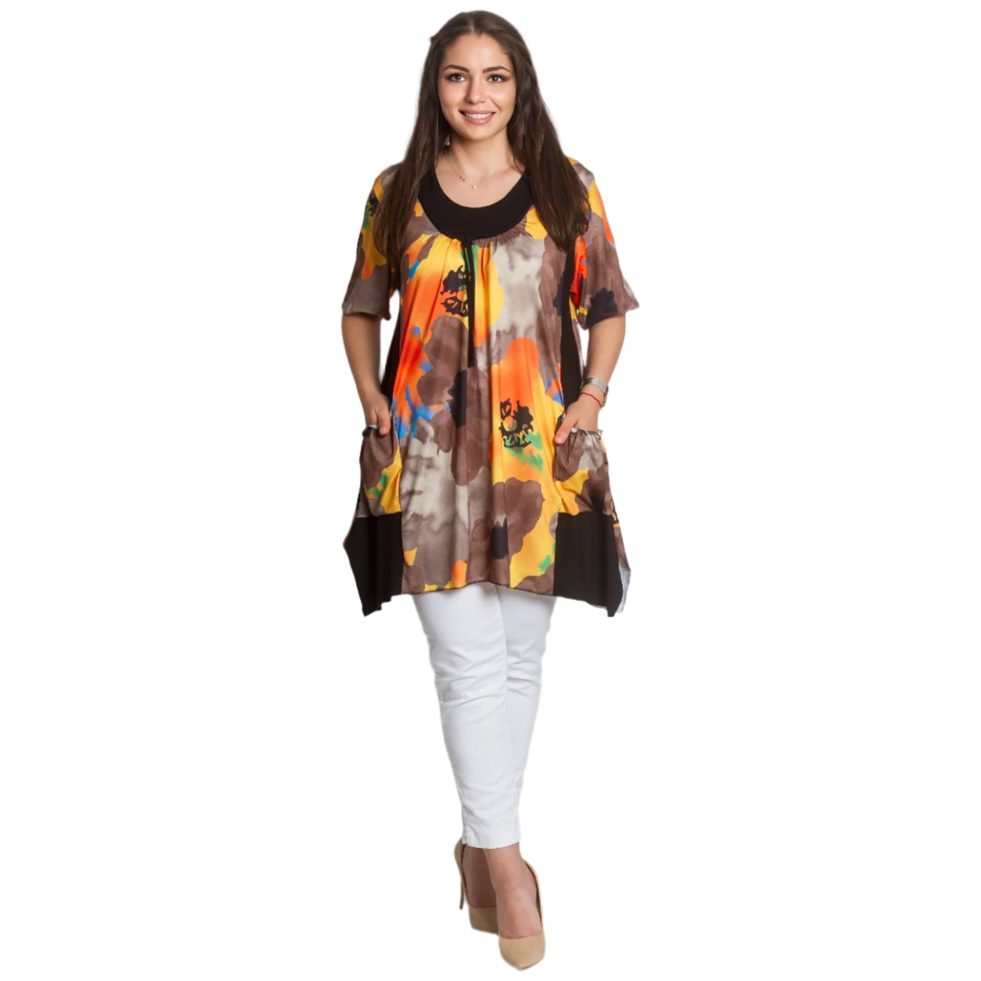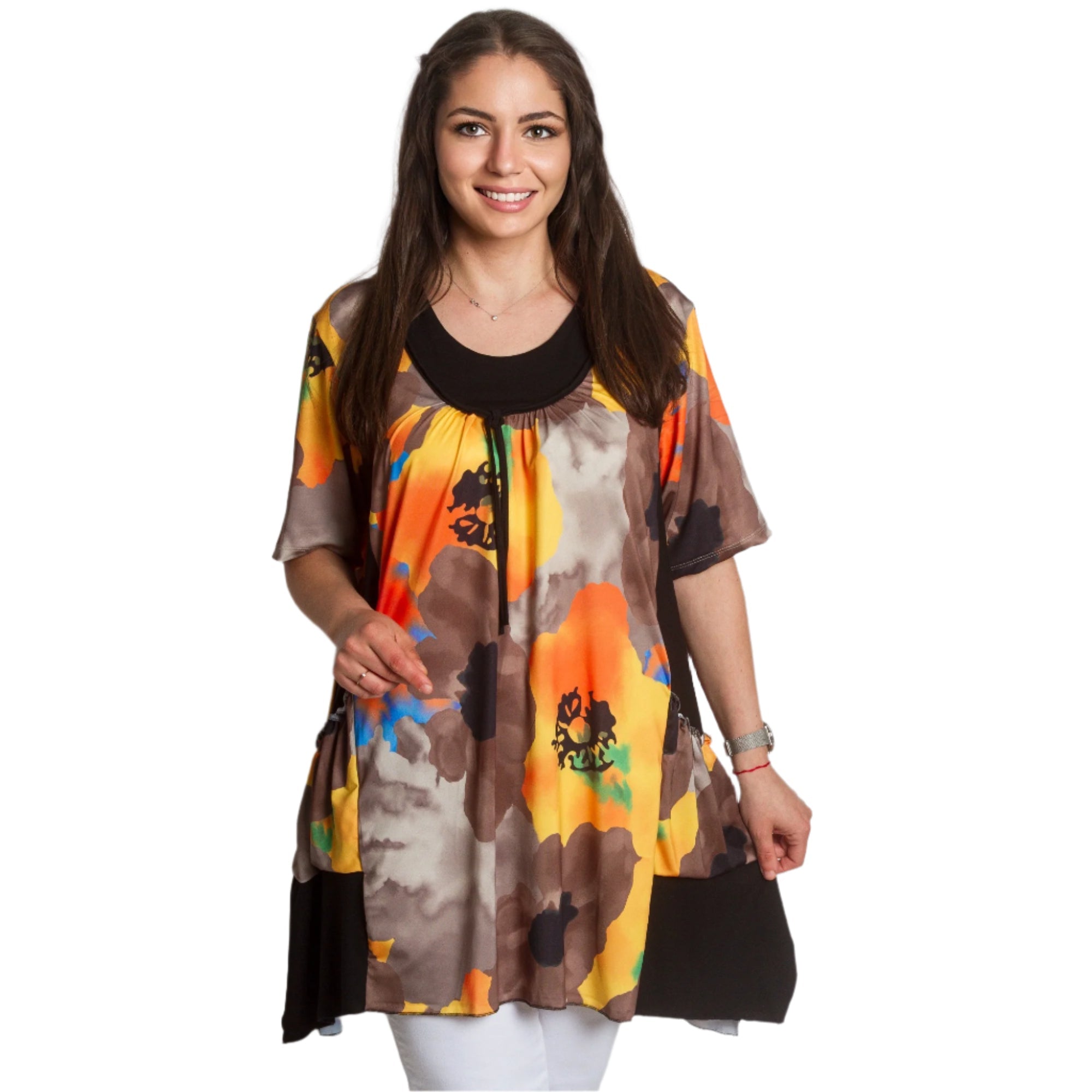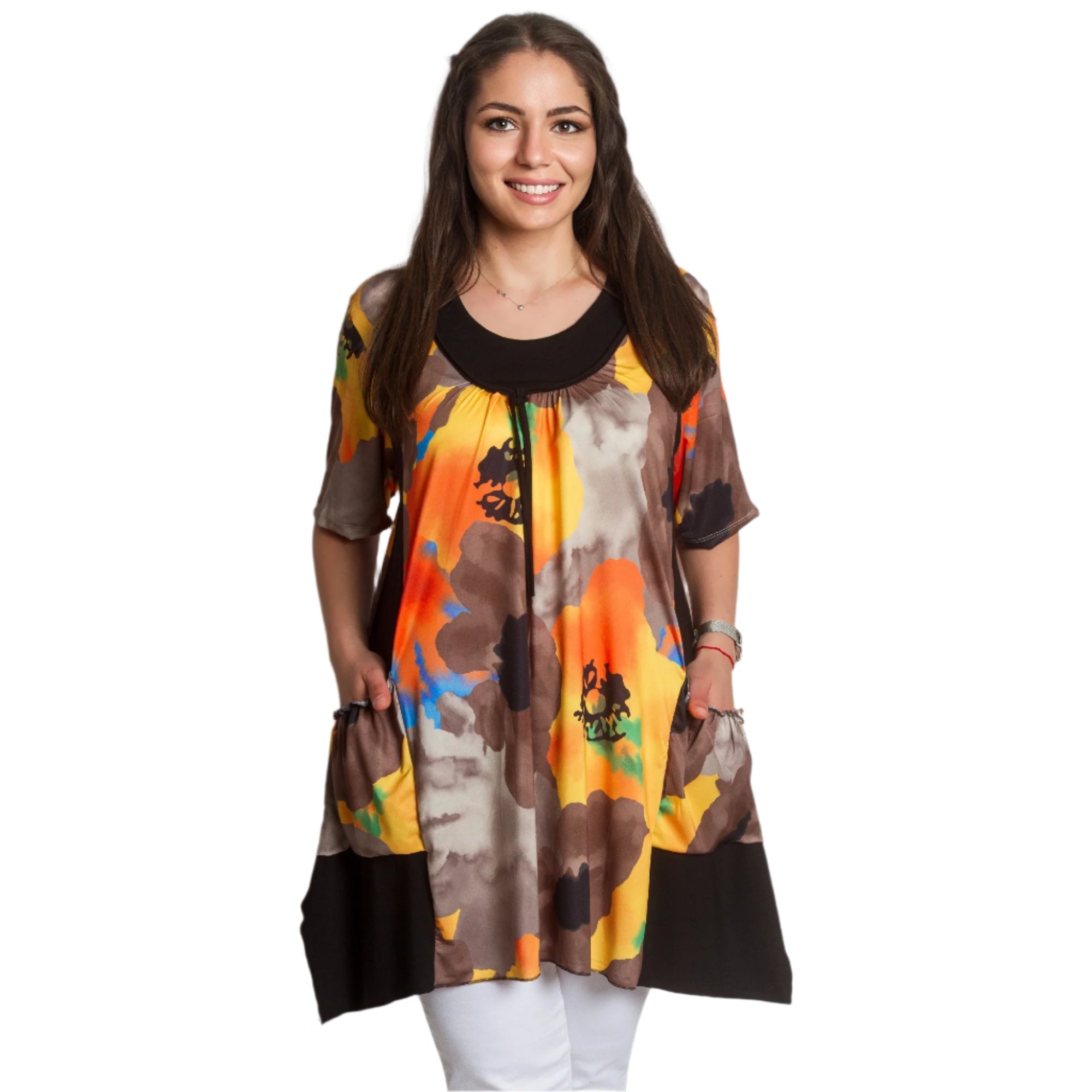Adu prospețime și confort stilului tău de zi cu zi cu această tunică colorată în mărimi maxi. Confecționată din material moale și elastic, modelul are o croială lejeră și confortabilă, care cade liber în jurul corpului. Tunica are buzunare practice, legături la decolteu și o bordură decorativă neagră care adaugă un accent elegant. Potrivită pentru sezonul primăvară-vară.