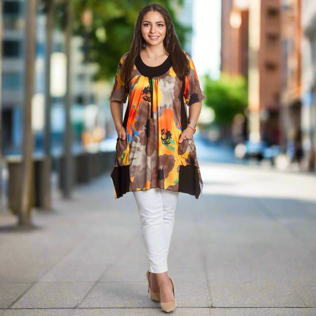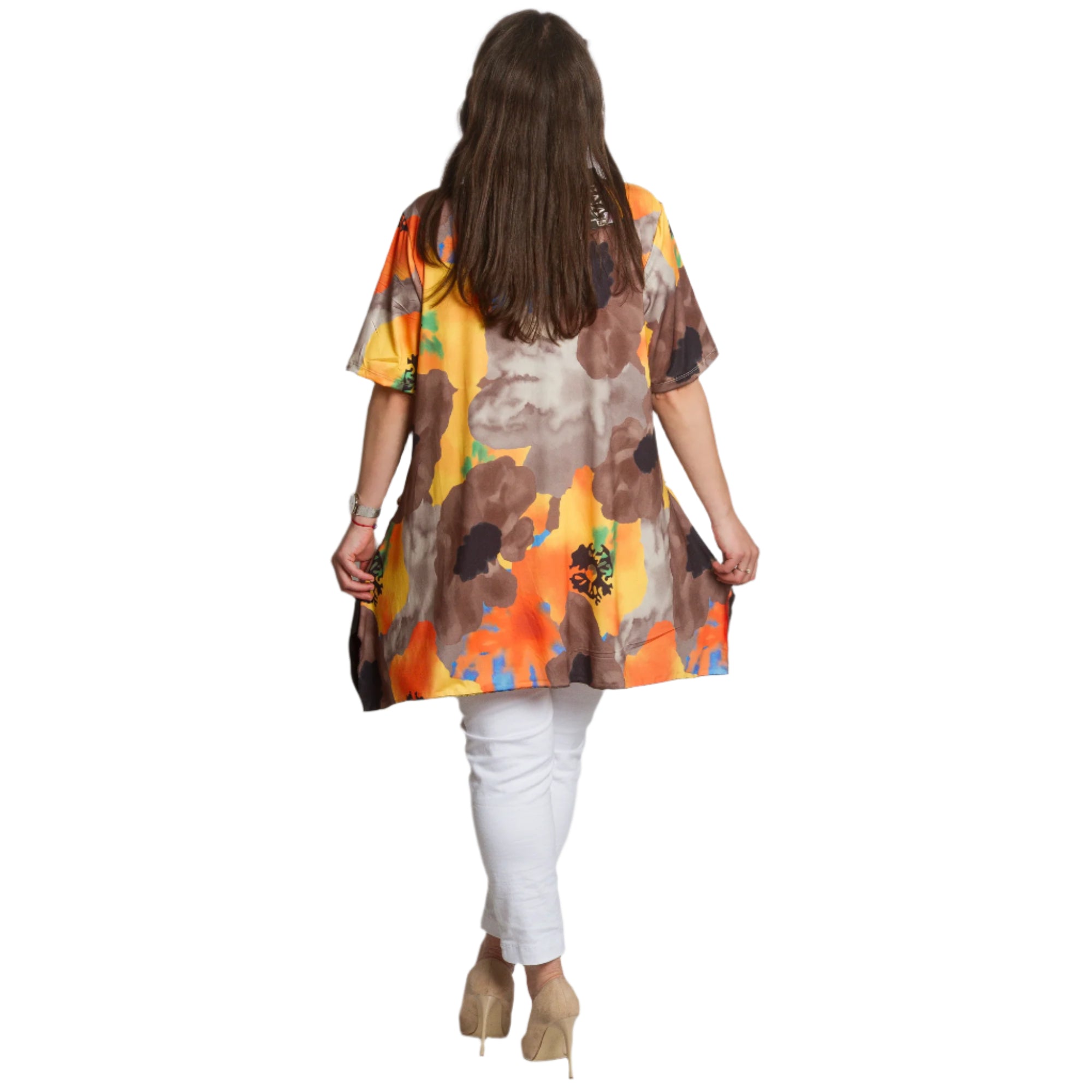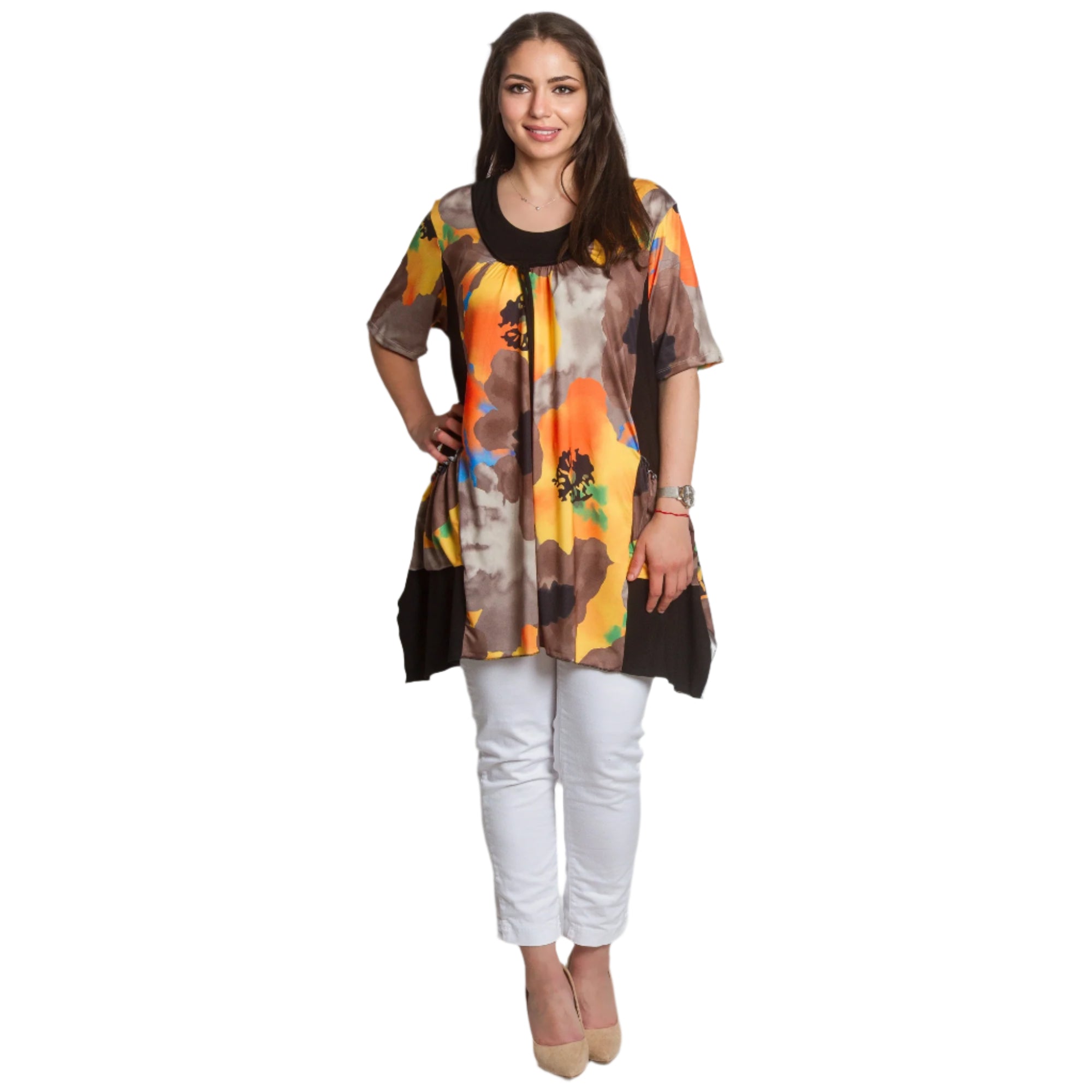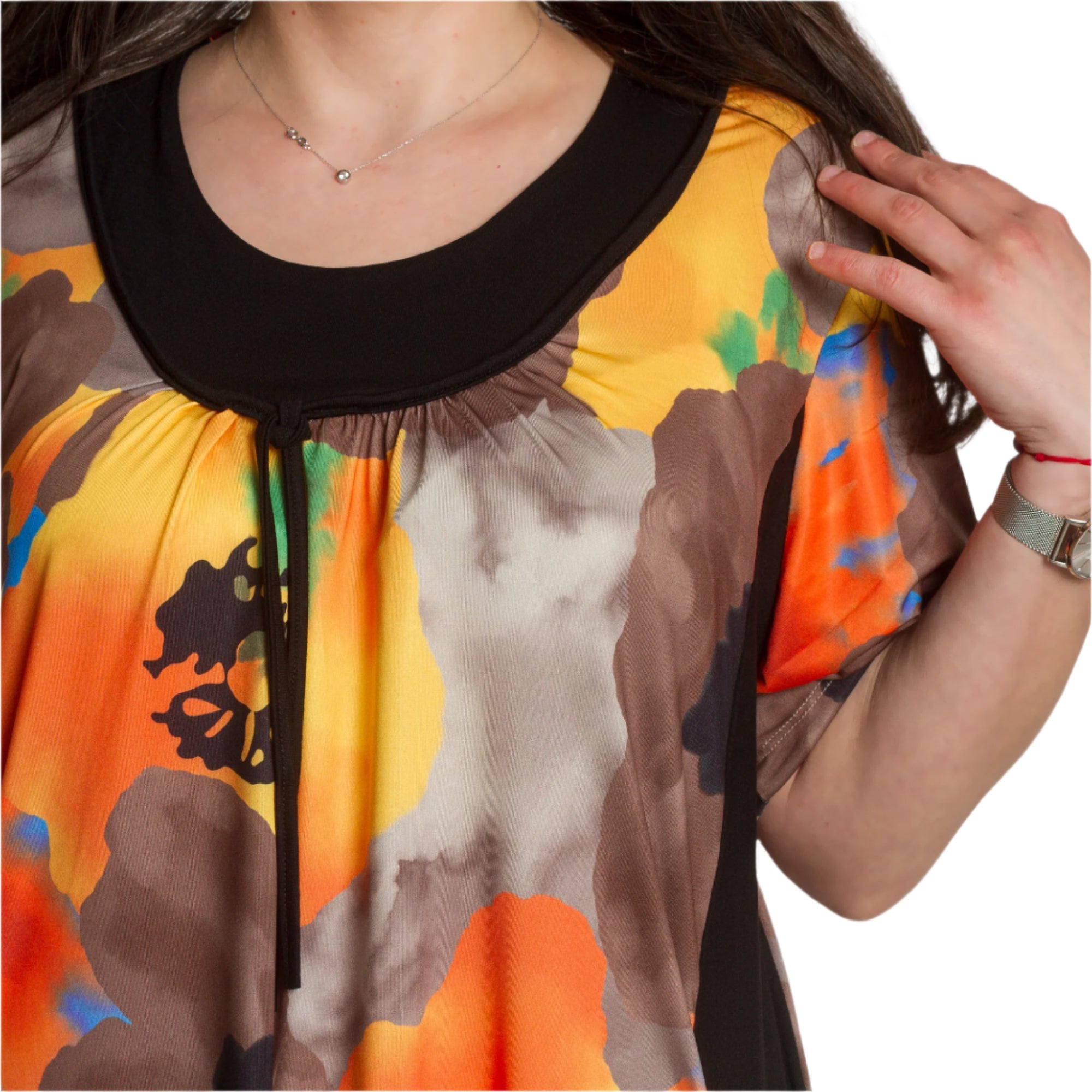 Adu prospețime și confort stilului tău de zi cu zi cu această tunică colorată în mărimi maxi. Confecționată din material moale și elastic, modelul are o croială lejeră și confortabilă, care cade liber în jurul corpului. Tunica are buzunare practice, legături la decolteu și o bordură decorativă neagră care adaugă un accent elegant. Potrivită pentru sezonul primăvară-vară.