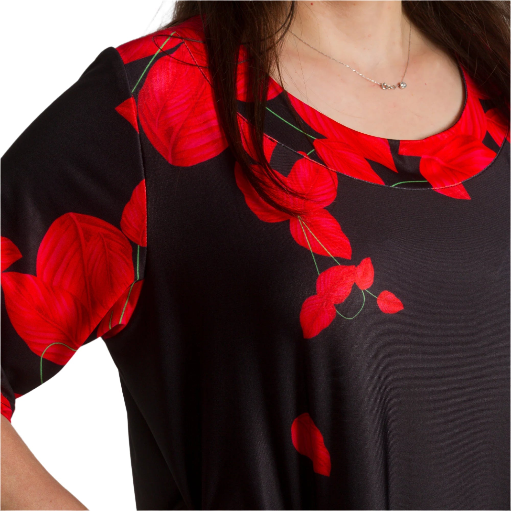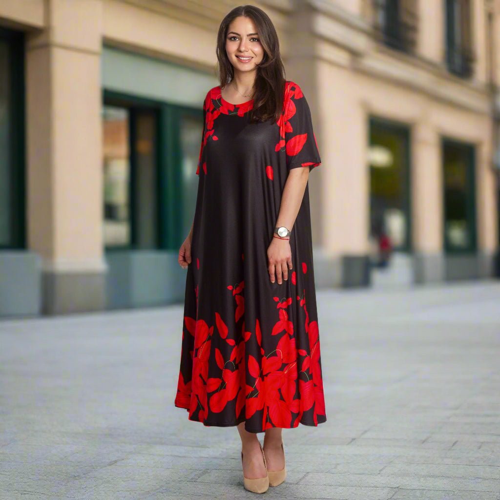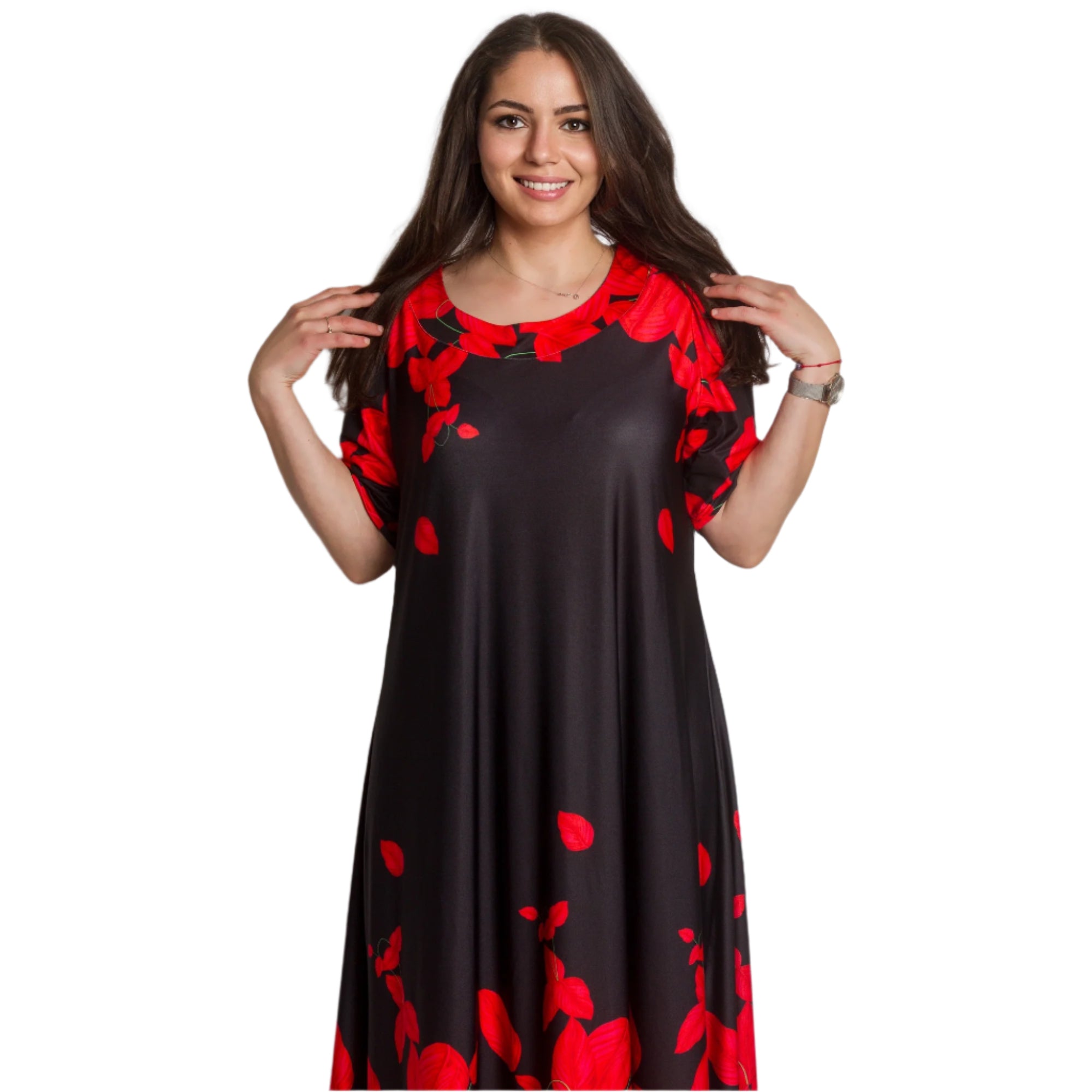 Această rochie elegantă neagră, mărime plus, combină stilul, confortul și lejeritatea într-un singur material. Cu croiala sa lejeră și materialul moale și fluid, accentuează silueta într-un mod delicat, fără a contura. Fabricată dintr-o combinație de înaltă calitate de poliamidă, poliester și elastan, rochia este potrivită atât pentru ocazii formale, cât și pentru viața de zi cu zi. Decolteul rotund adaugă un aspect clasic, iar culoarea neagră adaugă sofisticare și versatilitate pentru fiecare sezon.