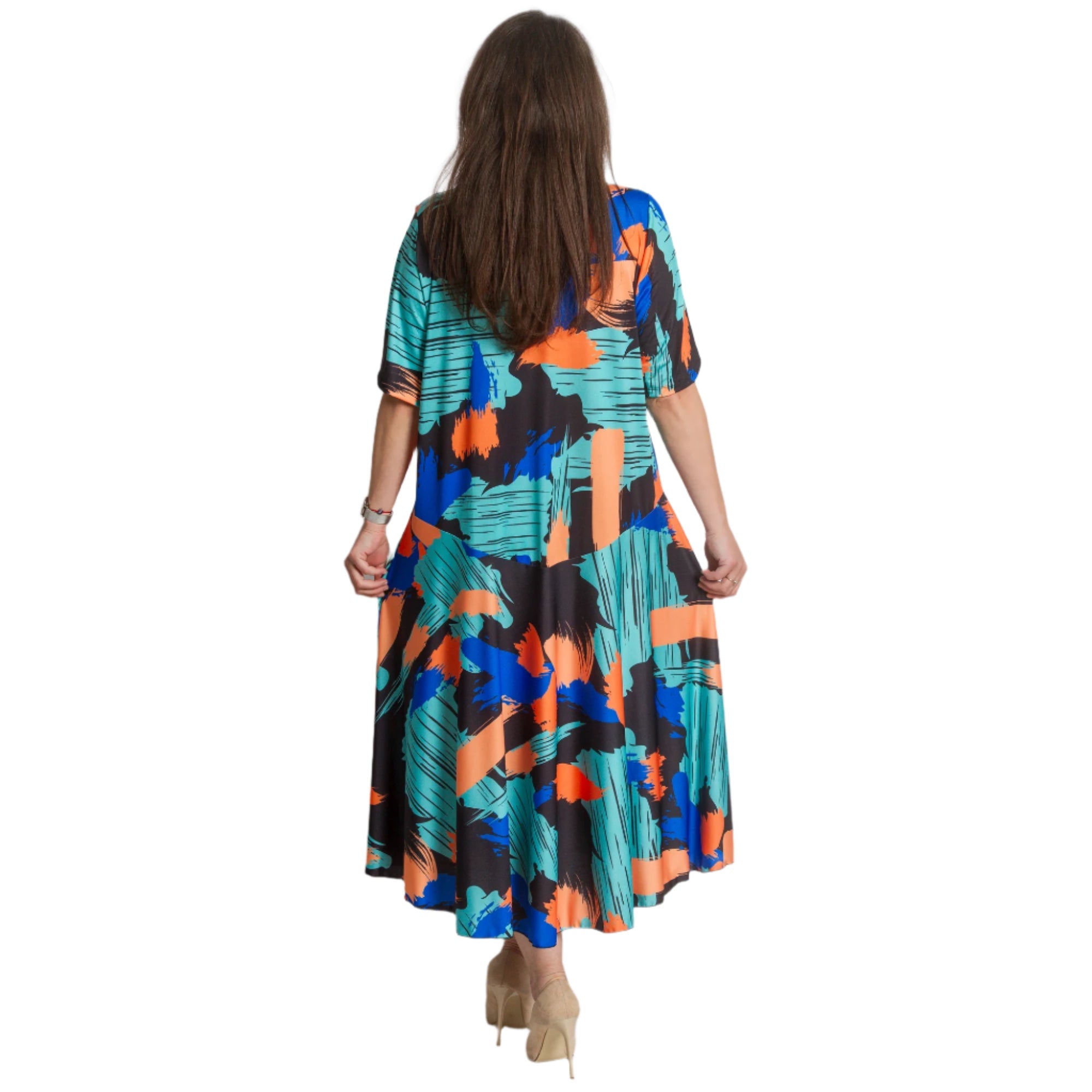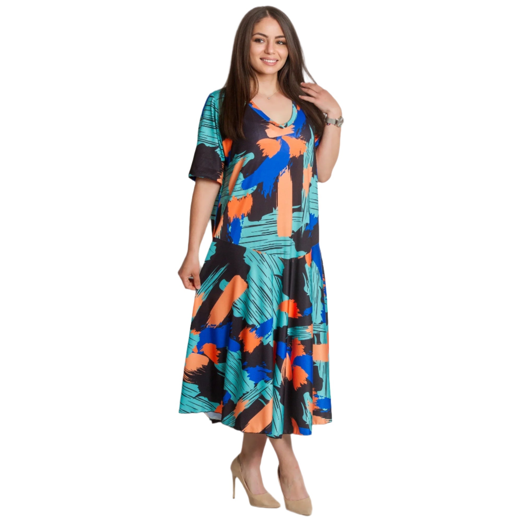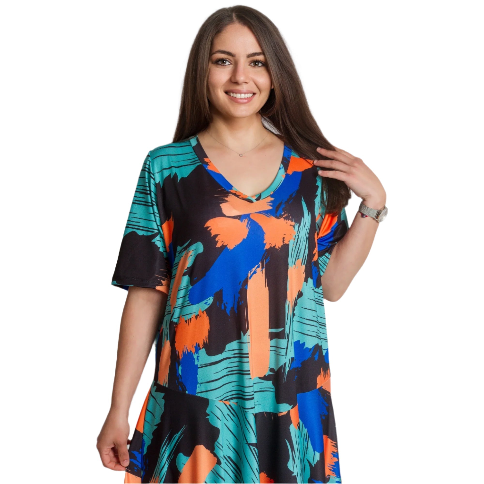 Creează un look îndrăzneț și modern cu această rochie evazată plus size, cu un model abstract artistic în nuanțe strălucitoare de albastru, portocaliu și verde. Confecționată dintr-un material confortabil și ușor, cu bumbac și poliester, rochia oferă confort pe tot parcursul zilei. Decolteul în V adaugă feminitate, iar croiul lejer evidențiază silueta fără a fi strâmt. Ideală pentru ocazii formale sau întâlniri unde vrei să ieși în evidență.