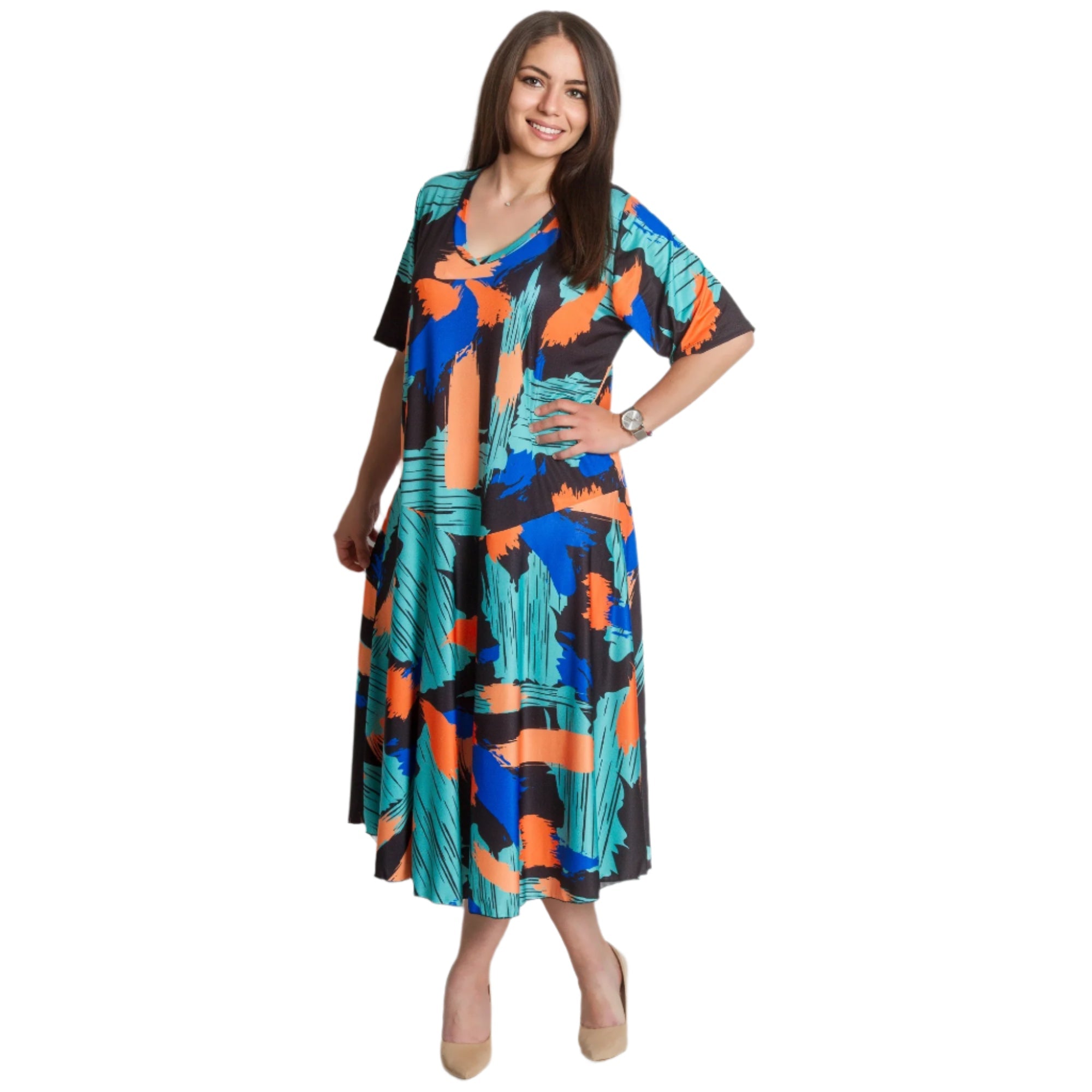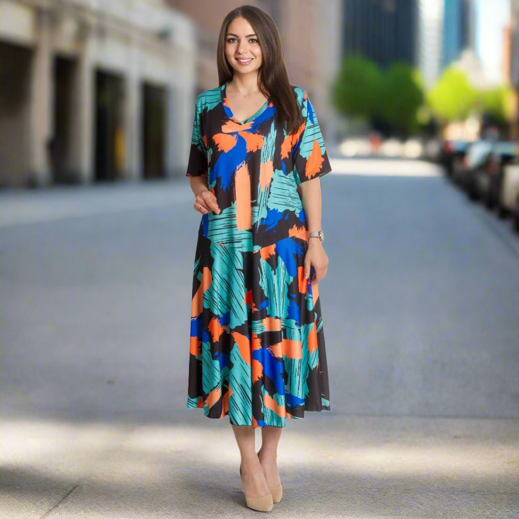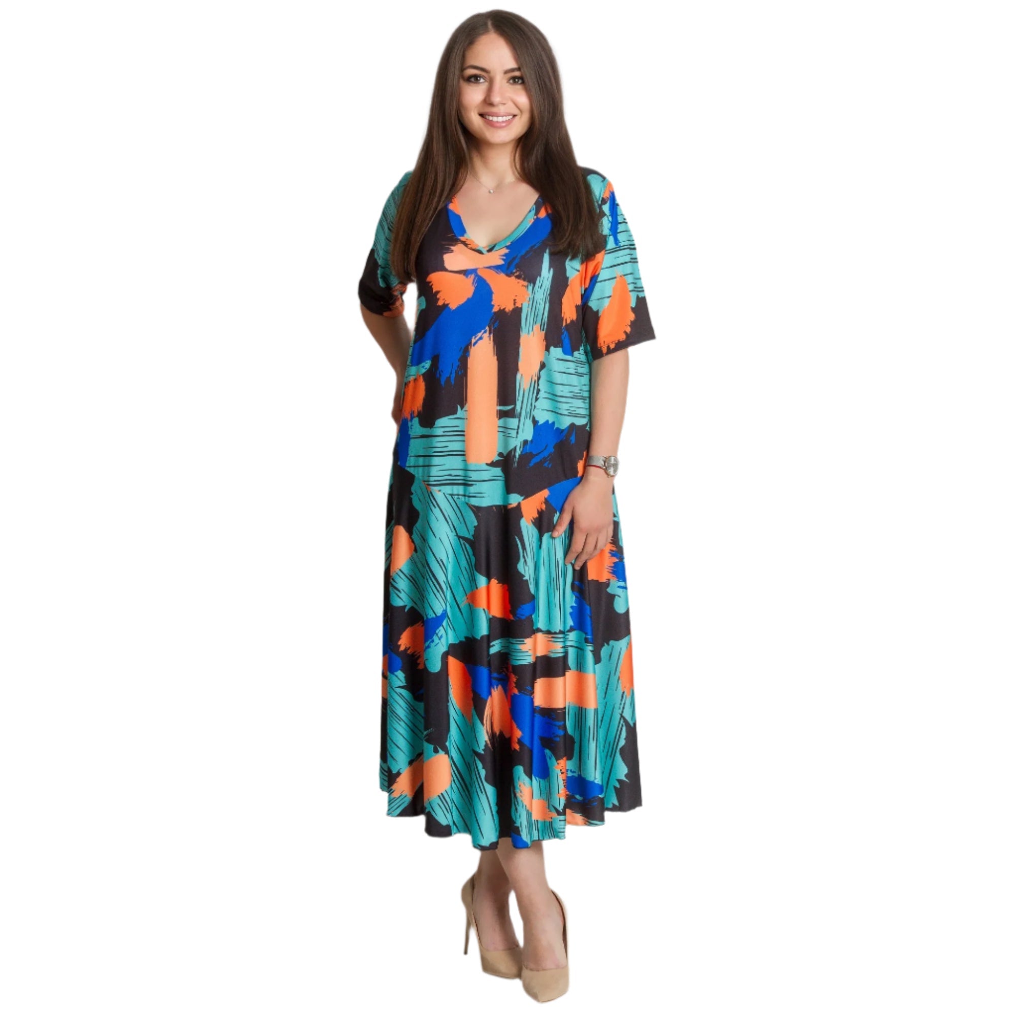 Creează un look îndrăzneț și modern cu această rochie evazată plus size, cu un model abstract artistic în nuanțe strălucitoare de albastru, portocaliu și verde. Confecționată dintr-un material confortabil și ușor, cu bumbac și poliester, rochia oferă confort pe tot parcursul zilei. Decolteul în V adaugă feminitate, iar croiul lejer evidențiază silueta fără a fi strâmt. Ideală pentru ocazii formale sau întâlniri unde vrei să ieși în evidență.