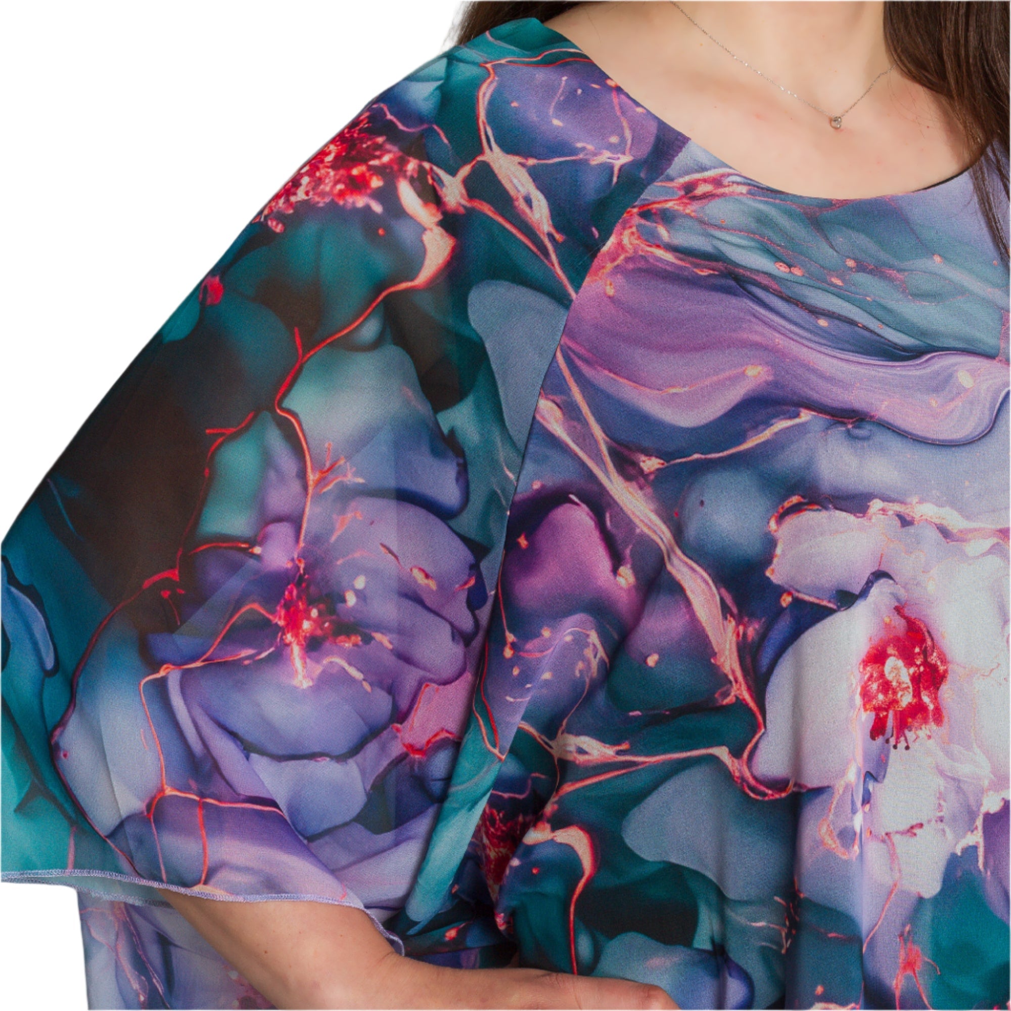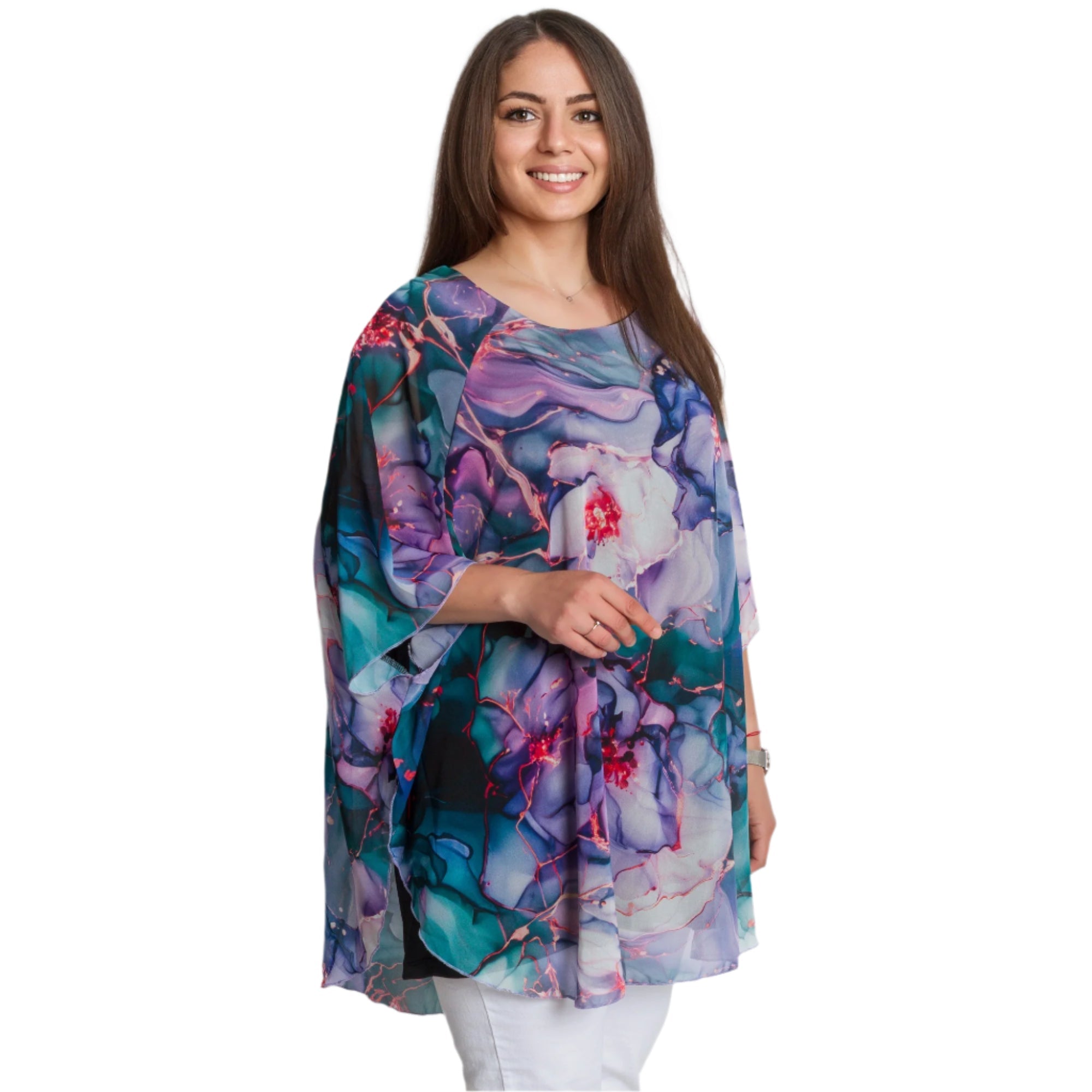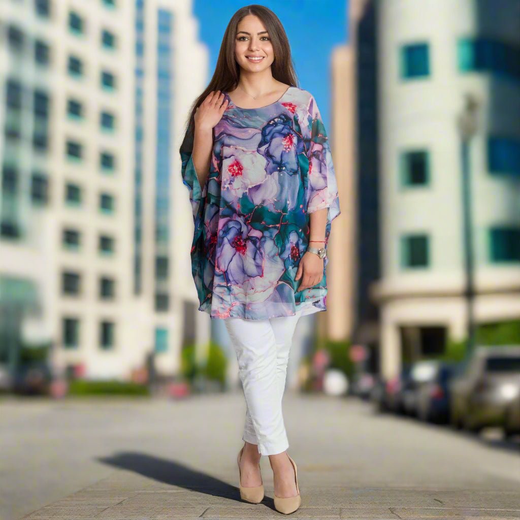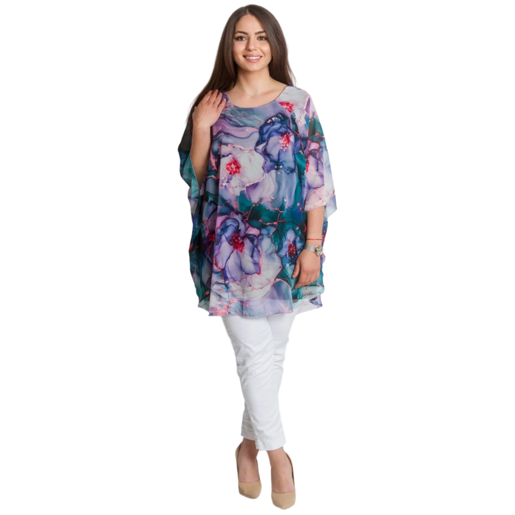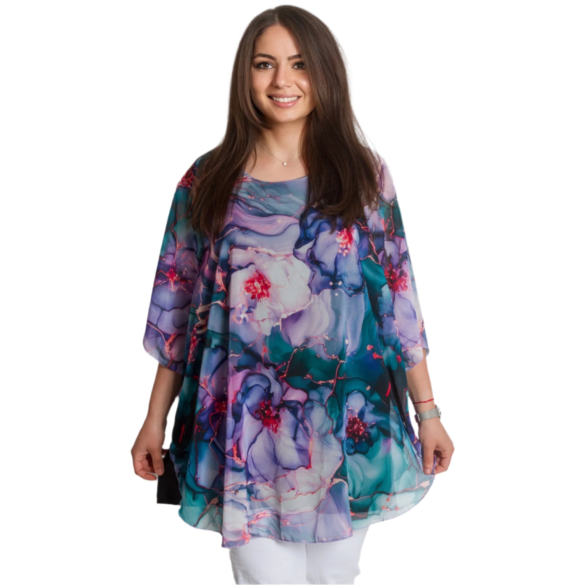 Fii elegantă și remarcabilă cu această tunică impresionantă în mărimi mari, potrivită pentru ocazii formale. Modelul are un strat superior vaporos, cu un model floral artistic multicolor și o croială lejeră care se mulează frumos în jurul corpului. Confecționată din viscoză cu elastan, tunica oferă confort, stil și o lejeritate aerisită. Decolteul rotund pune în valoare fața, iar silueta lungă este ideală pentru a fi combinată cu pantaloni sau colanți. Potrivită pentru sărbători, seri sau ocazii speciale.