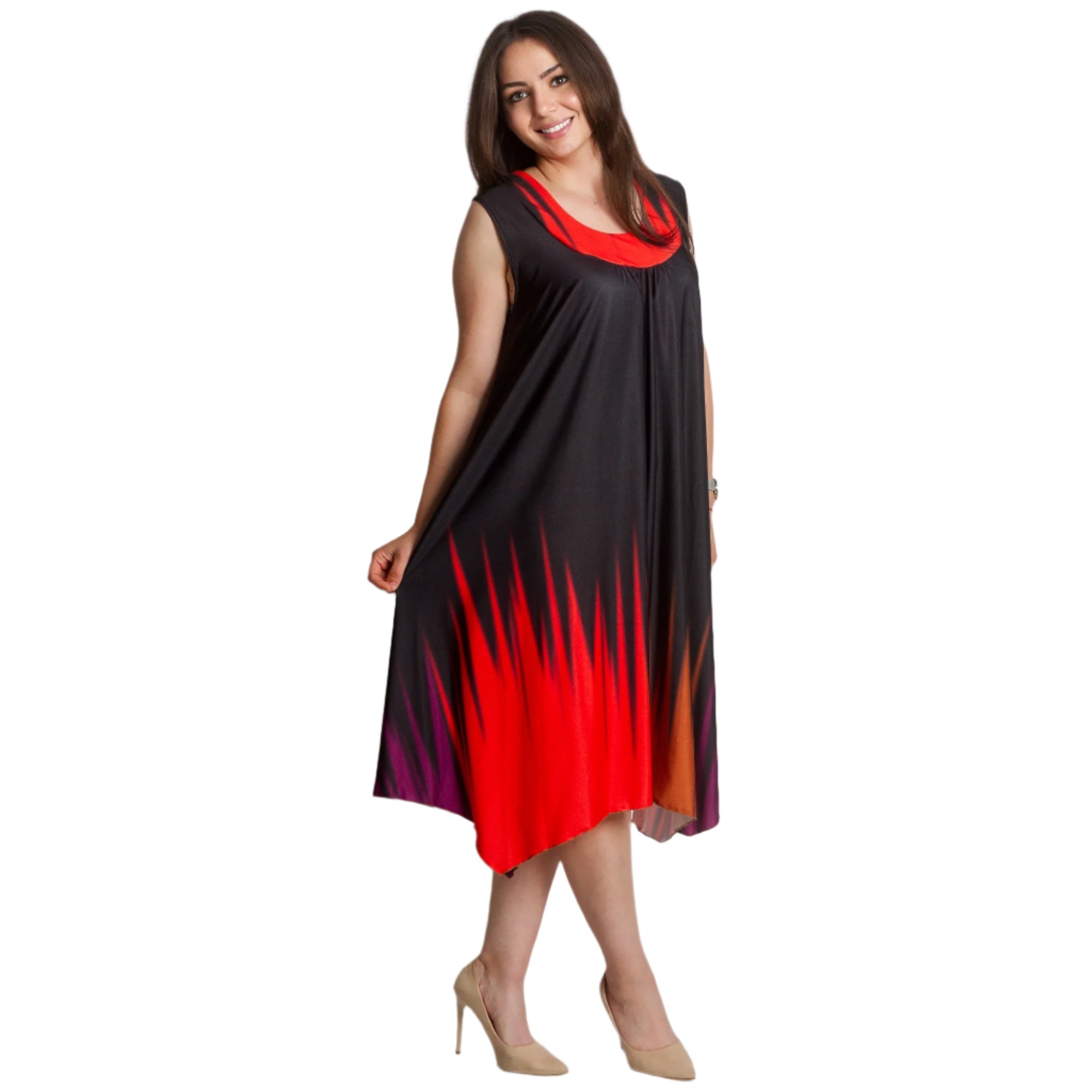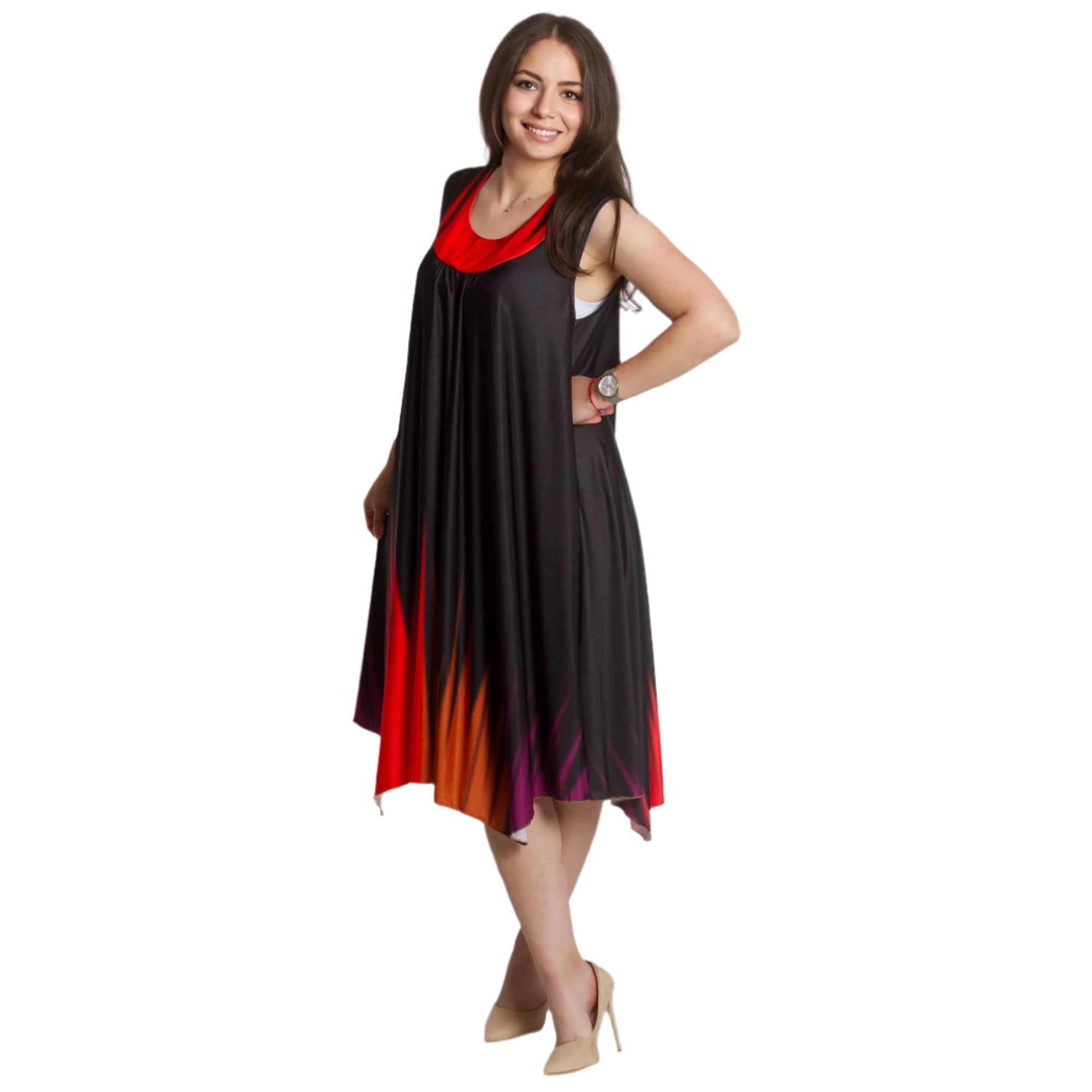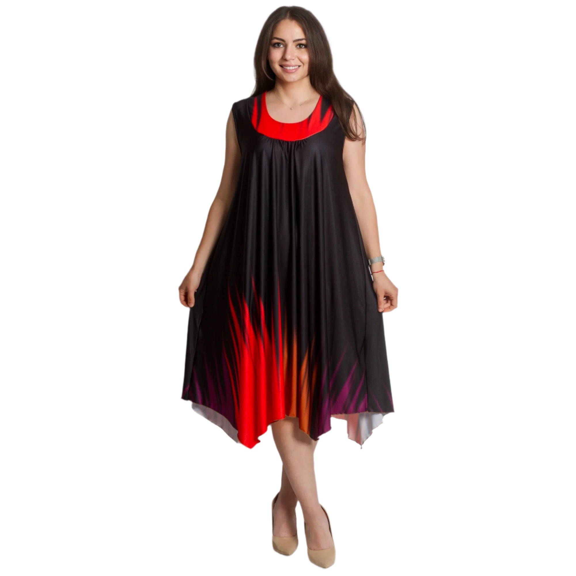 Ieși în evidență cu stil și încredere cu această rochie spectaculoasă de damă, cu lungime asimetrică și imprimeu flambat în roșu, violet și portocaliu. Confecționată dintr-un material ușor și confortabil (70% bumbac și 30% poliester), această rochie este alegerea perfectă pentru viața de zi cu zi în sezonul primăvară-vară. Decolteul rotund cu element contrastant adaugă originalitate, iar croiul lejer oferă confort și libertate de mișcare pentru orice siluetă.