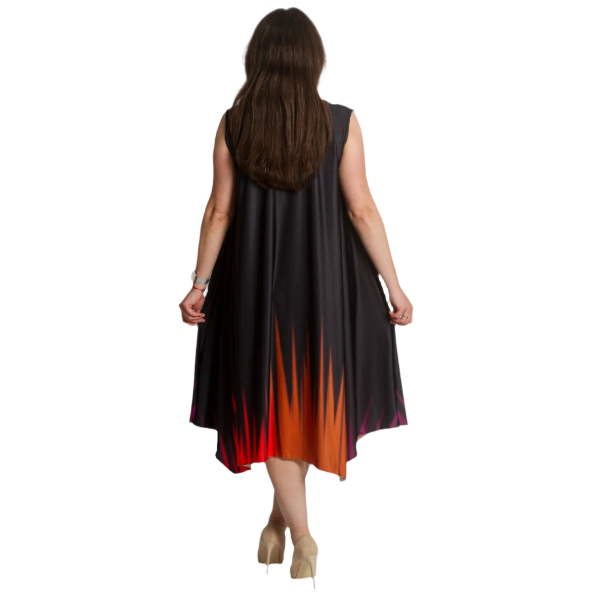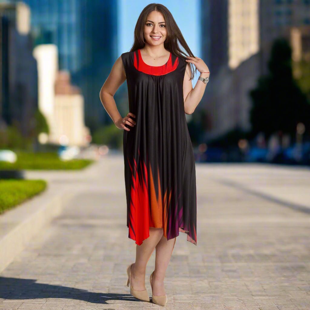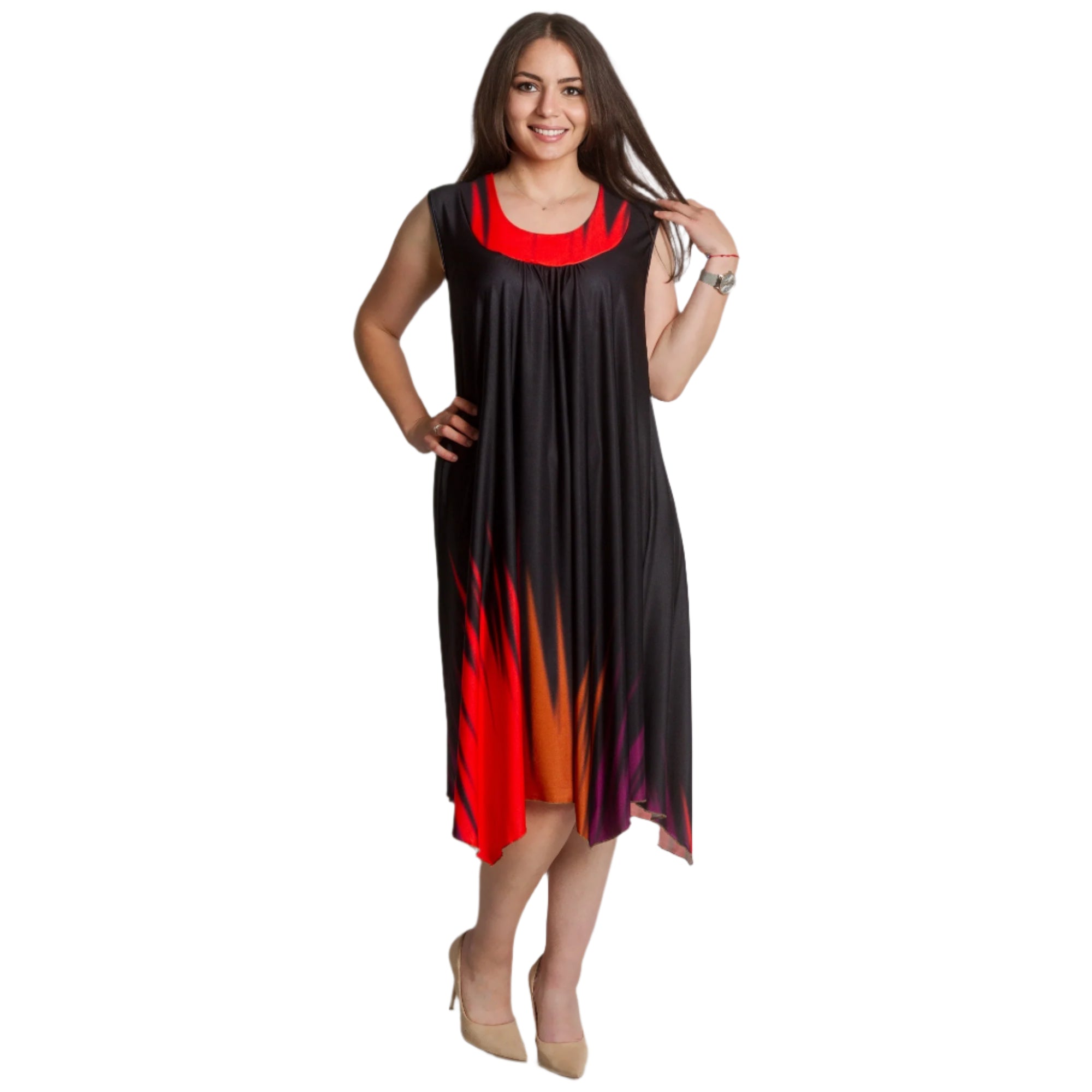 Ieși în evidență cu stil și încredere cu această rochie spectaculoasă de damă, cu lungime asimetrică și imprimeu flambat în roșu, violet și portocaliu. Confecționată dintr-un material ușor și confortabil (70% bumbac și 30% poliester), această rochie este alegerea perfectă pentru viața de zi cu zi în sezonul primăvară-vară. Decolteul rotund cu element contrastant adaugă originalitate, iar croiul lejer oferă confort și libertate de mișcare pentru orice siluetă.