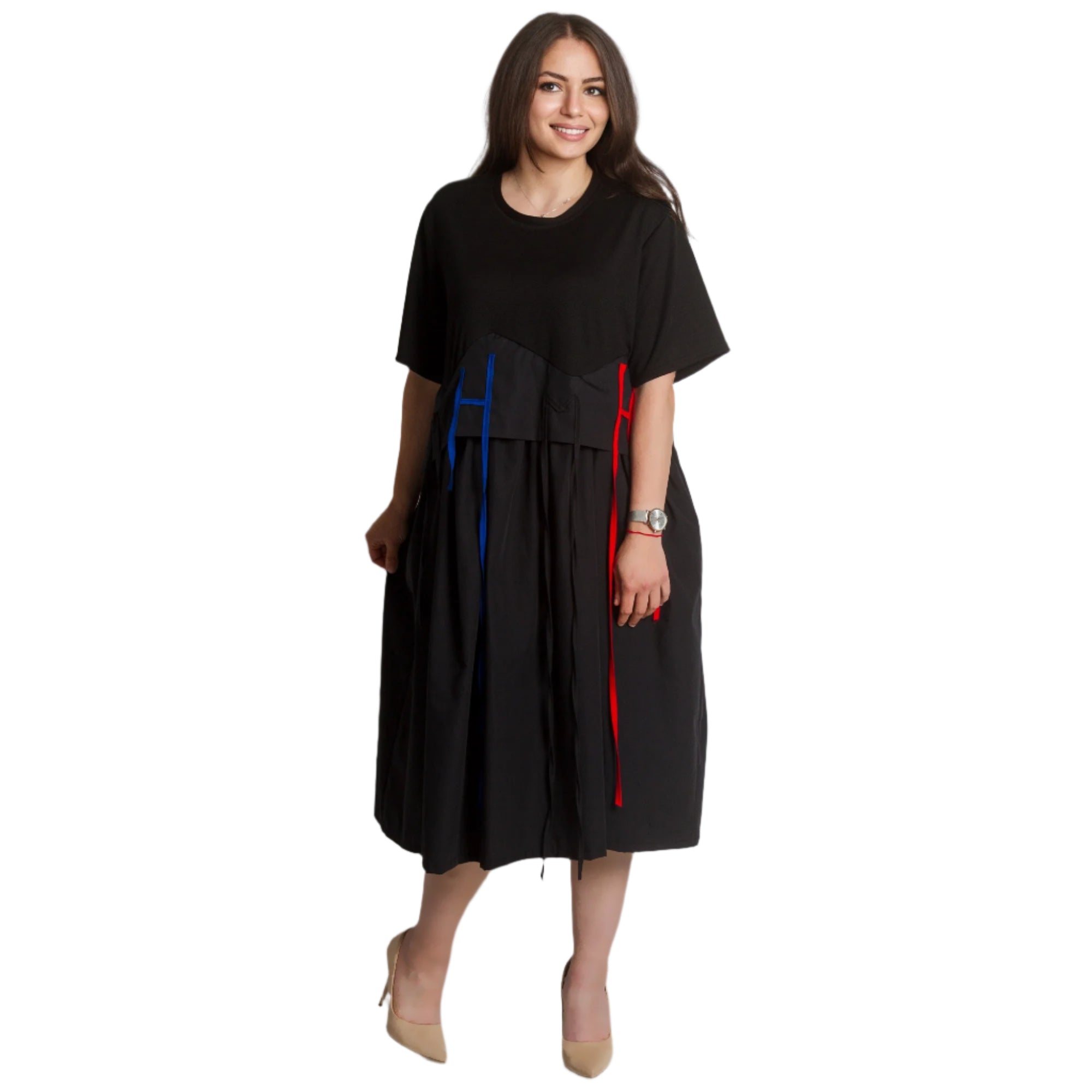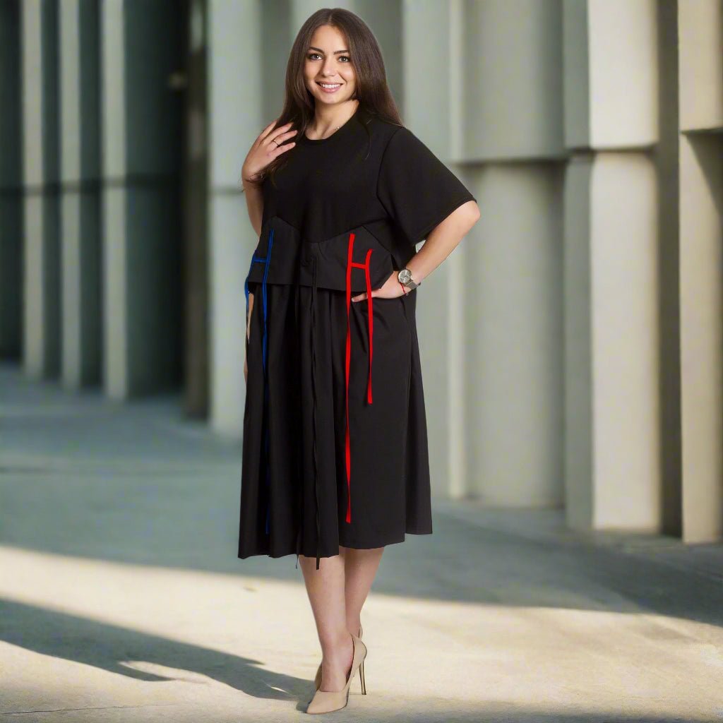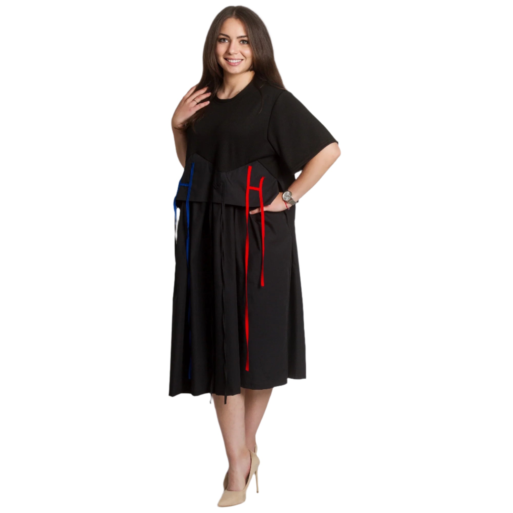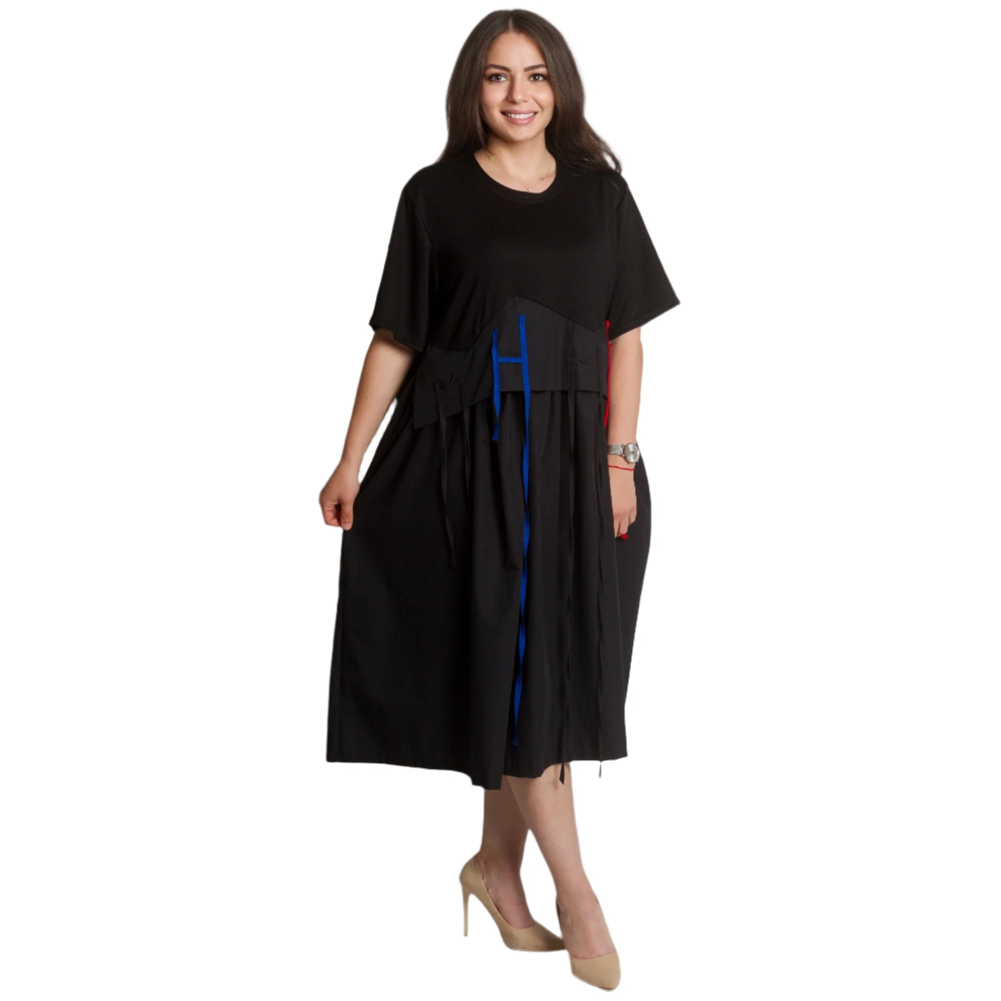 Accentuează-ți stilul cu această rochie neagră spectaculoasă, în mărimi mari, care combină eleganța clasică cu un accent modern. Modelul are o zonă decorativă interesantă în zona taliei, decorată cu dungi colorate în albastru, roșu și negru, creând un accent grafic. Silueta decupată oferă confort și libertate de mișcare, iar materialul se mulează frumos în jurul corpului, accentuând silueta. Este potrivită atât pentru serile formale, cât și pentru evenimentele sofisticate de zi.