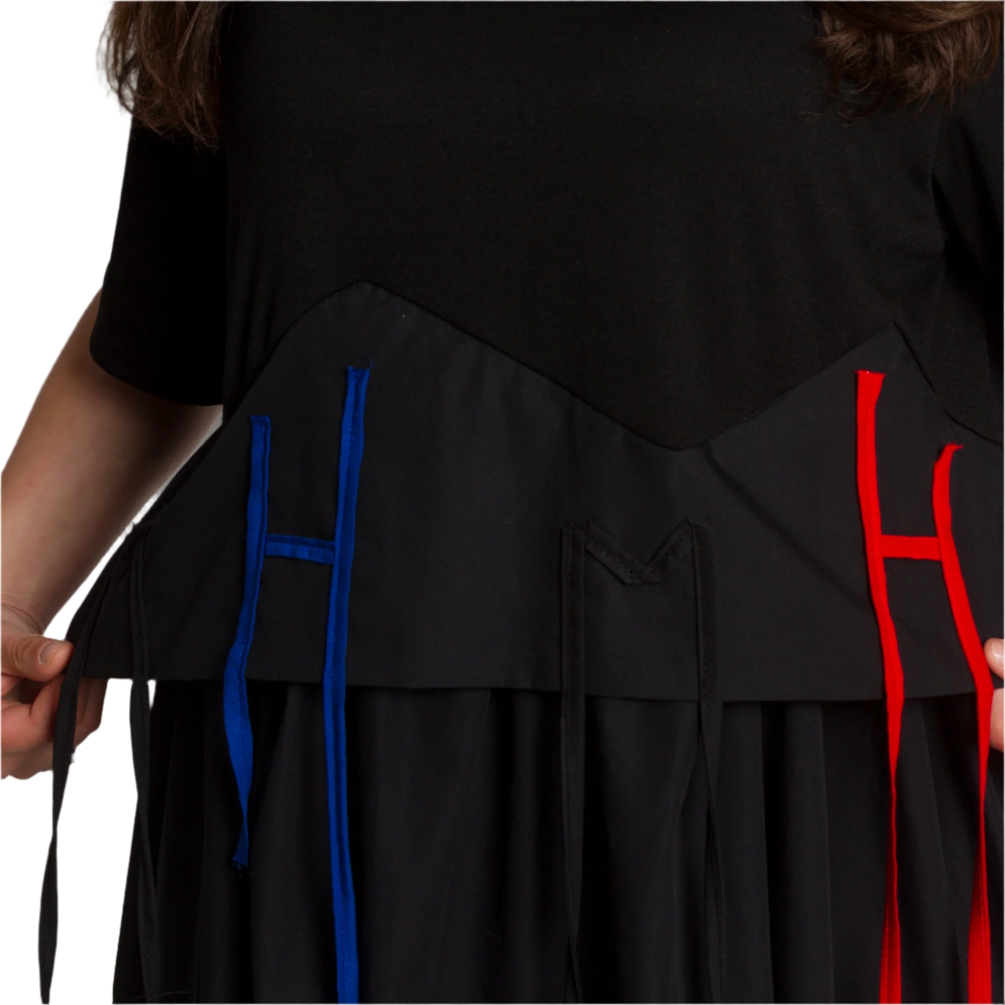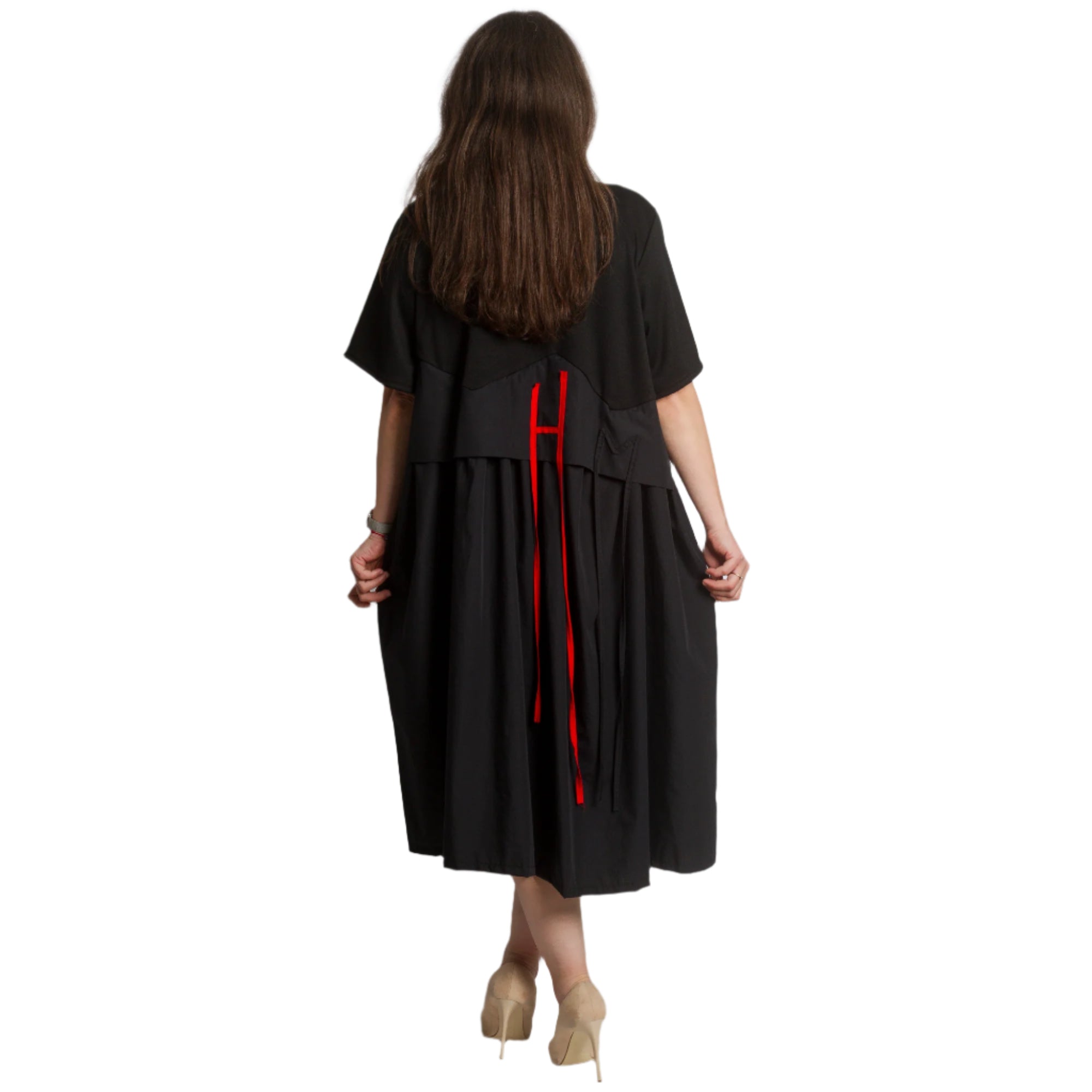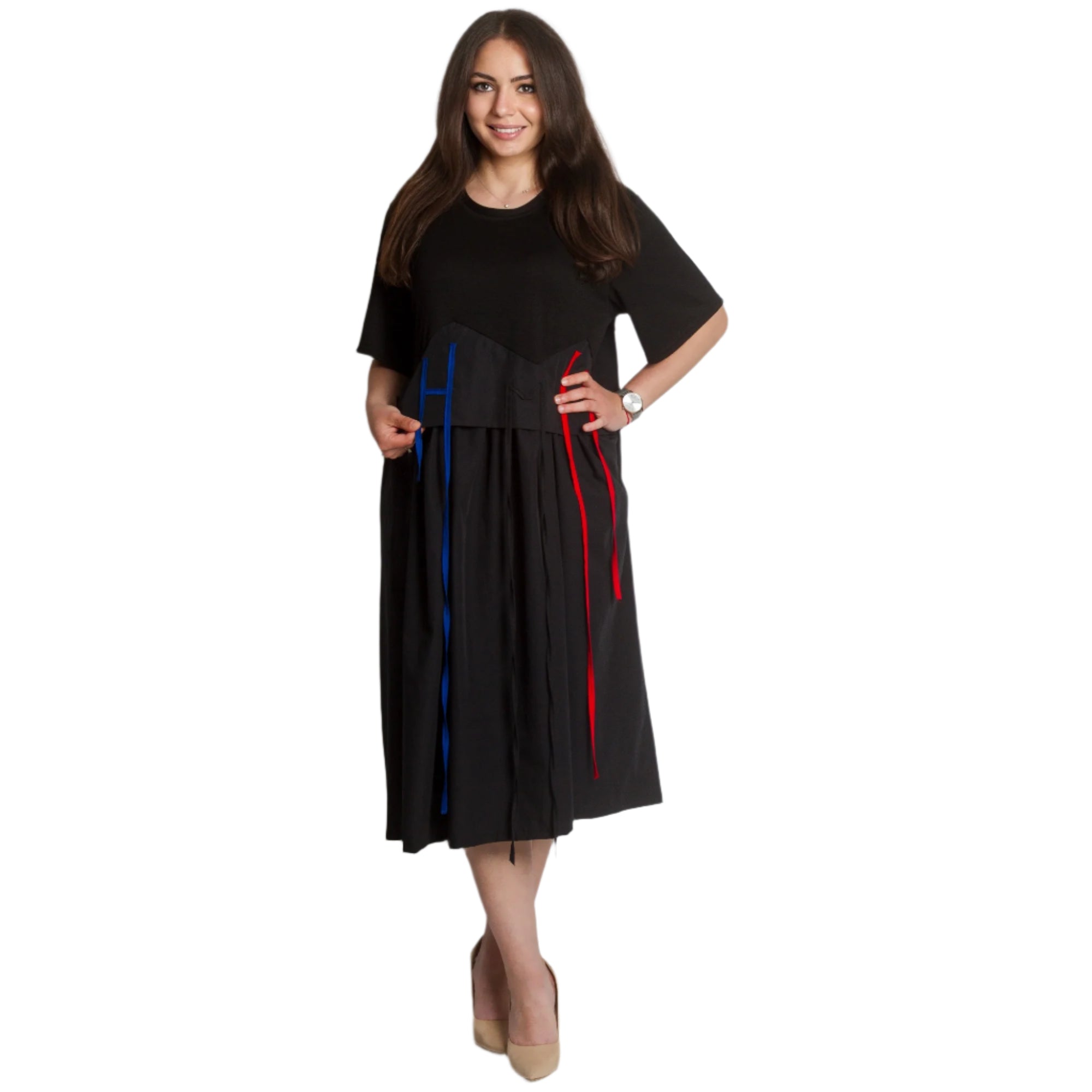 Accentuează-ți stilul cu această rochie neagră spectaculoasă, în mărimi mari, care combină eleganța clasică cu un accent modern. Modelul are o zonă decorativă interesantă în zona taliei, decorată cu dungi colorate în albastru, roșu și negru, creând un accent grafic. Silueta decupată oferă confort și libertate de mișcare, iar materialul se mulează frumos în jurul corpului, accentuând silueta. Este potrivită atât pentru serile formale, cât și pentru evenimentele sofisticate de zi.