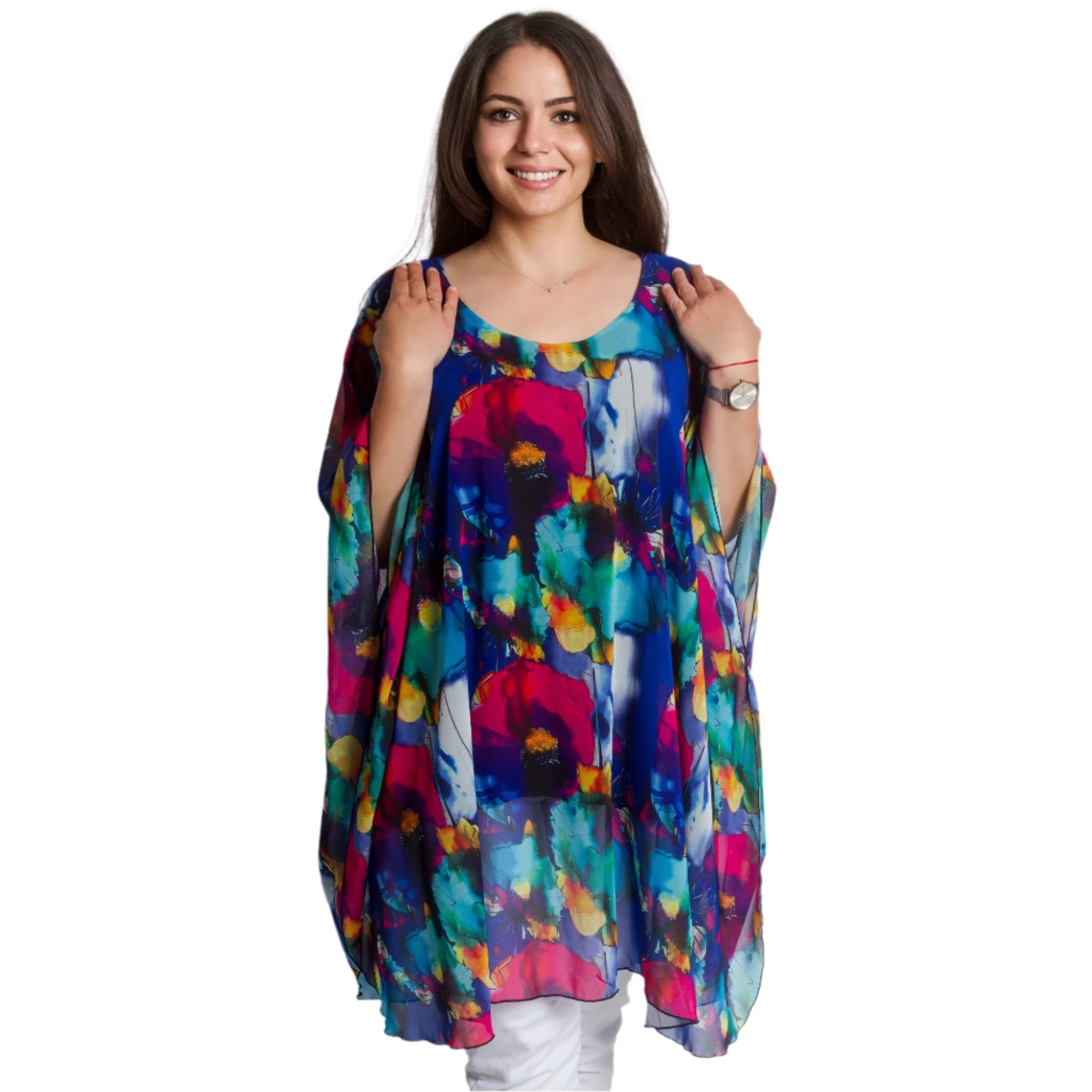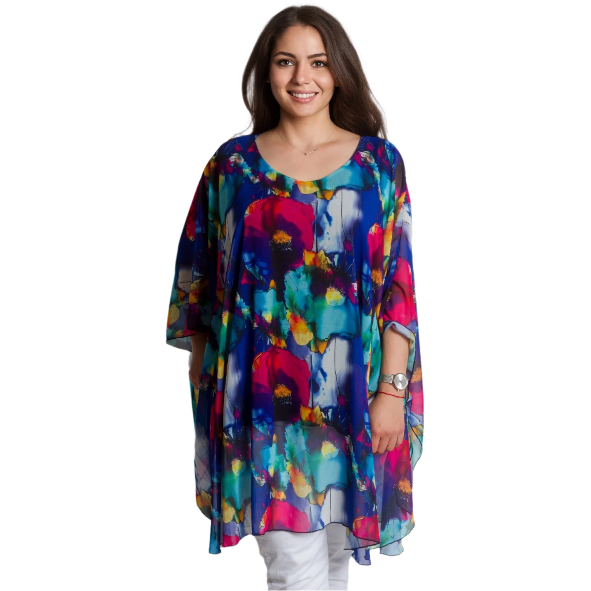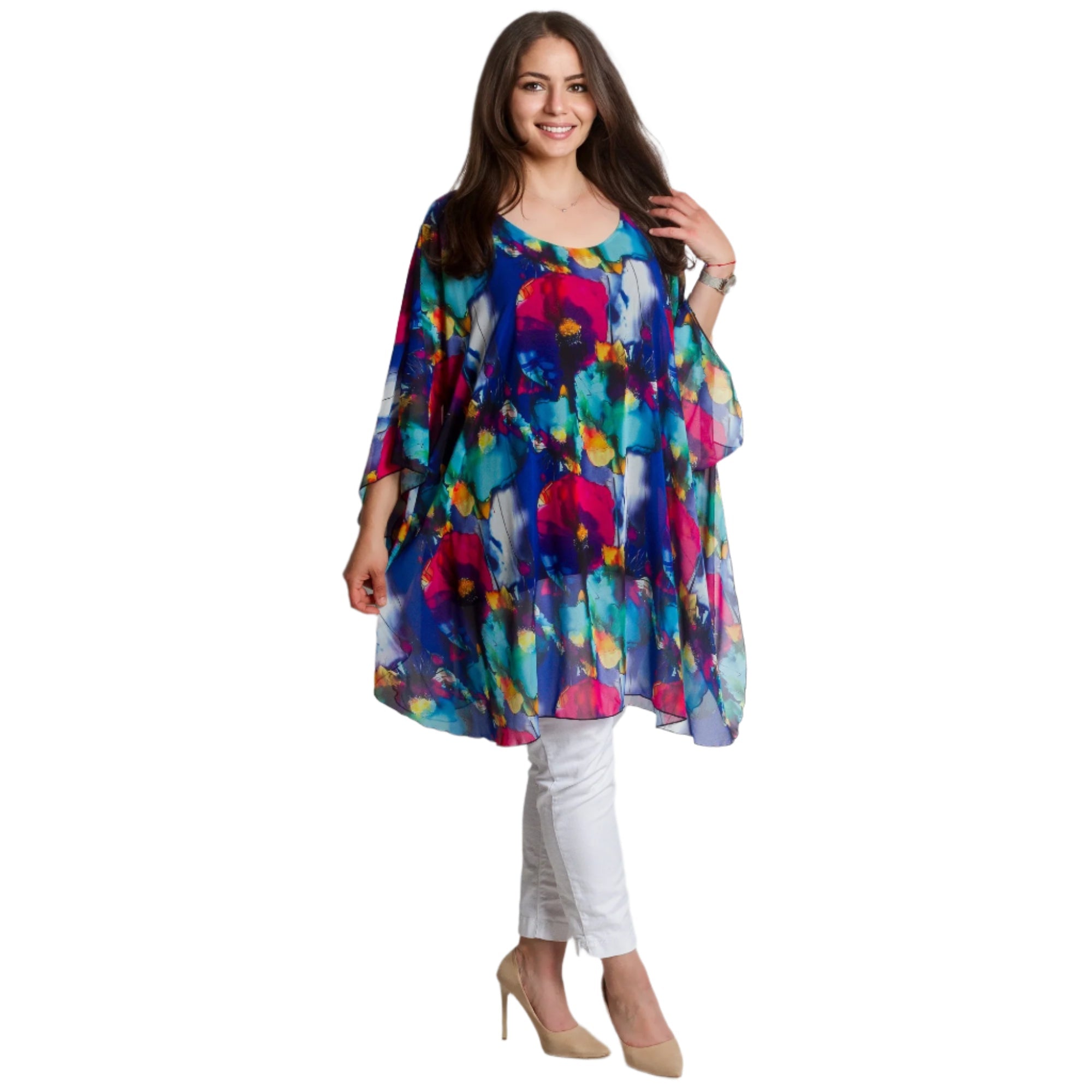 Această tunică din șifon impresionează printr-un imprimeu floral extrem de proaspăt, în culori strălucitoare și vibrante, care conferă o atmosferă estivală și eleganță feminină. Croiul lejer creează o senzație de lejeritate și oferă confort maxim chiar și în mărimi mai mari. Este potrivită atât pentru ocazii formale, cât și pentru ținute elegante de zi cu zi. Materialul ușor și respirabil cad frumos pe corp, iar designul fără mâneci conferă o siluetă modernă și lejeră.
